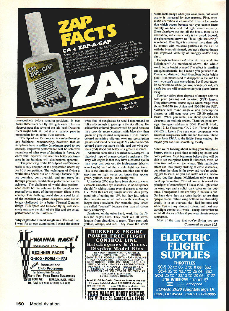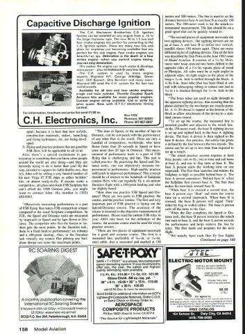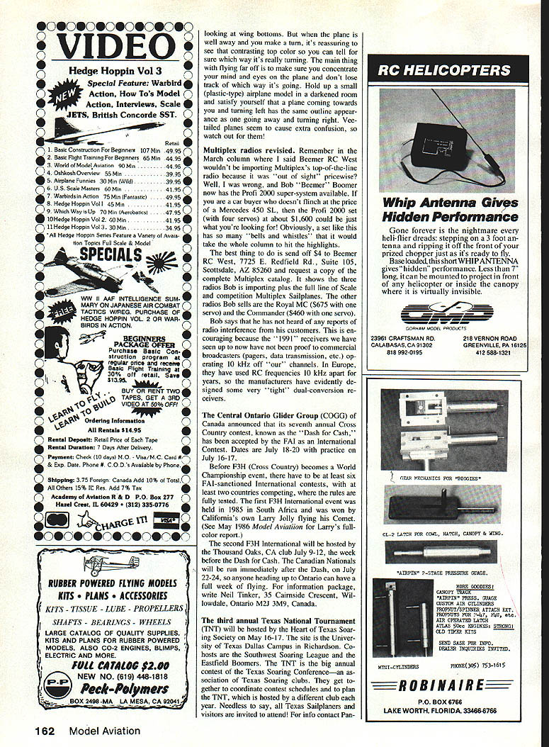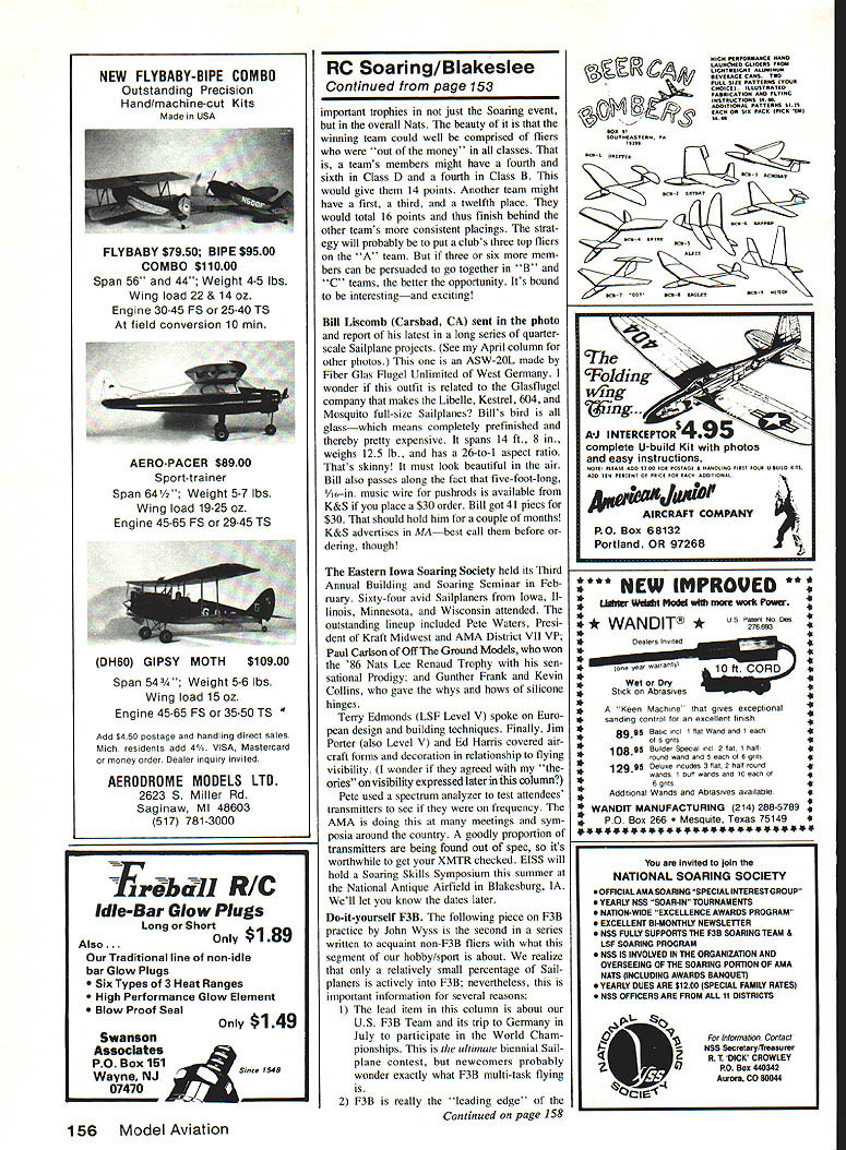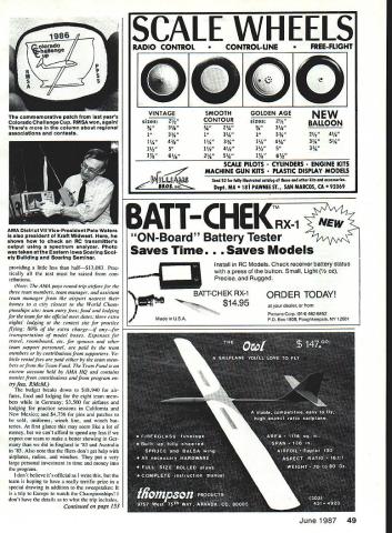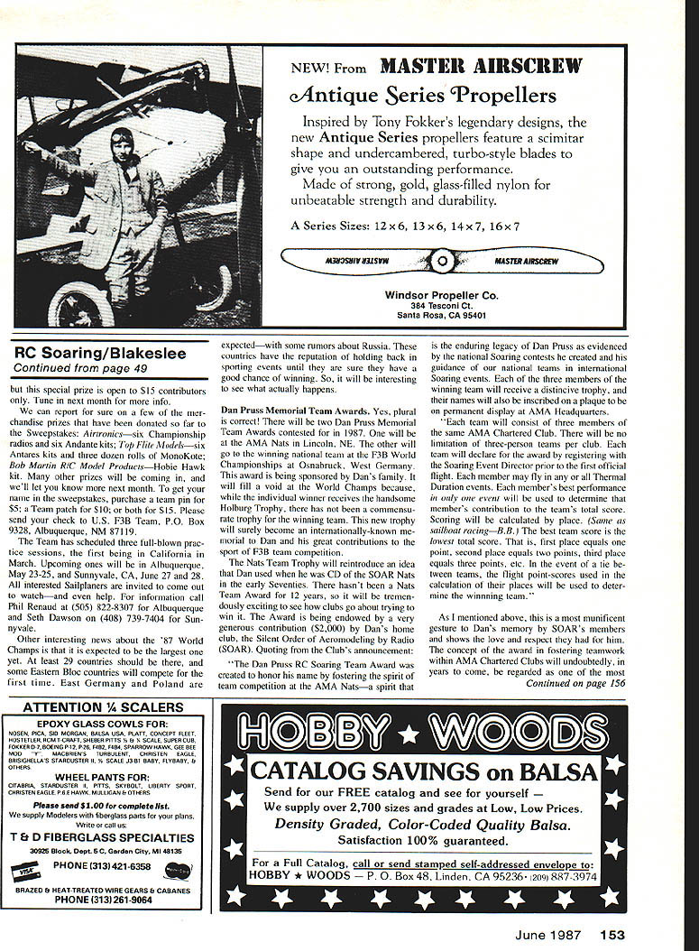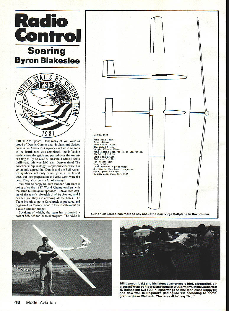 Radio Control Soaring Byron Blakeslee C 19111 F3B TEAM update proud Dennis Connor Stars Stripes crew Americas Cup races As soon fourth race completed inflatable tender came alongside passed over Ameri can flag fly S&Ss transom admit felt thrilland 200 am Denver time Americas Cup analogy appropriate because commonly agreed Dennis Sail Amer ica syndicate came up fastest boat preparation crew work best also spent lot money will happy leam F38 team going after 1987 World Championships same businesslike approach have seen cop ies teams biweekly Activity Report can tell covering bases Team intends go Osnabruck prepared organized Connor went Freemantlebut much smaller budget Speaking team has estimated cost $28628 total program AMA VtRGA 1981 Wing span 532in Area l24iin Root chord 1O21n Tip chord 7Sin Woight 1120 itto Wing loading l3oo/aqtt tStozIaqft Airfoil HQ 25 9% Stab span 23iin Stab chord 4iin Fin height tim Length ISin Construction S piece wing S-gloss blue foam composite spar glass tusolage Design John Wyas Oct 1988 48 Model Aviation K Author Blakeslee has say about new Virga Sailplane column Bill Llpscomb L arid latest quarterscale bird beautifui allglass ASW-20 FiberGlas Flugei W Germany Mike Leonard N ireland put two OO-ln-span wings Open-ciass GuppyR flew well Englands Radioglide 86 accordIng photo grapher Sean Walbank rules didnt say Nol providing little less half$13083 Prac tically rest must raised con tributions Note AMA pays round-trip airfare three team members team manager assistant team manager airport nearest homes city closest World Cham pionships site team entry fees food lodging team official meet dates three extra nights lodging contest site practice flying 80% extra chargeif anyfor transportation model boxes Expenses travel room/board etc spouses other team support personnel paid team members contri butions supporters Ve hicle rental fees paid either team mem bers Team Fund Team Fund escrow account held AMA HQ contains monies contributions program en try fees RMcM budget breaks down $18940 airfares food lodging eight team mem bers Germany $3500 airfares lodging practice sessions California New Mexico $4736 pins patches sold uniforms winch line winch bat teries first glance may seem like lot money cant afford spend less expect team make better showing Ger did England 83 Australia 85 Also note fliers dont get help airplanes radios winches put very large personal investment time money program dont believe its official write team hoping have really terrific prize special drawing addition sweepstakes trip Europe watch Championships dont have details what trip includes Continued page 153 0 SCALE RADIO CONTROL VINTAGE sizes21/2 3/431/i 1334 11443/i 1145 1/e6% AkkLL WHE CONTROL-U NE GOLDEN AGE sizes21/i 3/43/e 13 11/443/i 11/25 17/s6A SCALE PILOTS MACHINE GUN KITS ELS FREE-FLIGHT NEW BALLOON 2hz4 314514 33/4 CYLINDERS ENGINE KITS PLASTIC DISPLAY MODELS Send $2 fully illustrated catalog ether kits accessories Dept MA PAWNEE ST SAN MARCOS CA 9 b1 NEW Install RC Models Check receiver battery status press button Small Light 1/z oz Precise Rugged ORDER TODAY dealer Protune Corp 914 4626452 PO Box 1808 Poughkeepsie NY 12601 June1987 49 commemorative patch last years Colorado Challenge Cup RMSA won again Theres column about regional assocIatIons contests SMOOTH CONTOUR 23/4 1314 1143 114414 2514 AMA District Vii Vice-President Pete Waters also president Kraft Midwest shows check RC transmitters output using spectrum analyzer Photo taken Eastern Iowa Soaring Soci ety Building Soaring Seminar ATT- CHEK2 ON-Board Battery Tester Saves Time. Saves Models AiTCHEK RX-1 $1495 e USA NEW MASIILR AIRSCRIW eAntique Series Propellers Inspired Tony Fokkers legendary designs new Antique Series propellers feature scimitar shape undercambered turbo-style blades give outstanding performance Made strong gold glass-filled nylon unbeatable strength durability Series Sizes 12x6 13x6 14x7 16x7 MIEISMIV HILSVM iY WSTERAIRSCREVd Windsor Propeller Co 384 Tesconi Ct Santa Rosa CA 95401 special prize open $15 contributors Tune next month info can report sure few mer chandise prizes have donated far Sweepstakes Airtronicssix Championship radios six Andante kits Top Flite Modelssix Antares kits three dozen rolls MonoKote Bob Martin R/C Model ProductsHohie Hawk kit other prizes will coming well let know next month get name sweepstakes purchase team pin $5 Team patch $10 both $15 Please send check US F3B Team PO Box 9328 Albuquerque NM 87119 Team has scheduled three full-blown prac tice sessions first being California March Upcoming ones will Albuquerque May 23-25 Sunnyvale CA June 27 28 interested Sailplaners invited come out watchand help information call Phil Renaud 505 822-8307 Albuquerque Seth Dawson 408 739-7404 Sun nyvale Other interesting news about 87 World Champs expected largest yet least 29 countries should some Eastern Bloc countries will compete first time East Germany Poland expectedwith some rumors about Russia countries have reputation holding back sporting events until sure have good chance winning So will interesting see what actually happens Dan Pruss Memorial Team Awards Yes plural correct will two Dan Pruss Memorial Team Awards contested 1987 will AMA Nats Lincoln NE other will go winning national team F3B World Championships Osnabruck West Germany award being sponsored Dans family will fill void World Champs because individual winner receives handsome Holburg Trophy has commensu rate trophy winning team new trophy will surely become internationally-known morial Dan great contributions sport F3B team competition Nats Team Trophy will reintroduce idea Dan used CD SOAR Nats early Seventies hasnt Nats Team Award 12 years will tremen dously exciting see clubs go about trying win Award being endowed very generous contribution $2000 Dans home club Silent Order Aeromodeling Radio SOAR Quoting Clubs announcement Dan Pruss RC Soaring Team Award created honor name fostering spirit team competition AMA Na