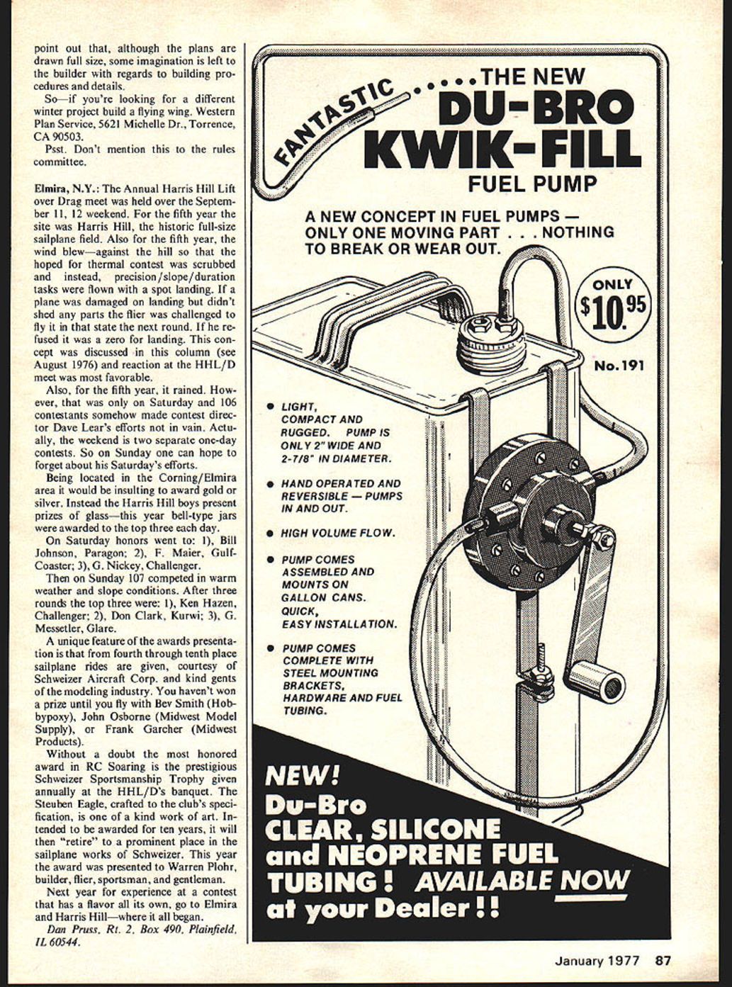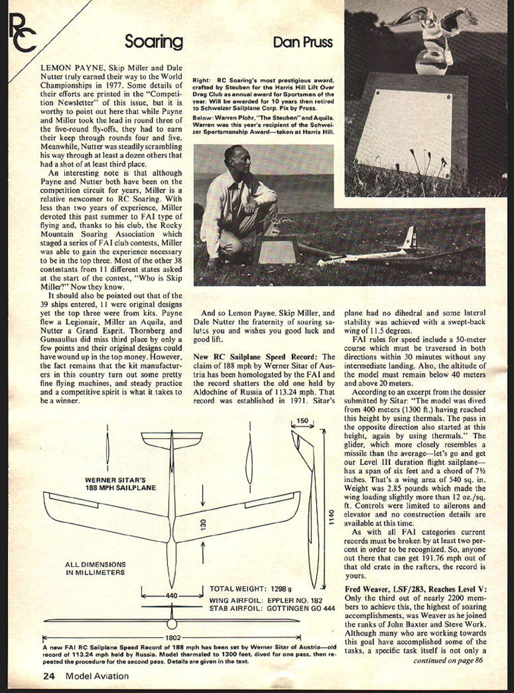 Soaring LEMON PAYNE Skip Miller Dale Nutter truly earned way World Championships 1977 Some details efforts printed Competi tion Newsletter issue worthy point out Payne Miller took lead round three five-round flyoffs earn keep through rounds four five Meanwhile Nutter steadily scrambling way through least dozen others shot least third place An interesting note although Payne Nutter both have competition circuit years Miller relative newcomer RC Soaring less two years experience Miller devoted past summer FAI type flying thanks club Rocky Mountain Soaring Association staged series ofFAl club contests Miller able gain experience necessary top three Most other 38 contestants 11 different states asked start contest Skip Miller Now know should also pointed out 39 ships entered 11 original designs yet top three kits Payne flew Legionair Miller Aquila Nutter Grand Esprit Thornberg Gunsaullus did miss third place few points original designs could have wound up top money However fact remains kit manufactur ers country turn out some pretty fine flying machines steady practice competitive spirit what takes winner Lemon Payne Skip Miller Dale Nutter fraternity soaring sa luts wishes good luck good lift New RC Sailplane Speed Record claim 188 mph Werner Sitar Aus tria has homologated FAI record shatters old held Aldochine Russia 11324 mph record established 1971 Sitars 7 46 WERNER SITARS 188 MPH SAILPLANE WING AIRFOIL EPPLER NO 182 STAB AIRFOIL GOTTINGEN GO 444 U -I F new FAI RC Sailplane Speed Record 188 mph has set Werner Sitar Austriaold record 11324 mph held Russia Model thermaled 1300 feet dived pass re peated procedure second pass Details given text plane no dihedral some lateral stability achieved swept-back wing 115 degrees FAI rules speed include 50-meter course must traversed both directions within 30 minutes intermediate landing Also altitude model must remain below 40 meters above 20 meters According excerpt dossier submitted Sitar model dived 400 meters 1300 ft having reached height using thermals pass opposite direction also started height again using thermals glider closely resembles missile averagelets go get Level III duration flight sailplane has span six feet chord 7 inches Thats wing area 540 sq Weight 285 pounds made wing loading slightly 12 oz/sq ft Controls limited ailerons elevator no construction details available time As FAI categories current records must broken least two per cent order recognized So anyone out can get 19176 mph out old crate rafters record yours Fred Weaver LSF/283 Reaches Level V Only third out nearly 2200 mem bers achieve highest soaring accomplishments Weaver joined ranks John Baxter Steve Work Although working towards goal have accomplished some tasks specific task itself continued page 86 24 Model Aviation Right RC Soarings prestigious award crafted Steuben Harris Hill Lift Over Drag Club annual award Sportsman year Will awarded 10 years retired Schweizer Sailplane Corp Pix Pruss Below Warren PlohrThe Steuben Aquila Warren years recipient Schwei zer Sportsmanship Awardtaken Harris Hill ALL DIMENSIONS IN MILLIMETERS u 40..J TOTAL WEIGHT 1298g NEW FORD TRI MOTOR 1195 TIGER MOTH 1295 Unique because such amazing scale dpt kits relatively ~ som~" ways suchIedg1§ 1fljFIedgli t yoU reW0 chaflfle Wail ttII see 0tber t Oh sprifl0~ yourclearly shown . rugnly detailed Plastic Parts thata touch realism-in-miniature NEW Zi MESSERSCHMITT 495 ZERO ready bolt placeComplete control system less handle lines decals landing gear wheels etc makes building cinch assembly literally minutes can use nn 049 engine needs about 50 flights prepare him competition Plans Bobs meager supply gone Plans should available February 1977 Tom Dixon $500 plans will drawn dimensions given two Model viation articles Write Tom 9025 Hurst Court Jones boro GA 30236 Incidentally Tom has flown several Gieseke Noblers planes follow generally what Bob has outlined wingspan 515 -span flaps Tom also likes put 1/32-in doubler inside fuselage trailing edge wing stiffness folks find yourself set Nobler plans systematically go through de tails mentioned order some plans Tom Dixon too can have Gieseke Nobler 1976 Nationals least five putt-putting around Gary McClellan Joe Musumeci Jr Roger Barrett two beautiful ones Bill Fitzgerald outfitted stabilator information Preci sion Aerobatics Model Pilots Assoc comments write Wynn Paul 1640 Maywick Dr Lex ington KY4OSO4 writing advertisers mention read about MA Nifty control line models Theyre easiest ones world assembleall wood no tissue coveringonly 6 9 parts depending model ex cept Biplanes have few Genuine Nylon motor mount THEYRE AT YOUR DEALER GET OVER AND SEE THEM NOW CL Aerobatics/Paul continued page 31 ings work better Teflon Make bush ings flaps least 1/4 long long can use Wear rate greatly re duced longer bushing Used steel bushings years good results Lubricate bushings vaseline graphitemix graphite vaseline until wont hold anymore cover horn bushing Finishing Bob uses very small quantitites glue epoxy building no fi berglass Using Aero-Gloss products builds up finish traditional way prefers use Japanese tissue cov ering does double-cover first wing panel lightening holes fuselage usually uses Aero-Gloss Stearman Red finish molds own canopies much like stock kit Lately has using Epoxolite fillets too much either adds weight Flying Recently Bob has used 59-ft lines has used same type large E-Z Just handle some time Now comes kicker back really practicing probably got 350 flights before going Nats FAI tryouts could probably fly brick Orwick 50 times least turn decent pattern Nowdays Bob feels once plane trimmed RC Soaring/Pruss continued page 24 stumbling block means end also Fred gives us few hints eight-hour slope flight feel C-size nicads sure way en during receiver servos giving up ghost solution usually requires larger standard class ship Weaver used four alkaline Everready pencells standard Aquila Before flight voltage six volts dropped 53 after ei