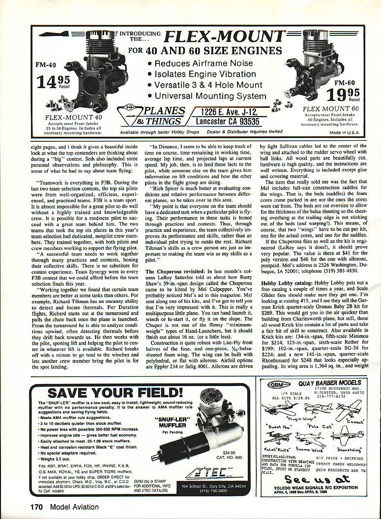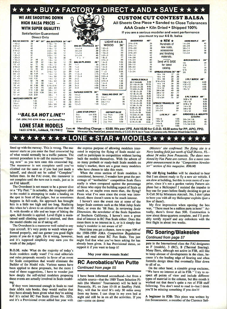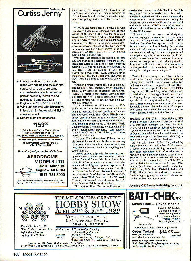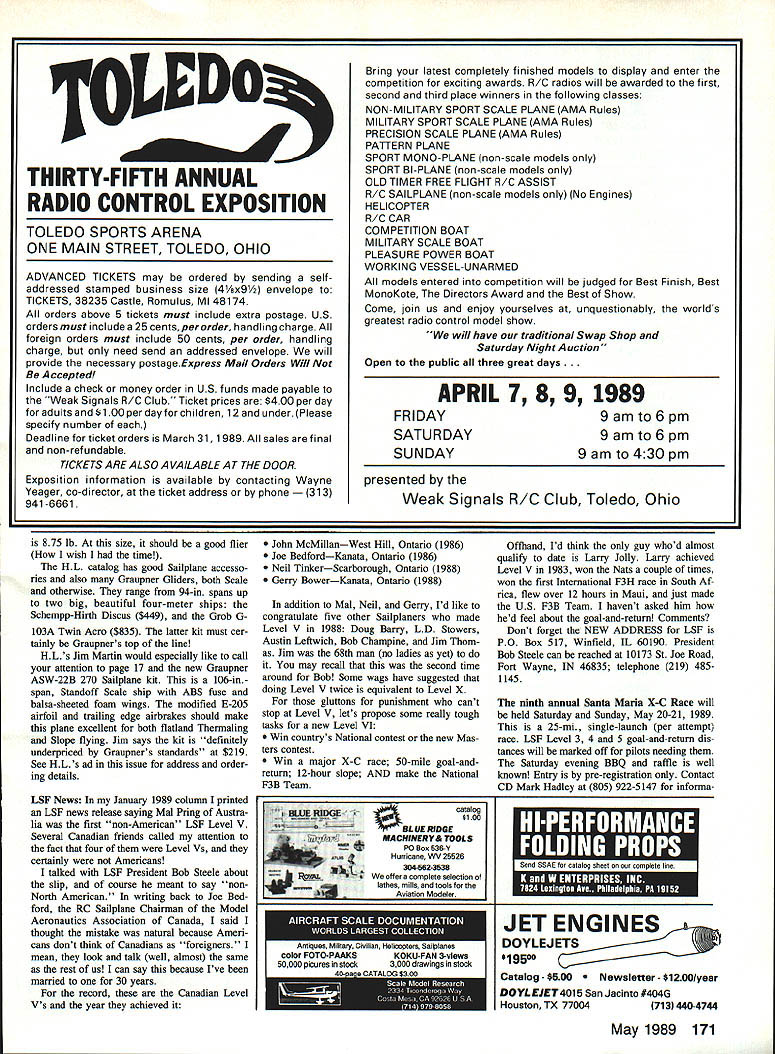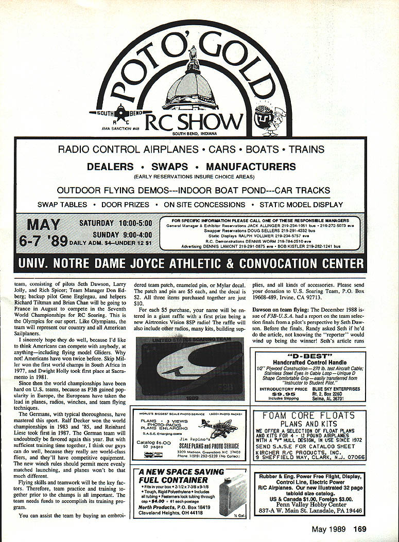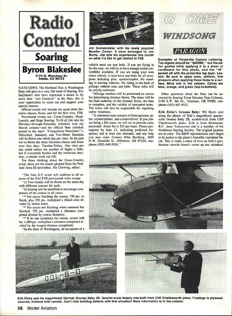 NATS NEWS Richiand Nats Washington State will give us very full week Soaring Sailpianers have expressed desire fly just Duration Nats opportunity come out support special interest Official events will include usual three Du ration classes Scale first time F3B Provisional events Cross-Country HandLaunch Slope Soaring fit Monday-through-Saturday schedule see March columnand official Nats schedule posted April Competition Newsletter Unlimited Standard Two-Meter Duration will flown whole day per class past weve flown three Duration classes Scale over four days Tuesday-Friday class per day could reduce number flights little everybody hustles retrievers func tion should work Out OK thinking about Cross-Country event details gleaned Port land Area SS newsletter Pat Chewing editor Nats X-C event will conform pects FAI F3H provisional rules except 1 Two rounds will flown same day different courses 2 Scoring will modified encourage com pletion course cases * racers finishing course 750 pts finish plus 250 pts multiplied x finish time di vided fastest time * racers finishing someone has finished 750 pts multiplied x distance com pleted divided course distance * no completes course scores will 1000 pts multiplied x distance completed di vided longest distance completed State Washington occupants vehicle must use seat belts flying race will try have enough rental con vertibles available using own chase vehicle must have seat belts occu pants including pilot spotter/copilot No stand ing moving vehicles No riding back pickups seats belts rules will stricfly enforced Mileage markers will positioned course determining distance flown timer will final authority distance flown time complete validity turn-point turns timer will also responsible reporting safety violations minimum team consists three persons pi lot copilot/spotter timer/driver can bring full team will try provide extra personnel Entry fee $25 per team Please pre register June 15 indicating preferred fre quency least alternate help may need Contact Mike Bamberg 1059 NW Darnielle St Hillsboro OR 97124 tele phone 503 640-5926 / 57 WINDSONG M5 Examples Vinylwrite Custom Lettering Top legend should GNOME ed itor goofed applying sheet cardboard photo N peeled off protective top layer Les son sure apply uniform firm pressure applying Items sur face info column Colors blue orange green top-to-bottom Other questions about Nats can swered Soaring Event Director Tom Culmsee 2190 SW 8th Dr Gresham OR 97080 tele phone 503 667-4532 Erik Eiches Grunau Baby Wil Byers sent along photos Eriks magnificent quarterscale Grunau Baby 2B scratch-built Cliff Charlesworth plans Erik Richmond BC near Vancouver member Northwest Soaring Society original pictures color B&W reproductions cant begin justice planes beautiful varnished fin ish really labor love Eriks part because varnish doesnt cover up mistakes Erik Eiche magnificent German Grunau Baby 2B Quarter-scale beauty built Cliff Charlesworth plans Fuselage plywood covered finished varnish Cant hide building defects situation information column 56 Model Aviation Radio Confrol Soaring Byron Blakeslee 3134 N Winnebago Dr Sedalla CO 80135 Jim Sonnenmeler newly acquired Mueller Comet once belonged Joe Wurts Jim tells experiences month what its like get started F3B joint has perfectly made can hope Erik will flying Baby Richland Scale Slope Fun-Fly Memorial Day week end well get pictures According Martin Simons excellent book Worlds Vintage Sailpianes Baby designed first built Edmund Schneiders factory Grunau Silesia 1931 span 1287 meters major redesign 1933 produced Baby 2 version 135meter span 2A greatly improved aile rons longer narrower planform adopted semi-enclosed canopy windscreen 2B model first fitted full airbrakes wing made slightly longer 1357 meters Over 4000 2Bs built NSFK pilot training program 1940 through 1944 page 59 Vintage Sailpianes book photo actual glider Erik modeled registra tion number D-8-l00 being bungee-launched Wasserkuppeonly painted NSFK cream paint scheme registration Maybe ship refinished varnish after war Cliff Charlesworth havent heard him lives Somerset England member along friend Sean Walbank White Sheet Radio Flying Club Cliff has longtime proponent quarter-scale vin tage Gliders publishing several designs British magazines Hes building about significant quarter-scaler year years latest being classic Reiher Cliff often works factory drawings plans super accurate models always sturdily built excellent fliers Scratchbuilding vintage Scale ship plans course lot work going kit route excellent designs arent available kits Also some kits too small scale produce nice big stable Glider get quarter-scale would like list plan sets available Cliff send large SASE Ill mall copy Cliff can provide canopies required some designs Ordering Cliff involves obtaining international money order Vinylwrite Custom Lettering noticed ad Vinylwrite RC Soaring Digest wrote information turns out another example modeler Art Morgan providing outstanding service fellow modelers Art sent few samples hope justice Arts beautiful work reproduction Vinylwrite basically three-layer type de cal really lot better old water type decais What first peel off bot tom protective layer exposes adhesive side vinyl letters numbers middle layer actual individual vinyl graphics position should go apply rubbing gently makes letters/numbers stick wing fuselage whatever remove top layer leaving individual graphics place come out perfectly Its quick easy professional-looking process Art can provide 15 colors several type styles slants reverse outline etc Prices vary depend ing size type number characters example Art will make AMA number 2 high $3 best thing write call Arts information package includes sample address Vinylwrite Custom Letter ing 16043 Tulsa St Granada Hill CA 91344 telephone 818 363-7131 PS Art says Sailplanes first love WarningF3B ahead Its fact small percentage American Sailplaners partici Continued page 167 May 1989 57