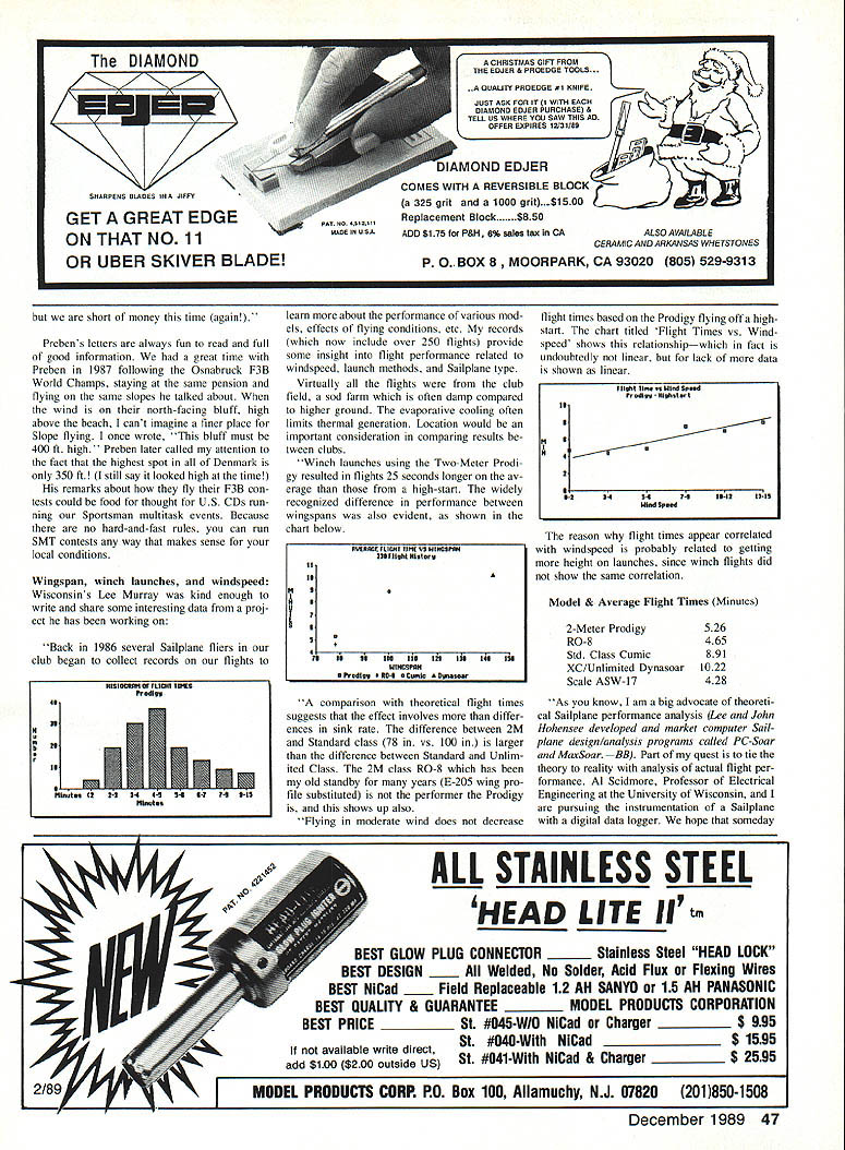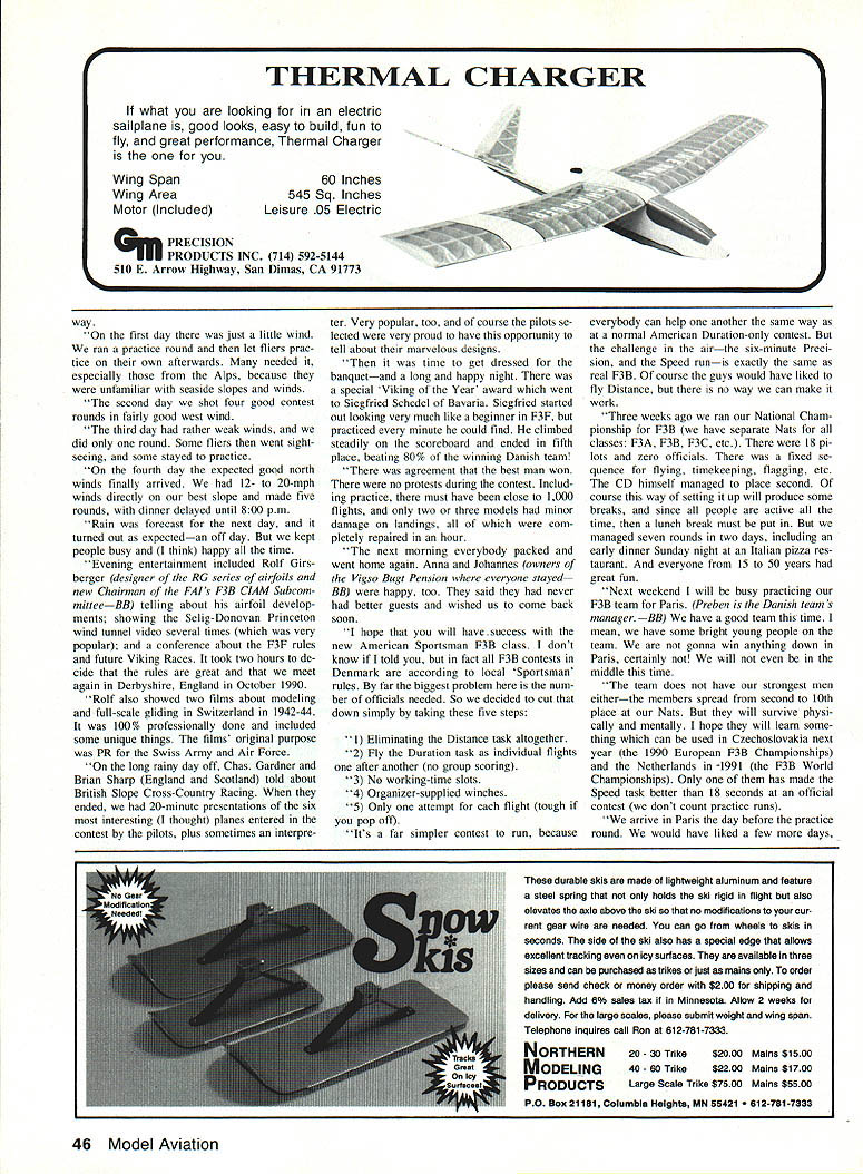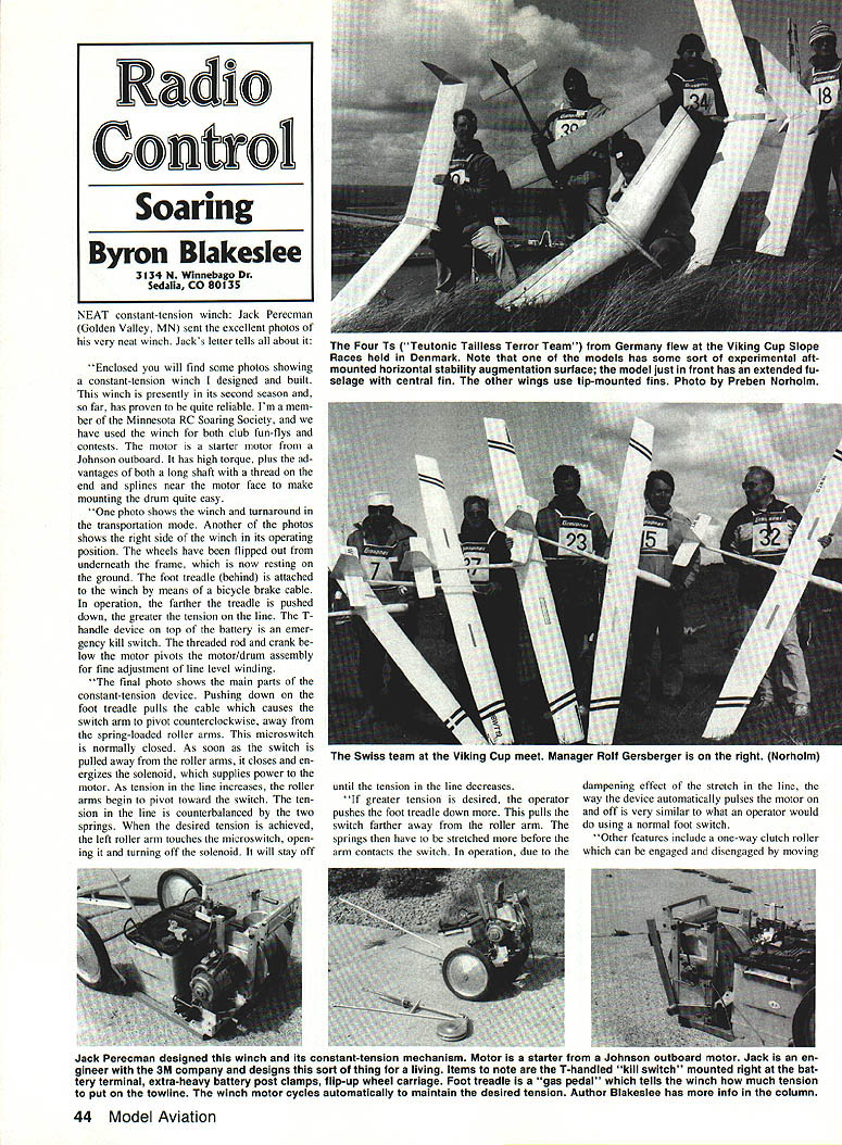 NEAT constant-tension winch Jack Perecman Golden Valley MN sent excellent photos very neat winch Jacks letter tells about Enclosed will find some photos showing constant-tension winch designed built winch presently its second season far has proven quite reliable Im mem ber Minnesota RC Soaring Society have used winch both club fun-flys contests motor starter motor Johnson outboard has high torque plus ad vantages both long shaft thread end splines near motor face make mounting drum quite easy photo shows winch turnaround transportation mode Another photos shows right side winch its operating position wheels have flipped out underneath frame now resting ground foot treadle behind attached winch means bicycle brake cable operation farther treadle pushed down greater tension line T handle device top battery emer gency kill switch threaded rod crank low motor pivots motor/drum assembly fine adjustment line level winding final photo shows main parts constant-tension device Pushing down foot treadle pulls cable causes switch arm pivot counterclockwise away spring-loaded roller arms microswitch normally closed As soon switch pulled away roller arms closes en ergizes solenoid supplies power motor As tension line increases roller arms begin pivot toward switch ten sion line counterbalanced two springs desired tension achieved left roller arm touches microswitch open ing turning off solenoid will stay off until tension line decreases greater tension desired operator pushes foot treadle down pulls switch farther away roller arm springs have stretched before arm contacts switch operation due dampening effect stretch line way device automatically pulses motor off very similar what operator would using normal foot switch Other features include one-way clutch roller can engaged disengaged moving 44 Model Aviation Radio Control Soaring Byron Blakeslee 3134 N Winnebago Dr Sedalia CO 80135 Four Ts Teutonic Tailless Terror Team Germany flew Viking Cup Slope Races held Denmark Note models has some sort experimental aftmounted horizontal stability augmentation surface model just front has extended fu selage central fin other wings use tip-mounted fins Photo Preben Norhoim Swiss team Viking Cup meet Manager RoIf Gersberger right Norholm Jack Perecman designed winch its constant-tension mechanism Motor starter Johnson outboard motor Jack en gineer 3M company designs sort thing living Items note T-handled kill switch mounted right bat tery terminal extra-heavy battery post clamps flip-up wheel carriage Foot treadle gas pedal tells winch much tension put towline winch motor cycles automatically maintain desired tension Author Blakeslee has info column small black lever seen just above center shaft clutch roller uses Torrington oneway roller bearing addition just below roller mounted roller arm small tri angular piece urethane rubber rubs rim drum effectively brakes drum slightly prevent backlashes main purpose building winch first see simple reliable constant-tension device could built F3B competition days weak link Second perhaps applicable average club putting stop switch arm possible easily ad just maximum tension pilot can achieve using winch have able launch Gnome hand-launched Glider immediately readjust winch launching Windsong addition possible beginners have con fidence launching airplanes fear folding wings can see what beautiful job engineering fabricating Jack did winch especially constant-tension device CT mechanism would course work winch just Jacks outboard-motor design Some careful machinework would need done duplicate though Jack said hed make drawings avail able theres enough interest can con tact Jack Pereeman 224 Natchez Ave North Golden Valley MN 55422 Incidenially winches should have kill switch similar Jacks cut off battery power case emergency common situ ation stuck solenoid tries strain plane through turnaround need switch can operate quickly state severe panic RV shops sell big copper knife switches about $20 mount right battery post Theyre cheap insurance Danish connection risk infringing Mark Triebes turf Id like print letter friend Preben Norholm Copenhagen describing 1989 Viking Cup Race Vi king Cup biggest annual International F3F event held North Sea slopes near Hanstholm Denmark last June F3F FAI Provisional event Slope Racers fly 10 laps 100-meter course against clockone plane time Slope Racing US traditionally run exciting way te wtth four planes flying against other heat However Europeans decided certain prospect midair collisions consequent loss hundreds dollars worth planes equipment sufficient rea son race one-at-a-time Preben founders F3F Racing justifiably proud success Viking Cup has achieved Preben too beauty event like gathering gether enthusiasts different coun tries Preben would like US fliers participate too team South Bay club got serious thinking stage couldnt quite man age trip 89 Maybe next year Isnt wonderful have hobby/sport can travel almost country world welcomed instant friends identical interests Prebens letter ended up 40 contestants coun tries spread Iceland Israel almost everything between came Switzer land Bavaria Berlin Westphalia Osnabruck area England Scotland Norway Nic Wright England won again Denmark took team trophy followed England NorIv finest model building equipment manufactured kahe4 zfloS4loAuh1wi 4ohrk a41/i/nna 94eady& Mdc dealer order direct-500A Magic Magnet Builder Icontains 16x48 Steel Base Plate 30 Magnets 10 stands S 9450 SOOB Master Magic Magnet Builder Icontains 1 6x4B Steel base plate 60 Magnets 20 stands 10 Vert press 10 steps 20 rib holders 50 sets nuts & bolts$16895 503B Base Plate Extension 1 6x1 6 Steel Base plate building giants$ 2695 501A Unassembled Magnets 10 pak$ 1195 501 B Assembled Magnets 10 pakS 2200 502 Stands 110 uprights primarily fuselage easyS 950 504 Vertical press 5 pak holding spars leading trailing edges position$ 995 505 Steps 5 pakl adjustible leading & trailing edge positioning$ 595 506 Rib Holder 10 p