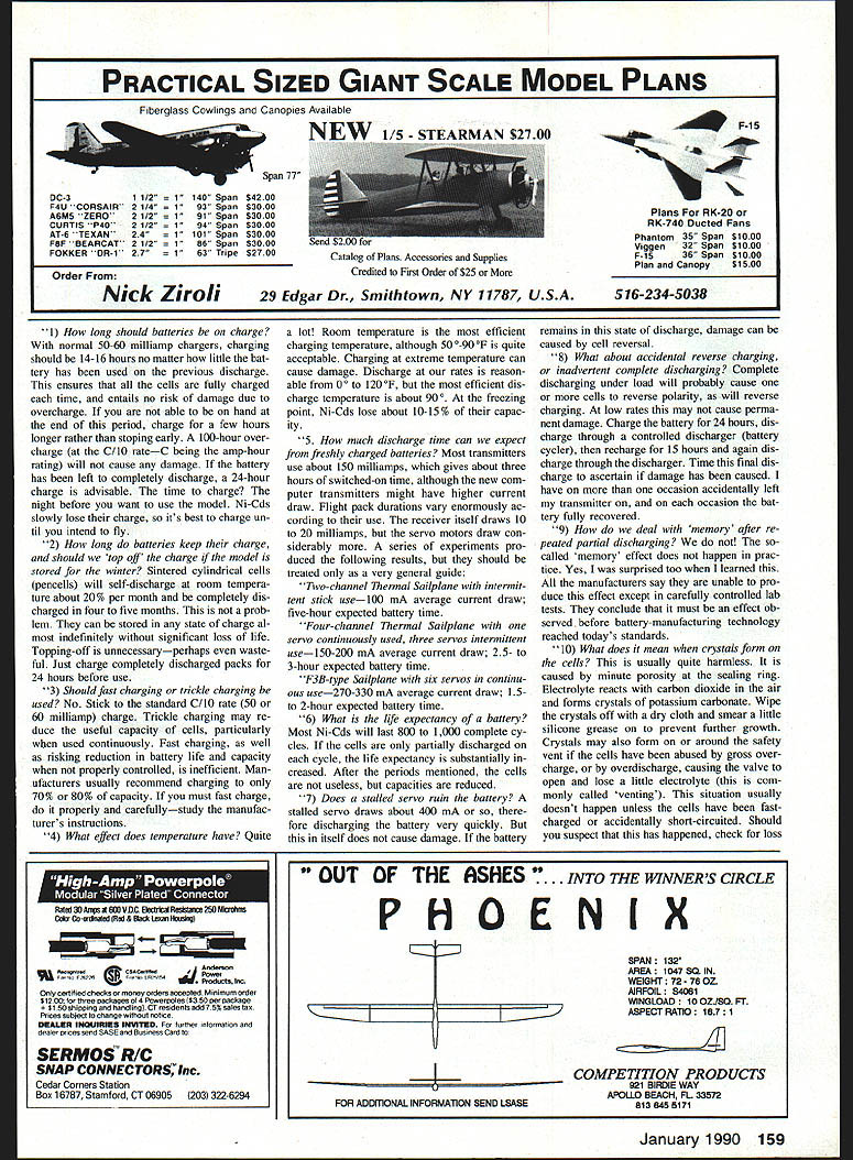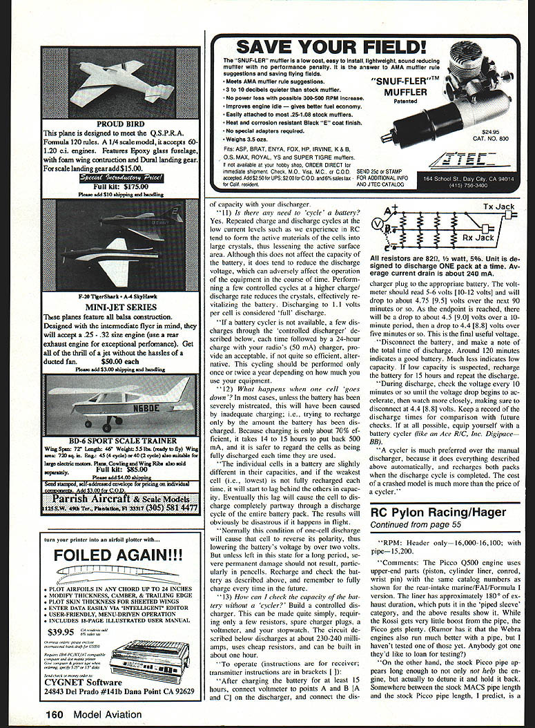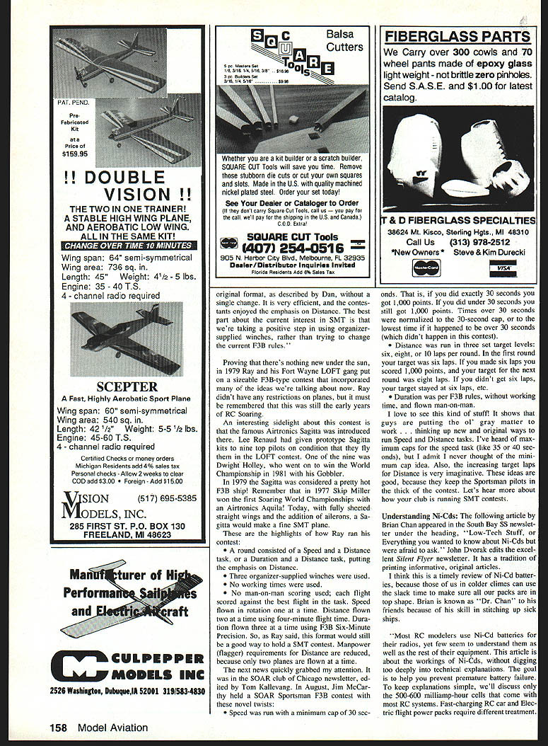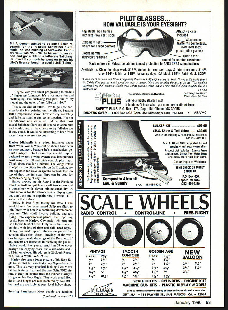 ORBITER name Hand-Launch Glider kit Dodgson Designs quite de parture Boh Dodgson two reasons First designed Bob Erie Jackson Portland second its built-up wood con struction instead Bobs normal fiberglass-andfoam technology H-L Gliders gaining more adher ents because theyre great way getting few flights during lunch Also can learn thermal planes up 15 ft thermal ing 150 ft seems like piece cake Eric flew Orbiter Nats H-L event finished fifth behind some pretty heavy competi tion likes Wurts Martin Jolly Har ris ship has 59-in span 432 sq area Selig 4061 airfoil weighs 17 18 oz miniradio three servos Whats unusu al Hand-Launcher features ailerons roll control flaps optional report Bobs Second Wind bian nual newsletter After flying season flapped version Orbiter Eric has some sights using flaps really light lift cant quite climb out marginal thermal Eric cracks little positive flap about %2 root trailing edge allows him turn tighter fly slower climb faster positive flap elevator compensation also gives him effect slight Up elevator maxes Nats Eric reflexed flaps thermaled plane inverted about half max Eric says hasnt found reflexing TE increases launch height usually launches neutral flap really light air sometimes launches %2 positive flap going back neutral just before tops out Orbiter kit $65 plus shipping Its best send two stamps Bob complete catalog mailing info Second Wind newsletter published twice year $1 per copy cash OK contains tidbits interest espe cially Dodgson Designs kit fansof number steadily growing Thermal contest fliers have found Bobs Lovesong tough ship beat address 21230 Damson Road Bo thell WA 98021 modeler steps up October 1989 col umn pumped Oly II pilots consider mov ing up Sagitta gitta fliers advanc ing aileron ships Going more ca pable planes think biggest kicks can experience fantastic hobby column used analogy full-size Soar mg ie transition trainers up 15Meter Unlimited racing ships pitch prompted Bill Anderson Laguna Niguel CA write Ive never written before enjoy col umn MA very much Ive Sailplanes 25 years have fun enjoy ment still reason letter column about full-size Sailplanes think must have gotten Schweizers mixed up Although some 2-22s around its 233 main trainer new glider pilots 1-35 built Standard Class com petition ship intermediate type happen know little about Schweizers because own SGS l-26E serial number 518 Al though Ive full-size soaring year know 1-35 ship can jump trainer 1-26 considered intermediate 1-35 might interested know rea son got full-size soaring because ing some research Scale RC project Steve Moskals 1-26 construction article February 1988 issue Model Avia tion took ride signed up lessons soloed about 15 hours began looking own 1-26E located purchased good Mo desto CA 1-26 Well its favorite ships long time Steves construction article appeared MA just start building seeing full-size ship knew would just matter time until got flew Its great ship Quick responsive thermals best joy fly thrill minute model flies just like big fly off slope Harley Michaclis newest designs span spectrum technology Experimental Roto 1 L uses pivoting wings roll longitudinal el evator control Wing also has camber-changing flaps Stabilizer fixed position Hed like other modelers try scheme infor mation column Easy Eagle R Two-Meter trainer kitted Ace RIC Inc Control surface hinging via Harleys rubber hinges Dodgson Designs newest kit Eric Jackson-designed Orbiter Hand-Launch Sailplane Flat wing tells uses aileronsunusual ship size Flaps optional Eric R did very well 89 Nats Kit sells $65 plus shipping Its wood built up 52 Model Aviation Radio Cono Soaring Byron Blakeslee 3134 N Winnebago Dr Sedalia CO 80135 agree about progressing models higher performance Its lot fun challenging Im enclosing two pics model other full-size 1-26 kind letter love get nec essarily bits pointing out slips because Bills experience shows closely modeling full-size soaring can come together Its either/or situation Id bet model Sailplane fliers all-around aviation nuts would jump chance try full-size too could would interesting hear fliers both Harley Michaelis retired insurance agent Walla Walla WAbut should have aero engineer because hes mechanical ge nius Harleys Roto experimental ship designed test wing system incorporates twist wings roll pitch control plus flaps Think about minute wings rotate opposite directions aileron roll action ro tate together elevator pitch control top full-span flaps can used camber-changing time Harley showed Roto 1 Richland Fun-Fly Roll pitch work off two servos transmitter elevon mixing capability third servo all-mechanical flap system dont ask explain worksall know does Harley flight testing Roto 1 would like few experienced Sailplane fliers join forces him continuing development program would involve building test flying Roto experimental planes reporting results back Harley Obviously program isnt faint heart Only first-class scratchbuilders lots time skill need apply Harley has made up information packet contains discussion sheets drawings vari ous linkages scale drawings Roto etc readers interested receiving packet Harley would like send him $3 cover postage copying costs self-addressed 9 x 12-in envelope address 26 South Roose velt Walla Walla WA 99362 Harley also sent better picture Easy Ea gle trainer described September col umn very practical-looking Two-Meter kit features flaps new Selig 7032 air foil Harley course uses rubber Harleys Hinges Easy Eagle work great Both kit hinges manufactured Ace R/C Inc available local hobby shop Soaring handicaps Most people familiar Continued page 157 PILOT GLASSES. HOW VALUABLE IS YOUR EYESIGHT Adjustable side frames free-flow ventilation Extremely light weight added comfort Attractive case included ...~Wraparound frame fits comfortably over mast prescription glasses Blocks harmful ultraviolet radiation Quartz mist coated scratch resistance Made entirely Polycarbonate impact protection ANSI Z871 speci