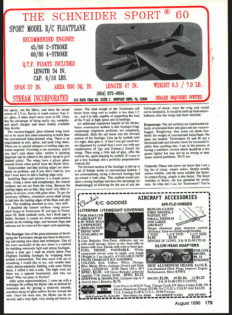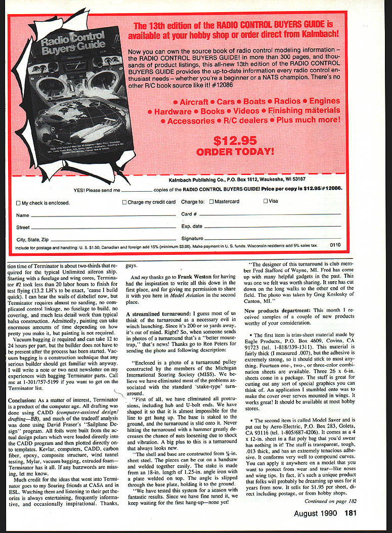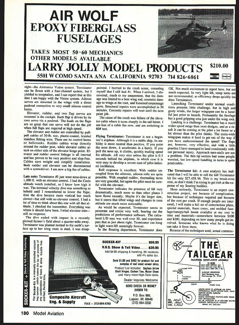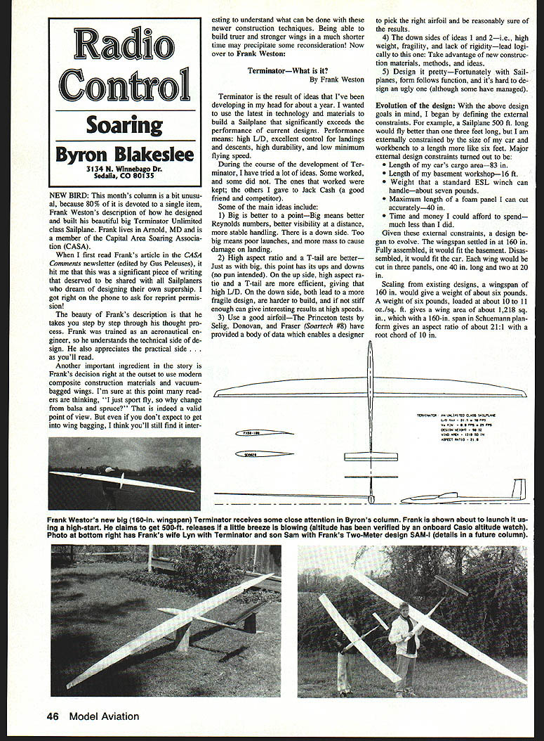 NEW BIRD months column bit unusu a] because 80% devoted single item Frank Westons description designed built beautiful big Terminator Unlimited class Sailplane Frank lives Arnold MD member Capital Area Soaring Associa tion CASA first read Franks article CASA Comments newsletter edited Gus Peleuses hit significant piece writing deserved shared Sailplaners dream designing own supership got right phone ask reprint permis sion beauty Franks description takes step step through thought pro cess Frank trained aeronautical en gineer understands technical side de sign also appreciates practical side youll read Another important ingredient story Franks decision right Outset use modern composite construction materials vacuumbagged wings Im sure point read ers thinking 1 just sport fly change balsa spruce indeed valid point view dont expect get wing bagging think youll still find interesting understand what can done newer construction techniques Being able build truer stronger wings much shorter time may precipitate some reconsideration Now over Frank Weston TerminatorWhat Frank Weston Terminator result ideas Ive developing head about year wanted use latest technology materials build Sailplane significantly exceeds performance current designs Performance means high L/D excellent control landings descents high durability low minimum flying speed During course development Ter minator have tried lot ideas Some worked some did ones worked kept others gave Jack Cash good friend competitor Some main ideas include 1 Big better pointBig means better Reynolds numbers better visibility distance stable handling down side Too big means poor launches mass cause damage landing 2 High aspect ratio T-tail better Just big point has its ups downs no pun intended up side high aspect ra tio T-tail efficient giving high L/D down side both lead fragile design harder build stiff enough can give interesting results high speeds 3 Use good airfoilThe Princeton tests Selig Donovan Fraser Soartech #8 have provided body data enables designer pick right airfoil reasonably sure results 4 down sides ideas 1 2ie high weight fragility lack rigiditylead logi cally Take advantage new construc tion materials methods ideas 5 Design prettyFortunately Sailplanes form follows function its hard de sign ugly although some have managed Evolution design above design goals mind began defining external constraints example Sailplane 500 ft long would fly better three feet long am externally constrained size car workbench length like six feet Major external design constraints turned out Length cars cargo area83 Length basement workshop16 ft Weight standard ESL winch can handleabout seven pounds Maximum length foam panel can cut accurately40 Time money could afford spend much less did Given external constraints design gan evolve wingspan settled 160 Fully assembled would fit basement Disas sembled would fit car wing would cut three panels 40 long two 20 Scaling existing designs wingspan 160 would give weight about six pounds weight six pounds loaded about 10 11 oz/sq ft gives wing area about 1218 sq 160-in span Schuemann planform gives aspect ratio about 211 root chord 10 wso vr 46 Model Aviation Radio Cono Soaring Byron Blakeslee 3134 N Winnebago Dr Sedalia CO 80135 Frank Westors new big 1 60-In wingspan Terminator receives some close attention Byrons column Frank shown about launch us ing high-start claims get 500-if releases little breeze blowing altitude has verified onboard Casio altitude watch Photo bottom right has Franks wife Lyn Terminator son Sam Franks Two-Meter design SAM-I details future column wing loading 10 11 ox/sq ft bigger faster plane wing load ing needs fly well Inductive reasoning will applied lieu technical explanation Good hand-launchers fly 4 oz/sq ft TwoMeters 6 Unlimiteds 9 F-16 160 lb/sq ft same wing loading manhole cover am told follows larger average Unlimited would fly well 10 Schuemann planform like looks Given weight aspect ratio wing area time pick airfoil Using variety performance programs David Frasers Sail plane Design data diskettes began sort through airfoils Among hot candidates emerged E-214 turbulators 5D7032 FX6O-100 turbulators RG15 SD7037 settled FX6O-100 number rea sons totally rational FX6O100 turbulators far away best performer German wind tunnel test data No test done Princeton turbulators would allow really good comparison SD foils Im sure trust united Ger trust Deutsche technically say FX6O-100 good believe also liked looks FX6O-l0O Its rationalbut what Its design hasnt FX6O-I00 used models its full-scale foil answer although capable blazing performance has plenty undercamber very thin trailing edge both difficult build conventional methods Ok now have wing airfoil remains designed fuselage con trol surfaces need stabilize wing point right direction cranked through few calculations yields fuselage length 62 wide enough hold two servos side side As concession American know-how used SD8020 foils em pennage fin rudder area came out about 69 sq horizontal stab ele vator 100 next step design process de velop structure capable supporting Continued page 178 PILOT GLASSES. HOW VALUABLE IS YOUR EYESIGHT Adjustable side frames free-flow ventilation Extremely light weight added comfort Blocks harmful ultraviolet radiation Attractive case included _________~Wraparound frame fits comfortably over prescription glasses -.. Quartz mist coated scratch resistance Made entirely Polycarbonate impact protection ANSI Z871 specifications Available Clear shop work $1325 Amber overcast days & late afternoons S14~ Gray S14~ & Mirror $19~ sunny days CA Mask S15~ Paint Mask S2O~ member club hit prop blade thrown 60 engine close range tip blade struck Safety Plus glasses saved him serious injury possibly loss eye incident convinced everyone should wear safety glasses near model airplane engines being run upEd Saul Secretary Treasurer Pikes Peak PC Club Prices include shipping handling See hobby dealer first doesnt have what ne