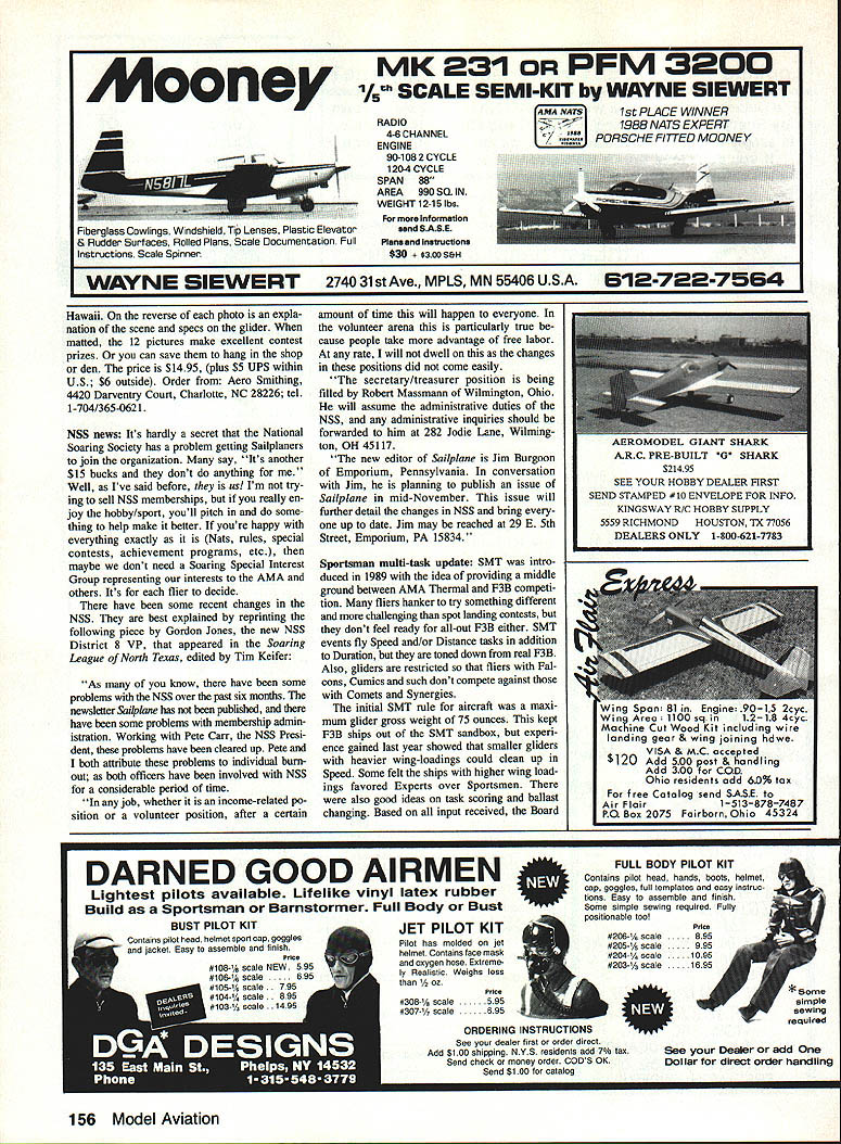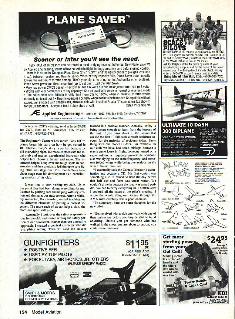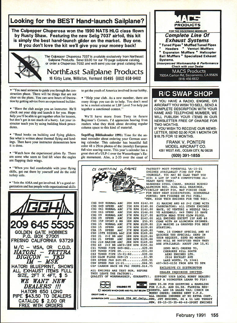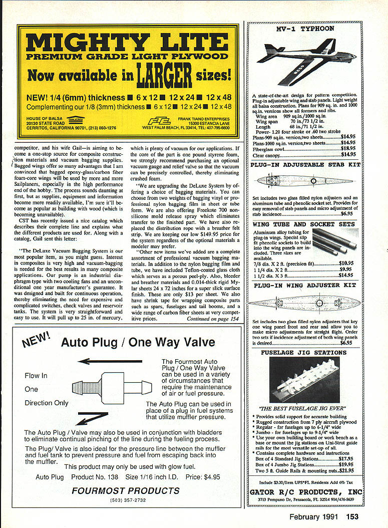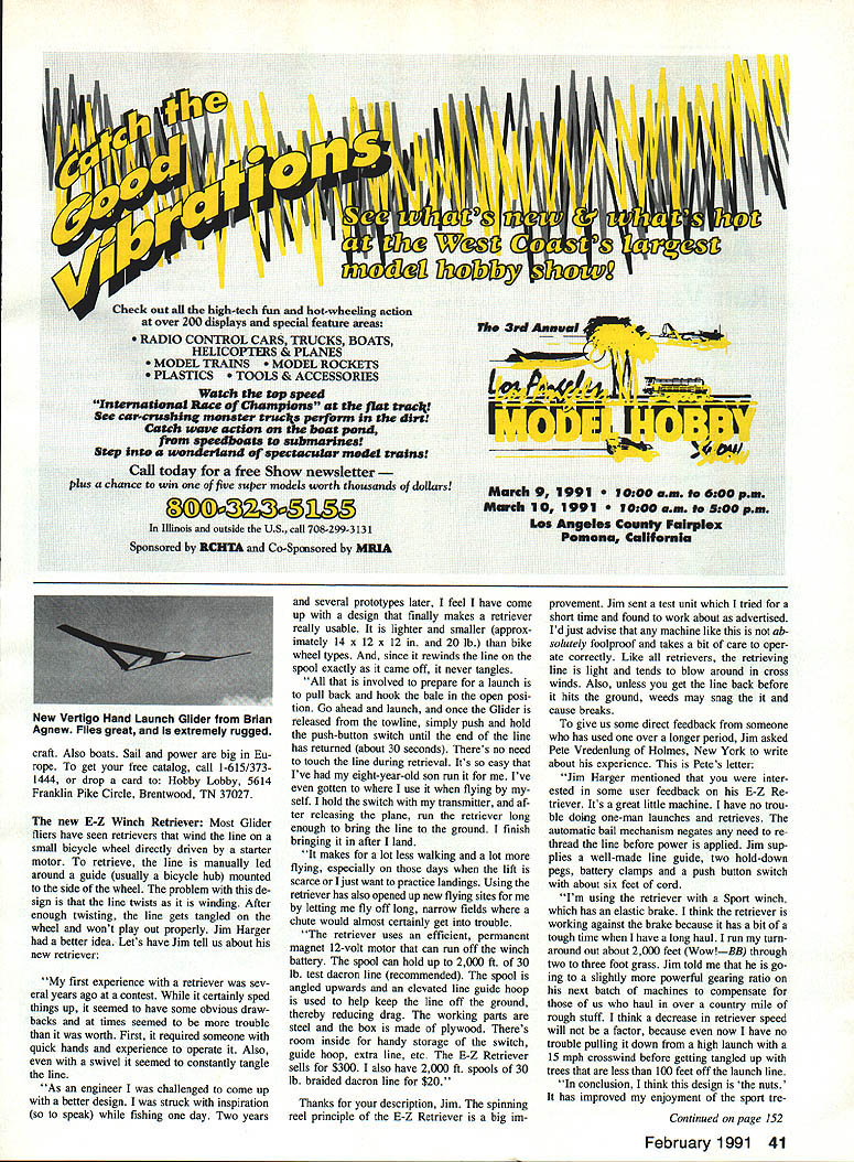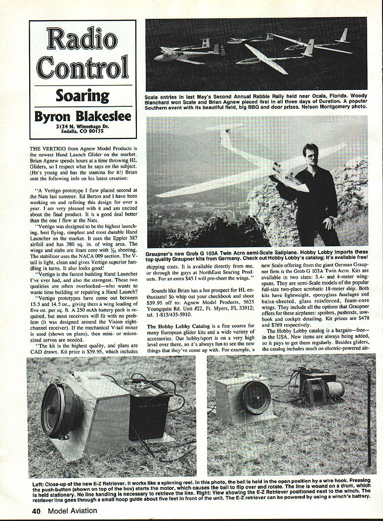 THE VERTIGO Agnew Model Products newest Hand Launch Glider market Brian Agnew spends hours time throwing HL Gliders respect what says subject Hes young has stamina Brian sent following info latest creation Vertigo prototype flew placed second Nats last summer Ed Berton have working refining design over year am very pleased am excited about final product good deal better flew Nats Vertigo designed highest launch ing best flying simplest durable Hand Launcher market uses Eppler 387 airfoil has 380 sq wing area wings stabs foam core A2 sheeting stabilizer uses NACA 009 section V tail light clean gives Vertigo superior han dling turns also looks good Vertigo fastest building Hand Launcher Ive ever also strongest two qualities often overlookedwho wants waste time building repairing Hand Launch Vertigo prototypes have come out between 135 145 oz giving wing loading five oz per sq ft 250 mAh battery pack re quired receivers will fit no prob lem designed around Vision eightchannel receiver mechanical V-tail mixer used shown plans mini- microsized servos needed kit highest quality plans CAD drawn Kit price $5995 incIi1p shipping costs available directly through guys NorthEast Soaring Prod ucts extra $45 will pre-sheet wings Sounds like Brian has hot prospect HL en thusiasts So whip Out checkbook shoot $5995 off Agnew Model Products 5625 Youngquist Rd Unit #22 Ft Myers FL 33912 tel 1-813/433-5910 Hobby Lobby Catalog fine source European glider kits wide variety accessories hobby/sport very high level over its always fun see new thines theyve come up example new Scale offering giant German Graup ncr firm Grob G 103A Twin Acro Kits available two sizes 34- 4-meter wingspans semi-Scale models popular full-size two-place acrobatic 18-meter ship Both kits have lightweight epoxyglass fuselages balsa-sheeted glass reinforced foam-core wings include options Graupner offers airplanes spoilers pushrods towhook cockpit detailing Kit prices $478 $769 respectively Hobby Lobby catalog bargainfree USA New items always being added pays get regularly Besides gliders catalog includes much electric-powered airLeft Close-up new E-Z Retriever works like spinning reel photo bail held open position wire hook Pressing push-button shown top box starts motor causes bail flip over rotate line wound drum held stationary No line handling necessary retrieve line Right View showing E-Z Retriever positioned next winch retriever line goes through small hoop guide about five feet front unit E-Z retriever can powered using winchs battery 40 Model Aviation Radio Conoi Soaring Byron Blakeslee 3134 N Winnebago Dr Sedaila CO 80135 Scale entries last Mays Second Annual Rabble Rally held near Ocala Florida Woody Blanchard won Scale Brian Agnew placed first three days Duration popular Southern event its beautiful field big BBQ door prizes Nelson Montgomery photo Graupners new Grob G 103A Twin Acro semi-Scale Sailplane Hobby Lobby imports top quality Graupner kits Germany Check out Hobby Lobbys catalog its available free Check out high-tech fun hot-wheeling action over 200 displays special feature areas RADIO CONTROL CARS TRUCKS BOATS HELICOPTERS & PLANES MODEL TRANS L ROCKETS PLASTICS S & ACCESSORIES Watch tp speed lntnsatienai Race ef Chaampins flEIt tvwc1 Dee car-cnshinq menster truc1s peverm dirt Catch wave actien en beat pen jwm spaedbeats te submarines Step hate wenderland ef spectacuksr med trains Cali today free Show newsletter plus chance win five super models worth thousands doUarsl Illinois outside US call 708-299-3131 Sponsored 3CHT& Co-Spnsored MUIA Tk~Ii -_ ITf 4~*#W Murch9 1991 Oaineed@@pin Mmeb 101991 ur.9e5@pm Lee Angeles Cewaty Fairplex Peas. Callfenta craft Also boats Sail power big Eu rope get free catalog call 1-615/3731444 drop card Hobby Lobby 5614 Franldin Pike Circle Brentwood TN 37027 new E-Z Winch Retriever Most Glider fliers have seen retrievers wind line small bicycle wheel directly driven starter motor retrieve line manually led around guide usually bicycle hub mounted side wheel problem de sign line twists winding After enough twisting line gets tangled wheel wont play out properly Jim Harger better idea Lets have Jim tell us about new retnever first experience retriever sev eral years ago contest certainly sped things up seemed have some obvious draw backs times seemed trouble worth First required someone quick hands experience operate Also swivel seemed constantly tangle line As engineer challenged come up better design struck inspiration speak fishing day Two years several prototypes later feel have come up design finally makes retriever really usable lighter smaller approx imately 14 x 12 x 12 20 lb bike wheel types since rewinds line spool exactly came off never tangles involved prepare launch pull back hook bale open posi tion Go ahead launch once Glider released towline simply push hold push-button switch until end line has returned about 30 seconds Theres no need touch line during retrieval Its easy Ive eight-year-old son run Ive gotten use flying self hold switch transmitter af ter releasing plane run retriever long enough bring line ground finish bringing after land makes lot less walking lot flying especially days lift scarce Ijust want practice landings Using retriever has also opened up new flying sites letting fly off long narrow fields chute would almost certainly get trouble retriever uses efficient permanent magnet 12-volt motor can run off winch battery spool can hold up 2000 ft 30 lb test dacron line recommended spool angled upwards elevated line guide hoop used help keep line off ground thereby reducing drag working parts steel box made plywood Theres room inside handy storage switch guide hoop extra line etc E-Z Retriever sells $300 also have 2000 ft spools 30 lb braided dacron line $20 Thanks description Jim spinning reel principle E-Z Retriever big im provement Jim sent test unit tried short time found work about advertised Id just advise machine like ab solutely foolproof takes bit care