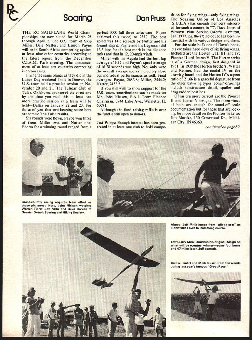 Soaring THE RC SAILPLANE World Cham pionships now slated March 28 through April 2 US team Skip Miller Dale Nutter Lemon Payne will South Africa competing against least nine other countries according latest report December CIAM Paris meeting announce ment least ten countries competing encouraging Flying same planes did Labor Day weekend finals Denver US team held practice session No vember 20 21 Tulsoar Club Tulsa Oklahoma sponsored event time read least practice session team will heldDallas January 22 23 keeping score some Tulsa results Six rounds flown Payne won three Miller two Nutter Scores winning round ranged Dan Pruss perfect 3000 three tasks wonPayne achieved twice 2552 best speed 146 seconds Nutter Grand Esprit Payne Legionair did 133 laps best mark distance tasks 12 20-mph winds Miller Aquila best lap average 917 Paynes speed average 1628 seconds high overall average scores incredibly close individual performances well Final averages Payne 26838 Miller 25542 Nutter 24325 still wish show support US team contributions can made Mr John Nielsen FAI Team Finance Chairman 3744 Lake Ave Wilmette IL 60091 Although fund raising raffle over fund still open donors Just Wings Enough interest has gen erated least club hold compe tition flying wingsonly flying wings Soaring Union Los Angeles SULA has enough members interest ed such contest 77 Dave Jones Western Plan Service Model Aviation Jan 1977 pg 86-87 no doubt has fluential various designs plans scale buffs Daves book lets contains three views six flying wings Included Horten II III IV Pioneer II Icarus V Horten series German design first designed 1931 1939 Horten brothers Walter Reimer model IV drawing board Horten IVs aspect ratio 2166 graceful departure other bat-wing types Jones drawings include substructure detail spoiler drag rudder locations era current Pioneer II Icarus V designs three views both enough stand-off scale documentation look ing detail Pioneer write Jim Marske 130 Crestwood Dr Michi gan City IN 46360 continued page 82 Below Tiahrt Mrlik launch weeds during last years famous Great Race Crosscountry racing requires team effort pix attest John Nielsen watches Warren Tiahrt Jeff Mrlik Dave Corven Greater Detroit Soaring Hiking Society Above Jeff Mrlik jumps piIots seat Tiahrt takes over land along course Left Jerry Mrlik launches original design what will eventual winnersome four hours 47 miles later Jeff controls RC Soaring/Pruss continued page 24 Brochures two dollars Icarus hang glider detailed information can obtained Icarus Aircraft 37 S Euclid SuiteS Pasadena CA 91101 Cross Country Dick Beltz pumped informa tion cause hes modest comes informa tion latest club hold crosscountry race Lancaster PA Area Soaring Society LASS held event Milton Hershey School Hershey PA Sept 25 course nearly eight miles school grounds win ner Dick Beltz own design Pokey time 49 minutes Dick uti lized high-start five launches Other finishers Don Goughnour 1 hr 06 mm 7 launches Bob Curry 1 hr 13 mm 7 launches Jerry Zeigenfuse 2 hr 04 mm 9 launches interesting note Beltzs over pace just behind set Mrlik/ Tiahrt Greater Detroit Soaring Hiking Society last July during Great Bicentennial RC Sailplane Race Yet Beltz averaged little over mile half per launch Detroit team over 35/I distance/launch ratio Since Great Race much arm chair flying has done fliers competed also observed also some just read about should remembered San Fernando Valley Silent Flyers got race business started happened two years ago inauguration Desert Dash unheard goal 20 miles SFVSFs have recent ly run third other two set up run downwind Now planes compete races downwind direction flight necessarily cut out crosscountry flying closed course flown Example super floater has its best glide ratio 101 say 10 mph know arent going cross much country have fly 10 mph headwind ap parent clubs entered Great Race However some points discussed since last summer can passed whatever its worth de partment super floater bird racing consider opposite extreme Nelson KA-6 new scene soaring Nelson KA-6 fibreglass sailplaneall fibreglass wings tail included appeared scene about eight years ago Weight nearly 11 pounds wing loading over 24 ounces per square foot Stall ing speed about 15 mph L/D about 301 about 35 mph Simply put meant mile high KA-6 could fly 30 miles encountering other thermal Now could find thermal did still thermal 30 miles flier should able find another race course likes Great Race could flown approximately hour 30 minutes utilizing launch above figures merely hypothetical However prac ticability such plane such race must questioned First stall speed 15 mph large landing zones have carefully select ed damage incurred plane type repair required usually beyond Hot Stuff/Monokote requirements Launching requires brute strength 12-volt winch ROG Rise Off Ground imperative cross-country courses can pro vide latter requirements Furthermore because such high aspect ratio visibility such plane good other 12-foot sailplanes mile high would impractical altitude reach doesnt mean ther mals couldnt encountered often course flown lower altitudes however possibility frequent landings would also have considered seems racing per formance gap between KA-6 days popular kits crosscountry racing aspect competition Yet gap can closed todays kits designed around precision/duration tasks performance gap reversed con siders KA-6 type precision/duration spot landing Todays designs ballasted should perform very well cross-country work analyzes FAI scores last summer can seen happy compromise can exist between lazy afternoon floater high performing KA-6 type can surmise outcome race between floater fewer launches required ship much higher L/D possibly requiring twice tows say plane higher wing loading possibly higher L/D would need launch often would necessarily get better mileage time went up point consider trade-off anticipated would advantage ship flew faster required launches could get few times less 