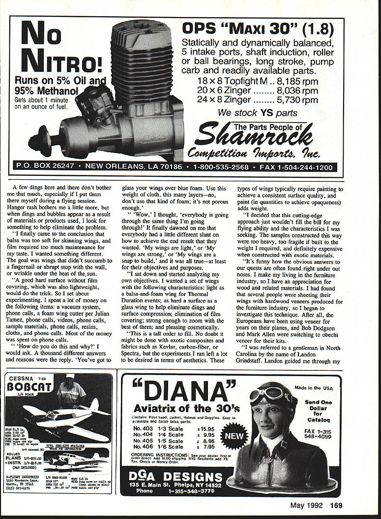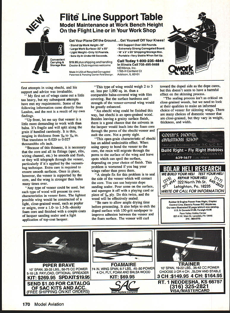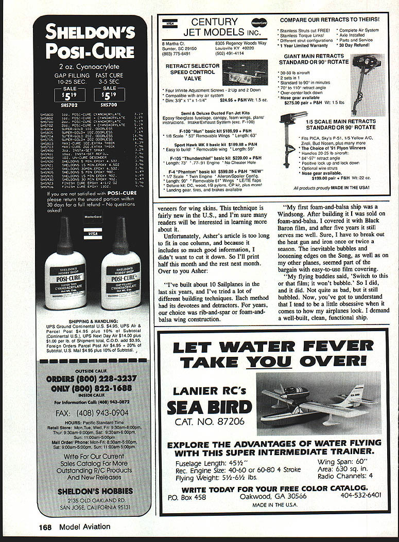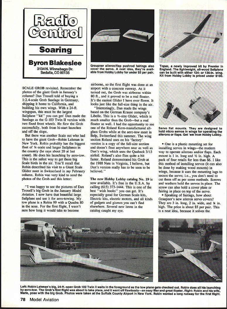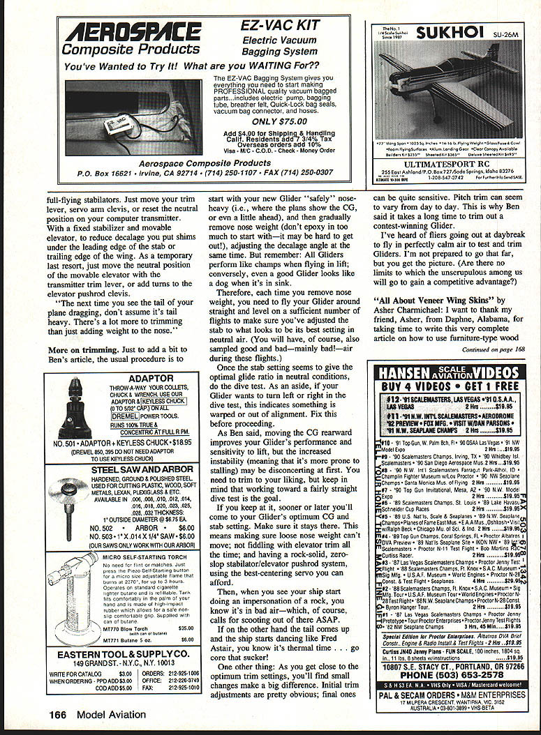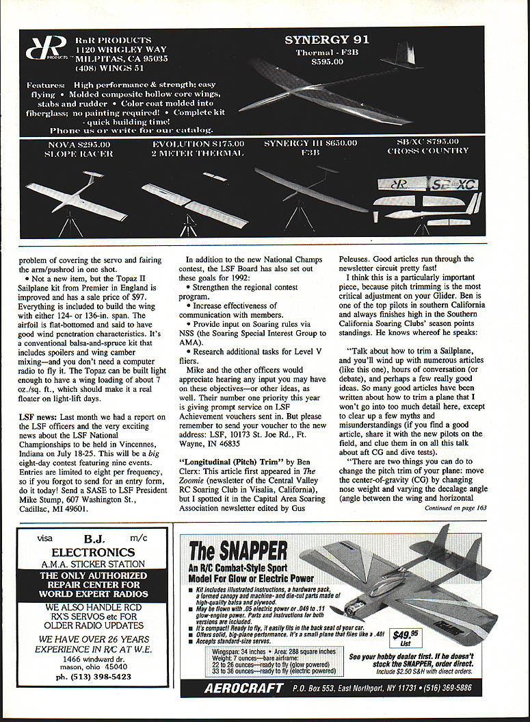 SCALE GROB revisited Remember photos giant Grob Januarys column Dan Troxell told buying 1 24-scale Grob fuselage Germany shipping home California building own wings 24-ft wingspan must largest Sailplane kit can get Dan made fuselage G-103 Twin II version two fixed front wheels flew Grob successfully both hi-start launches off slope another Scale nut have giant GrobRobin Lehman New York Robin probably has biggest fleet A-scale larger Sailplanes country says about 20 last count does launching aero-tow safest way get big Scale birds air Youll recall Robin described visit Giant Scale Glider meet Switzerland February column Robin very kind send photos Grob letter happy see pictures Dan Troxells big Grob January Model Aviation now have beautiful large Sailplane use aero-towing tow plane Robin 99 Quadra 80 nose first flight wasnt sure long would take become airborne first flight done airport concrete runway As turned out Grob airborne within 80 ft proved real floater Its easiest Glider have ever flown looks just like full-size thing air Interestingly Dan made wings based German Krause companys Libelle A-size Glider much smaller Grobbut real floater well opportunity see Roland Kern-manufactured allglass Grobs aero-tow meet Belp Switzerland summer wing section Roland uses factory version copy full-size section doesnt float anywhere near well Dans wing uses Quabeck 3/13 airfoil Rolands also flies quite bit faster Roland demonstrated Grob 1988 Nats Virginia believe Dans version really has seen believed new Hobby Lobby catalog No 19 now available Its free USA calling 615 373-1444 best wish books can get Its especially good German Scale kits Electric kits electric motors kinds gadgets gismos cant find elsewhere Several new items catalog caught eye plastic mounting set installing servos wingsthe modern way operate ailerons and/or flaps mount 1 long pack four retails less $6 like method installing servos can also done making wood mounts wings because uses mounting lugs secure servo ie dont need cut off per some methods Screws washers hold servos place screw can also hold cover plate fairing place top servo Speaking fairings about Graupners new aileron servo covers 3 long 2 wide Y4 high price about $5 per pair neat idea because solves 78 Model Aviation Soaring Byron Blakeslee 3134 N Winnebago Dr Sedalia CO 80135 Graupner aileronhfiap pushrod fairings also Topaz newly Improved kit Premier cover servo neat idea theyre avail- England lightweight all-wood Sailplane able Hobby Lobby under $5 per pair can built either 124- 136-in wing Kit Hobby Lobby priced under $100 Servo fiat mounts designed hold micro servos wings operating ailerons flaps Get em Hobby Lobby Left Robin Lehmans big 24-ft-span Grob 102 Twin ii waits foreground tow plane gets checked out Robin does launching aero-tow Grobs first flight about take place went off flawlesslyan easy flier great floater Right Robin wife Marie pose big Grob Photos taken Suffolk County Airport New York Robin wanted long runway first flight problem covering servo fairing arm/pushrod shot new item Topaz H Sailplane kit Premier England improved has sale price $97 Everything included build wing either 124- 136-in span airfoil flat-bottomed said have good wind penetration characteristics Its conventional balsa-and-spruce kit includes spoilers wing camber mixingand dont need computer radio fly Topaz can built light enough have wing loading about 7 ozIsq ft should make real floater light-lift days LSF news Last month report LSF officers very exciting news about LSF National Championships held Vincennes Indiana July 18-25 will big eight-day contest featuring nine events Entries limited eight per frequency forgot send entry form today Send SASE [SF President Mike Stump 607 Washington St Cadillac MI 49601 addition new National Champs contest LSF Board has also set out goals 1992 Strengthen regional contest program Increase effectiveness communication members Provide input Soaring rules via NSS Soaring Special Interest Group AMA Research additional tasks Level V fliers Mike other officers would appreciate hearing input may have objectivesor other ideas well number priority year giving prompt service LSF Achievement vouchers sent please remember send voucher new address LSF 10173 St Joe Rd Ft Wayne IN 46835 Longitudinal Pitch Trim Ben Clerx article first appeared Zoomie newsletter Central Valley RC Soaring Club Visalia California spotted Capital Area Soaring Association newsletter edited Gus Peleuses Good articles run through newsletter circuit pretty fast think particularly important piece because pitch trimming critical adjustment Glider Ben top pilots southern California always finishes high Southern California Soaring Clubs season points standings knows whereof speaks Talk about trim Sailplane youll wind up numerous articles like hours conversation debate perhaps few really good ideas So good articles have written about trim plane wont go too much detail except clear up few myths misunderstandings find good article share new pilots field clue talk about aft CG dive tests two things can change pitch trim plane move center-of-gravity CG changing nose weight varying decalage angle angle between wing horizontal Continued page 163 FOR ATES WE HAVE OVER 26 YEARS EXPERIENCE IN RC AT WE 1466 windward dr mason ohio 45040 ph 513 398-5423 visaBJrn/c ELECTRONICS ya pa. pads made WV IIUdUUWU ,,iactt Ready fly easily fits backseat car Offers solid higplane performance Its small plane flies like 40l $4996 Accepts standard-size servosList Wingspan 34 inches 288 square inches Weight 7 ouncesbare airframeSee hobhy dealer fIrst Ithe doesnt 22 26 ouncesready fly glow poweredstock NAPPER tinier direct 33 38 ouncesready fly electric poweredInclude $250 S&H direcf orders ADAt aii Avanti Conquest VI Conquest 120 Cursor Desire EU-iA Eclipse Fresh Aire Krier Kraft Jekyll 60 RIC City EL lull 11116 AJA*Ja Jekyll 120 LA-i Phoenix 8 Phoenix 8/45 Punch ESkybolt Summit Ill Sundowner Worlds Finest Fibergla