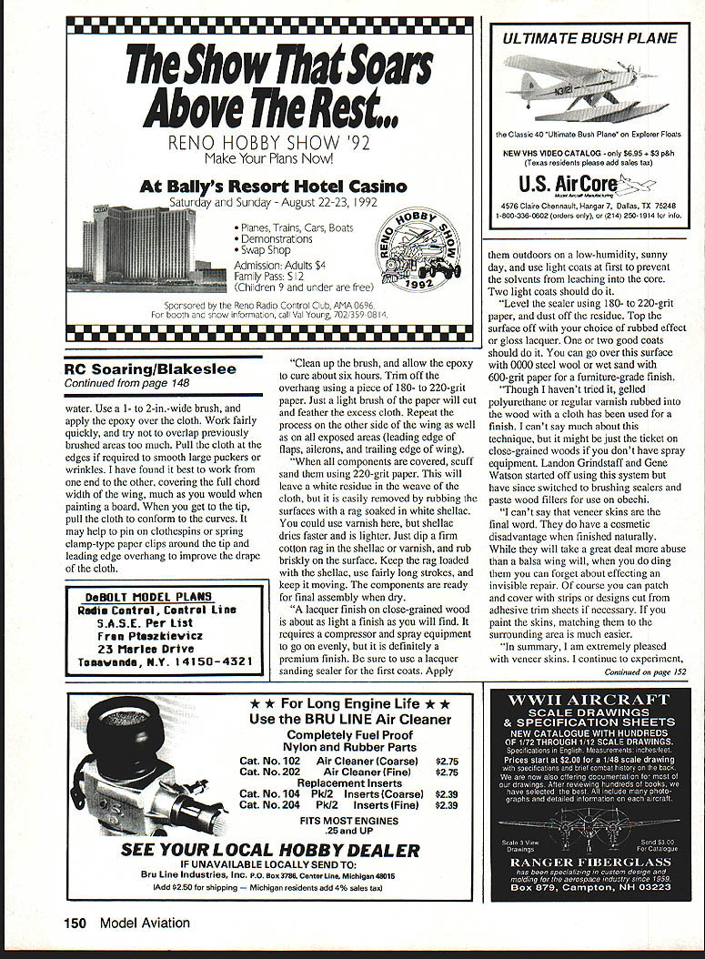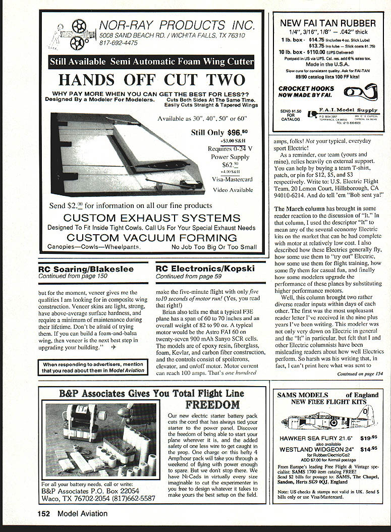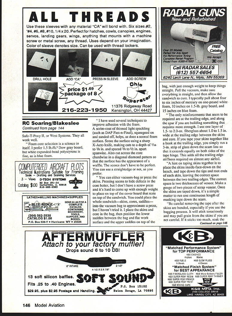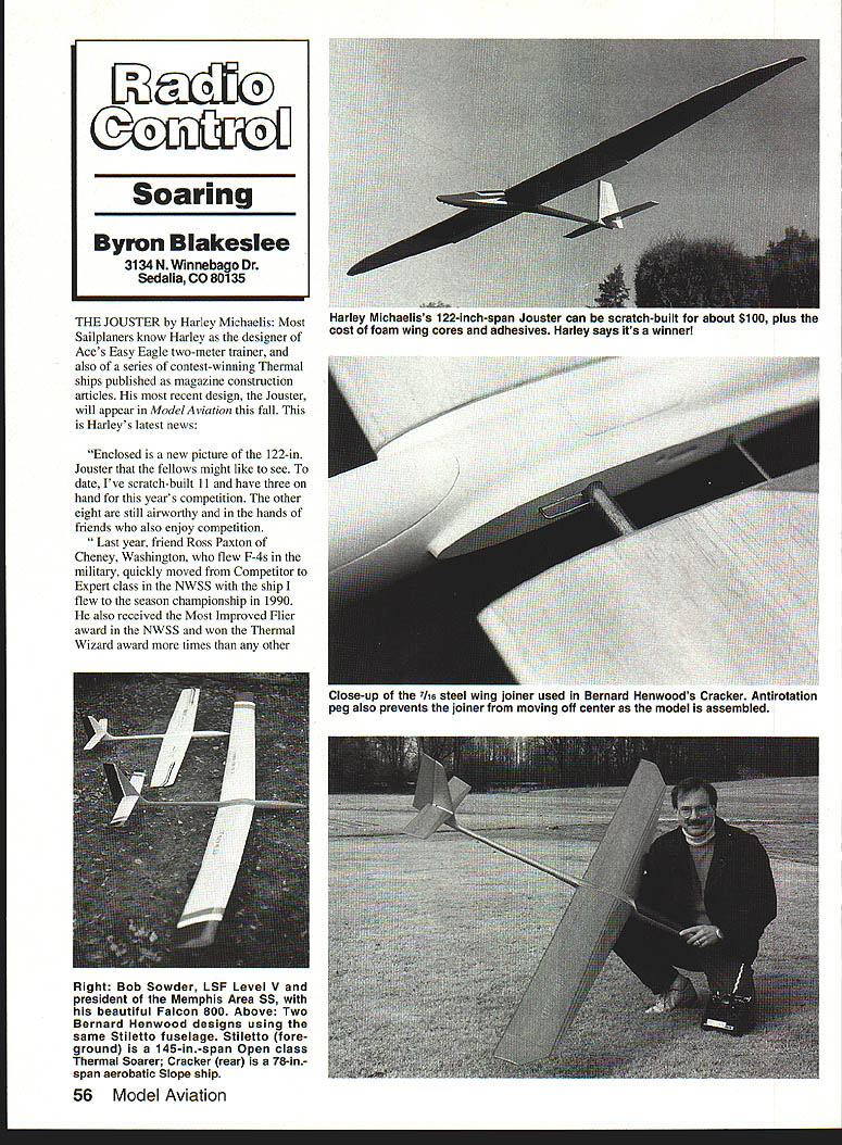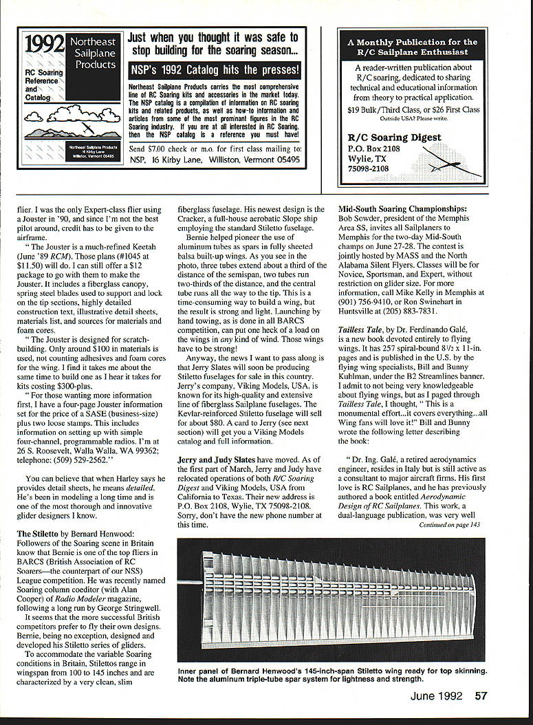 THE JOUSTER Harley Michaelis Most Sailpianers know Harley designer Aces Easy Eagle two-meter trainer also series contest-winning Thermal ships published magazine construction articles recent design Jouster will appear Model Aviation fall Harleys latest news Enclosed new picture 122-in Jouster fellows might like see date Ive scratch-built 11 have three hand years competition other eight still airworthy hands friends also enjoy competition Last year friend Ross Paxton Cheney Washington flew F-4s military quickly moved Competitor Expert class NWSS ship flew season championship 1990 also received Most Improved Flier award NWSS won Thermal Wizard award times other Right Bob Sowder LSF Level V president Memphis Area SS beautiful Falcon 800 Above Two Bernard Henwood designs using same Stiletto fuselage Stiletto fore ground 145-in-span Open class Thermal Soarer Cracker rear 78-inspan aerobatic Slope ship 56 Model Aviation Soaring Byron Blakeslee 3134 N Winnebago Dr Sedalia Co 80135 1-larley MIchaeliss 1e-incn-span Jouster can e scratcfl-DuIIt Tor about 1UO plus cost foam wing cores adhesives Harley says its winner Close-up /16 steel wing joiner used Bernard Henwoods Cracker Antirotation peg also prevents joiner moving off center model assembled Just thought sate stop building soaring season. RC Soaring Rofeience Catalog cs Send $700 check mo first class mailing NSP 16 Kirby Lane Williston Vermont 05495 Northeast Sailplane Products carries comprehensive line RC Soaring kits accessories market today NSP catalog compilation 01 information RC soaring kits related products well how-to intormatimn articles some 01 prominant ligures RC Soaring industry interested RC Soaring NSP catalog reterence must havel reader-written publication about R/C soaring dedicated sharing technical educational information theory practical application $19 Bulk/Third Class $26 First Class Outside USA Please write R/C Soaring Digest PO Box 2108 Wylie TX 75098-2108 flier Expert-class flier using Jouster 90 since Im best pilot around credit has given airframe Jouster much-refined Keetah June 89 RCM plans #1045 $1150 will can still offer $12 package go make Jouster includes fiberglass canopy spring steel blades used support lock tip sections highly detailed construction text illustrative detail sheets materials list sources materials foam cores Jouster designed scratchbuilding Only around $100 materials used counting adhesives foam cores wing find takes about same time build hear takes kits costing $300-plus wanting information first have four-page Jouster information set price SASE business-size plus two loose stamps includes information setting up simple four-channel programmable radios Im 26 S Roosevelt Walla Walla WA 99362 telephone 509 529-2562 can believe Harley says provides detail sheets means detailed Hes modeling long time thorough innovative glider designers know Stiletto Bernard Henwood Followers Soaring scene Britain know Bernie top fliers BARCS British Association RC Soarersthe counterpart NSS League competition recently named Soaring column coeditor Alan Cooper Radio Modeler magazine following long run George Stringwell seems successful British competitors prefer fly own designs Bernie being no exception designed developed Stiletto series gliders accommodate variable Soaring conditions Britain Stilettos range wingspan 100 145 inches characterized very clean slim fiberglass fuselage newest design Cracker full-house aerobatic Slope ship employing standard Stiletto fuselage Bernie helped pioneer use aluminum tubes spars fully sheeted balsa built-up wings As see photo three tubes extend about third distance semispan two tubes run two-thirds distance central tube runs way tip time-consuming way build wing result strong light Launching hand towing done BARCS competition can put heck load wings kind wind wings have strong Anyway news want pass along Jerry Slates will soon producing Stiletto fuselages sale country Jerrys company Viking Models USA known its high-quality extensive line fiberglass Sailplane fuselages Kevlar-reinforced Stiletto fuselage will sell about $80 card Jerry see next section will get Viking Models catalog full information Jerry Judy Slates have moved As first part March Jerry Judy have relocated operations both R/C Soaring Digest Viking Models USA California Texas new address PO Box 2108 Wylie TX 75098-2108 Sorry dont have new phone number time Mid-South Soaring Championships Bob Sowder president Memphis Area SS invites Sailplaners Memphis two-day Mid-South champs June 27-28 contest jointly hosted MASS North Alabama Silent Flyers Classes will Novice Sportsman Expert restriction glider size information call Mike Kelly Memphis 901 756-9410 Ron Swinehart Huntsville 205 883-7831 Tailless Tale Dr Ferdinando Gale new book devoted entirely flying wings has 257 spiral-bound 812 x 11-in pages published US flying wing specialists Bill Bunny Kuhlman under B2 Streamlines banner admit being very knowledgeable about flying wings paged through Tailless Tale thought monumental effort. covers everything. Wing fans will love Bill Bunny wrote following letter describing book Dr Ing Gal6 retired aerodynamics engineer resides Italy still active consultant major aircraft firms first love RC Sailpianes has previously authored book entitled Aerodynamic Design RC Sailplanes work dual-language publication very well Continued page 143 Inner panel Bernard Henwoods 145-inch-span Stiletto wing ready top skinning Note aluminum triple-tube spar system lightness strength June1992 57 Dont scrap favorite AM KRAFT Heathkit Hobbyshack Royal Tower Hobbies World Engines other TRANSMITTERS SERVOS Upgrade latest AM technology proven design mini-size dual conversion ultra narrow band reliability R/C REPAIRS KMI largest complete independent R/C repair center USA repair brands Send SAE complete price repair product information RCD-KMI 6 Meter EXCLUSIVE KM1 Kraft Midwest Inc 115 E Main Northville MI 48167 313/348-0085 313/348-4175 2-wheel gear 