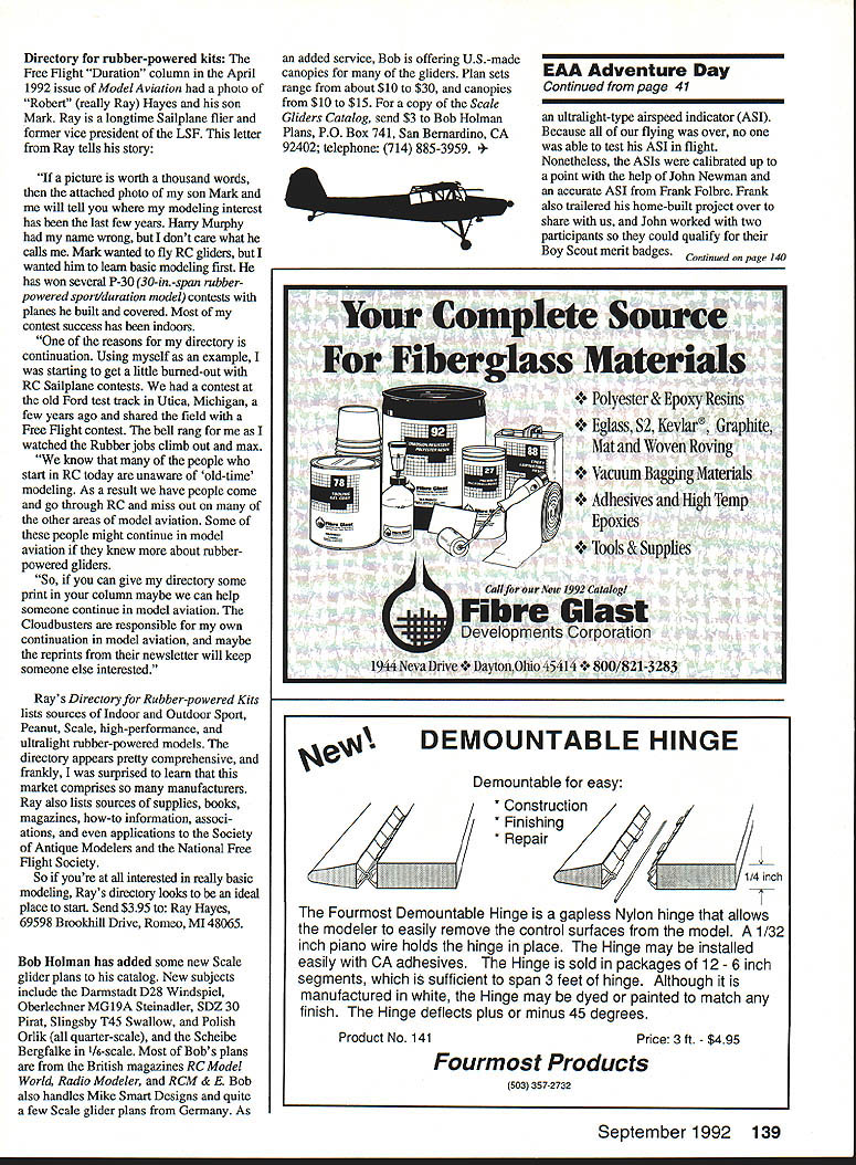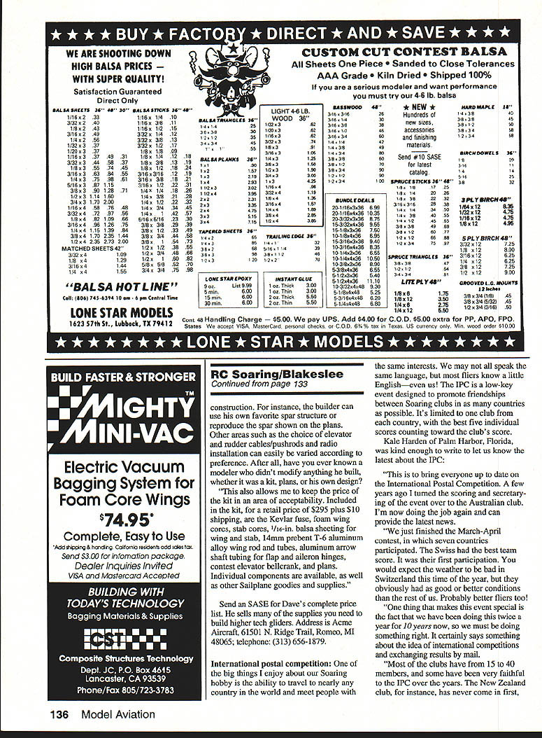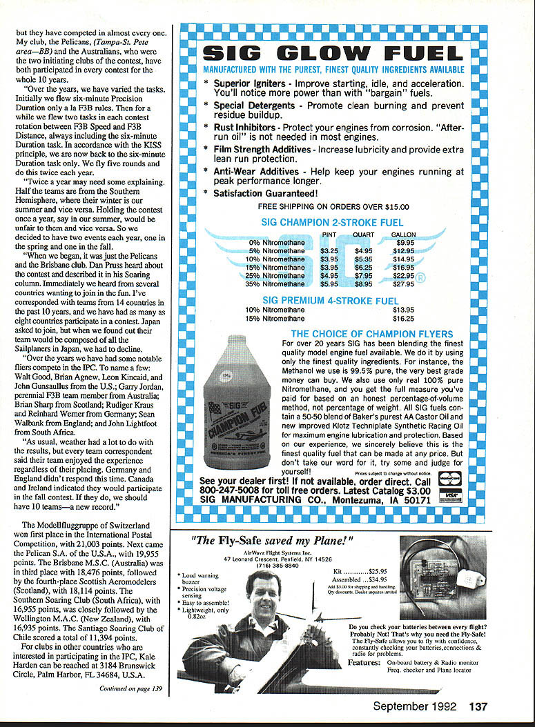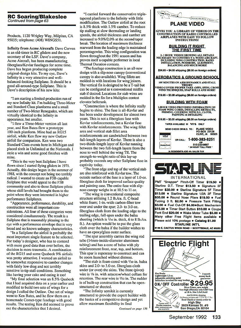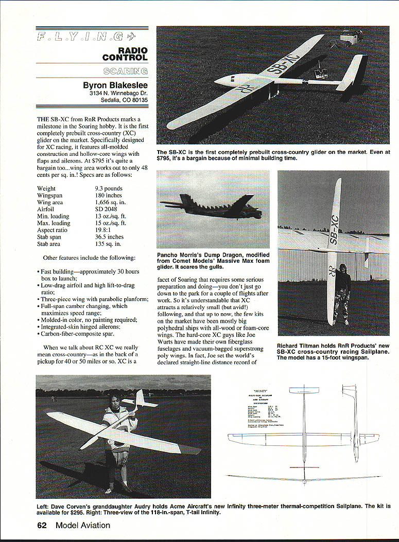 RADIO CONTROL Byron Blakeslee 3134 N Winnebago Dr Sedalia 0080135 THE SB-XC RnR Products marks milestone Soaring hobby first completely prebuilt cross-country XC glider market Specifically designed XC racing features all-molded construction hollow-core wings flaps ailerons $795 its quite bargain too. wing area works out 48 cents per sq Specs follows Weight Wingspan Wing area Airfoil Mm loading Max loading Aspect ratio Stab span Stab area 93 pounds 180 inches 1656 sq SD 2048 13 ozIsq ft 15 oz/sq ft 1981 365 inches 135 sq Other features include following Fast buildingapproximately 30 hours box launch Low-drag airfoil high lift-to-drag ratio Three-piece wing parabolic planform Full-span camber changing maximizes speed range Molded-in color no painting required Integrated-skin hinged ailerons Carbon-fiber-composite spar talk about RC XC really mean cross-countryas back pickup 40 50 miles XC facet Soaring requires some serious preparation doingyou dont just go down park couple flights after work So its understandable XC attracts relatively small avid following up now few kits market have mostly big polyhedral ships all-wood foam-core wings hard-core XC guys like Joe Wurts have made own fiberglass fuselages vacuum-bagged superstrong poly wings fact Joe set worlds declared straight-line distance record I] Left Dave Corvens granddaughter Audry holds Acme Aircrafts new Infinity three-meter thermal-competition Sailplane kit available $295 Right Three-view 11 8-in-span T-tail Infinity 62 Model Aviation SB-XC first completely prebuilt cross-country glider market $795 its bargain because minimal building time Pancho Morriss Dump Dragon modified Comet Models Massive Max foam glider scares gulls Richard Tiltman holds RnR Products new SB-XC cross-country racing Sailplane model has 15-foot wingspan PRODUCTS FOR TUP fltPAMINfl MflflSI PU Complete Line Exhaust Systems * Tuned Pipes led Tuned Pipes Headers uri Mufflers Expansion Mufflers copter Ball Mufflers ialized Exhaust Systems Unsurpasad Wokmmnzhin & PArformAhCG IMPORTED DIESEL ENGINES Worlds Best Selection AE AM Aurora Cipolla D-C KMD MAP Mikro MK MWS Oliver PAW Pfeffer Silver Swallow USE Also Replica Mills MOVO Letmo diesels rare imported glow engines CO motor sets Ten page catalog 1OO CARLSON ENGINE IMPORTS 814 East Marconi Phoenix AZ 85022-3112 2264 kilometers almost 142 miles Wileys Revenge 1988 However Joe thought enough RnR s new SB-XC fly Western Great Race held Taft California mid-May hut won race having flown ship before Joe just returned Japan invited Sanwa Radios put flying demonstrations F3B World Championships-winning Flite Lite Composites Eagle XC design emphasis size speed stability strength Large size important glider can seen couple thousand feet altitude also because contributes flight efficiency Speed obviously required because XC racing Stability needed glider will less fly itself pilot can hardly see Strength must gliders lost blowing up because exceeding red-line speed other cause RnR Products company Rich Spicer Richard Tiltman two Rs already well known Synergy III Synergy 91 ThermalIF3B designs Nova Slope Racer can justifiably proud offering XC fliers full-function Sailplane modern all-molded con struction SB-XC has ailerons also has sufficient polyhedral provide inherent stability ability fully adjust wing camber both positive negative should big advantage coping varying lift/sink conditions looks like SB-XC hot ticket XC contests information order call write RnR September 1992 63 Znntinued nape 133 Above left Kale Harden Ultima Bob Sealy Kale scorekeeper International Postal Competition Above right winning team spring 1992 IPC Modelifluggruppe Thun Switzerland Look Bernese Alps background RC Soaring/Blakeslee Continued page 63 Products 1120 Wrigley Way Milpitas CA 95035 telephone 408 WINGS5 Infinity Acme Aircraft Dave Corven old-timer RC gliders new secretary LSF Daves company Acme Aircraft has manufacturing fibergiass/Keviar fuselages some time Dave has begun producing complete original-design kits eye Daves Infinity veiy attractive wellbalanced-looking Sailplane should good all-around-type Sailplane Daves description new kits am starting limited production run new Infinity kit Im building Three-Meter Standard Class planforms small number Two-Meter Renegades virtually identical Infinity appearance smaller flew Three-Meter version last year Ken Bates flew prototype 100-inch planform Mine RG15 airfoil Ken flew new Outlaw airfoil comparison Ken won two Standard Class events Michigan placed sixth Unlimited Nationals stole win some good finishes veiy best Sailplane have flown since started flying gliders 1971 Actually design began summer 1988 concept being too terribly radical wanted create F3B-capable Sailplane would appeal F3B community also Sailplane pilots skill levels brought point interested higher performance Sallplanes Appearance performance durability construction important con siderations four categories considered simultaneously result Sailplane reasonably pleasing eye performance envelope very broad no known unhappy characteristics Sailplane airfoil probably important single feature selected todays designer has contend good data ever before decision traumatic combination RGl5 some Quabeck 9% airfoils pretty attractive wanted airfoil somewhat responsive camber changes fairly low drag terribly sensitive tip stall conditions Something like having cake eating too final selection 85% Quabeck acquired data year earlier modified build two sets wings design called Outlaw set wings went Ken Bates flew homemade Comet-type fuselage good results testing Ken did seemed prove out characteristics desired carried forward conservative tripletapered planform Infinity little modification Outlaw airfoil root 85% thick 15% camber reduce tip stalling slow thermaling landing speeds airfoil thickness camber increased 90%/20% second taper break location maximum thickness rearward leading edge maintained percentagewise wing configuration flown