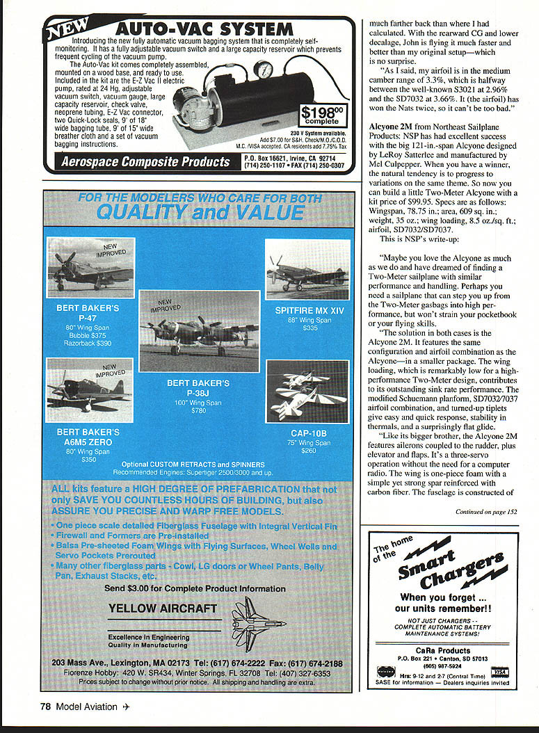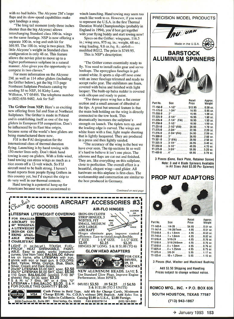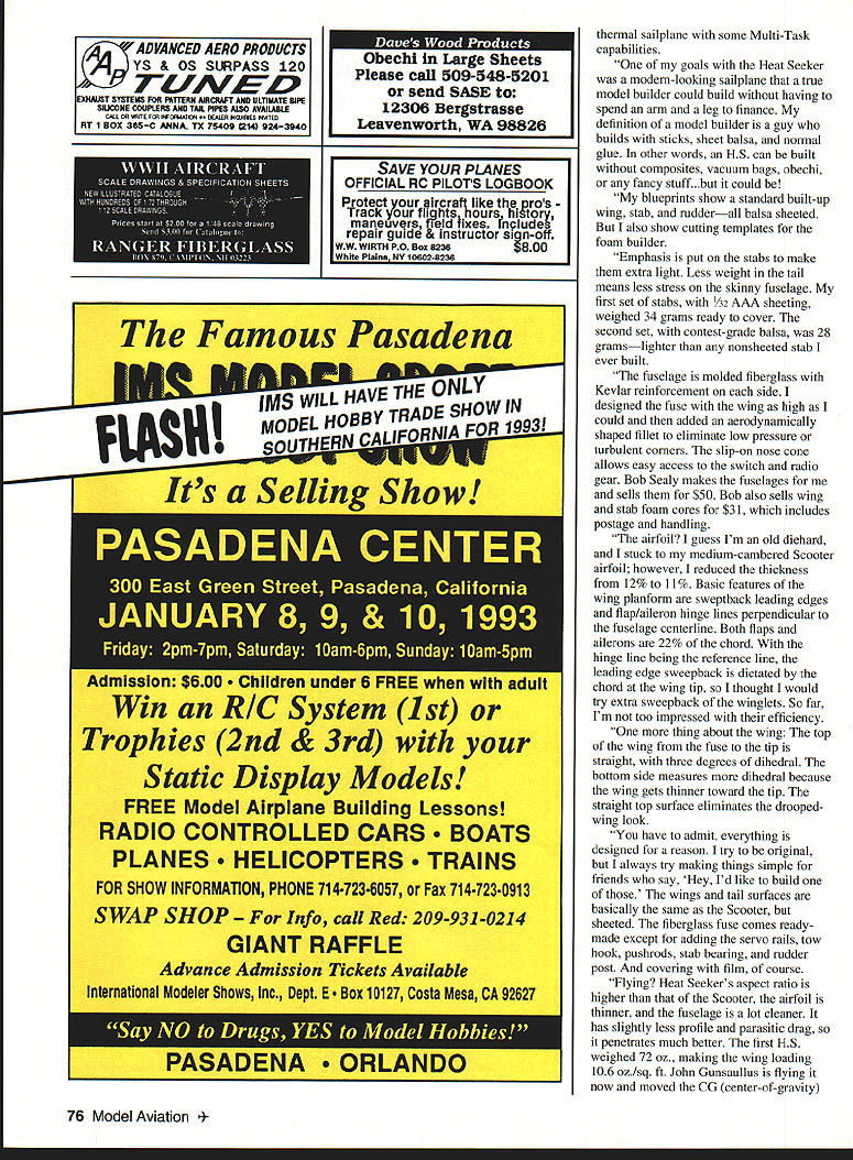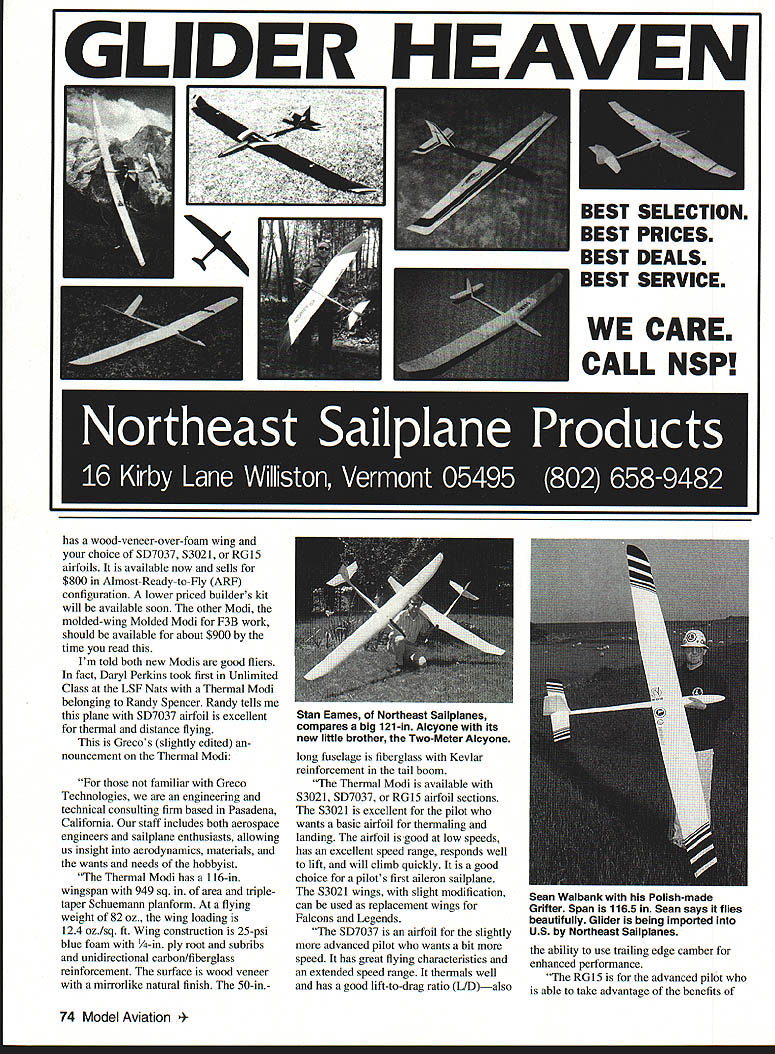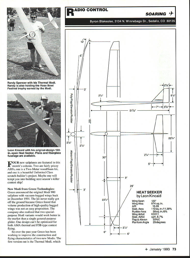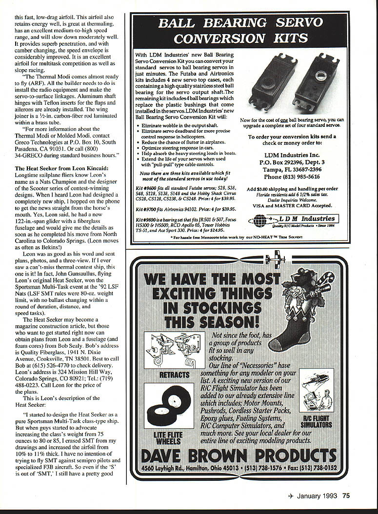 Leon Kincaid original-design 122in-span Heat Seeker Plans fiberglass fuselage available FOUR new sailpianes featured months column Two fairly pricey ARFs Two-Meter wood/foam kit beautiful Unlimited Class scratch-builders project Maybe will tempt building next seasons killer contest ship New Modi Greco Technologies Greco announced original Modi 900 sailplane vacuum-bagged wings back December 1991 kit never really got off ground because Greco found volume production high-quality bagged wings easy proposition company also realized two specialpurpose Modi variants would work better market single general-purpose glider design cant optimized both AMA thermal F3B-type contest flying So over past year Greco has working improve construction flying characteristics two new Modis first version out Thermal Modi RADIO CONTROL 12 3 -u 0 1 0 m 0 0 C a CDN T 2I8 0 30 1 0 m w C a 13 23/4 3M 6_____ Wing Span Wing Area NR Stab Area Rudder Area Wing AirI oil Stab Airfoil Rap & Aileron Planform Angle SOARING H /7/17 91/ ~1 4 7] 51S/8 5 4 3 /0 122 974 sq 1528 110 sq /1138% 58 sq inJ6% K3311 sym 87% 22%C 29 degrees 4*6 January1993 73 Randy Spencer Thermal Modi Randy also holding Rose Bowl Festival trophy earned Modi 425I4 4 ---- 9 29 HEAT SEEKER Leon Kincaid GLIDER HEAVEN has wood-veneer-over-foam wing choice SD7037 S3021 RGl5 airfoils available now sells $800 Almost-Ready-to-fly ARF configuration lower priced builders kit will available soon other Modi molded-wing Molded Modi F3B work should available about $900 time read Im told both new Modis good fliers fact Daryl Perkins took first Unlimited Class LSF Nats Thermal Modi belonging Randy Spencer Randy tells plane SD7037 airfoil excellent thermal distance flying Grecos slightly edited nouncement Thermal Modi familiar Greco Technologies engineering technical consulting firm based Pasadena California staff includes both aerospace engineers sailplane enthusiasts allowing us insight aerodynamics materials wants needs hobbyist Thermal Modi has 116-in wingspan 949 sq area tripletaper Schuemann planform flying weight 82 oz wing loading 124 ozIsq ft Wing construction 25-psi blue foam -in ply root subribs unidirectional carbon/fiberglass reinforcement surface wood veneer mirrorlike natural finish 50-inlong fuselage fiberglass Kevlar reinforcement tail boom Thermal Modi available 53021 SD7037 RGl5 airfoil sections 53021 excellent pilot wants basic airfoil thermaling landing airfoil good low speeds has excellent speed range responds well lift will climb quickly good choice pilots first aileron sailplane 53021 wings slight modification can used replacement wings Falcons Legends SD7037 airfoil slightly advanced pilot wants bit speed has great flying characteristics extended speed range thermals well has good lift-to-drag ratio LIDalso ability use trailing edge camber enhanced performance RG15 advanced pilot able take advantage benefits 74 Model Aviation Eames Northeast Sailpianes compares big 121-in Alcyone its new little brother Two-Meter Alcyone Sean Walbank Polish-made Grifter Span 1165 Sean says flies beautifully Glider being imported US Northeast Sailpianes fast low-drag airfoil airfoil also retains energy well great thermaling has excellent medium-to-high speed range will slow down moderately well provides superb penetration camber changing speed envelope considerably improved excellent airfoil multitask competition well slope racing Thermal Modi comes almost ready fly ARF builder needs install radio equipment make servo-to-surface linkages Aluminum shaft hinges Teflon inserts flaps ailerons already installed wing joiner 1/2-in carbon-fiber rod laminated within brass tube information about Thermal Modi Molded Modi contact Greco Technologies PO Box 10 South Pasadena CA 91031 call 800 34-GRECO during standard business hours Heat Seeker Leon Kincaid Longtime sailplane fliers know Leons name Nats Champion designer Scooter series contest-winning designs heard Leon designed completely new ship hopped phone get news straight horses mouth Yes Leon said new 122-in-span glider fiberglass fuselage would give details soon completed move North Carolina Colorado Springs Leon moves often Bekins Leon good word sent plans photos three-view ever saw cant-miss thermal contest ship fact John Gunsaullus flying Leons original Heat Seeker won Sportsman Multi-Task event 92 LSF Nats LSF SMT rules 80-oz weight limit no ballast changing within round duration distance speed tasks Heat Seeker may become magazine construction article want get started right now can obtain plans Leon fuselage foam cores Bob Sealy Bobs address Quality Fiberglass 1941 N Dixie Avenue Cooksville TN 38501 Best call Bob 615 526-4770 check delivery Leons address 324 Mission Hill Way Colorado Springs CO 80921 Tel 719 488-0223 Call Leon price plans Leons description Heat Seeker started design Heat Seeker pure Sportsman Multi-Task class-type ship guys started advocate increasing classs weight 75 ounces 80 85 erased SMT drawings increased airfoil 10% 11% thick have no intention trying fly SMT against semipro pilots specialized F3B aircraft So 5 out SMT still have pretty good LDM Industries new Ball Bearing Servo Conversion Kit can convert standard servos ball bearing servos just minutes Futaba Airtronics kits indudes 4 new servo top cases containing high quality stainless steel ball bearing servo output shaftThe remaining kit indudes4ball bearings replace plastic bushings come installed theservosLDMlndustriesnew Ball Bearing Servo Conversion Kit will Eliminate wobble output shaft Eliminate servo deadband precise control response helicopters Reduce chance flutter airplanes Optimize steeling response cars Help absorb heavy steering loads boats Extend life servos used pull-pull type cable controls Now am thme kits available fit standard servos use today Kit #9600 fits standard Futaba servos S28 38 S48 5128 5138 S148 Hobby Shack Cirrus CS28 CS2 28 CS238 248 Price 4 $3995 Kit #9700 fits jrtronics 94102 PrIce 4for $3995 Kit#9SOOisa