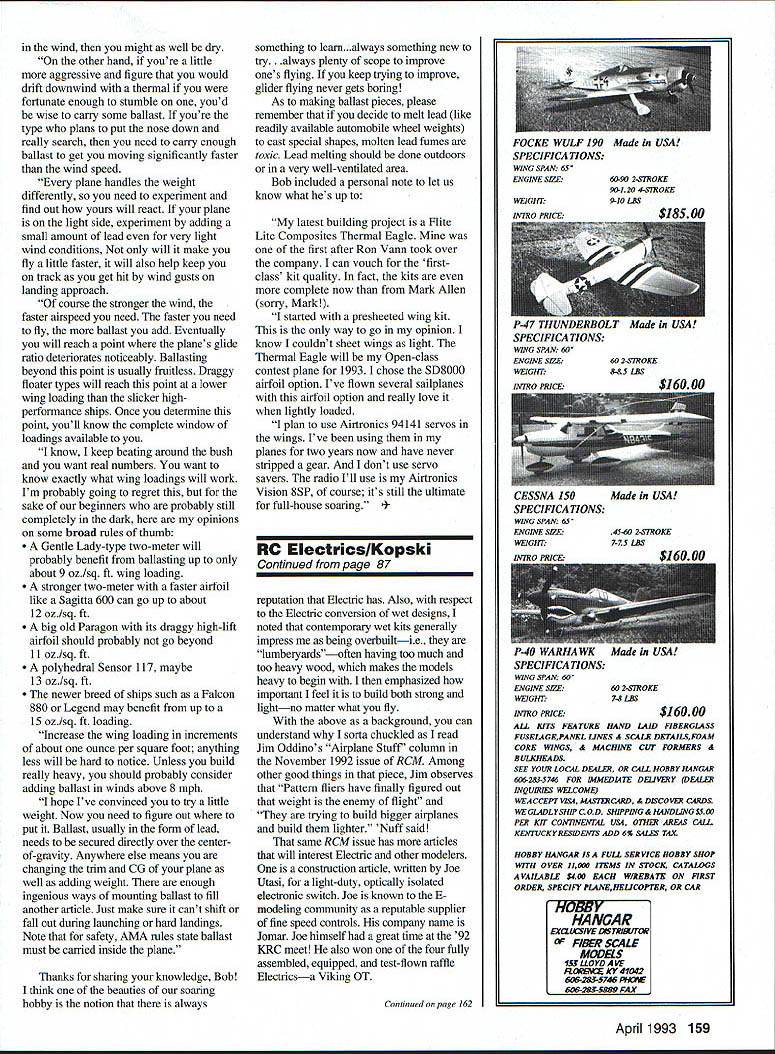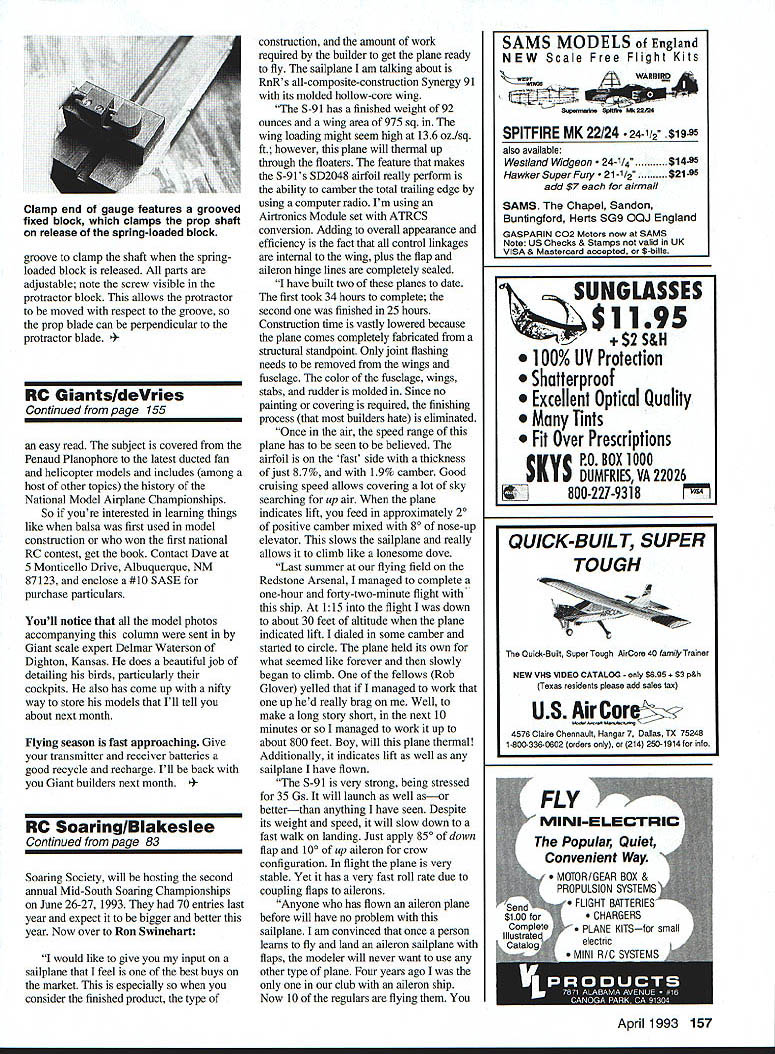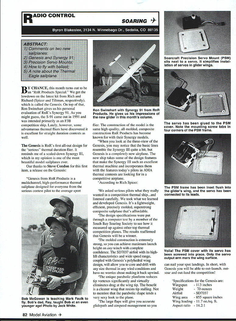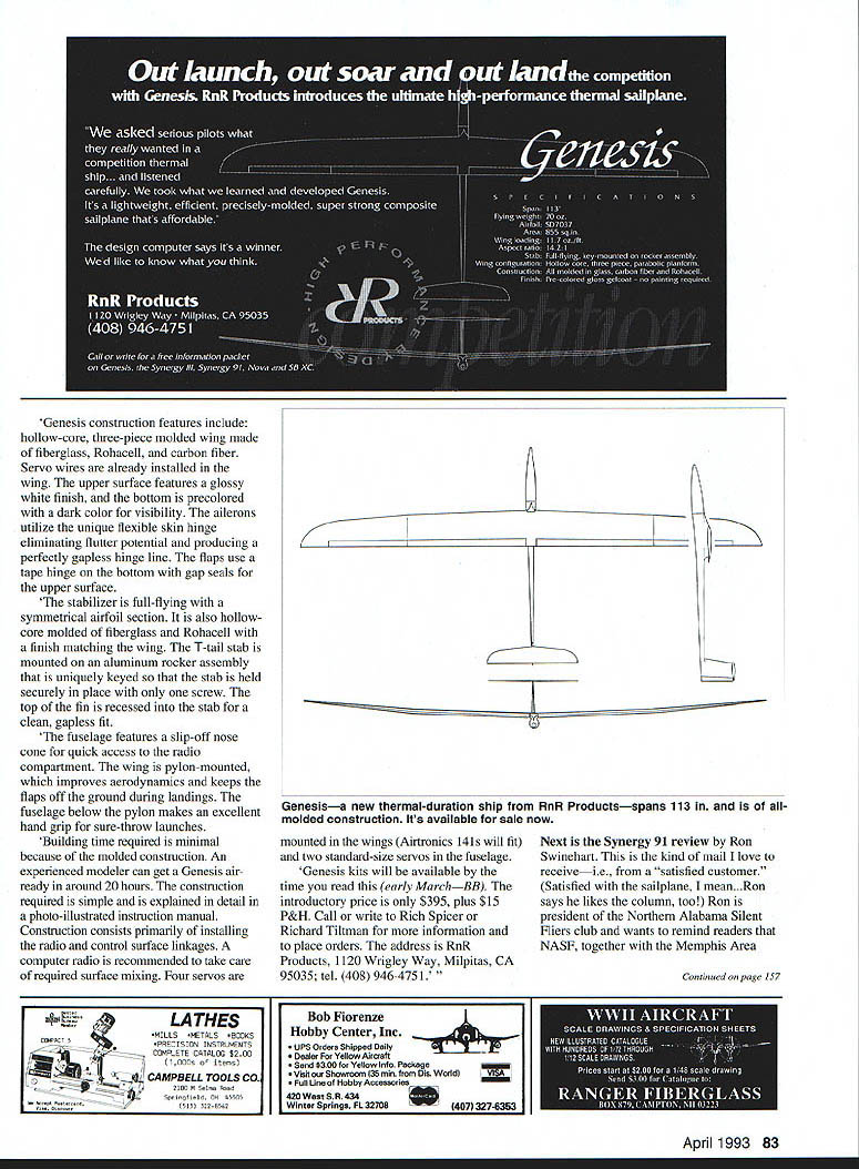I R AD HO CONTROL BY CHANCE month turns out RnR Products Special get lowdown latest kit Rich Richard Spicer Tiltman respectively called Genesis top Ron Swinehart gives us personal evaluation RnRs Synergy 91 As might guess 5-91 came out 1991 intended primarily F3B competition ship Lately however some adventurous thermal fliers have discovered excellent straight duration contests well Genesis RnRs first all-out design serious thermal duration flier reminds scaled-down Synergy III opinion beautiful model sailpianes ever thanks Steve Condon first item release Genesis Genesis RaR Products multichannel high-performance thermal sailplane designed everyone serious contest pilot average sport SOARING r construction model same high-quality all-molded composite construction RnR Products has become known Synergy models look three-view Genesis may notice basic lines resemble Synergy III quite bit Genesis completely new airplane new ship takes some design features make Synergy III such excellent thermal machine incorporates features todays pilots AMA thermal contests looking competitive airplane According Rich Spicer asked serious pilots what really wanted competition Thermal ship. listened carefully took what learned developed Genesis Its lightweight efficient precisely molded superstrong composite sailplane thats affordable design specifications put through computer test member South Bay Soaring Society see measured up against other top thermal competition planes results reaffirmed Genesis will winner molded construction extremely strong can achieve maximum launch height winch complete confidence 5D7037 airfoil its highlift characteristics wide speed range coupled Genesiss polyhedral wing design will allow core drift size Thermal wind conditions have no worries about making back upwind unique parabolic planform reduces tip vortexes significantly virtually eliminates drag wing tip benefit cleaner wing resists tip stalling mention parabolic shape lends very sexy look plane large flaps will give accurate glidepaTh airspeed management can nail spot landings short Genesis will able out-launch outsoar out-land competition Specifications Genesis Wingspan-113 inches Weight- 70 ounces Airfoil- 5D7037 Wing area- 855 square inches Wing loading 117 ozIsq ft Aspect ratio 1421 82 Model Aviation craft Precision Servo Mount PSM sits next servo simplifies instal lation servos glider wings Ron Swinehart Synergy 91 RnR Products gives us impressions new glider months column servo has glued PSM cover Note mounting screw tabs four corners PSM frame PSM frame has inset flush gliders wing servo has connected its leads Voila PSM cover its servo has screwed place Only servo output arm mars wing surface Bob McGowan teaching Mark Faulk fly Bobs dad Ray taught Bob younger age Photo Jack White Genesis construction features include hollow-core three-piece molded wing made fiberglass Rohacell carbon fiber Servo wires already installed wing upper surface features glossy white finish bottom precolored wit dark color visibility ailerons utilize unique flexible skin hinge eliminating flutter potential producing perfectly gapless hinge line flaps use tape hinge bottom gap seals te upper surface stabilizer full-flying symmetrical airfoil section also hollowcore molded fiberglass Rohacell finish matching wing T-tail stab mounted aluminum rocker assembly tat uniquely keyed stab held securely place screw top fin recessed stab clean gapless fit fuselage features slip-off nose cone quick access te radio compartment wing pylon-mounted improves aerodynamics keeps flaps off ground during landings fuselage below pylon makes excellent hand grip sure-throw launches Building time required minimal because molded construction An experienced modeler can get Genesis airready around 20 hours construction required simple explained detail photo-illustrated instruction manual Construction consists primarily installing te radio control surface linkages computer radio recommended take care required surface mixing Four servos Genesisa new thermal-duration ship RnR Productsspans 113 allmolded construction Its available sale now mounted te wings Airtronics 141s will fit two standard-size servos te fuselage Genesis kits will available time read early MarchBB introductory price $395 plus $15 P&H Call write Rich Spicer Richard Tiltman information place orders address RnR Products 1120 Wrigley Way Milpitas CA 95035 tel 408 946-4751 Next Synergy 91 review Ron Swinehart kind mail love receiveie satisfied customer Satisfied sailplane mean.Ron says likes column too Ron president Northern Alabama Silent Fliers club wants remind readers NASF together te Memphis Area Bob Fiorenzej Hobby Center Inc UPS Orders Shipped Daily Dealer Yellow Aircraft Sand $300 Yellow Info Package z Vicir Showroom 138 mm Die Woridi Full Line Hobby Acceaaoriea 420 Wear SR 434 WInter Springa FL 32708407 327-6353 April 1993 83 aatLATHES MILLS METALS BOOKS PRECIOION INSTRUMENTS COMPLETE CATALOG 5200 513 3228562 100Gb items CAMPBELL TOOLS CO 2100 Ri Soiree Road Springfield OH 45505 Continued page 157 groove clamp shaft springloaded block released parts adjustable note screw visible protractor block allows protractor moved respect groove prop blade can perpendicular protractor blade iantsldeVries Continued page 155 easy read subject covered Penaud Planophore latest ducted fan helicopter models includes among host other topics history National Model Airplane Championships So youre interested learning things like balsa first used model construction won first national RC contest get book Contact Dave 5 Monticello Drive Albuquerque NM 87123 enclose #10 SASE purchase particulars Youll notice model photos accompanying column sent Giant scale expert Delmar Waterson Dighton Kansas does beautiful job detailing birds particularly cockpits also has come up nifty way store models Ill tell about next month Flying season fast approaching Give transmitter receiver batteries good recycle recharge Ill back Giant build