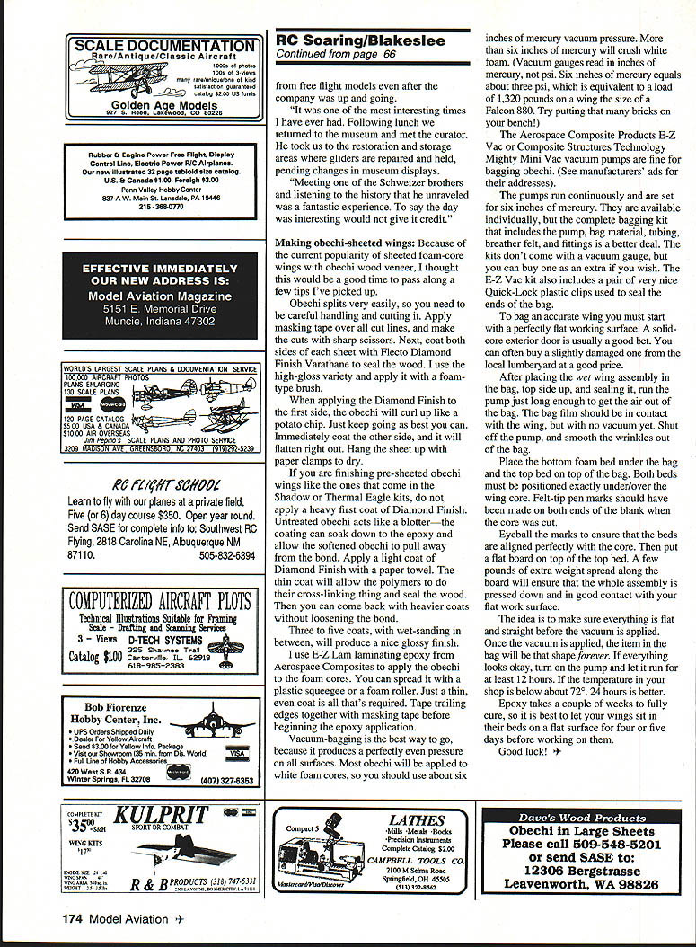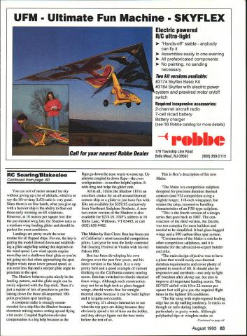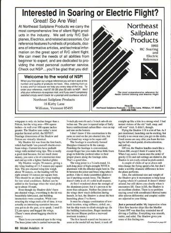 RADIO CONTROL SOARING OUR US F3B TEAM will competing August 6-15 1993 biennial F3B World Championships multi-task soaring contest will held near Tel Aviv Israel team includes pilots Larry Jolly Daryl Perkins Randy Spencer Team manager 1977 F3B World Champ Skip Miller Joe Wurts won 1991 Champs Holland defending F3B World Champion Daryl Perkins placed second Holland US team finished third behind Germany Great Britain guys practicing hard take 1993 team win time team needs support American sailplaners Until F3J Thermal Duration Soaring World Champs held 1995 F3B international event RC soaring team needs raise funds H 10 MAKO Specifications Wing Span 1140 Wing Area 9480 sqin Aspect Ratio 137 Airfoil 7037 RG15 Weight 68 oz Wing Loading 103 oz/sqft Fuselage Fibergiass/Keviar Wings Obechi/Fosa Type Precision Duration Designed 8en Clerx 7/92 help defray transportation practice costs arc picked up AMA Team members have organized giant merchandise raffle tickets $5 also selling official team logo T-shirts M L XL XXL $15 pins $3 patches $5 stickers $2 Please add 10% merchandise total shipping handling merchandise order over $25 will receive free team pin Send check raffle tickets merchandise 1993 USA Soaring Team 15781 Empire Lane Westminster CA 92683 Building flying Shadow 118 Over winter built Shadow 118 glider designed Roger Chastain kitted Rogers company Tekoa Center Design Roger industrial designer n K S profession has used engineering experience add nice touches Shadow kit Shadows appearance reminds Falcon 880 its bigger Its 118-inch August1993 59 jim Moyfllflafl5 moaei OT 1~b unanuie Herring hang glider part EOGASE exhibit display National Soaring Museum Shadow 118 Open Class contest sailplane designed Roger Chastain threemeter-span ship thermal duration contest flying sport flying Shadow 118 kits pre-sheeted wings stabs rudder minimize building time Ben Clerx latest Mako Semikits available Ben 1, 2 K 3I/ h z 4 Left Three-view Mako latest design Ben Clerx Above Ben Clerx L Roger Lackey seem justly proud Makos Both guys belong Harbor Soaring Society southern California Interested Soaring Electric Flight Great So Are Northeast Sailplane Products carry comprehensive line silent flight prod ucts industry sell RIO Sail planes Electrics related accessories reference features hundreds products doz ens informative articles technical infor mation great sport RIO silent flight can meet needs abilities beginner expert dedicated pro viding personal customer service Check out NSP. youll glad did Welcome world NSP first open unique reference will awe number quality products have Also ordering us easy fun because help step way order reference mail $700 $5 plus $2 s&h NSP Well ship reference via express mail arent completely satisfied simply send back prompt courteous refund Northeast Sailplane Products 16 Kirby Lane Williston Vermont 05495 Northeast Sailplane Products 1993 RC Soaring Electric Reference N Price $5 Northeast Sailplane Products irby Lane Williston VT 05495 C802 658-9482 comprehensive reference Radio Control Soaring Electric Flight wingspan six inches longer Falcon wing area994 square inchesis well over 100 square inches greater Shadow uses todays popular thermal airfoil SD7037 Fuselage dimensions Shadow Falcon virtually identical Shadow kit first batch build-em-yourself obechi-over foam wings Current kits have prebuilt wings molded wing tips really good deal because much money save lot construction time end up lighter finished glider Shadow weighs 78 ounces giving dry wing loading 115 ounces per square foot pre-sheeted wing kits weigh about 70 ounces loading will right around 10 ounces per square foot should ideal dry wing loading low wind conditions Ballast can added fuselage wind picks up about 10 mph though Shadow didnt have pre-sheeted wings everything kit beautifully fabricated building instructions complete con structing wings took bit time actually interesting operation because got guts speak used F Z Lam epoxy bagged wings Theres about bagging obechi come no conventional spar wing brass joiner tube carried between -inch ply root rib /8-inch sub-rib six inches out spar tapered strips fairly heavy unidirectional carbon fibertwo top bottom dont know construction same used pre-sheeted kits Ive found wings super-stiff fuselage excellently formed fiberglass trimmed fit canopy Finishing fuselage conventional except Roger has make three little foam plugs hold pushrod tubes proper places along fuselage sides Thats good idea wing joiner V-inch-round 14inch-long piece high-strength 7075T-6 aluminum dihedral angle bent fit between joiner brass wing tubes perfect like shake assembled gliders see anything sounds loose Shadow doesnt rattle its solid respects first wondered about strength aluminum joiner its proven adequate Neither joiner nor wings show much deflection during launch fact Shadow about best launching plane Ive flown must happy combination towhook location wing stiffness airfoil etc ship wants climb straight up building instructions Roger mentions son Blayne prefers rearward towhook location first launch scared because soon model left hand took off straight up like kite strong wind instant visions old stall snap roll over trick didnt though Flying Shadow 118 lot fun As just mentioned launching can exciting really no sweat once get sticks Good zooms easy after learn tim ing full winch pedal dive/acceleration pull-up Off tow Shadow handles much like Falcon 880 except think its easier fly say easier mean once center gravity CG stab settings dialed Shadow overly critical pitch control couple clicks up down stab trim change flying speed bit dont make terribly dramatic difference plane performs Also additional size weight Shadow give momentum help keep going its pointed doesnt skitter around still shows clearly encounters lift Once lift Shadow excellent climber no problem staying cored coordinated thermal turns after aileron differential coupled rudder adjusted liking Just personal aside impr