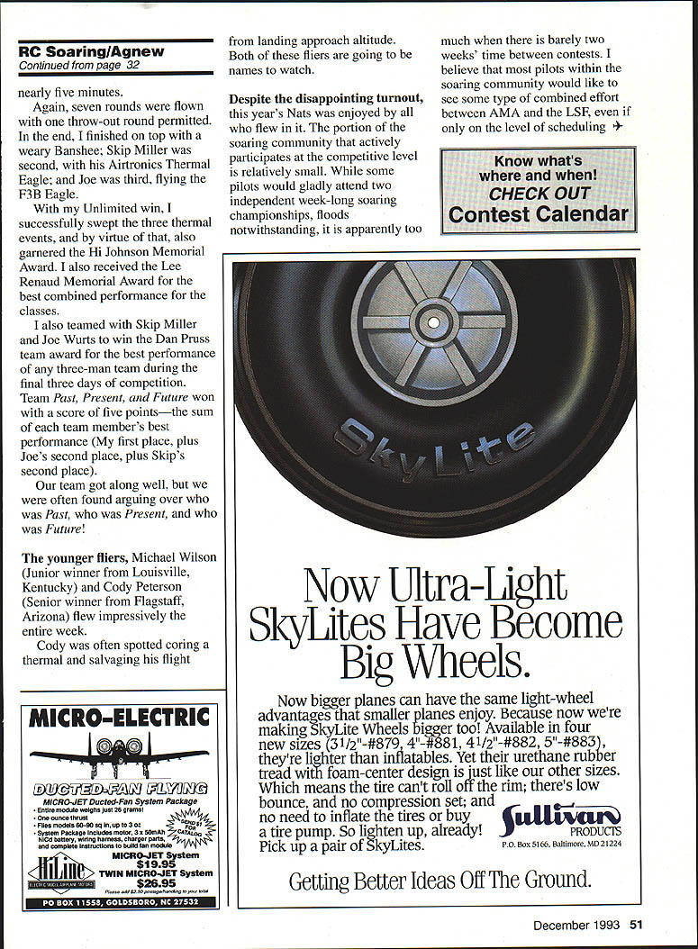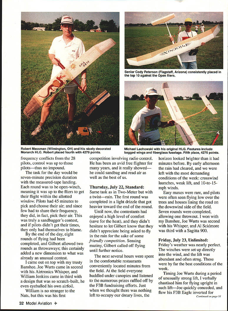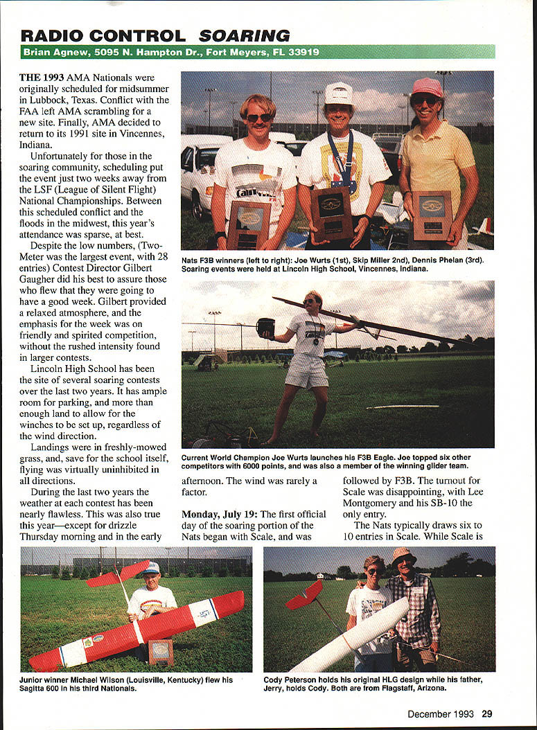 RADIO CONTROL SOARING THE 1993 AMA Nationals originally scheduled midsummer Lubbock Texas Conflict FAA left AMA scrambling new site Finally AMA decided return its 1991 site Vincennes Indiana Unfortunately soaring community scheduling put event just two weeks away LSF League Silent Flight National Championships Between scheduled conflict floods midwest years attendance sparse best Despite low numbers Two Meter largest event 28 entries Contest Director Gilbert Gaugher did best assure flew going have good week Gilbert provided relaxed atmosphere emphasis week friendly spirited competition rushed intensity found larger contests Lincoln High School has site several soaring contests over last two years has ample room parking enough land allow winches set up regardless wind direction Landings freshly-mowed grass save school itself flying virtually uninhibited directions During last two years weather contest has nearly flawless also true yearexcept drizzle Thursday morning early Monday July 19 first official day soaring portion Nats began Scale December 1993 29 Nats F3B winners left right Joe Wurts 1st Skip Miller 2nd Dennis Phelan 3rd Soaring events held Lincoln High School Vincennes Indiana Current World Champion Joe Wurts launches F3B Eagle Joe topped six other competitors 6000 points also member winning glider team afternoon wind rarely afollowed F3B turnout factorScale disappointing Lee Montgomery SB- 10 entry Nats typically draws six 10 entries Scale Scale Junior winner Michael Wilson Louisville Kentucky flew hisCody Peterson holds original HLG design father Sagitta 600 third NationalsJerry holds Cody Both Flagstaff Arizona invariably minority event soaring pursue enthusiastic about other sector sport Despite absence competitors Lee dutifully completed maneuvers fine display flying skills sailplanes performance capabilities Two rounds F3B flown conjunction seven-cell F3E Since both tasks can labor-intensive decided overlap events order keep what little manpower escaping Seven fliers competed F3B including current World Champion Joe Wurts well 1977 World Champion current team manager Skip Miller surprisingly Joe flew F3B Eagle first-place Watching Joe put Eagle through its paces treat us sure put up good effort defends title Israel asked Skip about teams chances felt confident would prepared team could As past member several world teams Skip knows level competition anything can happen often does bit reserved about what would predict obviously believed best effort current US teams chances good excellent models flown F3B two Mark Allens F3B Eagles Joes Ed Slegers Skip finished second Ellipse Dennis Phelan finished third Comet 89T remaining three airplanes original designs Highlights event Joes 189-second run speed though disappointed Michael Lachowskis 18 laps Joes 19 distance Tuesday July 20 Hand Launch Flying Tuesday devoted entirely hand launch Only nine contestants showed up event made tough since two flight groups could formed two flight groups would little time pilots rest between flights times 30 Model Aviation ord Sean Argenta IL trusty Sagitta 900 Law number entries made transmitter impound unnecessary Leon Kincaid Webster NC latest design Heat Seeker Leon has attended three AMA Nats Brian Agnew own kit design Banshee Two-meter class model used win Two-meter Standard Unlimited Wayne Fredette Tinley Park Illinois original features bagged 7037 wings Sagitta fuselage would no break rest period Six 10-minute rounds varying tasks flown allowing throw-out round tasks six rounds Round Unlimited throws achieve three two-minute maxesbest three flights scored Round Two Unlimited throws achieve five-minute maximumlowest flight scored Round Three Unlimited throws achieve three three-minute maxesbest three flights scored Round Four Unlimited throws achieve five two-minute maxesbest five flights scored Rounds Five SixFive throws three two-minute maxesbest three flights scored youve never opportunity fly witness RC hand launch competition should entertaining watch pilots helpers scramble position field Flying man-on-man spectators get instant feedback doing well within flight group isnt Fliers often throwing flying same thermals potential midairs substantial start day appeared Joe Wurts collision course flyoff Joe edged out last year competition wanted get revenge year third round however struggled Skip Miller managed secure maxes would become throw-out round Joe continued unbeaten rounds hope flyoff beat Joe Round 4 forcing Joe use throw-out round Joe take considerable pride hand-launch skills going flying against other demanding task day Five throws five twominute maxes dust settled Joe posted score 94713 seconds perfect close behind 946 Joe went ace final two rounds finished perfect 5000 second 4998 Skip Miller third 4751 Joes airplane new Larry Jolly design called Vagabond featuring conventional built-up construction using Selig 3021 V-tail combination worked well Joe maxed time threw six rounds flying Joe did know Larry intended kit VagabondI imagine hell give some serious thought Interestingly top four finishers shared common use V-tails Vertigo wellproven kit own Skips Solitaire closely resembled Vertigo subtle changes coupled fiberglass fuselage Skips airplane highly transportable removable V-tail wingtips taped no did plug Robert Massman fourth place Jerry Robertson flew new design called Monarch Monarch features unusual fiberglass fuselage flat shape wing generous flying area used thinned 8% Selig 7037 Joe flew Monarchs demonstration after competition have midair prematurely end demo agreed airplane showed good potential Wednesday July 21 Two-Meter pilots meeting Gilbert explained due low number entrants things would done differently year Since two three December 1993 31 man behind show Gilbert Gaugher Contest Director William Jenkins Memphis TN placed third Two-meter own design airfoil own Tom Beckman launches Lee Montgomerys Sport Scale SB-b frequency conflicts 28 pilots control up pilo