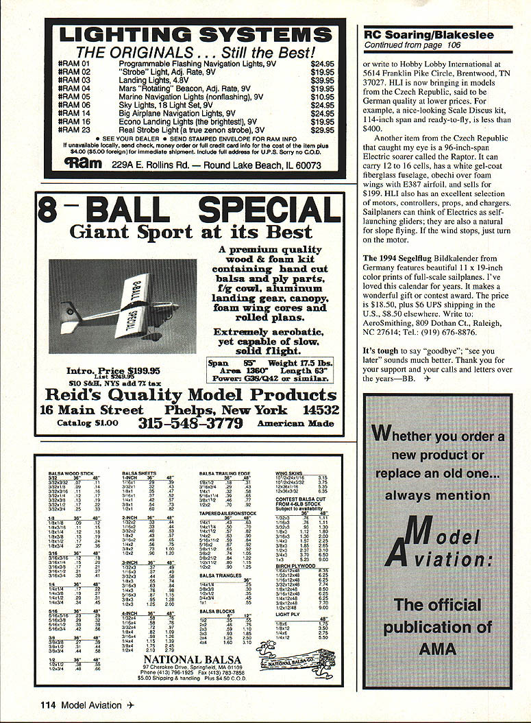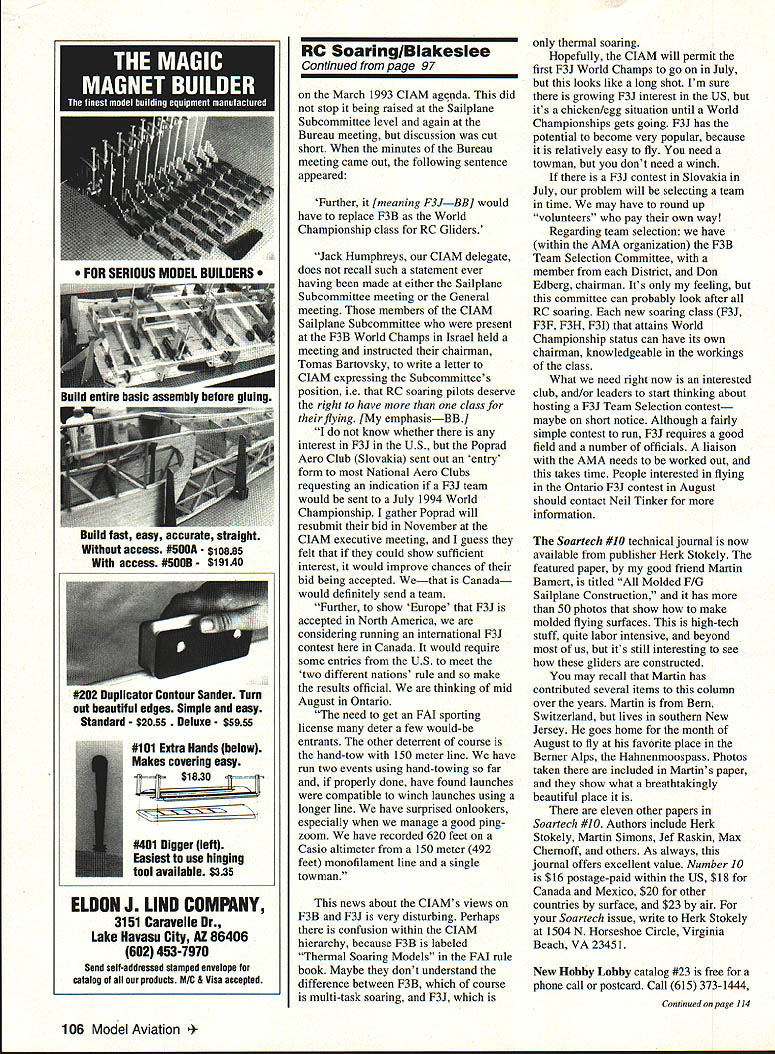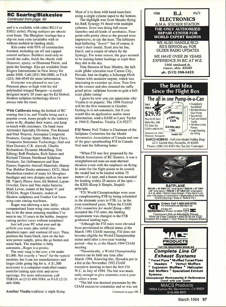 RADIO CONTROL SOARING -IA ] mu i ti zI rJKf DAN PRUSS Model Aviations contributing editor Soaring magazine founded back 1975 knew Dan 70s early 80s remember contributions RC soaring Dan CDed SOAR Nats Team Manager first three US F3B Teams Dan died cancer 1986 Ive minding column since job has marvelously rewarding ways especially giving opportunity make friends great sailplaners around world have enjoyed immensely time marches feel its time pass baton will last column love build fly gliders Ill contribute kit reviews such column time time new contributing editor soaring will Californian Daryl Perkins Daryl got hobby slope racer During past few years has developed world-class thermal pilot competes West Coast national international events Daryl placed second Joe Wurts 1991 F3B World Championships leading World Champs Israel last year until poor last-round distance task dropped him down Daryl spends full time hobby knows lot about latest developments sailplane technology possesses wonderfully witty writing style know Daryl will great jobyoull like him 1993 Visalia Contest years West Coast soaring friends have telling Visalia Fall Soaring Festival central California mostfiin contest country said contest also big season-ending social event mini trade show short soaring happening wife planning fall motor trip Victoria British Columbia what could better slight detour via California see contest October second third found small city Visalia about 40 miles southeast Fresno middle vast farm ranch lands Its neat tidy townexactly kind place would envision Waltons living weather hot high 90s dry both days contest Central Valley RC club CVRC has putting Festival twenty consecutive years Thats remarkable achievement club about 40 members Festival popular year fact its popular manageable must limit entries 225 Approximately 300 applications sent Lucky entrants determined drawing applications postmarked no earlier August first 225 spots filled first days mail Other features huge raffle worth thousands dollars merchandise services plus Saturday evening barbecue night fun-fly Whats impressive about competition flying way organizers whisk fliers through seven rounds l/4 days call flight groups say can fly mean now no sandbagging Its normal see 15 models air time Timers can regular flying buddies everything friendly relaxed Tasks precision duration 3 5 7 5 minutes Saturday 3 6 8 minutes Sunday March 1994 91 TEKOAs Roger Chastain Feather-Cut CNC Foam Cutter Computer-controlled can cut wing cores templates Tim Renaud Airtronics holds Thermal Eagle design popular fliers Visalia Experience ultimate radio control flying Scale pilots will pleasantly surprised its realistic flying speed ASW 20 will give feel full scale soaring Due weight reduced drag ASW 20 will regain altitude after dive ASW 20 can also flown high winds capable aerobatics Only Epoxy fiberglass moulded fuselage plans available now low price $ 99 MAJOR Special design easy glider towing including giant ASW 20 2 meter foam wing epoxy covered epoxy fuselage cowling Basic Kit $ 145 Plans $ 15 MAJOR LEROY AIRPORT FRES info LEROY ENTERPRISES INC 7150 Kansas Settlement Rd Wilicox AZ 85643 write call 602 3842611 FAX 2612 CVRC club-owned field used contest Its 11-acre rectangular plot surrounded cotton fields few miles north Visalia Winches retrievers turnarounds hard-mounted pedestals winch lines running north Theres no moving winch lines wind isnt right Unfortunately southerly breezes prevail time year Joe Wurts warned about said anyone flying Visalia better practice lots downwind landings can see sharks teeth de rigueur CVRC has area behind winches behind landing circles planted wiry Bermuda grass Anything landing fast long slide Most competitors well aware used variety arrestor devices addition usual nose gadgets models about two-inch-long skeg behind towhookquite effective plus helps keep flaps off ground Hitting consistent spot landings vital Visalia top pilots hand goodly number can counted get flight times making landings real separator times sink cycles severe enough some big guns couldnt get max Some seen landing cotton Unusual difficult landing-bonus schemes traditional Visalia time setup relatively generous three concentric circles 075 15 30 meters radius Landing inside inner circle netted 20% bonus target flight points middle circle added 10% outer circle 5% premium placed accurate landings popular models lightweight aileron/flap designs 100- 118-inch wingspans can use crow flaps downailerons up slow controlled landing approaches light model full wing camber big advantage downwind launches too Id guess 90% entries fit category smattering polyhedral models plus smaller larger aileron designs filled out rest Airtronics Thermal Eagles popular kit design 30 flown RnR Genesis second about 20 Following Saturns Falcons Shadows Super Vs Makos However contest winner above brand-new design called Spectrumflown other new Soaring contributing editor Yes Daryl Perkins flew 98% perfect dropping 56 points out possible 2664 Spectrum very attractive-looking model designed Mark Triebes Ron Vana Its made order Visalia conditions 108-inch span 62 ounces T tail has fixed stab separate elevator Continued page 97 92 Model Aviation DS LARGEST SAILPLANE KIT ! Wing span 5 meters 16575Weight 7 85 Kg 15-19 lbs Joe Wurts left timer Norm Timbs pose after flight Joe flew Falcon 880 tenth-place finish man Northeast Sailplane Products Sal DeFrancesco Scorpion 100 Fox Models RO Soaring/Blakeslee Continued page 92 available either RG15 S3021 airfoil Flying surfaces obechi over foam fiberglass fuselage has slip-on nose cone available molded-in landing skid Kits come 95% construction finished including cut off capped control surfaces Builders need install radio finish obechi Oracover epoxy Diamond Finish paint fuselage Kits available Slegers International New Jersey under $400 Call 201 366-0880 FAX 201 366-0549 information Everyone pleased see Les Peterson place high old polyhedral-