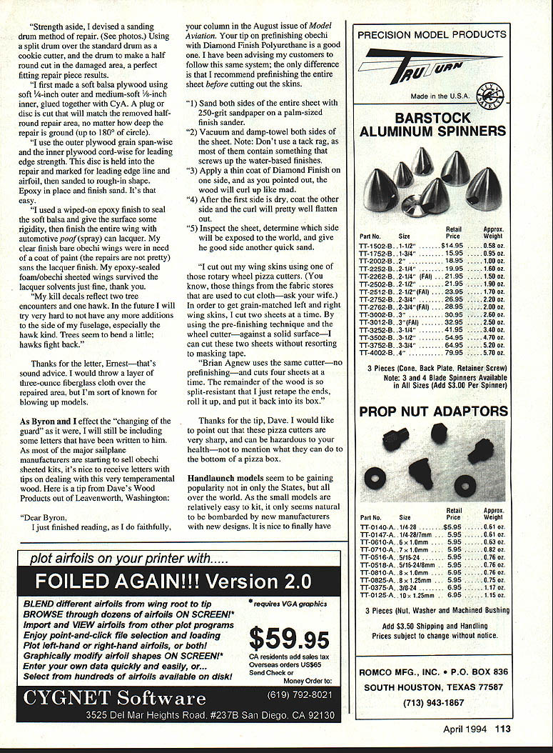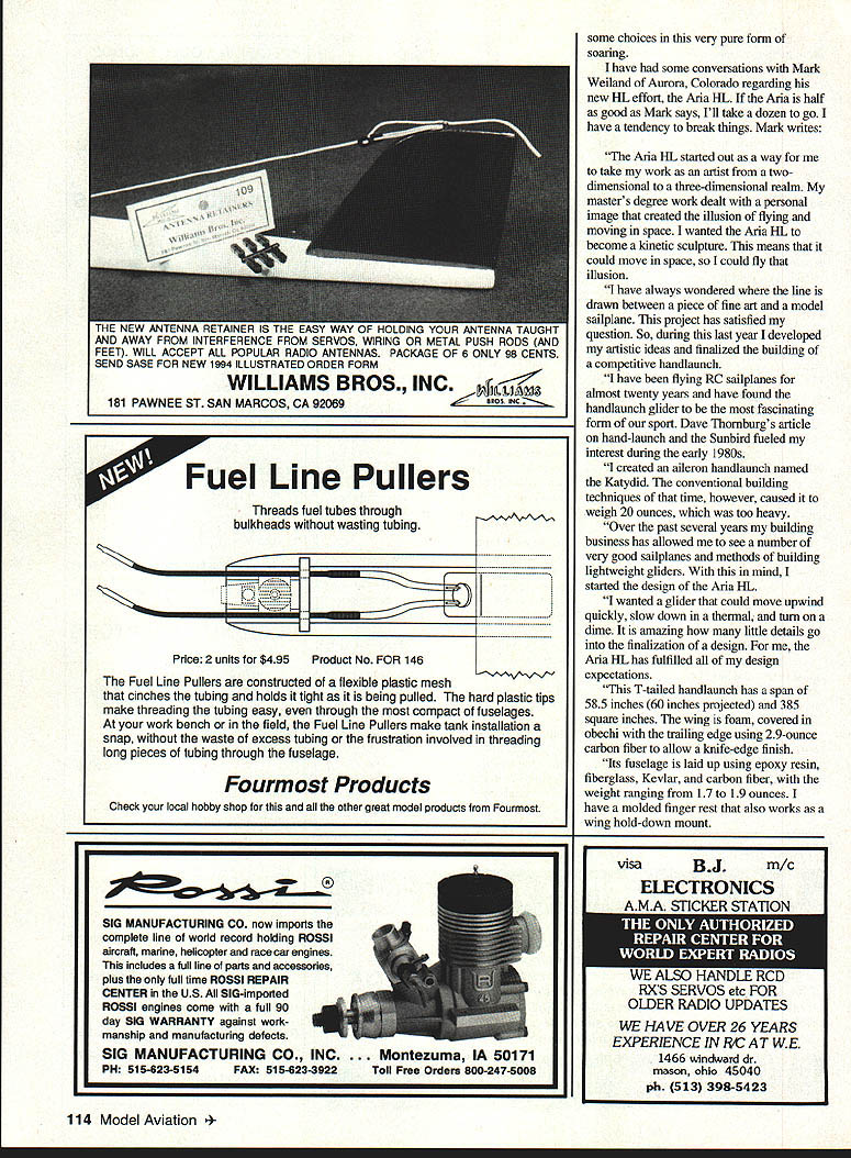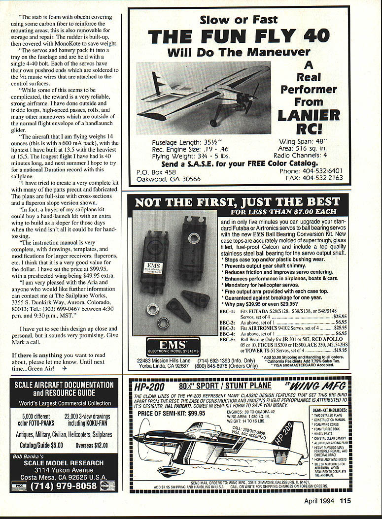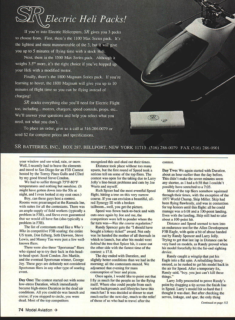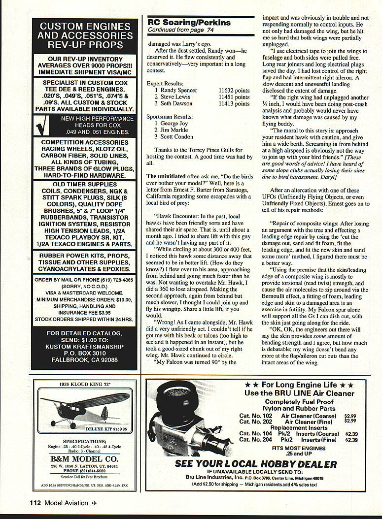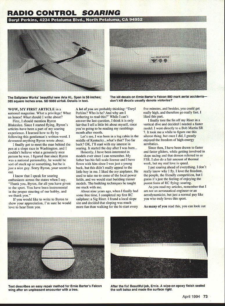 RADIO CONTROL SOARING ltiT~IT WOW MY FIRST ARTICLE national magazine What privilege What honor What should write about First should mention Byron Blakeslee Since started flying Byrons articles have part soaring experience learned fly following gentlemans written word devoured anything Byron wrote about finally got meet man behind pen slope race Washington couldnt believe what genuinely nice person figured since Byron national personality would sort stuck up something just nice guy Sorry Byron secret out know speak soaring enthusiasts across states say Thank Byron have given sport have instrumental proper steering hobby thank you would like write Byron show appreciation Im sure would love hear lot probably thinking Daryl Perkins am bothering read cant answer last question think fair tell little bit about myself since youre going reading ramblings month after month Lets see born log cabin middle Kentucky.whats Too far back OK Ill start interest soaring started day after born. Honestly have interested models ever since can remember father has full-scale license have flown him since just young buck didnt really appeal little boy liked toy airplanes used take some local power fields would start building trainer models building techniques taught stuck About nine years ago finally some free time completed first RC sailplane Sig Riser found local slope site decided sloping much fun waiking hi-start five minutes besides could get really high therefore go really fast liked part finaily tore fin off Riser vertical dive decided needed faster model went directly Bob Martin SR 7 took figure out aileron thing once did greatly enjoyed freedom high-energy aerobatics Since have drawn faster faster gliders getting involved slope racing demon referred F3B aiso fair amount thermal work real love speed put soaring ahead everything dont really know fly love freedom people friendly competition guess its just feeling enjoying purest form RC flying soaring As read articles remember am aeronautical engineer aerodynamicist just normal guy like truly loves sport As read can look out April 1994 73 Sailplane Works beautiful new Aria HL Span 58 inches kill decals Ernie Barters Falcon 880 mark aerial accidents 385 square inches area SD 6080 airfoil Details text dont kill decals usually denote victories Text describes easy repair method Ernie Barters Falcon wing after unpleasant encounter tree After fix Beautiful job Ernie wipe-on epoxy finish sealed soft balsa made surface rigid window see wind rain snow Well recently brave elements travel San Diego F3B Contest hosted Torrey Pines Gulls CDed good friend Steve Condon suffer through 750F-800F temperatures nothing sunshine might have gotten down 50s night looked coat once Boy can guys host contest Rooms prearranged Ramada Inn suites contestants ample supply field workers typically problem F3B Steve guaranteed would have fun also typically problem F3B list contestants read like Whos competitive F3B soaring entire US team Don Edberg Seth Dawson Steve Lewis Manny Tau just few wellknown fliers also three Sportsman fliers signed up try luck headto-head sport Scott Condon Jim Markle eventual Sportsman winner George Joy guys definitely considered Sportsman fliers other type soaring event Day contest started out some low-stress Duration immediately became high-stress Duration dead air conditions could launch cruise stopped circle dead Most top competitors recognized eked out times Distance took place too upsets first round Speed took serious toll some top fliers contest open taking due Larry Jollys line-break problems cuts Joe Wurts myself Rich Spicer eventful Speed flight hitting tree very narrow course can envision beautiful allred Synergy III broken tailboom.well get picture Speed flown back-to-back cuts once again Joe competitors left ponder far turn wasWas course regulation Randy Spencer gets should have bought lottery ticket award handed mother thermals launch after model went behind tree Spicer hit came out other side fastest time contest 178 day ended Duration slightly better conditions morning contestants maxed adjourned evening mass consumption beer pizza Once again would like point out fly much people flying itself else could people such varied backgrounds lifestyles have much fun decided dinner start much earlier next day much relief us travel after contest Day Two again started Duration about hour earlier day before didnt make seven minutes seem shorter 658 couldnt possibly have stretched 703 Most top fliers somehow squirmed through times exception 1977 World Champ Skip Miller Skip flying flawlessly contention top honors until flight could manage 608 100-point landing landing Skip still take about 100-point hit Distance Speed seemed turn endurance test Allen Development F3B Eagle quite bit abuse handed out Randy Spencer Larry Jolly Trying get last lap Distance can very hard models Randy proved model forcefully hit far-end sighting device Randy caught wingtip put Eagle flat spin rebuilding frenzy ensued rnshed get model back air Speed After temporary fix Randy said boy just cant kill things Larry Jolly proceeded prove Randys point dragging tip across finish line Speed Larrys model hit hard thought dust after checking servos linkage spar thing Continued page 112 74 Model Aviation IALIST IN CUSTOM COX TEE DEE & REED ENGINES 020S 049S 051S 074S & 09S ALL CUSTOM & STOCK PARTh AVAIl ARE F ENfliViflhlAl IV UOMILI IIION ACUESSORIES RACING WHEELS KLOTZ OIL CARBON FIBER SOLID LINES ALL KINDS OF TUBING THREE BRANDS OF GLOW PLUGS HARD-TO-FIND HARDWARE OLD TIMER SUPPLIES COILS CONDENSERS NGK & STIlT SPARK PLUGS SILK 8 COLORS QUALITY DOPE BRUSHES S & 7 LOOP 114 RUBBERBANDS TRANSISTOR IGNITION SYSTEMS RESISTOR HIGH TENSION LEADS 1/2A TEXACO PLAYBOY SR KIT 1/2A TEXACO ENGINES & PARTS RUBBER POWER KITS PROPS TISSUE AND OTHER SUPPLIES CYANOACRYLATES & EPOXIES ORDER BY MAIL OR PHONE 619 728-4365 SORRY NO COD VISA & MASTERCARD WELCOME MINIMUM MERCHANDISE ORDER $1000 SHIPPING HANDLING AND