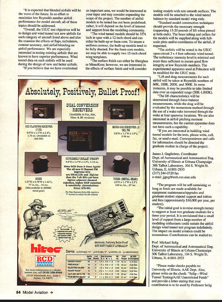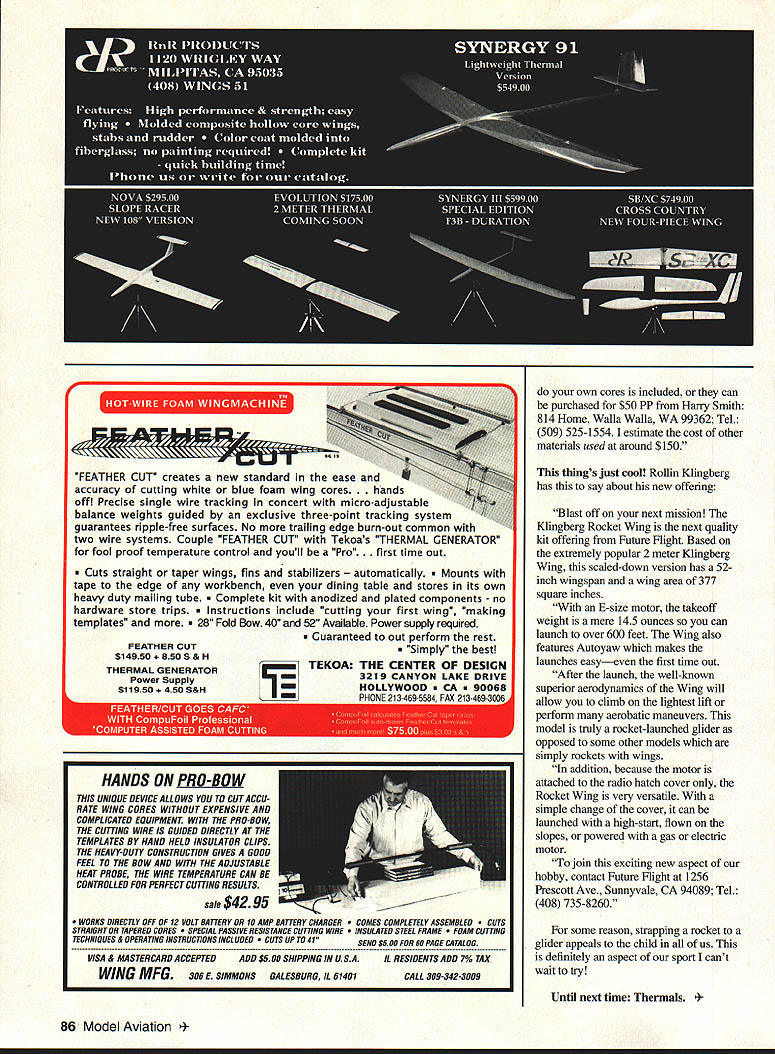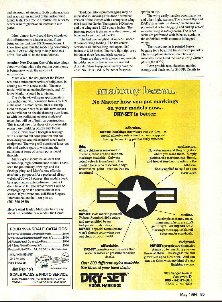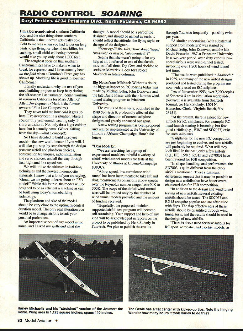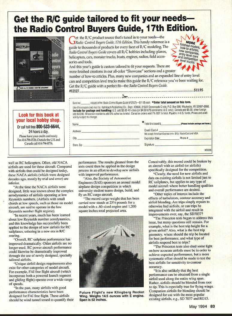 RADIO CONTROL SOARING Im born-and-raised southern California boy nice thing about southern California never gets really cold Cold put long pants go flying killer hatsucking small-child-collecting thermals would take up about 1000 feet toughest decision southern California fliers have make break espresso have actually field Dominos Pizza guy has shown up Modeling life good southern California finally understand rest need building projects keep busy during off-season Last summer began working northern California Mark Allen Allen Development Mark former owner Rite Lite Composites never told cold gets up Ive never situation couldnt fly year-round wearing T shirts shorts does get cold up actually rains Water falling skywhat concept So have decided build project modelthe new world-beater will will take step-by-step through design process airfoil planform choices construction techniques radio installation servo choices way through first flight first speed run will utilize ultimate building techniques newest composite materials know lot saying Great going learn about F3B model true model will designed efficient machine can built using todays bomebuilding technology planform size model should very close optimum contest duration model real alteration would change airfoils suit personal preference An important aspect model name asked girlfriend what thought model should part designer should named such should reflect attitude flying style ego designer. ego said about huge massive maybe astronomical Seeing wasnt going help referred classic movies time Top Gun decided settle Maverick Look Project Maverick future columns Big News Michael Without doubt biggest impact RC soaring today made Michael Selig John Donovan late David Fraser famous windtunnel testing program Princeton University results tests published 1989 Soartech 8 profoundly affected shape direction current sailplane designs greatly enhanced sport new testing program has proposed will implemented University Illinois Urbana-Champaign Heres letter Dear Modeler searching group experienced modelers build variety airfoil wind-tunnel models tests University Illinois Urbana-Champaign UIUC low-speed low-turbulence wind tunnel has instrumented take lift drag measurements airfoils low speeds over Reynolds number range 60K 300K scope airfoil wind-tunnel tests will limited number wind tunnel models provided amount funding received Hopefully proposed modelersupported airfoil test program will become self-sustaining support help kind will acknowledged reports project published Herk Stokely Soartech plan publish results through Soartech frequentlypossibly twice per year similar undertaking substantial support modelers started Michael Selig John Donovan late David Fraser 1987 Princeton University two-year period over sixty various lowspeed airfoils wind-tunnel tested involving over 1200 hours wind tunnel test time results published Soartech 8 1989 new airfoil designs produced tested during program now widely used RC sailplanes As November 1993 over 2200 copies Soartech 8 circulation worldwide Soartech 8 available Soartech Journal Herk Stokely 1504 N Horseshoe Circle Virginia Beach VA 23451 present need new airfoils RC sailplanes example RC hand-launch soaring booming few good airfoils eg E387 5D7037 exist such sailplanes Sailpianes new F3J competition just beginning evolve new airfoils will probably required What will look like past few airfoils eg HQ 15/85 RGl5 5D7003 have favored F3B competition shape handling performance SD7003 quite different other airfoils mentioned significant differences suggest may possible design new airfoils have better overall characteristics F3B competition addition design wind tunnel testing new airfoils several existing airfoils should tested 5D7037 RGl5 quite popular often used flaps flap effectiveness airfoils should quantified through wind tunnel tests results should used design new airfoils also need new airfoils RC sport aerobatic electric models 82 Model Aviation ey Michaelis stretched version Jouster Genie has flat center kicked-up tips Note hinging Genie Wing area 1123 square inches spans 140 inches Wonder hours took Harley Get R/C product source thats tuned needsthe Radio Control Buyers Guide 17th Edition handy reference guide thousands products facet R/C modeling Radio Control Buyers Guide covers R/C hobbies including planes helicopters cars monster trucks boats engines radios field acces sories tools Get R/C guide tailored fit needs Radio Control Buyers Guide 17th Edition FEOR gushed mod65 Dew erltry IevanIes GOmpe trucks years guide custom tailored fit requests finished creations all-color Showcase sections greater number how-to articles Plus new companies expanded line entry level cars competition level trucks make guide R/C reference youve waiting Get R/C guide perfect fitthe Radio Control Buyers Guide #12127$1195 [v32][b-1-10-1-10]] Send ________ copys Radio Control Buyers Guide #121 27gi 195 *Enter total amount form Use coupon mail Kaimbach Publishing Co Dept X0836 21027 Crnssroads Circle PO Boo 986 Wautesha WI 53187-0986 Include postage handling US add $300 4th class $450 UPS continental US Canada add $500 other toreiga add $1000 Wiscunsin residents add 5% sales tao total Canadian orders add 7% GST total Papahie US tends Prices avail ability subject change *Total Enclosed $_________________ Pleas include postage andlixes Name Credit Card # accept American Express 1mm 6151 MasterCard VISA Fopiration Date________________ Phone # __________________ City State Zip Signature X0836 well RC helicopters Often old NACA airfoils used aircraft Compared airfoils could designed today NACA airfoils designed decades ago mostly trial error inferior time NACA airfoils designed little known about complex aerodynamics airfoils operating low Reynolds numbers Airfoils small chords low speeds such model aircraft said operate low Reynolds number flight regime recent years much has learned about low Reynolds number aerodynamics knowl
