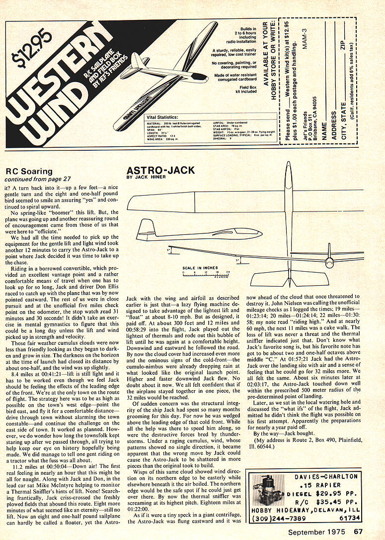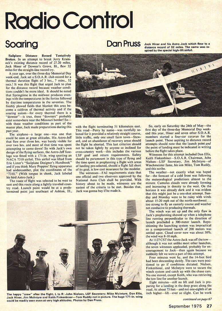 Radio Control Soaring Sailplane Distance Record Tentatively Broken attempt break Jerry Krain ocks existing distance record 2720 miles Jack Hiner Downers Grove Ill flew 32 miles straight-line record try year ago over three-day Memorial Day week-end Jack set SOAR club record thermal duration flight 3 hrs 7 mins 52 sees flight urged Jack plan distance record because weather condi tions couldnt ideal should noted Springtime midwest produces ings temperatures forties followed daytime temperatures seventies freshly plowed fields blanket area come caldron thermal activity soaring axiomfor thermal downeris true downers probably exist somewhere near Missouri border So weather conditions part master plan Jack made preparations during past year airplanea large onewas could seen great altitudes Astro-Jeff flew over three hrs barely visible over two hrs time spent attempting come down So Jacks own design flying surfaces Astro-Jeff fuse lage fitted 171-in wing sporting NACA 7310 airfoil airfoil lifted Eric Listers Sailplane Designers Handbook think Mary Poppins flying apparatus undercamber plot coordinates 7310 tongue cheek Jack labeled bird Astro-Jack route flight selected west east route along lightly traveled coun try road Launch point would prede termined point just southeast Ashton Ill Dan Pruss Jack Hiner hia Aatro Jack flew record 32 miles name spired apecial high-lift airfoil flight terminating 51 kilometers east road Perry namewas carefully se lected provided relatively straight course little traffic small farm townStew ard abundance recovery areas should flight aborted last criterion should taken lightly anyone inclined cross-country workthis includes various LSF goal return requirements Safety should paramount type flying time spent preplanning flight areas landing pre-selected should flight fall short its goal low cost insurance modeler witnessesFAI requirements state official two observers approved National Aero Club shall provided history about made witnesses easiest criteria met Besides Jack gonna buy made So early Saturday 24th Maythe first day three-day Memorial Day week end year Hiner seven other SOAR members started four-car caravan launch point aspiring distance record attempts should note launch point point landing must indicated writing before flight takes place Witnesses attempt included Don Ellis Keith FinkenbinerSOAR Chairman John NielsenLSF Secretary Jim Mclntyreof Winchmeister fame son Mike Tom Ruddy scribe weather exactly what hoped forthe forecast cold front following meteorological predictions almost minute Cumulus clouds already forming increasing density west horizon already dark evident might just one-shot attempt Sun day Monday rainy winds about 15-20 mph Out north-northwest too strong fly easterly course weather conducive producing thermals winch set up flaw Jacks preplanning showed up telephone line running perpendicular direction launch precluded 300-meter launch Repo sitioning launching system impractical compromised launch 200 meters settled upon Cloud cover now about 50% wind 8-10 mph 1127 CST Astro-Jack off tow although unlike other launches seven witnesses applauded probably en couragement Jackthen again because suddenly felt part attempt Four minutes went 14-foot bird descending slowly cars posi tioned go conditions dictated Nielsen Finkenbiner McIntyre secure winch system catch up chase cars No moved except Keith retrieving tow line another launch Eight minutesstill no lift Jack pre paring landing deep grass along road about 75 feetand one-eighth inch higher liftever slight Can work continued page 67 September 1975 27 happy crew after flight Ito R John Nielsen 1SF Secretary Mike Mcintyre Don Ellis Jack Hiner Jim Mcintyre Keith FinkenbinerTom Ruddy picture huge 171-in wing could readily seen very high altitudes Photos Dan Pruss Buiids 2 6 hours including radio installation sturdy reliable easily repaired low cost trainer No covering painting decorating required Made water resistant corrugated cardboard Oj Lu0 8W Field Box kit included HerOIC unac,bH STASAREC Tasqi STAB AIGFOIL Flat WEIGHT 1502 1050a1 21-OS 20 lying Ogiofli SORFACELOAOI5GTYPICAL SozpSqH csaCt 5 0 C ii Ctg 0 teig gte0 0on0 C0 Lu404fl4 fliC3 ~0 -o40 0 turn back itup few feeta nice gentle turn eight one-half pound bird seemed smile assuring yes con tinued spiral upward No spring-like boomer lift plane going up another reassuring round encouragement came us officiate time needed pick up equipment gentle lift light wind took another 12 minutes carry Astro-Jack point Jack decided time take up chase Riding borrowed convertible pro vided excellent vantage point rather comfortable means travel has look up long Jack driver Don Ellis raced catch up plane now pointed eastward rest us close pursuit unofficial five miles check point odometer stop watch xead 31 minutes 30 seconds didnt take exer cise mental gymnastics figure could long day unless lift wind picked up strength velocity fair weather cumulus clouds now less friendly looking began dark en grow size darkness horizon time launch closed its distance about one-half wind up slightly 84 miles 004121lift still light has worked though feel Jack should feeling effects leading edge front town route flight strategy high possible towns west edgepoint bird east fly comfortable distance drive through town alarming town constableand continue challenge east side town worked planned ever wonder long townsfolk kept staring up after passed through trying help keep eye history hopefully being made did manage tell gent riding tractor what fuss about 112 miles 005004Down air first real feeling nearly hour might naught Along Jack Don lead car sat Mike McIntyre helping monitor Thermal Snifflers hints lift None Search ing frantically Jack criss-crossed freshly plowed fields abound route Eight minutes what seemed like eternitystill no lift Now eight one-half pound sailplane can hardly called floater yet Astro oS121520 Jack wing airfoil described earlier just thata lazy fl