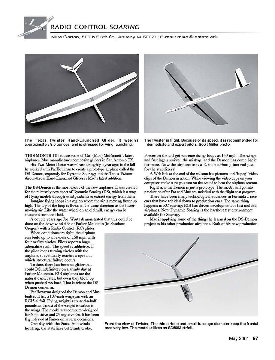 DS-Demon, expressly for Dynamic Soaring; and the Texas Twister