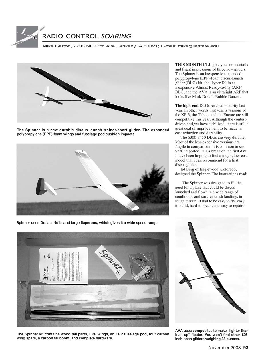 The Spinner is a new durable discus-launch trainer/sport glider. The expanded