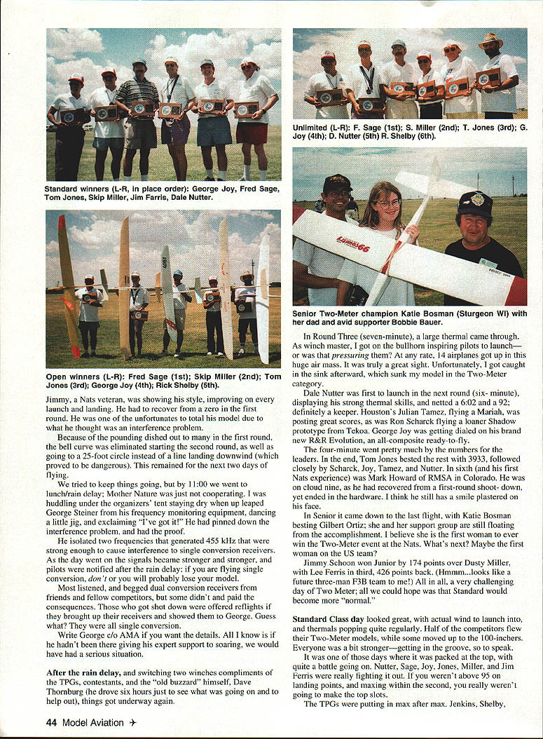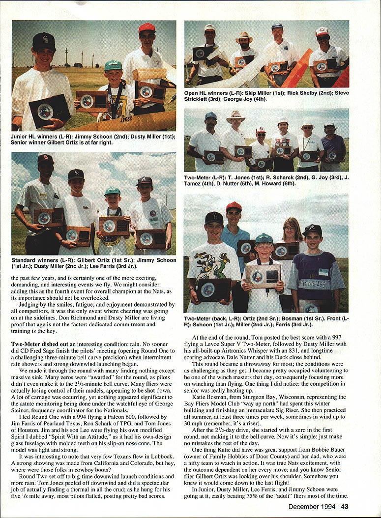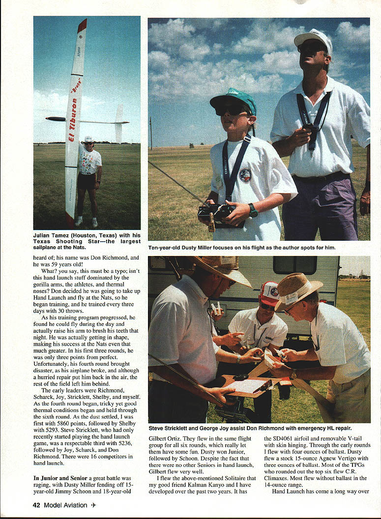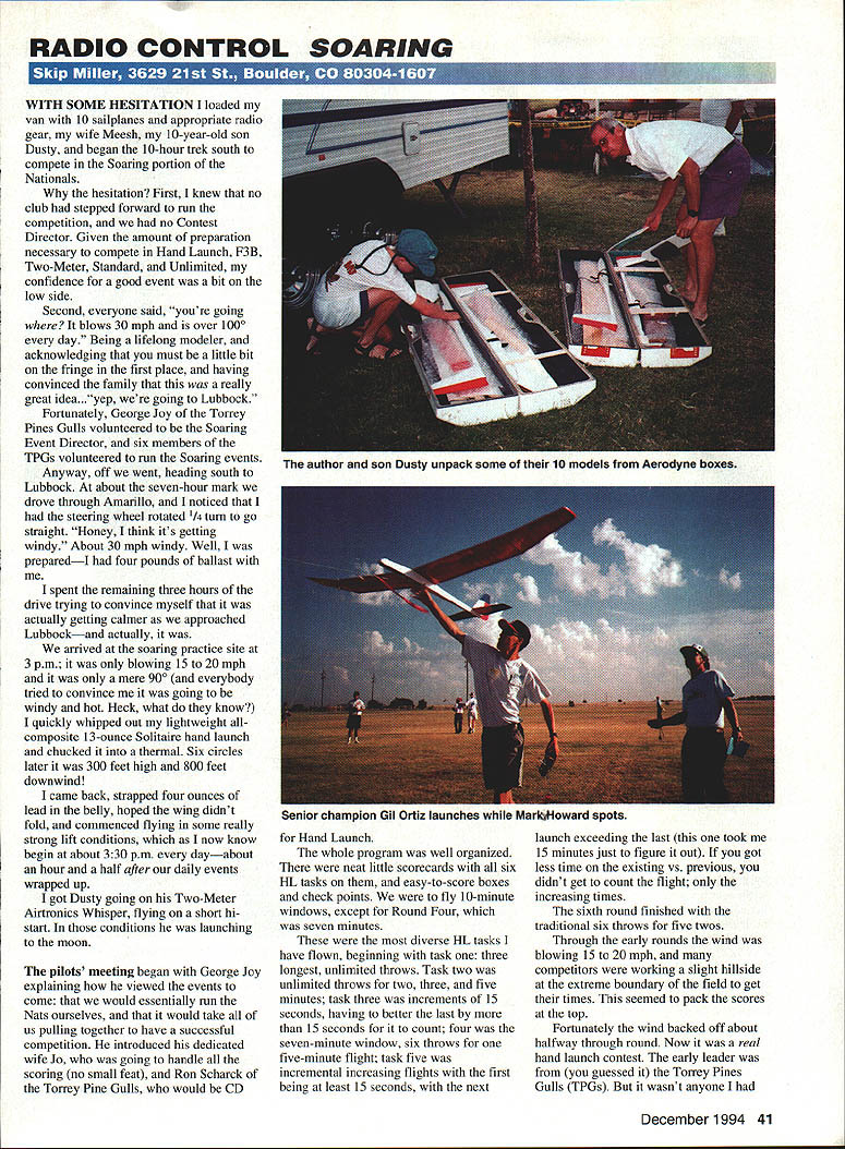 RADIO CONTROL SOARING Li SOME HESITATION loaded van 10 sailpianes appropriate radio gear wife Meesh 10-year-old son Dusty began 10-hour trek south compete Soaring portion Nationals hesitation First knew no club stepped forward run competition no Contest Director Given amount preparation necessary compete Hand Launch F3B Two-Meter Standard Unlimited confidence good event bit low side Second everyone said youre going blows 30 mph over 1000 day Being lifelong modeler acknowledging must little bit fringe first place having convinced family really great idea.yep going Lubbock Fortunately George Joy Torrey Pines Gulls volunteered Soaring Event Director six members TPGs volunteered run Soaring events Anyway off went heading south Lubbock about seven-hour mark drove through Amarillo noticed steering wheel rotated 1/4 turn go straight Honey think its getting windy About 30 mph windy Well preparedI four pounds ballast spent remaining three hours drive trying convince myself actually getting calmer approached Lubbockand actually arrived soaring practice site 3 pm blowing 15 20 mph mere 900 everybody tried convince going windy hot Heck what know quickly whipped out lightweight allcomposite 13-ounce Solitaire hand launch chucked thermal Six circles later 300 feet high 800 feet downwind came back strapped four ounces lead belly hoped wing didnt fold commenced flying some really strong lift conditions now know begin about 330 pm dayabout hour half after daily events wrapped up got Dusty going Two-Meter Airtronics Whisper flying short histart conditions launching moon pilots meeting began George Joy explaining viewed events come would essentially run Nats ourselves would take us pulling together have successful competition introduced dedicated wife J0 going handle scoring no small feat Ron Scharck Torrey Pine Gulls would CD Hand Launch whole program well organized neat little scorecards six HL tasks easy-to-score boxes check points fly 10-minute windows except Round Four seven minutes diverse HL tasks have flown beginning task three longest unlimited throws Task two unlimited throws two three five minutes task three increments 15 seconds having better last 15 seconds count four seven-minute window six throws five-minute flight task five incremental increasing flights first being least 15 seconds next launch exceeding last took 15 minutes just figure out got less time existing vs previous didnt get count flight increasing times sixth round finished traditional six throws five twos Through early rounds wind blowing 15 20 mph competitors working slight hillside extreme boundary field get times seemed pack scores top Fortunately wind backed off about halfway through round Now real hand launch contest early leader guessed Torrey Pines Gulls TPGs wasnt anyone December 1994 41 author son Dusty unpack some 10 models Aerodyne boxes Senior champion Gil Ortiz launches Marlt*loward spots heard name Don Richmond 59 years old What say must typo isnt hand launch stuff dominated gorilla arms athletes thermal noses Don decided going take up Hand Launch fly Nats began training trained three days 30 throws As training program progressed found could fly during day actually raise arm brush teeth night actually getting shape making success Nats much greater first three rounds three points perfect Unfortunately fourth round brought disaster airplane broke although hurried repair put him back air rest field left him behind early leaders Richmond Scharck Joy Stricklett Shelby myself As fourth round began tricky yet good thermal conditions began held through sixth round As dust settled first 5860 points followed Shelby 5293 Steve Stricklett recently started playing hand launch game respectable third 5236 followed Joy Scharck Don Richmond 16 competitors hand launch Junior Senior great battle raging Dusty Miller fending off 15year-old Jimmy Schoon 18-year-old Gilbert Ortiz flew same flight group six rounds really let have some fun Dusty won Junior followed Schoon Despite fact no other Seniors hand launch Gilbert flew very well flew above-mentioned Solitaire good friend Kalman Kanyo have developed over past two years has 5D406 1 airfoil removable V-tail skin hinging Through early rounds flew four ounces ballast Dusty flew stock 15-ounce Agnew Vertigo three ounces ballast Most TPGs rounded out top six flew CR Climaxes Most flew ballast 14-ounce range Hand Launch has come long way over 42 Model Aviation 40 eq ml Julian Tamez Houston Texas Texas Shooting Starthe largest sailplane Nats Ten-year-old Dusty Miller focuses flight author spots him Steve Stricklett George Joy assist Don Richmond emergency HL repair past few years certainly exciting demanding interesting events fly might consider adding fourth event overall champion Nats its importance should overlooked Judging smiles fatigue enjoyment demonstrated competitors event cheering going sidelines Don Richmond Dusty Miller living proof age factor dedicated commitment training key Two-Meter dished out interesting condition rain No sooner did CD Fred Sage finish pilots meeting opening Round challenging three-minute bell curve precision intermittent rain showers strong downwind launching began made through round finding nothing except massive sink zeros awarded round pilots didnt make 21/2-minute bell curve fliers actually losing control models appearing shot down lot carnage occurring yet nothing appeared significant astute monitoring being done under watchful eye George Steiner frequency coordinator Nationals led Round 994 flying Falcon 600 followed Jim Farris Pearland Texas Ron Schark TPG Tom Jones Houston Jim son Lee flying own modified Spirit dubbed Spirit Attitude own-design glass fuselage molded teeth slip-on nose cone model light strong interesting note very few Texans flew Lubbock strong showing made California Colorado hey folks cowboy boots Round Two set off big-time downwind launch conditions rain Tom Jones peeled off downwind did spectacular job actually finding thermal cr
