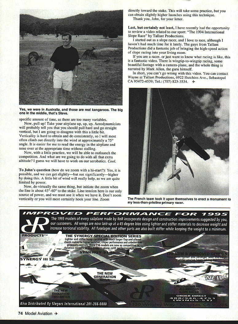 RADIO CONTROL SOARING fl AE GLIDING IN AUSTRALIA Electric WC incredible yes water really does go down drain backwards thermals dust devils Willy-Willies refer go opposite direction As matter fact have stand head thermal inverted just make airplane go up did take some handlaunch gliders us can testify fact thermals big meaty fact Larry Jolly flying seven-cell duration World Games almost handlaunched plane out required seven seconds motor blast make five minutes get letters Lots lots letters love makes feel popular enables keep touch what guys really want read about Please keep coming apologize dont respond dont correspond well John T Deden Missouri City Texas writes enjoy RC Soaring column very much pardon stupidity have important question. What heck zoom launch John goes explain about hi-start 100 feet rubber 440 feet braided line John numerous fliers over country like yourself dont have opportunity interact other fliers clubs due geographical constraints So zoom launch very tricky utilizing hi-start term usually referred using winch although possible zoom using hi-start using winch very few fliers approach launch correctly letter gives opportunity discuss something have meaning address quite some time now launch dont feel enough fliers take launch seriously enough see way get plane air thats about other hand approach launch very differently very important part flight read ads RCSD discuss well particular glider flies computer dont fly computer fly real world 5 10 percent extra launch altitude will almost always beat extra percent two max LID minimum sink contest assuming positively no-lift conditions longest times will almost always achieved guy gal launches highest Now have established need optimize launch technique lets discuss need assume couple things simplicitys sake will assume standard club winch retriever will also assume use braided nylon line virtually no stretch need airplane can take rigors hard launch minimum wing flex importantexcessive wing flex costs energy Almost contest models market will Assuming have things lets launch sailplane should set up pull hard possible tipstalling will take few launches get right once right airplane will rotate immediately out hand give appearance going almost vertical obtain launch setup very aggressive droop whole trailing edge flaps ailerons about 1/4 inch measured trailing edge add up elevator accordingly until model begins unstable just back off couple percent call good Once model stable tow certain maintain good line tension Line tension energy dont necessarily need stand pedal Remember amount line dont suck unnecessarily can added launch height brief note learn use rudder steer model up tow will handle much better minimal control input Now comes hard part zoom see people actually lose altitude part launch could possibly believe zoom use winch accelerate model maximum speed use speed gain altitude effectively typically will initiate zoom model has practically stalled winch line approximately 700 turnaround straight over point take out launch camber nose over directly turnaround Too much will hook line enough wont gain max acceleration winch long should dive very dependent winch power weight aircraft lighter model quickly will accelerate Therefore making optimum time bucket much shorter heavier model acceleration winch will slower will need go toward turnaround little longer cant give May1995 71 F5B World Champs top three Rudy Freudenthaler left Jerry Bridgeman center W Schaffer right US F5 Team left Bridgeman Neu Sliff Condon Jolly Perkins Absent photo Keith Finkenbiner directly toward stake will take some practice can obtain slightly higher launches using technique Thank John letter Last certainly least have recently opportunity review video related sport 1994 International Slope Race Tallant Productions started out slope racer love race although havent much time lately guys Tallant Productions did fantastic job bringing high-speed action slope racing living room racer just want know what racing like fantastic video wingtip-to-wingtip racing some beautiful footage camera-plane whole thing narrated Mark Allen guru himself short cant go wrong video can contact Wayne Tallant Productions 6922 Hutchins Ave Sebastopol CA 95472-4539 Tel 707 823-3534 * specific amount time too variables Now pull up Take airplane up up up Aerodynamicists will probably tell you should pull hard go straight vertical am going disagree little bit Verticality hard obtain consistently will often climb out directly wind approximately 750 angle easier read energy airplane nose over appropriate time stalling Now little practice will able outlaunch competition what going extra altitude guess will have work aerobatics Cool Johns question zoom hi-start Yes possible can get slightlybut significantlyhigher doing little bit wind will really help quite limited power Now virtually same thing initiate zoom line about 450600 stake Line tension source power must use have Dont zoom vertically will certainly hook line Zoom 74 Model Aviation Australia real kangaroos big middle thats Steve French team took upon themselves erect monument less-than-pristine primary racer