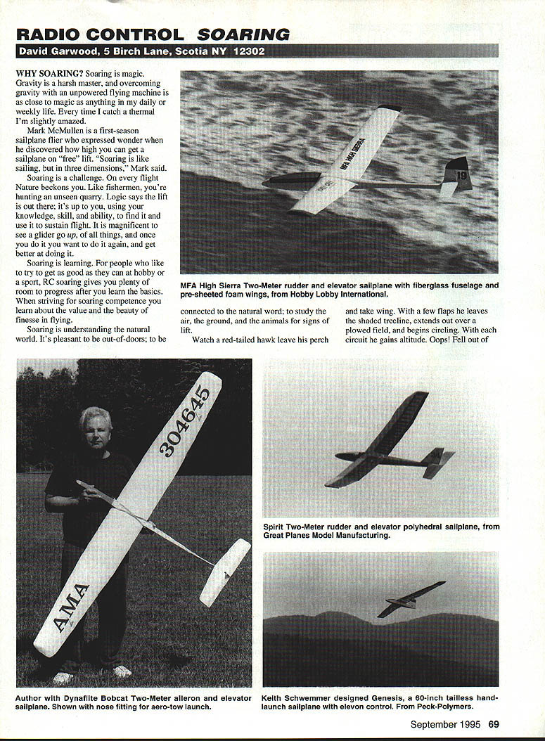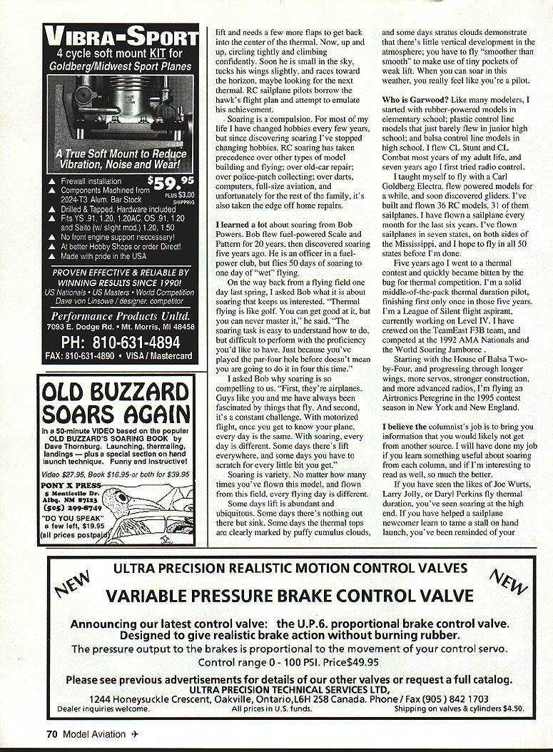 RADIO CONTROL SOARING WHY SOARING Soaring magic Gravity harsh master overcoming gravity unpowered flying machine close magic anything daily weekly life time catch thermal Im slightly amazed Mark McMullen first-season sailplane flier expressed wonder discovered high can get sailplane free lift Soaring like sailing three dimensions Mark said Soaring challenge flight Nature beckons Like fishermen youre hunting unseen quarry Logic says lift out its up using knowledge skill ability find use sustain flight magnificent see glider go up things once you want again get better doing Soaring learning people like try get good can hobby sport RC soaring gives plenty room progress after learn basics striving soaring competence learn about value beauty finesse flying Soaring understanding natural world Its pleasant out-of-doors connected natural word study take wing few flaps leaves air ground animals signs shaded treeline extends out over lift plowed field begins circling Watch red-tailed hawk leave perch circuit gains altitude Oops Fell out Author Dynaflite Bobcat Two-Meter aileron elevator Keith Schwemmer designed Genesis 60-inch tailless handsailplane Shown nose fitting aero-tow launch launch sailplane elevon control Peck-Polymers September 1995 69 MFA High Sierra Two-Meter rudder elevator sailplane fiberglass fuselage pre-sheeted foam wings Hobby Lobby International Spirit Two-Meter rudder elevator polyhedral sailplane Great Planes Model Manufacturing Video $2795 Book $16 95 both $39 95 PONY X PR S MatIceII Dr AIbq MM 67123 505 2994749 DO YOU SPEAK few left $19g5 A&~i prices postpa lift needs few flaps get back center thermal Now up up circling tightly climbing confidently Soon small sky tucks wings slightly races toward horizon maybe looking next thermal RC sailplane pilots borrow hawks flight plan attempt emulate achievement Soaring compulsion life have changed hobbies few years since discovering soaring Ive stopped changing hobbies RC soaring has taken precedence over other types model building flying over old-car repair over police-patch collecting over darts computers full-size aviation unfortunately rest family its also taken edge off home repairs learned lot about soaring Bob Powers Bob flew fuel-powered Scale Pattern 20 years discovered soaring five years ago officer fuelpower club flies 50 days soaring day wet flying way back flying field day last spring asked Bob what about soaring keeps us interested Thermal flying like golf can get good can never master said soaring task easy understand difficult perform proficiency youd like have Just because youve played par-four hole before doesnt mean going four time asked Bob soaring compelling us First theyre airplanes Guys like have always fascinated things fly second its constant challenge motorized flight once get know plane day same soaring day different Some days theres lift everywhere some days have scratch little bit get Soaring variety No matter times youve flown model flown field flying day different Some days lift abundant ubiquitous Some days theres nothing out sink Some days thermal tops clearly marked puffy cumulus clouds some days stratus clouds demonstrate theres little vertical development atmosphere have fly smoother smooth make use tiny pockets weak lift can soar weather really feel like youre pilot Garwood Like modelers started rubber-powered models elementary school plastic control line models just barely flew junior high school balsa control line models high school flew CL Stunt CL Combat years adult life seven years ago first tried radio control taught myself fly Carl Goldberg Electra flew powered models soon discovered gliders Ive built flown 36 RC models 31 sailplanes have flown sailplane month last six years Ive flown sailplanes seven states both sides Mississippi hope fly 50 states before Im done Five years ago went thermal contest quickly became bitten bug thermal competition Im solid middle-of-the-pack thermal duration pilot finishing first once five years Im League Silent flight aspirant currently working Level IV have crewed TeamEast F3B team competed 1992 AMA Nationals World Soaring Jamboree Starting House Balsa Twoby-Four progressing through longer wings servos stronger construction advanced radios Im flying Airtronics Peregrine 1995 contest season New York New England believe columnists job bring information would likely get another source will have done job learn something useful about soaring column Im interesting read well much better have seen likes Joe Wurts Larry Jolly Daryl Perkins fly thermal duration youve seen soaring high end have helped sailplane newcomer learn tame stall hand launch youve reminded 70 Model Aviation BUZZARD SOARS AGAIN 50-minute VIDEO based popular OLD BUZZARDS SOARING BOOK Dave Thornburg Launching thermaling landings special section hand launch technique Funny instructive ULTRA PRECISION REALISTIC MOTION CONTROL VALVES 4 VARIABLE PRESSURE BRAKE CONTROL VALVE Announcing latest control valve UP6 proportional brake control valve Designed give realistic brake action burning rubber pressure output brakes proportional movement control servo Control range 0 100 PSI Price$4995 Please see previous advertisements details other valves request full catalog ULTRA PRECISION TECHNICAL SERVICES LTD 1244 Honeysuckle Crescent Oakville OntarioL6H 258 Canada Phone Fax 905 1703 Dealer inquiries welcomeAll prices US fundsshipping valves & cylinders $450 sailplane roots have flown contest youve experienced extra edge competition adds flying skills have hand-launched thermal climbed sailplane until almost too small see youve broken worlds widest grin triumphing over gravity skill experience bag balsa Ill try keep touch extremes rich spectrum also cover vast middle ground occupied RC soaring buffs want learn find thermals just little better appreciate knowing about successful construction technique interested new sailplane designs technical advances make thermal soaring interesting relaxing successful Its impo