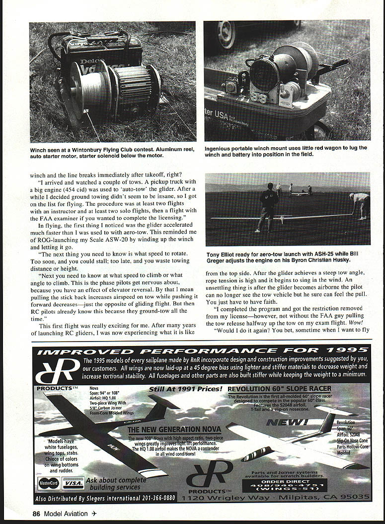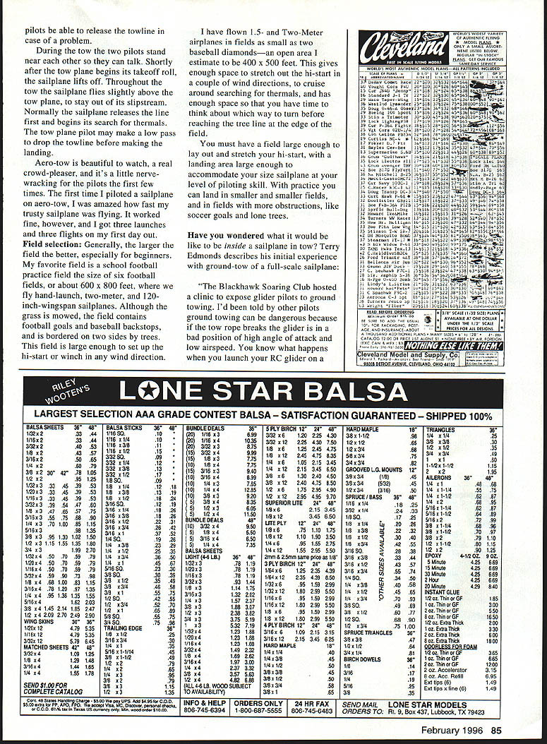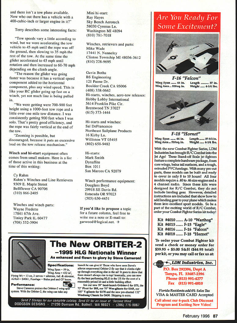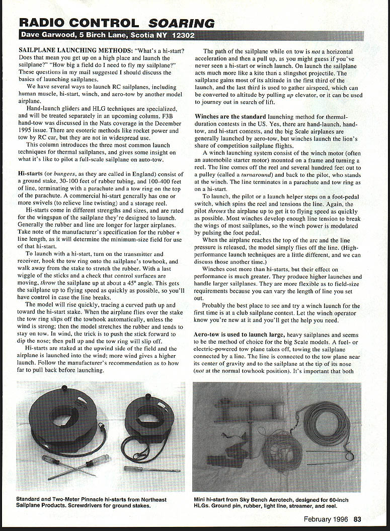 RADIO CONTROL SOARING SAILPLANE LAUNCHING METHODS Whats hi-start Does mean get up high place launch sailplane big field need fly sailplane questions mail suggested should discuss basics launching sailplanes have several ways launch RC sailplanes including human muscle hi-start winch aero-tow another model airplane Hand-launch gliders HLG techniques specialized will treated separately upcoming column F3B hand-tow discussed Nats coverage December 1995 issue esoteric methods like rocket power tow RC car widespread use column introduces three common launch techniques thermal sailplanes gives some insight what its like pilot full-scale sailplane auto-tow Hi-starts bun gees called England consist ground stake 30-100 feet rubber tubing 100-400 feet line terminating parachute tow ring top parachute commercial hi-start generally has swivels relieve line twisting storage reel Hi-starts come different strengths sizes rated wingspan sailplane theyre designed launch Generally rubber line longer larger airplanes Take note manufacturers specification rubber length will determine minimum-size field use hi-start launch hi-start turn transmitter receiver hook tow ring onto sailplanes towhook walk away stake stretch rubber last wiggle sticks check control surfaces moving throw sailplane up about 450 angle gets sailplane up flying speed quickly possible youll have control case line breaks model will rise quickly tracing curved path up toward hi-start stake airplane flies over stake tow ring slips off towhook automatically unless wind strong model stretches rubber tends stay tow wind trick push stick forward dip nose pull up tow ring will slip off Hi-starts staked upwind side field airplane launched wind wind gives higher launch Follow manufacturers recommendation far pull back before launching path sailplane tow horizontal acceleration pull up might guess youve never seen hi-start winch launch launch sailplane acts much like kite slingshot projectile sailplane gains its altitude first third launch last third used gather airspeed can converted altitude pulling up elevator can used journey out search lift Winches standard launching method thermalduration contests US Yes hand-launch handtow hi-start contests big Scale airplanes generally launched aero-tow winches launch lions share competition sailplane flights winch launching system consist winch motor often automobile starter motor mounted frame turning reel line comes off reel several hundred feet out pulley called turnaround back pilot stands winch line terminates parachute tow ring hi-start launch pilot launch helper steps foot-pedal switch spins reel tensions line Again pilot throws airplane up get flying speed quickly possible Most winches develop enough line tension break wings sailplanes winch power modulated pulsing foot pedal airplane reaches top arc line pressure released model simply flies off line High performance launch techniques little different can discuss another time Winches cost hi-starts effect performance much greater produce higher launches handle larger sailplanes flexible field-size requirements because can vary length line set out Probably best place see try winch launch first time club sailplane contest Let winch operator know youre new youll get help need Aero-tow ased lannch large heavy sailplanes seems method choice big Scale models fuel- electric-powered tow plane takes off towing sailplane connected line line connected tow plane near its center gravity sailplane tip its nose normal towhook position Its important both February 1996 83 Standard Two-Meter Pinnacle hi-starts Northeast Sailplane Products Screwdrivers ground stakes Mini hi-start Sky Bench Aerotech designed 60-inch HLGs Ground pin rubber light line streamer reel pilots able release towline case problem During tow two pilots stand near other can talk Shortly after tow plane begins its takeoff roll sailplane lifts off Throughout tow sailplane flies slightly above tow plane stay out its slipstream Normally sailplane releases line first begins its search thermals tow plane pilot may make low pass drop towline before making landing Aero-tow beautiful watch real crowd-pleaser its little nervewracking pilots first few times first time piloted sailplane aero-tow amazed fast trusty sailplane flying worked fine however got three launches three flights first day out Field selection Generally larger field better especially beginners favorite field school football practice field size six football fields about 600 x 800 feet fly hand-launch two-meter 120inch-wingspan sailplanes Although grass mowed field contains football goals baseball backstops bordered two sides trees field large enough set up hi-start winch wind direction have flown 15- Two-Meter airplanes fields small two baseball diamondsan open area estimate 400 x 500 feet gives enough space stretch out hi-start couple wind directions cruise around searching thermals has enough space have time think about way turn before reaching tree line edge field must have field large enough lay out stretch hi-start landing area large enough accommodate size sailplane level piloting skill practice can land smaller smaller fields fields obstructions like soccer goals lone trees Have wondered what would like inside sailplane tow Terry Edmonds describes initial experience ground-tow full-scale sailplane Blackhawk Soaring Club hosted clinic expose glider pilots ground towing Id told other pilots ground towing can dangerous because tow rope breaks glider bad position high angle attack low airspeed know what happens launch RC glider WORLDS MOST AUTHENTIC MODEL PLANSALL PATTERNS INCLUDED SCALe AT PLANEA lT1ITTAFOI SPAAPT ER[.ARRPFVIATEbTEADE124 SAl ItATTIl9 TAIDEA 223G32 $3264 $14..3/3S8 40VAUAOL CorE 04020$203022660345 15CAR JN40JeUny2250032 $2465 $38O6SLOrl"TL 14SEAnIIADIO 31 Dr22 $2232$3045 $45..I 29WADA TApTA-Wing15 $022932045 $346614880 $62 36WEELTCO LYCADOTE2531837432475$38100 $521. 35DAA5 046A0bEEH2322434 $3268$46 2 29SATAUg 100 SPORT85$