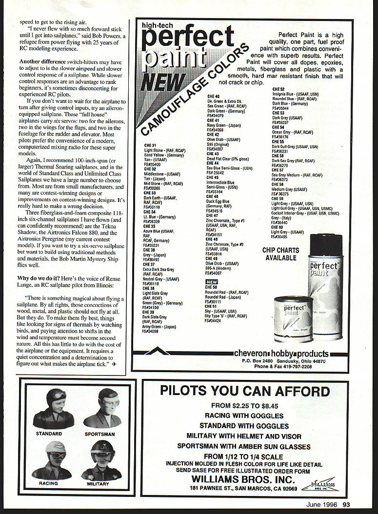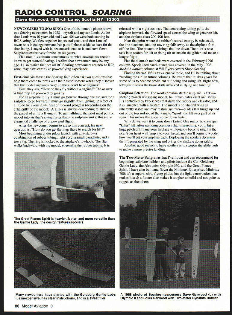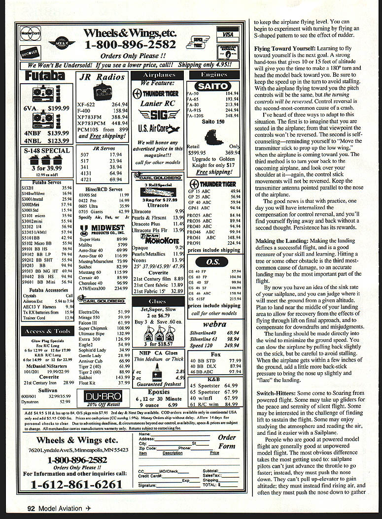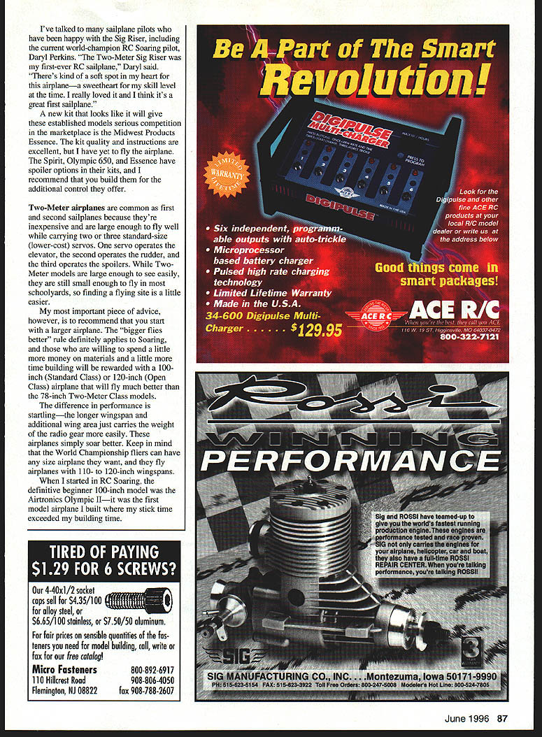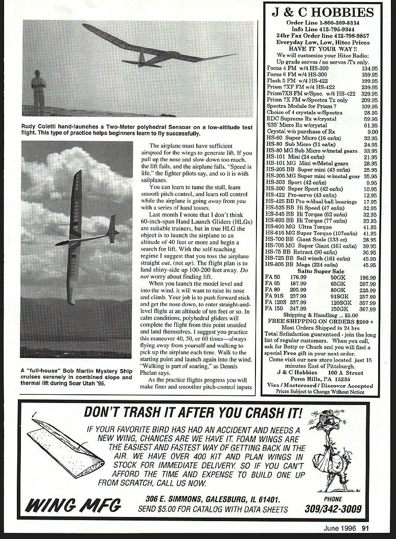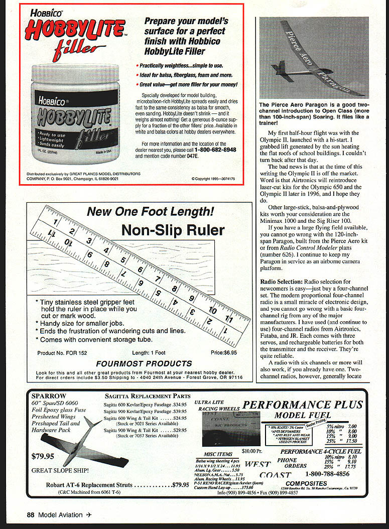 RADIO CONTROL SOARING NEWCOMERS TO SOARING months photos shows two Soaring newcomers 1988myself son Louis time Louis 10 years old 40 both starting RC Soaring flew together several years Lou left town hes college now has put sailplanes aside least time being stayed became addicted have flown Sailplanes exclusively last six years months column concentrates what newcomers need know get started Soaring realize newcomers may age also realize RC Soaring newcomers new RC some may have extensive power-flying experience First-time visitors Soaring field often ask two questions help come terms astonishment discover model airplanes way up dont have engines First ask fly engine answer powered gravity airplane fly must go forward through air sailplane go forward must go slightly down giving up foot altitude 20-40 feet forward progress depending efficiently model glider always descending relative parcel air flying gain altitude pilot must put model air thats rising faster sailplane sinks elemental challenge unpowered flight After newcomer begins grasp concept next question get up search lift Most beginning glider pilots launch hi-starta combination rubber tubing light cord small parachute tow ring ring hooked airplanes towhook flier walks backward model stretching rubber tubing released vigorous toss contracting tubing pulls airplane forward forward speed causes wing generate lift airplane rises 200-400 feet Near point rubbers stored energy exhausted line slackens tow ring falls away airplane flies off line parachute brings line downThe pilots next task search lift rising air sustain glider make longer flight Flat-field launch methods covered February 1996 column Specialized hand-launch covered May 1996 Model Aviation columnist Wil Byers covers Slope Soaring Finding thermal lift extensive topic Ill talking about reading air future columns aware takes years some us become pioficient finding using lift Right now lets just discuss basic skills involved flying landing Sailplane Selection common starter sailplane TwoMeter 78-inch wingspan model built balsa sheet sticks Its controlled two servos drive rudder elevator launched hi-start models polyhedral wing inherently stable may feature spoilersblades hinge up out top surface wing spoil lift over part its span makes glider come down faster want come down faster reason escape killer lift After spending countless flights searching youll hit huge patch lift airplane will quickly become small sky heart will jump throat youll begin wonder youll get airplane back Deploying spoilers decreases lift generated wing brings airplane down safely Another good reason have spoilers steepen glide path make precise landing Two-Meter Snilpinnes Ive flown can recommend beginning sailplane builders pilots include Carl Goldberg Gentle Lady Airtronics Olympic 650 Great Planes Spirit have also built flown Minimax Enterprises Minimax 700 its superb slow-flying glider light construction makes such floater also makes tougher build quite rugged others newcomers have started Goldberg Gentle Lady 1988 photo Soaring newcomers Dave Garwood L its inexpensive has clear Instructions sweet flier Olympic II Louis Garwood Two-Meter Dynaflite Bobcat 86 Model Aviation t Planes Spirit heavier faster versatile Gentle Lady design features spoilers Ive talked sailplane pilots have happy Sig Riser including current world-champion RC Soaring pilot Daryl Perkins Two-Meter Sig Riser first-ever RC sailplane Daryl said Theres kind soft spot heart airplanea sweetheart skill level time really loved think its great first sailplane new kit looks like will give established models serious competition marketplace Midwest Products Essence kit quality instructions excellent have yet fly airplane Spirit Olympic 650 Essence have spoiler options kits recommend build additional control offer Two-Meter airplanes common first second sailplanes because theyre inexpensive large enough fly well carrying two three standard-size lower-cost servos servo operates elevator second operates rudder third operates spoilers TwoMeter models large enough see easily still small enough fly schoolyards finding flying site little easier important piece advice however recommend start larger airplane bigger flies better rule definitely applies Soaring willing spend little money materials little time building will rewarded 100inch Standard Class 120-inch Open Class airplane will fly much better 78-inch Two-Meter Class models difference performance startlingthe longer wingspan additional wing area just carries weight radio gear easily airplanes simply soar better Keep mind World Championship fliers can have size airplane want fly airplanes 110- 120-inch wingspans started RC Soaring definitive beginner 100-inch model Airtronics Olympic Ilit first model airplane built stick time exceeded building time fair prices sensible quantities fas teners need model building call write fax free catalog Micro Fasteners800-892-6917 110 Hillcrest Road908-806-4050 Flemington NJ 08822fax 908-788-2601 June 1996 87 4-40x1/2 socket caps sell $435/i 00 alloy steel $665/i 00 stainless $750/SO aluminum New Foot Length Non-Slip Ruler ////// 6 0 " Product No FOR 152Length 1 FootPnce$695 * Tiny stainless steel gripper feet hold ruler place cut mark wood * Handy size smaller jobs * Ends frustration wandering cuts lines * Comes convenient storage tube FOURMOST PRODUCTS Look other great products Fourmost nearest hobby dealer direct orders include $350 Shipping -4040 24th Avenue Forest Grove OR 97116 Pierce Aero Paragon good twochannel introduction Open Class 100-inch-span Soaring flies like trainer first half-hour flight Olympic II launched hi-start grabbed lift generated sun heating flat roofs school buildings couldnt turn back after day bad news time writing Olympic II off market Word Airtronics will reintroduce laser-cut kits Olympic 650 Olympic II later 1996 hope Other large-stick balsa-and-plywood kits worth consideration Minimax 1000 Sig Riser 100 have large flying fi