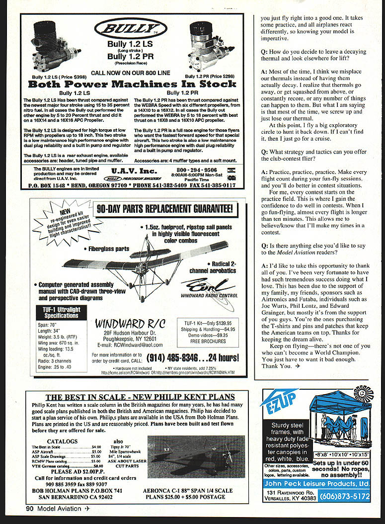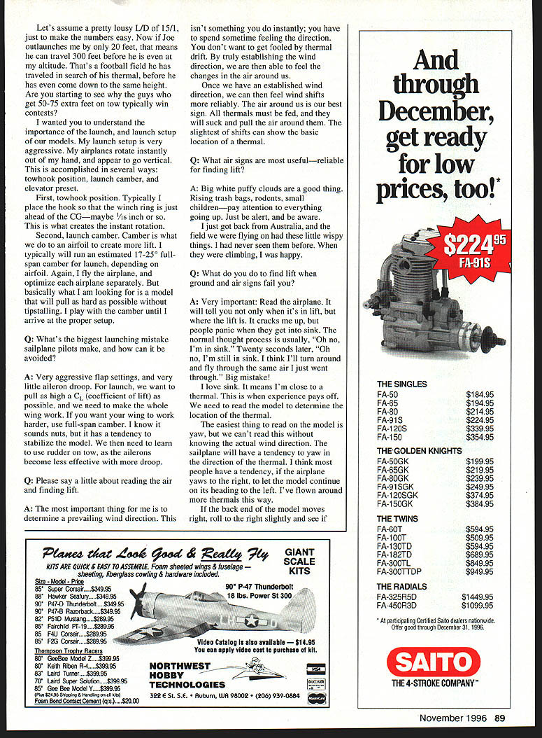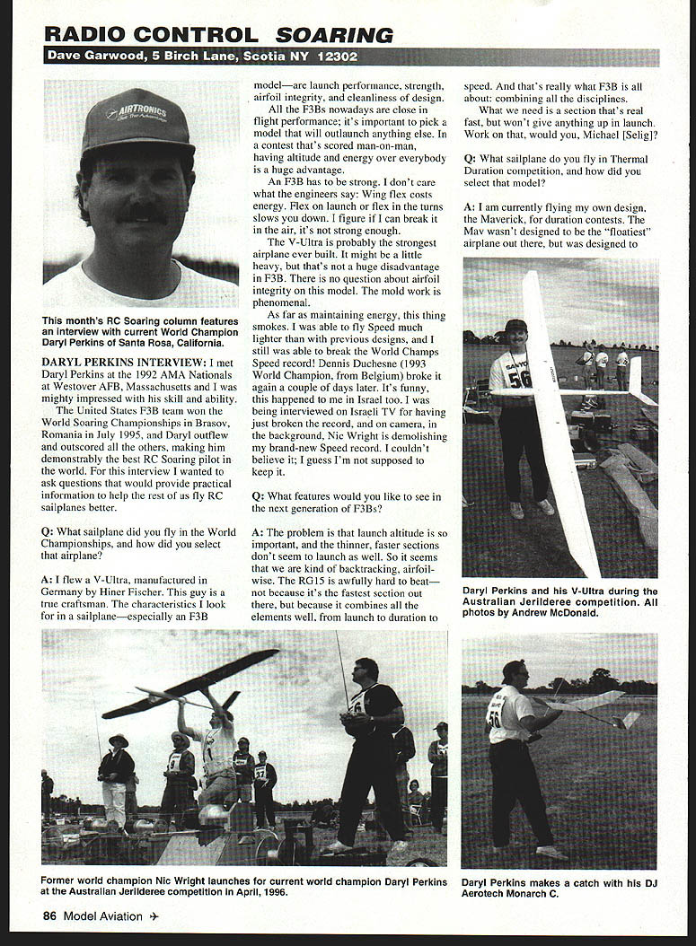 RADIO CONTROL SOARING DARYL PERKINS INTERVIEW met Daryl Perkins 1992 AMA Nationals Westover AFB Massachusetts mighty impressed skill ability United States F3B team won World Soaring Championships Brasov Romania July 1995 Daryl outfiew outscored others making him demonstrably best RC Soaring pilot world interview wanted ask questions would provide practical information help rest us fly RC sailplanes better Q What sailplane did fly World Championships did select airplane A I flew V-Ultra manufactured Germany Hiner Fischer guy true craftsman characteristics look sailplaneespecially F3B modelare launch performance strength airfoil integrity cleanliness design F3Bs nowadays close flight performance its important pick model will outlaunch anything else contest thats scored man-on-man having altitude energy over everybody huge advantage An F3B has strong dont care what engineers say Wing flex costs energy Flex launch flex turns slows down figure can break air its strong enough V-Ultra probably strongest airplane ever built might little heavy thats huge disadvantage F3B no question about airfoil integrity model mold work phenomenal As far maintaining energy thing smokes able fly Speed much lighter previous designs still able break World Champs Speed record Dennis Duchesne 1993 World Champion Belgium broke again couple days later Its funny happened Israel too being interviewed Israeli TV having just broken record camera background Nic Wright demolishing brand-new Speed record couldnt believe guess Im supposed keep Q What features would like see next generation F3Bs A The problem launch altitude important thinner faster sections dont seem launch well So seems kind backtracking airfoilwise RGl5 awfully hard beat because its fastest section out because combines elements well launch duration speed thats really what F3B about combining disciplines What need section thats real fast wont give anything up launch Work would Michael [Selig] Q What sailplane fly Thermal Duration competition did select model A I am currently flying own design Maverick duration contests May wasnt designed floatiest airplane out designed 86 Model Aviation hs AC Soaring column features interview current World Champion Daryl Perkins Santa Rosa California Daryl Perkins V-Ultra during Australian Jerilderee competition photos Andrew McDonald Former world champion Nic Wright launches current world champion Daryl Perkins Australian Jerilderee competition April 1996 Daryl Perkins makes catch DJ Aerotech Monarch C launch higher have great cruise reason simple have never made time contest because couldnt work thermal once got itbut because couldnt get thermal Maverick gets thermal its also lot fun coming back Smokin Q Have hints tips sailplane selection rest us A Sailplane selection very personal airplanes market have strengths weaknesses have own little niche theyre very good Try get caught up media hype won last contest what type airplane guys win can typically win flying manhole cover Its important pick plane particular skill level same time will push abilities somewhat stayed content flying Sig Riser first started out would have never developed skills win Worlds always pushed myself Q What sailplane setup methods techniques work A How determine final CU [center gravity] Basically cant physically fly CUs far back need maximum efficiency using far back can handle rule just keep moving CU back until airplane unmanageable put e nose call good longer fly particular design farther aft can move CU Now lot happens continually move CUs back need keep retrimming models fullflying stab isnt problem articulated stabs need reshim stabs lot people move CG back say Look its stalling over sky Well guys thats what trim levers trim sailplanes typically trim max L/D like airplane cruise efficiently effortlessly dont like push Joe Wurts other hand trims minimum sink personalpreference kind thing see Joes always lift thumb gets tired pulling back stick time Q Launching cited contributing success US team 1995 World Soaring Championships What did team differently other teams A Here California launch altitude treated very important thing rest States seem content just get airplane air get serious Altitude key everything RC Soaringfrom Handlaunch F3J Duration F3B trim decals shown Signature Series kit includes certificate authenticity handsigned Great Planes President Founder Don Anderson location dealer nearest please call 1-800-682-8948 Ask code #041 OF spyright 19963072210 Ever since its 1988 debut Super Sportster 90/120 has dazzling R/C fliers incredibly realistic point rolls knife edges snaps spins huge out-of-sight victory rolls Now collectors well performancehungry pilots Great Planes presents Signature Series Super Sportster 90/120 special edition classic kitto produced very limited nuantityincludes sizzling new trim decals ulus certificate authenticity. personally Great Planes President rounder Don Anderson Dont miss chance own Signature Series Super Sportster 90/120 See Great Planes dealer today Wingspan 72 Wing Area 950 sq Weight 95-11 lb Wing Loading 23-27 ozlsq tt Length 60 Requires 2stroke 61-90 4-stroke 91-120 engine & 4channel radio *QrAifEA MODEl VA Distributed Exclusively Through GREAT PLANES MODEL DISTRIBUTORS COMPANY P0 Box 9021 champaign IL 61826-9021 November 1996 87 Daryl Perkins launches V-Ultra another day Jerilderee competition won World Champs design Special collectors edition Lets assume pretty lousy LID 15/1 just make numbers easy Now Joe outlaunches 20 feet means can travel 300 feet before altitude Thats football field has traveled search thermal before has come down same height Are starting see guys get 50-75 extra feet tow typically win contests wanted understand importance launch launch setup models launch setup very aggressive airplanes rotate instantly out hand appear go vertical accomplished several ways towhook position launch camber elevator preset First towbook position Typically place hook winch ring just ahead CGmaybe