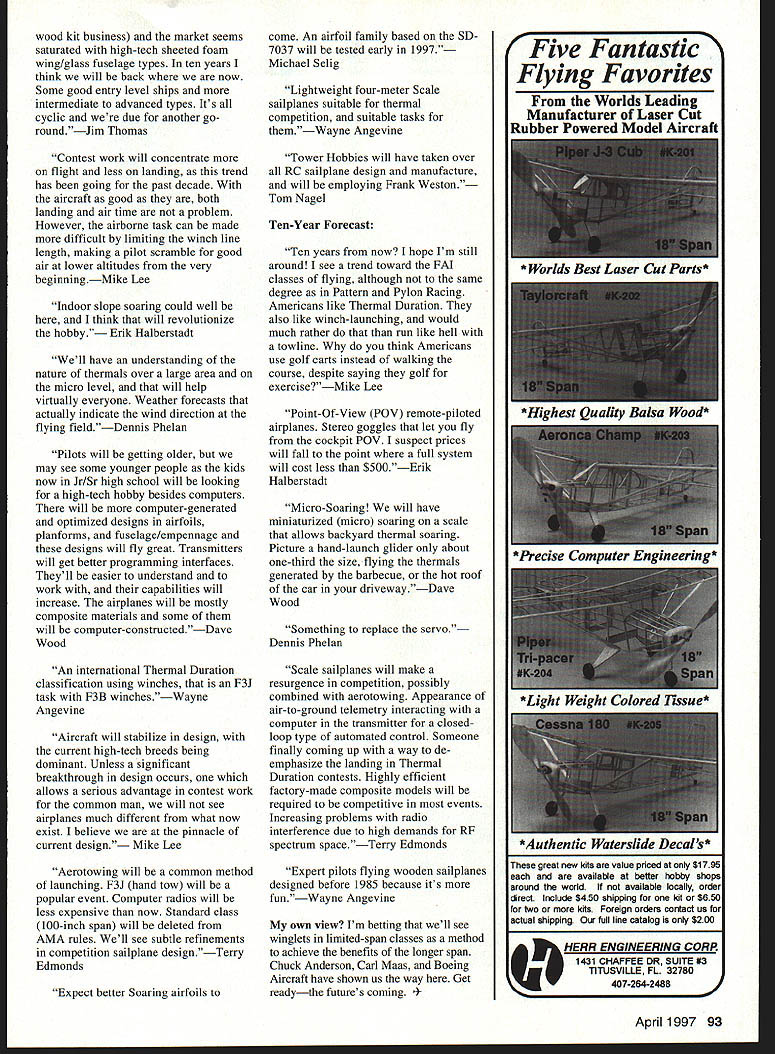 RADIO CONTROL SOARING I' SOARING TIME CAPSULE reader proposed months futuristic topic crystal-ball gazing prospects RC Soaring Andrew Westreich suggested polling sailplane designers builders fliers ask think sport going next ten years Itll fun see wrong might also fun speculate what evolutionary changes may offing hobby So goes last year Ive asked sailplane people what think well see RC Soaring five years ten years presented responses below 2002 2007 can reread column laugh cry Present Its discontent ones present situation stirs activity improve Some respondents articulated problems have today need push beginner intermediate-type airplanes like ones Airtronics reintroducing people can enter sport Deanna Vignolini need onboard instrumentation downlink telemetry system type information performance could measured ultimately lead quantitative data guide design Michael Selig 90s stagnant years kick off research development must abolish current competition format Instead rocketing sailplane 700 feet coming down minutes lets limit launch altitude 200 feet fly out find lift go 700 feet fly back ten minutes will create new type airplane maybe less expensive new type expert flierMike Popescu Im hoping price computer radios will come downSteve Lucke Airplanes today same super-strong go down flightline dont see much difference go back hi-starts designers would working balsa Japanese tissue Anything will go up strong lift need airplanes will go up light lift Chris Burns would like see simple pressurized propellant-launched HLGs classes sensory glove fully controls aircraft launch landing via simple hand finger movements Holographic goggles providing full HUD Head-Up Display in-flight viewsJim Raichele Wed like see designs line retrievers work efficiently view having winches retrievers manufactured newcomers hobby useGary Burrows Id like see crashproof trainer fully equipped real radio gear less $200 EPP foam construction idiotproof controls will bring April 1997 91 What old becomes new again Carl Maas Solaris sharply swept winglets Carl Maas gives us closer look 1996 Solaris design 1997 USA F3B soaring team will guys ten years L-R BJ Weisman Randy Spencer Joe Wurts Gordon Jennings Photo Terry Edmonds newcomers have scared off repair timeErik Halberstadt Id like see video feedback CCD screen transmitter have fly-by-wire now have no feedback Its what call business open ioop Id like see air data sensors sailpianes feedback aircraft transparent pilot airplane air Thats next step Well see two-way telemetry sailplane will sending data back pilotMark LeVoe think well see molded models become common US thermal duration contests Well probably have molded HLGs tooSteve Condon five years diversity airplanes available 10 years ago should available again entry level intermediate allwood ships enjoying resurgence Airtronics back 92 Model Aviation k Anderson launches 1979 Two-Meter Spica featuring wingiets Ron Stanfield timing 1996 Nats Articulated control surface Flap mechanism Don Stackhouse Daryl Perkins shown Daryls Whiplash computer transmitters can feed back Alpha angle attack Beta sideslip could have CG far back airplane wouldnt fly radio onJosh Glaab Five-Year Forecast respondents took up challenge predict what will see sailplane flying field within half decade n nowhere will find u-Catalog $1000 ou will find delayl l Step 5hoppieg H/ace Fbr s Flectrics Accesser LANE WILLISTON VT 05495 658-9482 Call/F Site wwwnesailcor salnsp@ together wood kit business market seems saturated high-tech sheeted foam wing/glass fuselage types ten years think will back now Some good entry level ships intermediate advanced types Its cyclic due another go roundJim Thomas Contest work will concentrate flight less landing trend has going past decade aircraft good both landing air time problem However airborne task can made difficult limiting winch line length making pilot scramble good air lower altitudes very beginningMike Lee Indoor slope soaring could well think will revolutionize hobby Erik Halberstadt Well have understanding nature thermals over large area micro level will help virtually everyone Weather forecasts actually indicate wind direction flying fieldDennis Phelan Pilots will getting older may see some younger people kids now Jr/Sr high school will looking high-tech hobby besides computers will computer-generated optimized designs airfoils planforms fuselage/empennage designs will fly great Transmitters will get better programming interfaces Theyll easier understand work capabilities will increase airplanes will mostly composite materials some will computer-constructed-Dave Wood An international Thermal Duration classification using winches F3J task F3B winchesWayne Angevine Aircraft will stabilize design current high-tech breeds being dominant Unless significant breakthrough design occurs allows serious advantage contest work common man will see airplanes much different what now exist believe pinnacle current design Mike Lee Aerotowing will common method launching F3J hand tow will popular event Computer radios will less expensive now Standard class 100-inch span will deleted AMA rules Well see subtle refinements competition sailplane designTerry Edmonds Expect better Soaring airfoils come An airfoil family based SD7037 will tested early 1997 Michael Selig Lightweight four-meter Scale sailplanes suitable thermal competition suitable tasks themWayne Angevine Tower Hobbies will have taken over RC sailplane design manufacture will employing Frank Weston Tom Nagel Ten-Year Forecast Ten years now hope Im still around see trend toward FAI classes flying although same degree Pattern Pylon Racing Americans like Thermal Duration also like winch-launching would much rather run like hell towline think Americans use golf carts instead walking course despite saying golf exerciseMike Lee Point-Of-View POV remote-piloted airplanes Stereo goggles let fly cockpit POV suspect prices will fall point full system will cost less $500Erik 