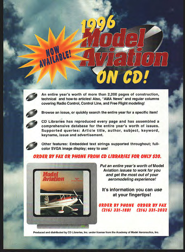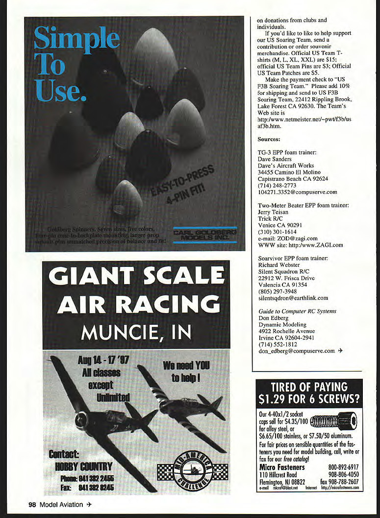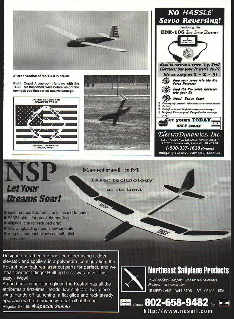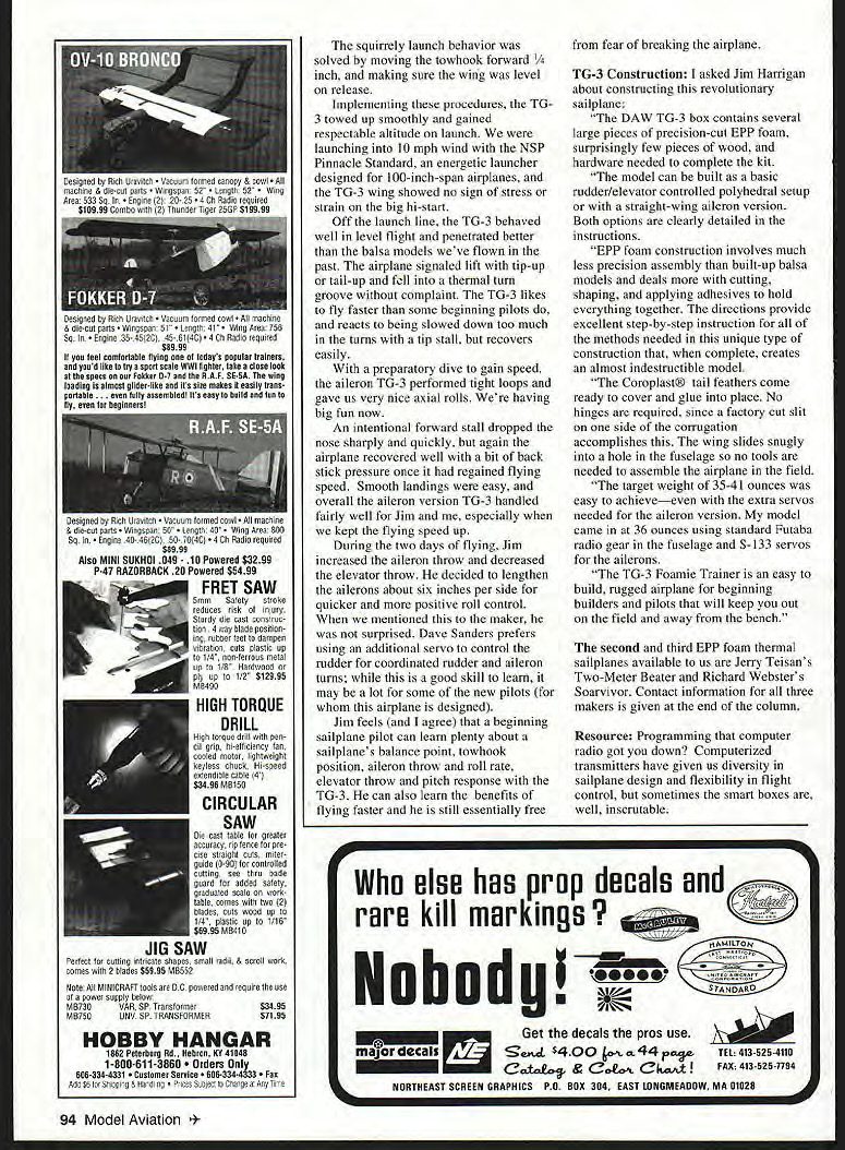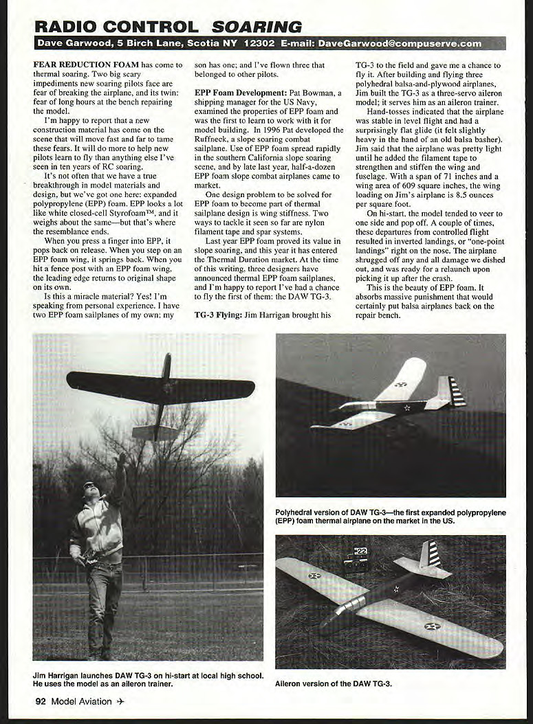 RADIO CONTROL SOARING FEAR REDUCTION FOAM has come thermal soaring Two big scary impediments new soaring pilots face fear breaking airplane its twin fear long hours bench repairing model Im happy report new construction material has come scene will move fast far tame fears will help new pilots learn fly anything else Ive seen ten years RC soaring Its often have true breakthrough model materials design weve got expanded polypropylene EPP foam EPP looks lot like white closed-cell StyrofoamTM weighs about samebut thats resemblance ends press finger EPP pops back release step EPP foam wing springs back hit fence post EPP foam wing leading edge returns original shape its own miracle material Yes Im speaking personal experience have two EPP foam sailplanes own son has Ive flown three belonged other pilots EPP Foam Development Pat Bowman shipping manager US Navy examined properties EPP foam first learn work model building 1996 Pat developed Ruffneck slope soaring combat sailplane Use EPP foam spread rapidly southern California slope soaring scene late last year half-a-dozen EPP foam slope combat airplanes came market design problem solved EPP foam become part thermal sailplane design wing stiffness Two ways tackle seen far nylon filament tape spar systems Last year EPP foam proved its value slope soaring year has entered Thermal Duration market time writing three designers have announced thermal EPP foam sailplanes Im happy report Ive chance fly first DAW TG-3 TG-3 Flying Jim Harrigan brought TG-3 field gave chance fly After building flying three polyhedral balsa-and-plywood airplanes Jim built TG-3 three-servo aileron model serves him aileron trainer Hand-tosses indicated airplane stable level flight surprisingly flat glide felt slightly heavy hand old balsa basher Jim said airplane pretty light until added filament tape strengthen stiffen wing fuselage span 71 inches wing area 609 square inches wing loading Jims airplane 85 ounces per square foot hi-start model tended veer side pop off couple times departures controlled flight resulted inverted landings one-point landings right nose airplane shrugged off damage dished out ready relaunch upon picking up after crash beauty EPP foam absorbs massive punishment would certainly put balsa airplanes back repair bench 92 Model Aviation hedral version DAW TG-3the first expanded polypropylene EPP foam thermal airplane market US Jim Harrigan launches DAW TG-3 hi-start local high school uses model aileron trainer Aileron version DAW TG-3 Aileron version TG-3 action Right Qops one-point landing TG-3 happened twice before got towhook position sorted out No damage 1997 WORLD CHAMPIONSHIP ANKARA TURKEY EDR-1 Servo wcrser 1 Plug pece sve /ate Pie Seve Reveisci Plug Pie Sene Reveise peci WewI Veute dead o No messy o4justments Microprocessor accurate neutral o No Jitter o No Draft Neutral Shifts temperature changes 0 Fuclproof Iibration proof Encapsulated space-age epasy UNITED STATES F3B QtADING TEAM 4 m LIOIuuyrILIludvtLIIvdL4Ju III & die-cut parts span 50 th 40 Area 800 Sq ln Engine 40-462C 50-704C 4 Ch Radin required $8999 Also MINI SUKHOI 049 10 Powered $3299 P-47 RAZORBACK 20 Powered $5499 FRET SAW 5mm Safety stroke reduces risk injury Sturdy die cast cunutruc ties y blade positiun ing rubber tent dampen nibratian cuts plastic up 1/4 nun-terrous metal up 1/0 Hardwosd nr ply up ts 1/2 $129 95 MB490 HIGH TORQUE DRILL High tsrque drill pen cil grip hi-etticiency tan conled motar lightweight keyless shack hi-speed eatendible cable 4 $3499 MAlSO CIRCULAR SAW Die cast table tsr grester accuracy rip tence fur pre cise straight cats miter gaide 0-00 tsr continued cutting thra bade guard tar added satety graduated ucale work table cornea two 2 bladna cata wood ap 1/4 plautic up 1/16 $8995 MB41O Jili AW Perfect tar cutting intricate shapes small radii & scroll work cemes 2 bladna $5995 M8552 Note MINICRAFT teals DC powered reqaire use power supply belaw MB730VAR SE Tranutormer$3495 MB SOUNV SE RANSFORMER$71 95 HOBBY HANGAR 1892 Pete 9 Rd tiebron KY 41948 1 800 611 3860 rs Only 696 334 4331 omer Sum ce 334 4333 Ad$6Sp g&HgESCaqaAm squirrely launch behavior solved moving towhook forward 1/4 inch making sure wing level release Implementing procedures TG 3 towed up smoothly gained respectable altitude launch launching 10 mph wind NSP Pinnacle Standard energetic launcher designed 100-inch-span airplanes TG-3 wing showed no sign stress strain big hi-start Off launch line TG-3 behaved well level flight penetrated better balsa models weve flown past airplane signaled lift tip-up tail-up fell thermal turn groove complaint TG-3 likes fly faster some beginning pilots reacts being slowed down too much turns tip stall recovers easily preparatory dive gain speed aileron TG-3 performed tight loops gave us very nice axial rolls having big fun now An intentional forward stall dropped nose sharply quickly again airplane recovered well bit back stick pressure once regained flying speed Smooth landings easy overall aileron version TG-3 handled fairly well Jim especially kept flying speed up During two days flying Jim increased aileron throw decreased elevator throw decided lengthen ailerons about six inches per side quicker positive roll control mentioned maker surprised Dave Sanders prefers using additional servo control rudder coordinated rudder aileron turns good skill learn may lot some new pilots airplane designed Jim feels agree beginning sailplane pilot can learn plenty about sailplanes balance point towhook position aileron throw roll rate elevator throw pitch response TG-3 can also learn benefits flying faster still essentially free fear breaking airplane TG-3 Construction asked Jim Harrigan about constructing revolutionary sailplane DAW TG-3 box contains several large pieces precision-cut EPP foam surprisingly few pieces wood hardware needed complete kit model can built basic rudder/elevator controlled polyhedral setup straight-wing aileron version Both options clearly detail
