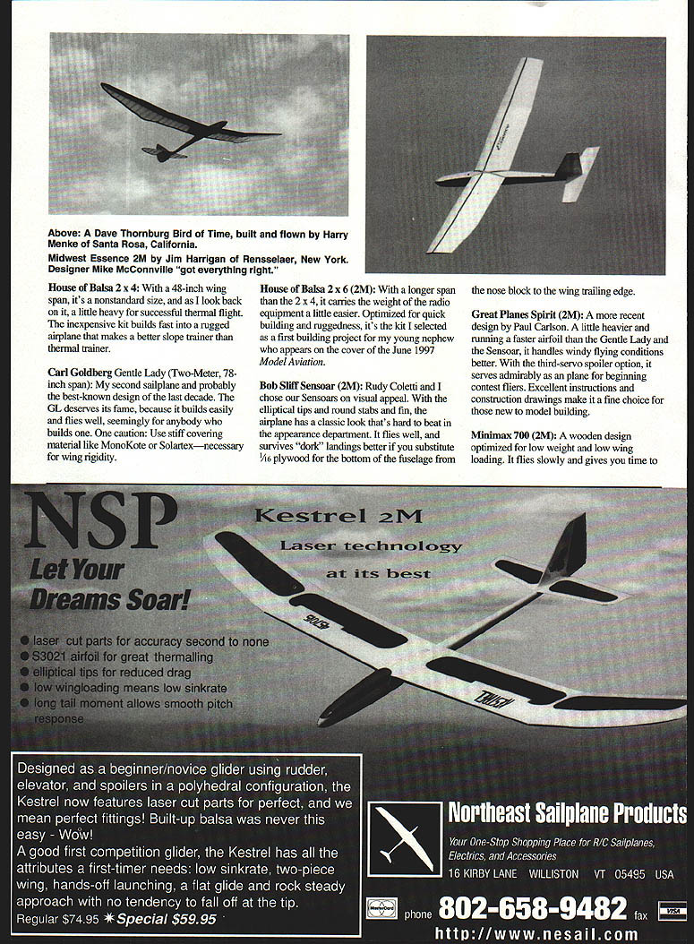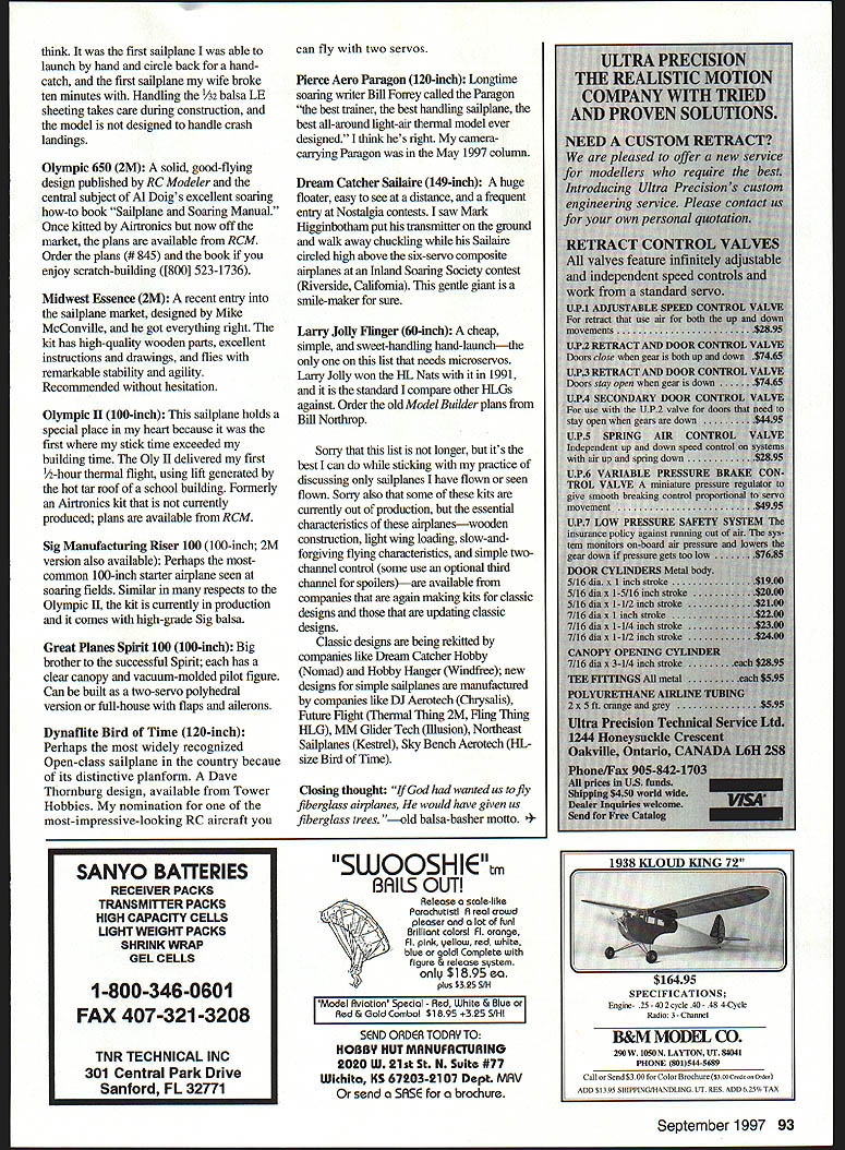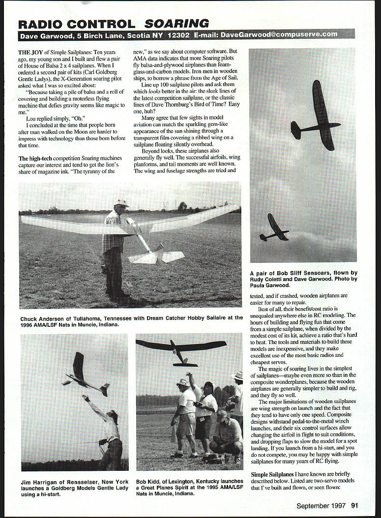 RADIO CONTROL SOARING TIlE JOY Simple Sailpianes Ten years ago young son built flew pair House Balsa 2 x 4 sailpianes ordered second pair kits Carl Goldberg Gentle Ladys X-Generation soaring pilot asked what excited about Because taking pile balsa roll covering building motorless flying machine defies gravity seems like magic Lou replied simply Oh concluded time people born after man walked Moon harder impress technology born before time high-tech competition Soaring machines capture interest tend get lions share magazine ink tyranny new say about computer software AMA data indicates Soaring pilots fly balsa-and-plywood airplanes foamglass-and-carbon models Iron men wooden ships borrow phrase Age Sail Line up 100 sailplane pilots ask looks better air sleek lines latest competition sailplane classic lines Dave Thomburgs Bird Time Easy huh agree few sights model aviation can match sparkling gem-like appearance sun shining through transparent film covering ribbed wing sailplane floating silently overhead Beyond looks airplanes also generally fly well successful airfoils wing planforms tail moments well known wing fuselage strengths tried tested crashed wooden airplanes easier repair Best benefit/cost ratio unequaled anywhere else RC modeling hours building flying fun come simple sailplane divided modest cost its kit achieve ratio thats hard beat tools materials build models inexpensive make excellent use basic radios cheapest servos magic soaring lives simplest sailplanesmaybe composite wonderplanes because wooden airplanes generally simpler build rig fly well major limitations wooden sailplanes wing strength launch fact tend have oaly speed Composite designs withstand pedal-to-the-metal winch launches six control surfaces allow changing airfoil flight suit conditions dropping flaps slow model spot landing launch hi-start compete may happy simple sailplanes years RC flying Simple Sailpianes have known briefly described below Listed two-servo models Ive built flown seen flown September 1997 91 Chuck Anderson Tullahoma Tennessee Dream Catcher Hobby Sailaire 1996 AMAILSF Nats Muncie Indiana pair Bob 511ff Sensoars flown Rudy Coletti Dave Garwood Photo Paula Garwood Jim Harrigan Rensselaer New YorkBob Kidd Lexington Kentucky launches launches Goldberg Models Gentle Ladya Great Planes Spirit 1995 AMAILSF using hi-startNats Muncie Indiana House Balsa 2 x 4 48-inch wing span its nonstandard size look back little heavy successful thermal ffight inexpensive kit builds fast rugged airplane makes better slope trainer thermal trainer Carl Goldberg Gentle Lady Two-Meter 78inch span second sailplane probably best-known design last decade GL deserves its fame because builds easily flies well seemingly anybody builds caution Use stiff covering material like MonoKote Solartexnecessary wing rigidity House Balsa 2 x 6 2M longer span 2 x 4 cames weight radio equipment little easier Optimized quick building ruggedness its kit selected first building project young nephew appears cover June 1997 ModelAviation Bob 511ff Sensoar 2M Rudy Coletti chose Sensoars visual appeal elliptical tips round stabs fin airplane has classic look thats hard beat appearance department flies well survives dork landings better substitute A6 plywood bottom fuselage Great Planes Spirit 2M recent design Paul Carlson little heavier running faster airfoil Gentle Lady Sensoar handles windy flying conditions better third-servo spoiler option serves admirably plane beginning contest fliers Excellent instructions construction drawings make fine choice new model building Minimax 700 2M wooden design optimized low weight low wing loading flies slowly gives time Above Dave Thornburg Bird Time built flown Harry Menke Santa Rosa California Midwest Essence 2M Jim Harrigan Rensselaer New York Designer Mike McConnville got everything right nose block wing trailing edge think first sailplane able launch hand circle back handcatch first sailplane wife broke ten minutes Handling /32 balsa LE sheeting takes care during construction model designed handle crash landings Olympic 650 2M solid good-flying design published RC Modeler central subject Al Doigs excellent soaring how-to book Sailplane Soaring Manual Once kitted Airtronics now off market plans available RCM Order plans #845 book enjoy scratch-building [800] 523-1736 Midwest Essence 2M recent ently sailplane market designed Mike McConville got everything right kit has high-quality wooden parts excellent instructions drawings flies remarkable stability agility Recommended hesitation Olympic II 100-inch sailplane holds special place heart because first stick time exceeded building time Oly II delivered first -hour thermal flight using lift generated hot tar roof school building Formerly Airtronics kit currently produced plans available RCM Sig Manufacturing Riser 100 100-inch 2M version also available Perhaps mostcommon 100-inch starter airplane seen soaring fields Similar respects Olympic II kit currently production comes high-grade Sig balsa Great Planes Spirit 100100-inch Big brother successful Spirit has clear canopy vacuum-molded pilot figure Can built two-servo polyhedral version full-house flaps ailerons Dynaflite Bird Time 120-inch Perhaps widely recognized Open-class sailplane country becaue its distinctive planform Dave Thornburg design available Tower Hobbies nomination most-impressive-looking RC aircraft can fly two servos Pierce Aero Paragon 120-inch Longtime soaring writer Bill Forrey called Paragon best trainer best handling sailplane best all-around light-air thermal model ever designed think hes right cameracarrying Paragon May 1997 column Dream Catcher Sailaire 149-inch huge floater easy see distance frequent ently Nostalgia contests saw Mark Higginbotham put transmitter ground walk away chuckling Sailaire circled high above six-servo composite airplanes Inland Soaring Society contest Riverside California gentle giant smile-maker sure Larry Jolly Flinger 60-inch cheap simple sweet-han