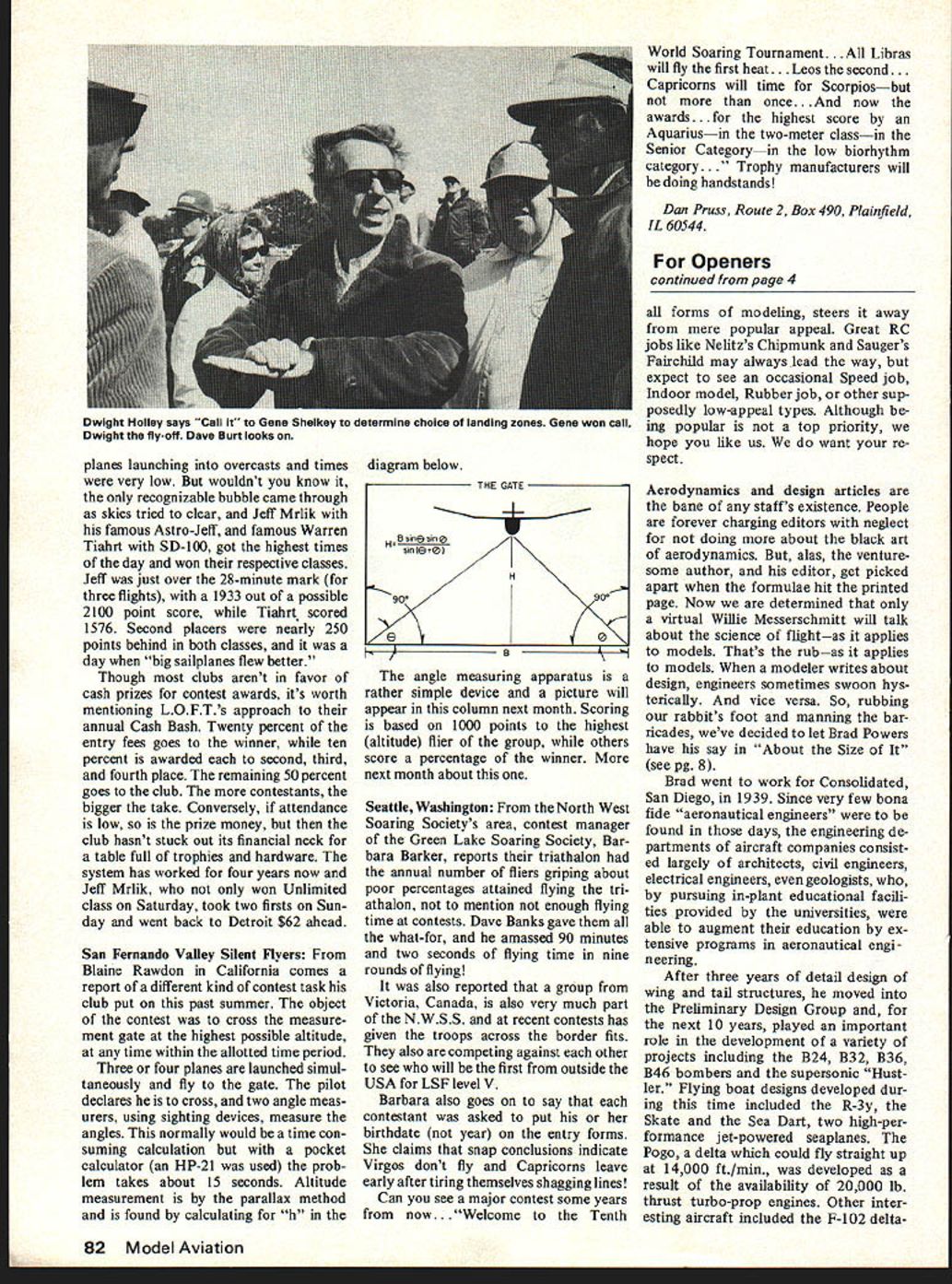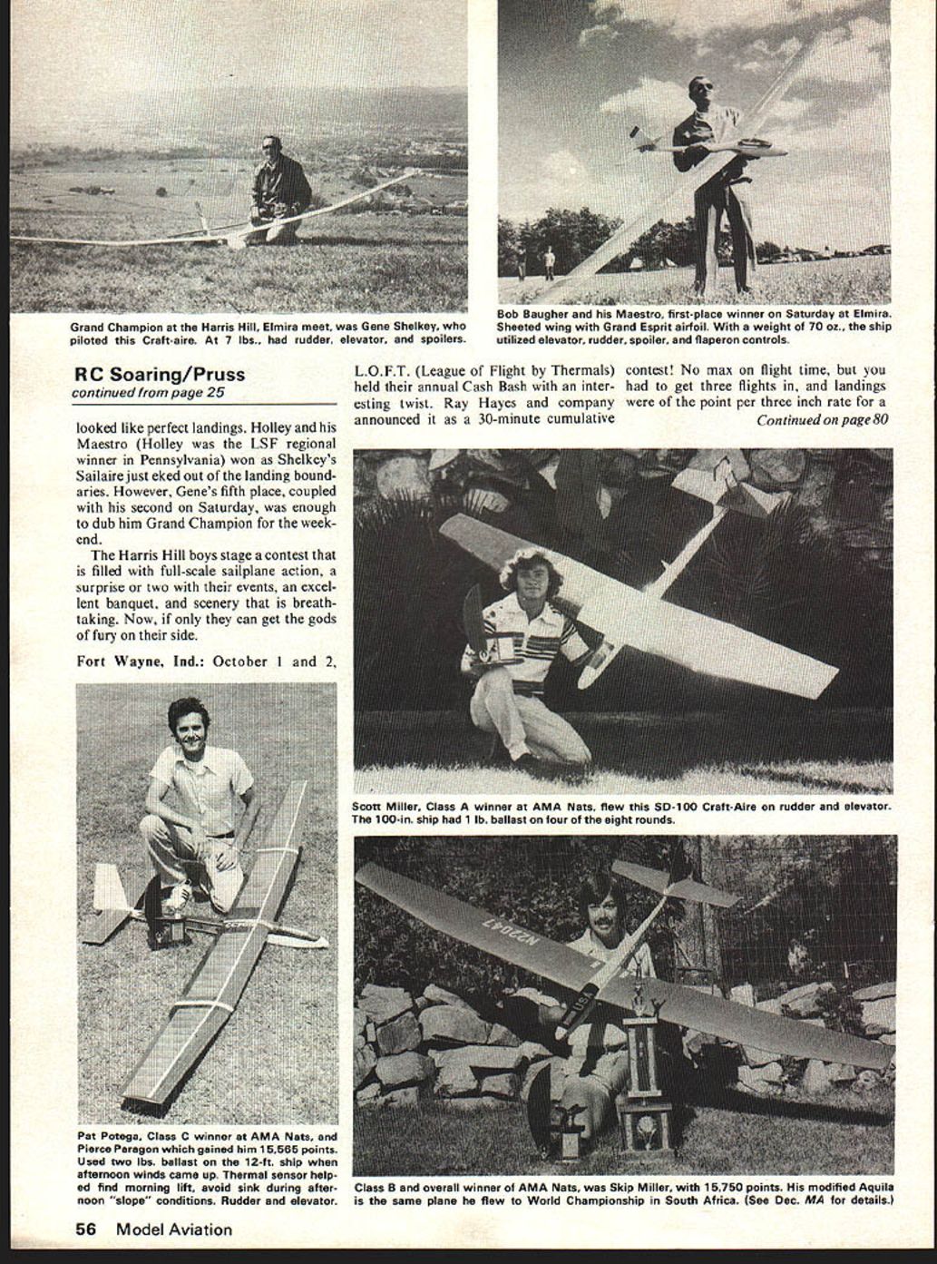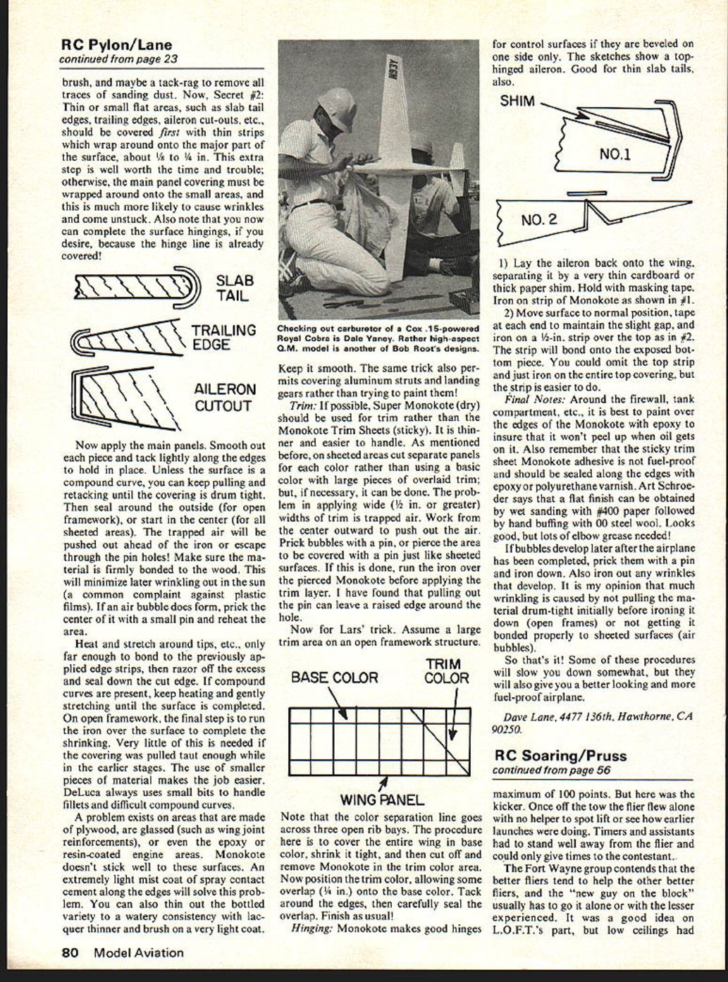 U Soaring LI Dan Pruss ELMIRA NY sixth year Harris Hill Lift/Drag club hosted annual two-day contest Sept 10 & 11 atop historical mound full-scale gliding began nearly two generations ago Harris Hill faces northwest sixth year winds direc tion what thermal event started ended slope conditions Only year slightly different Early Saturday morning winds opposite direction briefing time weak cold front came through part program winds shifted contest director Dave Lear labeled slope event spot landing led nearly 100 fliers edge hill pointed valley below said Boys try fill up Rules simple point per second earned thermal contest Seven minutes task landing zone strip 25 feet 10 bonus 50 points earned plane came rest no portion fuselage out boundaries HHL/D gents have made several attempts over years encour age scale-like approaches landings years efforts direc tion However felt slightly less perfect placement model worth something between zero 50 because strong winds grass did enter model came rest during last second two Bob Baugher past editor Sailplane has taking contest circuit seriously past summer several wins second LSF regional tournament Pennsylvania end Saturday Bob flown modified Maestro top spot followed Gene Shelkey Sailaire Third Don Thermal Sniffler Clark much flown well proven Kurwi Saturday night banquetas pasttrophies presented days winners highlight cere mony presenting RC Soarings prestigious awardthe Steuben Eagle Walt Good honored year treasure until next year pity people dont get see sports manship award just trophy Crafted artists Steuben Glass kind piece doesnt have dollar value will presented six times will retired Schweizer Aircraft Company will put permanent display Its HHL/Ds contributions sport RC Soaring fine gesture Back hill Sunday conditions no different Saturday second straight day no winch solenoids energized tasks same HO gauge runway few fliers uttering words phrases found Frank Zaics Yearbooks Dick Beltz almost giant killer day two-meter ship original design slew Goliaths Unlimited Standard classes proved just might place twometer ships Dick placed third Wizard 72-in ship 560 sq Jr-Sr Bob Curry took top honors Aquila followed Ed Keck Fourth Fifth determined flyoff between Dwight Holley Gene Shel key Both fliers time second both groove what Continued page S6 January1978 25 Atop Harris Hill overlooking Chemung Valley New York State flight line tfl Annual Harris Hill LID contest included entrants far Colorado Florida heavy input East coast popular soaring meet attracted nearly 100 contestants Dick Beltz two-meter Wizard origi nal design fought bigger ships tooth nail 72-in wing 560 squares 32 os Somebody noticed Steuben EagleSoarings prestigious awardwas given Walt Good say morel Grand Champion Harris Hill Elmira meet Gene Shelkey piloted Craft-aire 7 lbs. rudder elevator spoilers RC Soaring/Pruss continued page 25 looked like perfect landings Holley Maestro Holley LSF regional winner Pennsylvania won Shelkeys Sailaire just eked out landing bound aries However Genes fifth place coupled second Saturday enough dub him Grand Champion week end Harris Hill boys stage contest filled full-scale sailplane action surprise two events excel lent banquet scenery breath taking Now can get gods fury side Fort Wayne md October 1 2 auu eugner ano Ills IvIeesIro ursi-plece wiiirier Oil diUUUY dl Sheeted wing Grand Esprit airfoil weight 70 oz. tne ship utilized elevator rudder spoiler flaperon controls LOFT League Flight Thermals held annual Cash Bash inter esting twist Ray Hayes company announced 30-minute cumulative contest No max flight time get three flights landings point per three inch rate Continued page 80 56 Model Aviation Scott Miller Class winner AMA Nats flew SD-i 00 Craft-Aire rudder elevator 100-in ship 1 lb ballast four eight rounds Pat Potega Class C winner AMA Nets Pierce Paragon gained him 15565 points Used two lbs ballast 12-ft ship afternoon winds came up Thermal sensor help ed find morning lift avoid sink during after noon slope conditions Rudder elevator Class B overall winner AMA Nats Skip Miller 5750 points modified Aquila same plane flew World Championship South Africa See Dec MA details RC Pylon/Lane continued page 23 brush maybe tack-rag remove traces sanding dust Now Secret #2 Thin small flat areas such slab tail edges trailing edges aileron cut-outs etc should covered first thin strips wrap around onto major part surface about ra step well worth time trouble otherwise main panel covering must wrapped around onto small areas much likely cause wrinkles come unstuck Also note now can complete surface hingings desire because hinge line already covered \L LING EDGE AILERON CUTOUT Now apply main panels Smooth out piece tack lightly along edges hold place Unless surface compound curve can keep pulling retacking until covering drum tight seal around outside open framework start center sheeted areas trapped air will pushed out ahead iron escape through pin holes Make sure ma terial firmly bonded wood will minimize later wrinkling out sun common complaint against plastic films air bubble does form prick center small pin reheat area Heat stretch around tips etc far enough bond previously ap plied edge strips razor off excess seal down cut edge compound curves present keep heating gently stretching until surface completed open framework final step run iron over surface complete shrinking Very little needed covering pulled taut enough earlier stages use smaller pieces material makes job easier DeLuca always uses small bits handle fillets difficult compound curves problem exists areas made plywood glassed such wing joint reinforcements epoxy resin-coated engine areas Monokote doesnt stick well surfaces An extremely light mist coat spray contact cement along edges will solve prob lem can also thin out bottled variety watery consistency lac quer thinner brush very light coat Keep smooth same trick also per mits covering aluminum struts landing gears rather trying pai