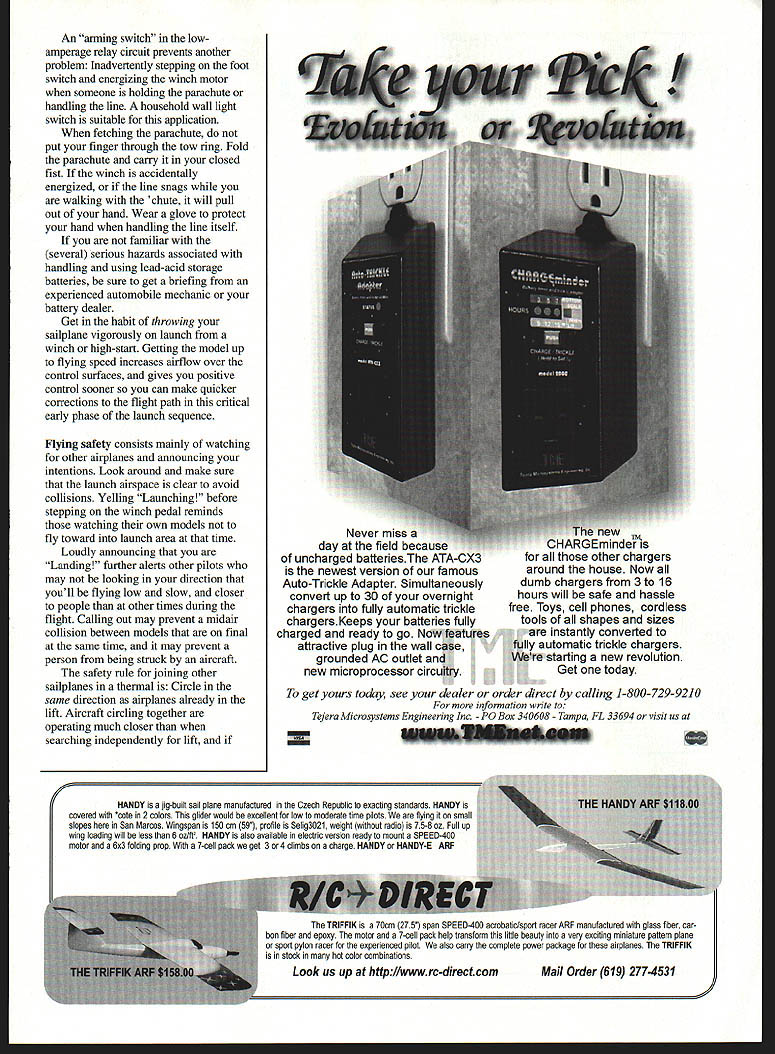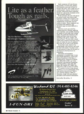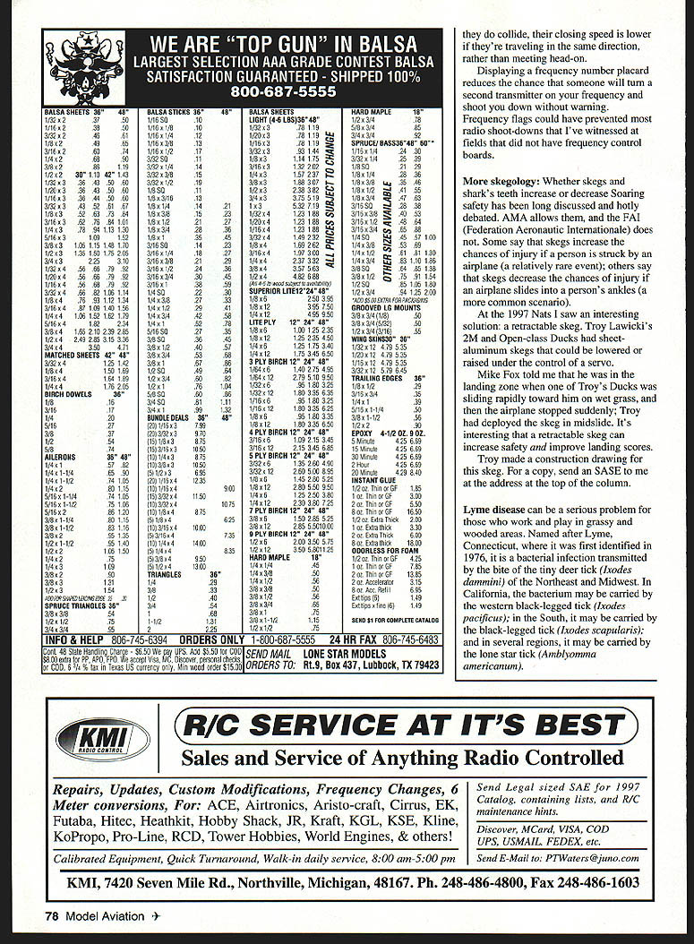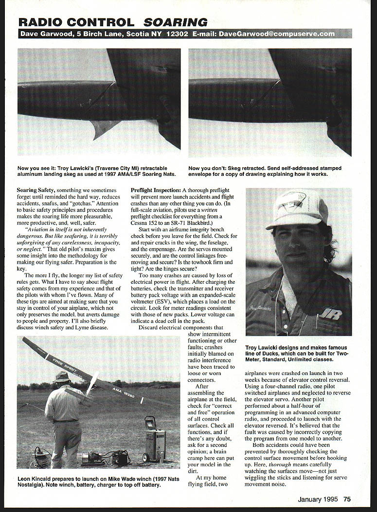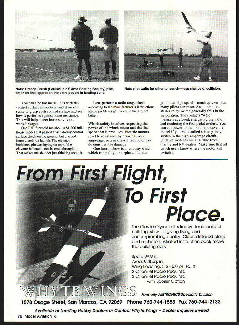RADIO CONTROL SOARING U DJkYfMCF1 'gyi.-u 11 JI U W1 b iIYm IE PII4~ 'LiB Soaring Safety something sometimes forget until reminded hard way reduces accidents snafus gotchas Attention basic safety principles procedures makes soaring life pleasurable productive well safer Aviation itself inherently dangerous like seafaring terribly unforgiving carelessness incapacity neglect old pilots maxim gives some insight methodology making flying safer Preparation key fly longer list safety rules gets What have say about flight safety comes experience pilots Ive flown tips aimed making sure stay control airplane preserves model averts damage people property Ill also briefly discuss winch safety Lyme disease Preflight Inspection thorough preflight will prevent launch accidents flight crashes other thing can full-scale aviation pilots use written preflight checklist everything Cessna 152 SR-71 Blackbird Start airframe integrity bench check before leave field Check repair cracks wing fuselage empennage Are servos mounted securely control linkages freemoving secure towhook firm tight Are hinges secure Too crashes caused loss electrical power flight After charging batteries check transmitter receiver battery pack voltage expanded-scale voltmeter ESV places load circuit Look meter readings consistent new packs Lower voltage can indicate dead cell pack Discard electrical components show intermittent functioning other faults crashes initially blamed radio interference have traced loose worn connectors After assembling airplane field check correct free operation control surfaces Check functions s doubt ask second opinion brain cramp can put model dirt home flying field two airplanes crashed launch two weeks because elevator control reversal Using four-channel radio pilot switched airplanes neglected reverse elevator servo Another pilot performed about half-hour programming advanced computer radio proceeded launch elevator reversed Its believed fault caused incorrectly copying program model another Both accidents could have prevented thoroughly checking control surface movement before hooking up thorough means carefully watching surfaces movenot just wiggling sticks listening servo movement noise January1995 75 Now see Troy Lawickis Traverse City MI retractableNow dont Skeg retracted Send self-addressed stamped aluminum landing skeg used 1997 AMAILSF Soaring Natsenvelope copy drawing explaining works Troy Lawicki designs makes famous line Ducks can built TwoMeter Standard Unlimited classes Leon Kincaid prepares launch Mike Wade winch 1997 Nats Nostalgia Note winch battery charger top off battery cant too meticulous control surface inspection makes sense grasp control surface see performs against some resistance will help detect loose servos weak linkages F3B flier told about $1000 fullhouse model passed visual-only control surface check ground crashed immediately launch elevator incidence pin laying top elevator bellcrank inserted through makes shudder just thinking about Last perform radio range check according manufacturers instructions Radio problems get worse air better Winch safety involves respecting power winch motor line speed produces Electric motors react resistance drawing amperage nearly-stalled motor can considerable damage horror show runaway winch can pull airplane ground high speedmuch quicker pilots can react An automotive starter relay switch generally fails position contacts weld themselves closed energizing motor rendering foot pedal useless can cut power motor save model youve installed heavy-duty switch high-amperage circuit Suitable switches available marine RV dealers Make sure winch users know motor kill switch gh t Firs t Place Classic Olympic II known its ease building slow forgiving flying uncompromising quality Clear detailed plans photo illustrated instruction book make building easy Span 999 Area 928 sq Wing Loading 55 60 oz sq ft 2 Channel Radio Required 3 Channel Radio Required Spoiler Option Formerly AIRTRONICS Specialty Division Phone 760-744-1553 Fax 760-744-2133 76 Model Aviation 4Nats Orange Crush Louisville KY Area Soaring Society pilot Nats pilot waits other launchless chance collision timer final approach No extra people landing zone Available Leading Hobby Dealers Contact Whyte Wings er Inquiries Invited An arming switch lowamperage relay circuit prevents another problem Inadvertently stepping foot switch energizing winch motor someone holding parachute handling line household wall light switch suitable application fetching parachute put finger through tow ring Fold parachute carry closed fist winch accidentally energized line snags walking chute will pull out hand Wear glove protect hand handling line itself familiar several serious hazards associated handling using lead-acid storage batteries sure get briefing experienced automobile mechanic battery dealer Get habit throwing sailplane vigorously launch winch high-stan Getting model up flying speed increases airflow over control surfaces gives positive control sooner can make quicker corrections flight path critical early phase launch sequence Flying safety consists mainly watching other airplanes announcing intentions Look around make sure launch airspace clear avoid collisions Yelling Launching before stepping winch pedal reminds watching own models fly toward launch area time Loudly announcing Landing further alerts other pilots may looking direction 11 flying low slow closer people other times during flight Calling out may prevent midair collision between models final same time may prevent person being struck aircraft safety rule joining other sailplanes thermal Circle same direction airplanes already lift Aircraft circling together operating much closer searching independently lift Never miss day field uncharged batteriesThe ATAr newest version famous Auto-Trickle Adapter Simultaneously convert up 30 overnight chargers fully automatic trickle chargers Keeps batteries fully charged ready go Now fpatures attractive