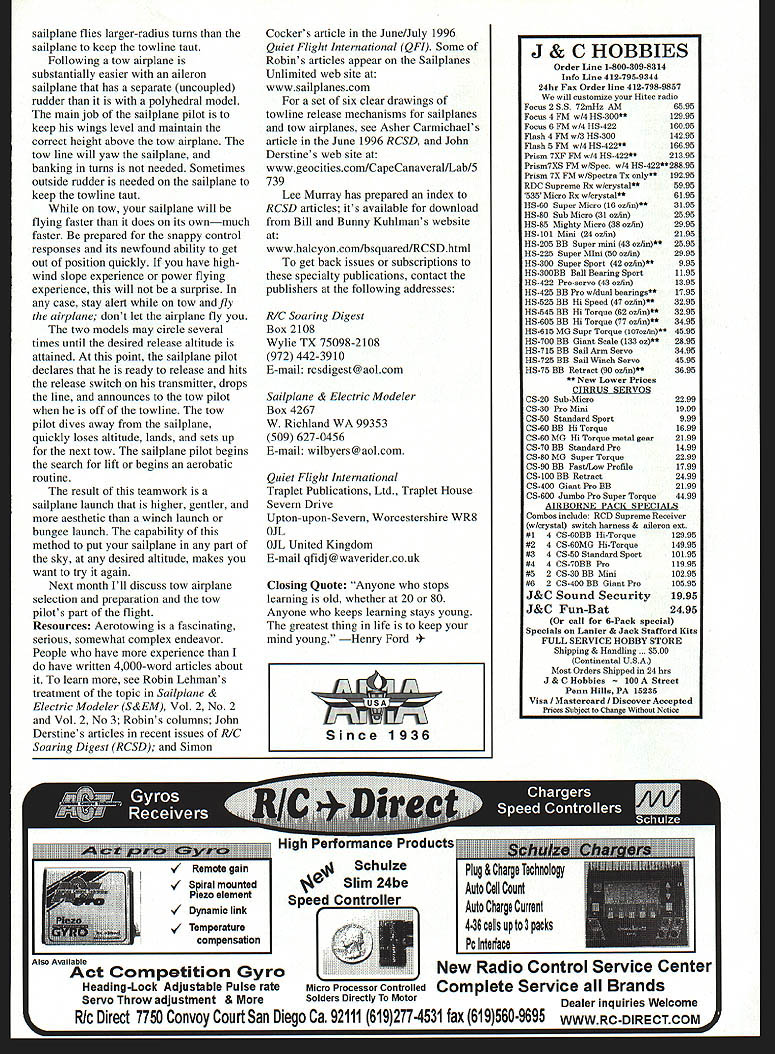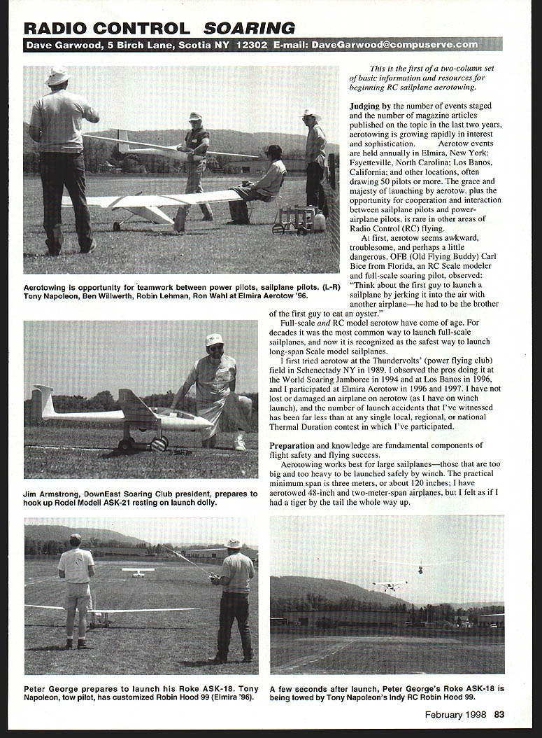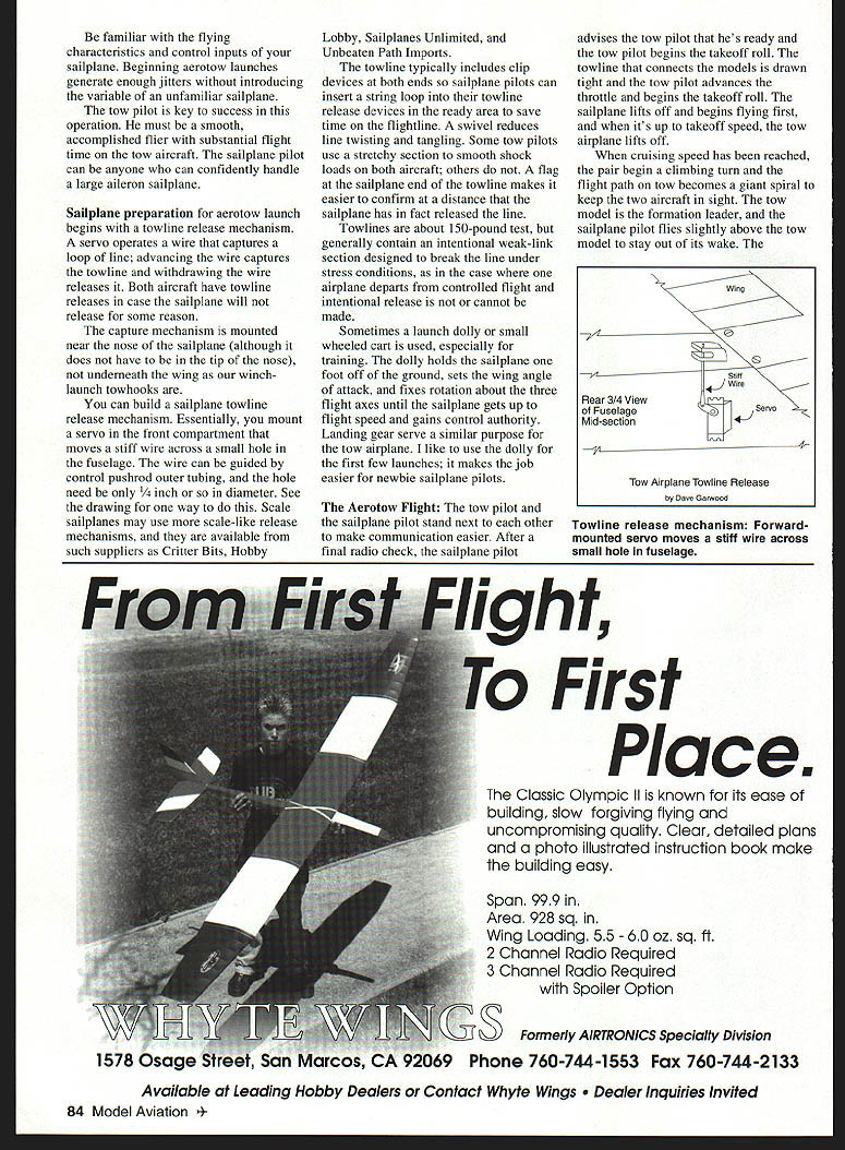 RADIO CONTROL SOARING Ieg.0 P ## first two-column set basic information resources beginning RC sailplane aerotowing Judging number events staged number magazine articles published topic last two years aerotowing growing rapidly interest sophistication Aerotow events held annually Elmira New York Fayetteville North Carolina Los Banos California other locations often drawing 50 pilots grace majesty launching aerotow plus opportunity cooperation interaction between sailplane pilots powerairplane pilots rare other areas Radio Control RC flying first aerotow seems awkward troublesome perhaps little dangerous OFB Old Flying Buddy Carl Bice Florida RC Scale modeler full-scale soaring pilot observed Think about first guy launch sailplane jerking air another airplanehe brother first guy eat oyster Full-scale RC model aerotow have come age decades common way launch full-scale sailplanes now recognized safest way launch long-span Scale model sailplanes first tried aerotow Thundervolts power flying club field Schenectady NY 1989 observed pros doing World Soaring Jamboree 1994 Los Banos 1996 participated Elmira Aerotow 1996 1997 have lost damaged airplane aerotow have winch launch number launch accidents Ive witnessed has far less single local regional national Thermal Duration contest Ive participated Preparation knowledge fundamental components flight safety flying success Aerotowing works best large sailplanesthose too big too heavy launched safely winch practical minimum span three meters about 120 inches have aerotowed 48-inch two-meter-span airplanes felt tiger tail whole way up February 1998 83 Aerotowing opportunity teamwork between power pilots sailplane pilots L-R Tony Napoleon Ben Willwerth Robin Lehman Ron Wahi Elmira Aerotow 96 Jim Armstrong DownEast Soaring Club president prepares hook up Rodel Modell ASK-21 resting launch dolly Peter George prepares launch Roke ASK-i 8 Tony few seconds after launch Peter Georges Roke ASK-18 Napoleon tow pilot has customized Robin Hood 99 Elmira 96 being towed Tony Napoleons Indy RO Robin Hood 99 familiar flying characteristics control inputs sailplane Beginning aerotow launches generate enough jitters introducing variable unfamiliar sailplane tow pilot key success operation must smooth accomplished flier substantial flight time tow aircraft sailplane pilot can anyone can confidently handle large aileron sailplane Sailplane preparation aerotow launch begins towline release mechanism servo operates wire captures loop line advancing wire captures towline withdrawing wire releases Both aircraft have towline releases case sailplane will release some reason capture mechanism mounted near nose sailplane although does have tip nose underneath wing winchlaunch towhooks can build sailplane towline release mechanism Essentially mount servo front compartment moves stiff wire across small hole fuselage wire can guided control pushrod outer tubing hole need 1/4 inch diameter See drawing way Scale sailplanes may use scale-like release mechanisms available such suppliers Critter Bits Hobby Lobby Sailplanes Unlimited Unbeaten Path Imports towline typically includes clip devices both ends sailplane pilots can insert string loop towline release devices ready area save time flightline swivel reduces line twisting tangling Some tow pilots use stretchy section smooth shock loads both aircraft others flag sailplane end towline makes easier confirm distance sailplane has fact released line Towlines about 150-pound test generally contain intentional weak-link section designed break line under stress conditions case airplane departs controlled flight intentional release cannot made Sometimes launch dolly small wheeled cart used especially training dolly holds sailplane foot off ground sets wing angle attack fixes rotation about three flight axes until sailplane gets up flight speed gains control authority Landing gear serve similar purpose tow airplane like use dolly first few launches makes job easier newbie sailplane pilots Aerotow Flight tow pilot sailplane pilot stand next other make communication easier After final radio check sailplane pilot advises tow pilot hes ready tow pilot begins takeoff roll towline connects models drawn tight tow pilot advances throttle begins takeoff roll sailplane lifts off begins flying first its up takeoff speed tow airplane lifts off cruising speed has reached pair begin climbing turn flight path tow becomes giant spiral keep two aircraft sight tow model formation leader sailplane pilot flies slightly above tow model stay out its wake Towine release mechanism Forwardmounted servo moves stiff wire across small hole fuselage ht Firs t Place Classic Olympic Ills known its ease building slow forgiving flying uncompromising quality Clear detailed plans photo illustrated instruction book make building easy Span 999 Area 928 sq Wing Loading 55 60 oz sq ft 2 Channel Radio Required 3 Channel Radio Required Spoiler Option Formerly AIRTRONICS Specialty Division Phone 760-744-1553 Fax 760-744-2133 84 Model Aviation * Wing 0 Stiff 4J Wire Rear 3/4 View FuselageServo Mid-section lr Tow Airplane Towline Release Dave Garwood Available Leading Hobby Dealers Contact Whyte Wings er Inquiries Invited sailplane flies larger-radius turns sailplane keep towline taut Following tow airplane substantially easier aileron sailplane has separate uncoupled rudder polyhedral model main job sailplane pilot keep wings level maintain correct height above tow airplane tow line will yaw sailplane banking turns needed Sometimes outside rudder needed sailplane keep towline taut tow sailplane will flying faster does its ownmuch faster prepared snappy control responses its newfound ability get out position quickly have highwind slope experience power flying experience will surprise case stay alert tow fly airplane dont let airplane fly two models may circle several times until desired release altitude attained point sailplane pilot declares ready release hits release switch transmi
