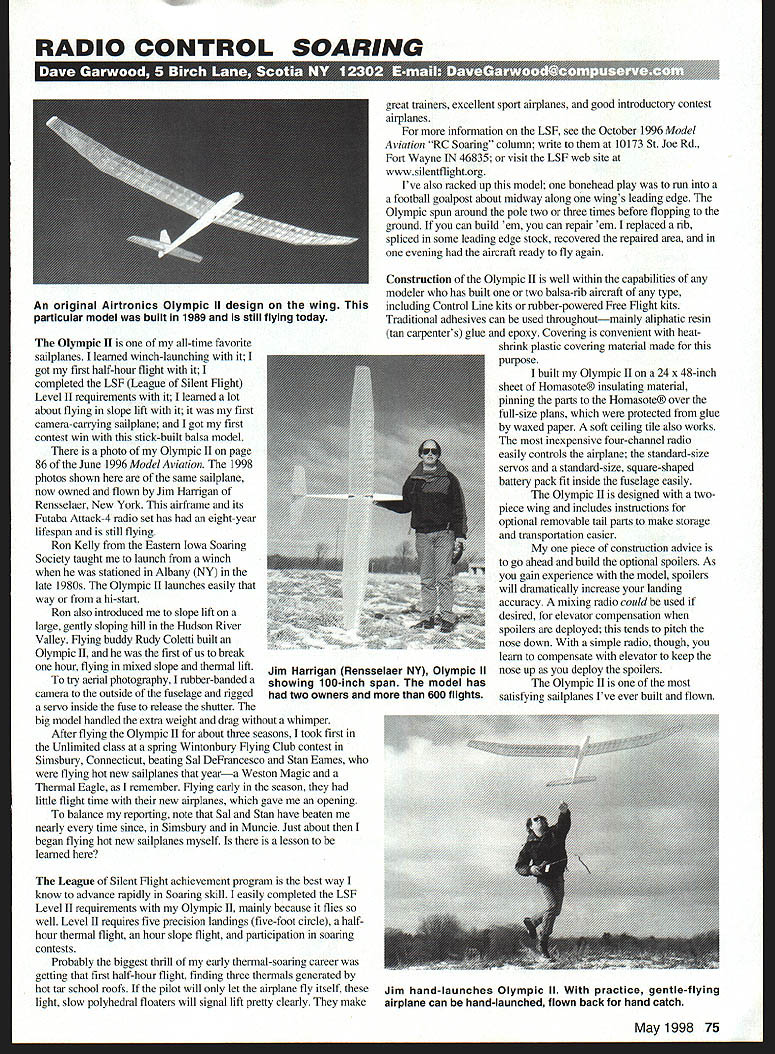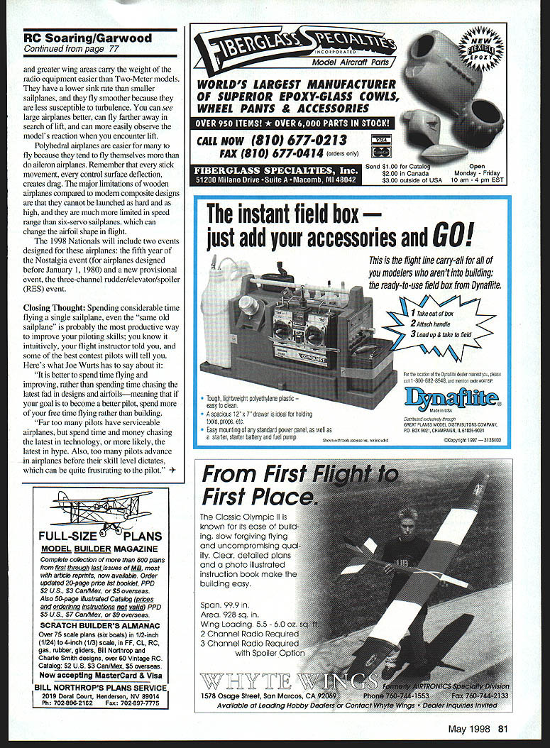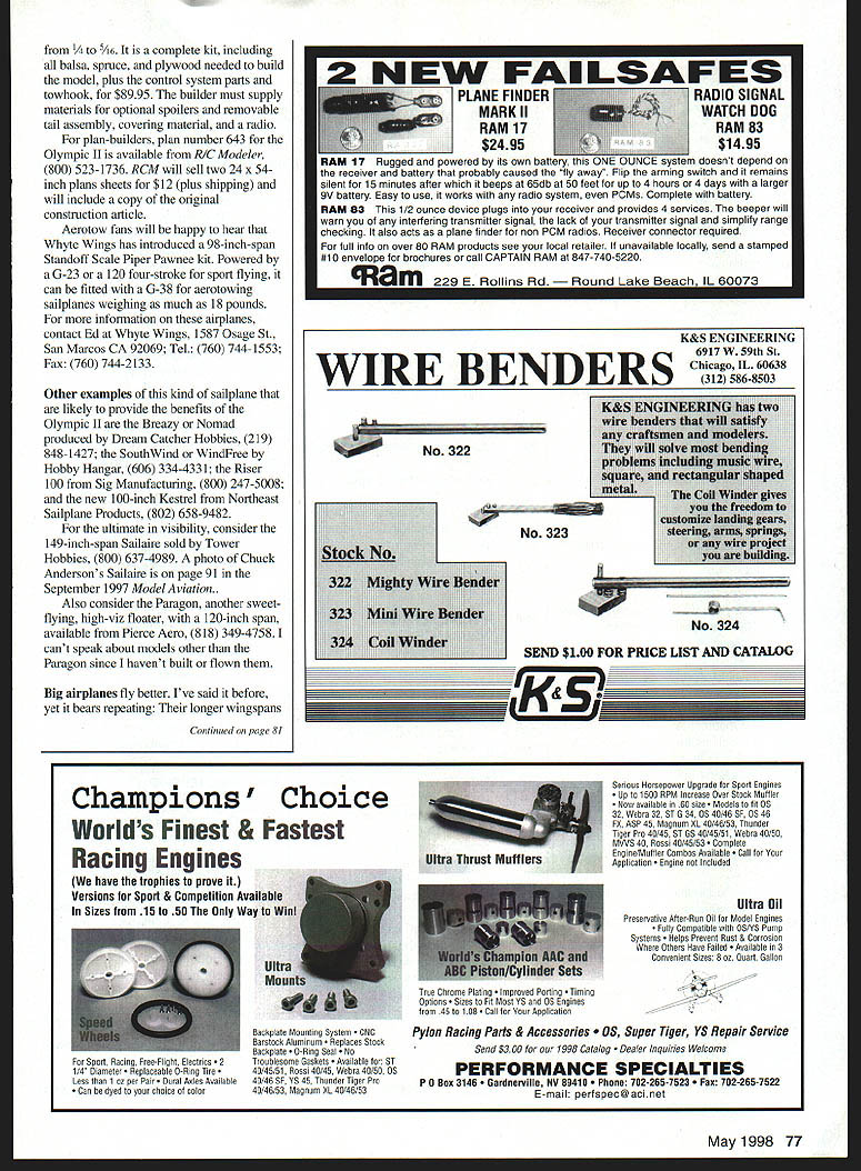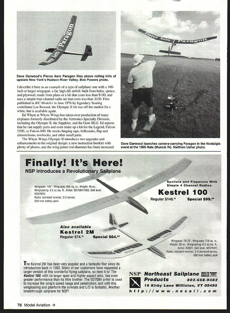 RADIO CONTROL SOARING Olympic II all-time favorite sailpianes learned winch-launching got first half-hour flight completed LSF League Silent Flight Level II requirements learned lot about flying slope lift it first camera-canying sailplane got first contest win stick-built balsa model photo Olympic II page 86 June 1996 Model Aviation 1998 photos shown same sailplane now owned flown Jim Harrigan Rensselaer New York airframe its Futaba Attack-4 radio set has eight-year lifespan still flying Ron Kelly Eastern Iowa Soaring Society taught launch winch stationed Albany NY late 1980s Olympic II launches easily way hi-start Ron also introduced slope lift large gently sloping hill Hudson River Valley Hying buddy Rudy Coletti built Olympic II first us break hour flying mixed slope thermal lift Tony aerial photography rubber-banded camera outside fuselage rigged servo inside fuse release shutter big model handled extra weight drag whimper After flying Olympic II about three seasons took first Unlimited class spring Wintonbury Flying Club contest Simsbury Connecticut beating Sal DeFrancesco Stan Eames flying hot new sailplanes yeara Weston Magic Thermal Eagle remember Flying early season little flight time new airplanes gave opening balance reporting note Sal Stan have beaten nearly time since Simsbury Muncie Just about began flying hot new sailplanes myself lesson learned League Silent Flight achievement program best way know advance rapidly Soaring skill easily completed LSF Level II requirements Olympic II mainly because flies well Level 11 requires five precision landings five-foot circle halfhour thermal flight hour slope flight participation soaring contests Probably biggest thrill early thermal-soaring career getting first half-hour flight finding three thermals generated hot tar school roofs pilot will let airplane fly itself light slow polyhedral floaters will signal lift pretty clearly make great trainers excellent sport airplanes good introductory contest airplanes information LSF see October 1996 Model Aviation RC Soaring column write 10173 St Joe Rd Fort Wayne IN 46835 visit LSF web site wwwsilentflightorg Ive also racked up model bonehead play run a football goalpost about midway along wings leading edge Olympic spun around pole two three times before flopping ground can build em can repair em replaced rib spliced some leading edge stock recovered repaired area evening aircraft ready fly again Construction Olympic II well within capabilities modeler has built two balsa-rib aircraft type including Control Line kits rubber-powered Free Flight kits Traditional adhesives can used throughoutmainly aliphatic resin tan carpenters glue epoxy Covering convenient heatshrink plastic covering material made purpose built Olympic II 24 x 48-inch sheet Homasote insulating material pinning parts Homasote over full-size plans protected glue waxed paper soft ceiling tile also works inexpensive four-channel radio easily controls airplane standard-size servos standard-size square-shaped battery pack fit inside fuselage easily Olympic II designed twopiece wing includes instructions optional removable tail parts make storage transportation easier piece construction advice go ahead build optional spoilers As gain experience model spoilers will dramatically increase landing accuracy mixing radio could used desired elevator compensation spoilers deployed tends pitch nose down simple radio though learn compensate elevator keep nose up deploy spoilers Olympic II satisfying sailplanes Ive ever built flown May1998 75 An original Airtronics Olympic II design wing particular model built 1989 still flying today Jim Harrigan Rensselaer NY Olympic II showing 100-inch span model has two owners 600 flights Jim hand-launches Olympic II practice gentle-flying airplane can hand-launched flown back hand catch describe example type sailplane 100inch larger wingspan fat high-lift airfoil built balsa spruce plywood made plans kit costs less $100 uses simple four-channel radio set costs less $150 First published RIC Modeler June 1976 legendary Soaring contributor Lee Renaud Olympic II kit off market available again Ed Whyte Whyte Wings has taken over production airplanes formerly distributed Airtronics Specialty Division including Olympic II Sapphire Gem HLG Ed reports can supply parts make up kit Legend Falcon 550E Falcon 600 stocks hinging tape bellcranks flap aileron horns towhooks other small parts Whyte Wings Olympic II introduces two upgrades enhancements original design new instruction booklet plenty photos wing joiner rod diameter has increased Finall NSP Introduc Kestrel 2M has very popular fantastic flier since its introduction back 1993 customers have requested larger version wonderful flying sailplane Kestrel 100 its larger span higher aspect ratio has greater performance its little brother S07084 airfoil used increase wings speed range penetration wingloading planform sinkrate L/D fantastic Another breakthrough sailplane NSP 76 Model Aviation 4Dave Garwoods Pierce Aero Paragon flies above rolling hills upstate New Yorks Hudson River Valley Bob Powers photo Dave Garwood launches camera-carrying Paragon Nostalgia event 1996 Nats Muncie IN Matthew Usher photo wingspan ioo win n iq weight 46 oz wingloading 65 oz/sp tt Airfoil S07084/7080 Skill level Nov/Nov Radio standard receiver 2-3 servos 550 mat battery pack Also available Kestrel 2M Regular $74Special $64 NSP Northeast Sailplane Products 80216 Kirby Lane h t tp u/lw w w i lcom complete kit including balsa spruce plywood needed build model plus control system parts towhook $8995 builder must supply materials optional spoilers removable tail assembly covering material radio plan-builders plan number 643 Olympic II available RIC Modeler 800 523-1736 RCM will sell two 24 x 54inch plans sheets $12 plus shipping will include copy original construction article Aerotow fans will happy hear Whyte Wings has introduced 98-inch-span Standoff Scale Piper Pawnee kit Powered G-23
