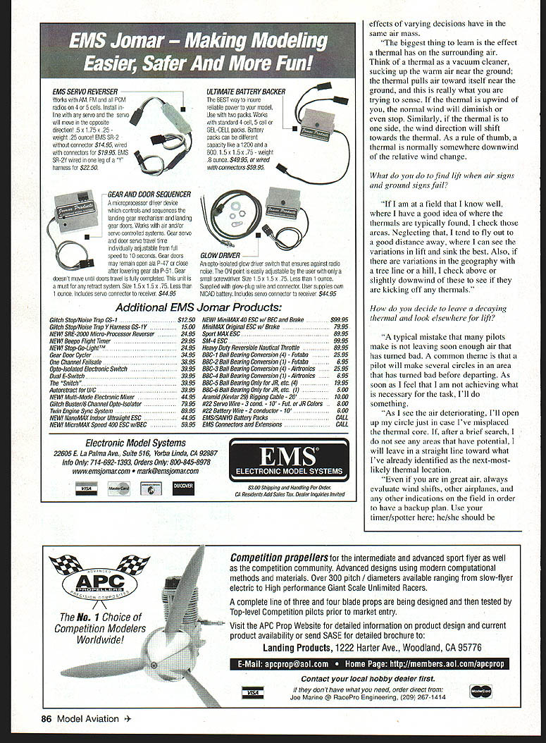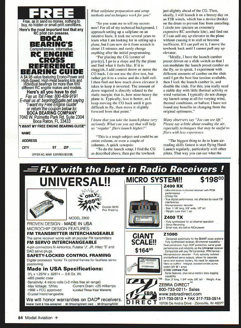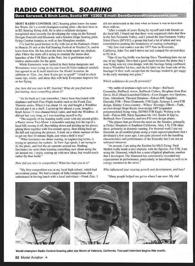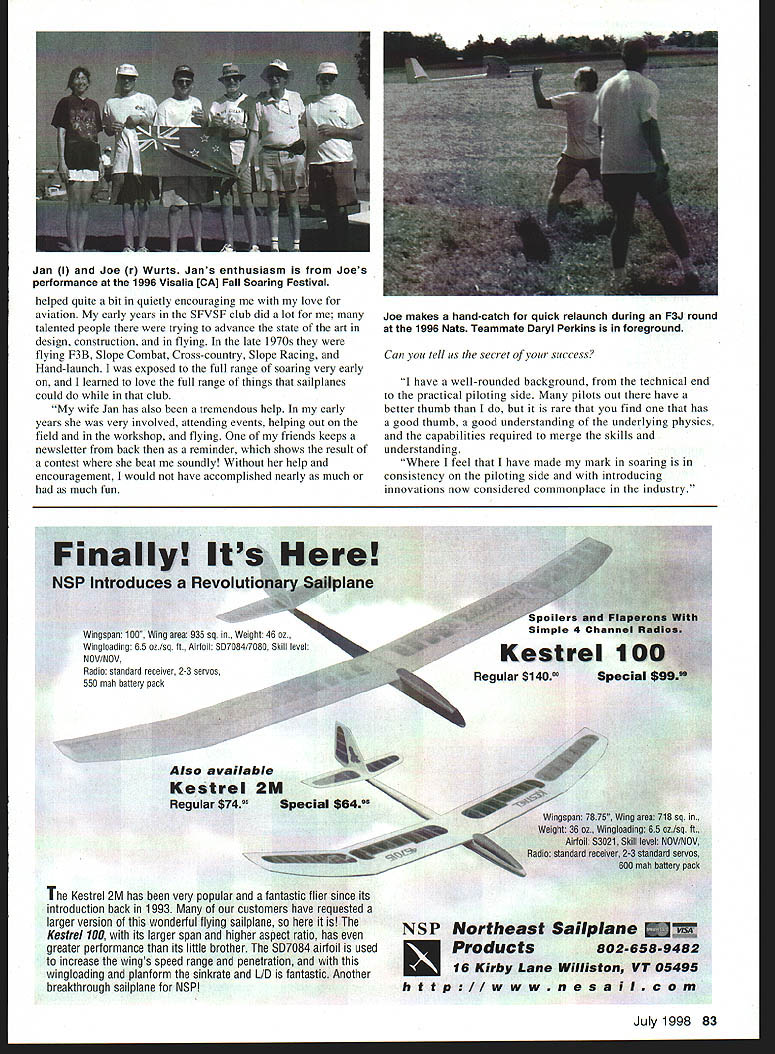RADIO CONTROL SOARING MOST RADIO CONTROL RC Soaring pilots know name Joe Wurts Hes world champion soaring pilotthe best RC Soaring flying skill also sailplane designer recognized recently developing wing Renaud Designs Emerald Diamond hotshot Slope Soaring pilot flying Combat foamies well fast fiberglass models Ive good fortune fly Joe Nationals Nats Muncie IN Fall Soaring Festival Visalia CA learn him has taken time help repair airplane after blew stabs off trying emulate moon-shot launches F3B fliers Nats Joe gentleman tireless ambassador sport Easterners locked balsa dungeons Westerners trying dry out El Nifio-induced rainfall Joe agreed E-mail interview Model Aviation addition Gee Joe howd get good tried elicit some tips tricks ideas will help Everyman improve flying Joe did start RC Soaring What find fascinating compelling about As far back can remember have fascinated airplanes built Free Flight models such Frank Zaic Thermic series about 14 dad bought Windfree kit put shelf saved up almost year bought Kraft Series 71 two-channel brick radio built Windfree did last very long teaching myself fly majority learning really came second glider Pierce Arrow Two-Meter remember carrying top local hill tossing off hiking down picking up pieces gluing together five-minute epoxy hiking back up hill repeating process took whole summer get first 10-minute flight what thrill What fascinates about soaring engineering terms trying optimize system New Age speak am trying plane feel air currents around Nothing fascinates learning something new about using air around enjoy coming up new ideas would much rather fly build did start competition What has kept first competition local high school aviation group couple little competitions culminated having lunch local individualFrank Zaic did understand time what honor have him us After couple years flying myself friends local hilt found out organized clubs flew San Fernando Valley joined San Fernando Valley Silent Flyers [SFVSF] group lot talent committed pushing boundaries soaring technology first real contest 1977 Nats Riverside California John Yee drove out camped several days fly big thrills having Dave Thornburg time flights Dave good laugh because plane flying own design fuselage being cardboard Windrifter kit box kit label front side fuselage flew well except fuselage tended get soggy early morning wet grass Which sailpianes fly presently stable airplanes right now SlopeRuffneck Comanche Ruffneck Arrow Ruffneck Cutlass Boxplane Ron Davis HLG [Hand-Launched Glider]Corn Dogger two Epsilons Gem Aftershock Thermal DurationFalcon 880 Sapphire Emerald F3BThree Diamonds F3B Eagle Synergy 5 own F3B design Skinny Cross-countryWileys Revenge OthersTank own-design Slope Racer own-design EPP [expanded polypropylene] flying wing 5D7003 F3B Eagle Waiting builtFalcon 600 Silent Squadron 163 Studio B Eppee Ruffneck New Comanche two F3J own-design planes planes get flown the foamies primarily Parker Mountain Southern California Also fly F3B ships primarily dynamic soaring thermal work use Emerald all-molded plane using triple-tapered planform developed few years ago am quite pleased handling characteristics performance Emerald am unbiased observer present am using Epsilon HLG flying Fred Mallett really made nice airplane Epsilon F3B am using Diamond has semi-elliptical planform another developed Diamond has consistently exceeded expectations performance particularly launching well energy retention turns influenced soaring growth development people helped get am now dad 82 Model Aviation 4World champion Radio Control Soaring pilot Joe Wurts Valencia California Two-part interview begins month helped quite bit quietly encouraging love aviation early years SFVSF club did lot talented people trying advance state art design construction flying late 1970s flying F3B Slope Combat Cross-country Slope Racing Hand-launch exposed full range soaring very early learned love full range things sailplanes could club wife Jan has also tremendous help early years very involved attending events helping out field workshop flying friends keeps newsletter back reminder shows result contest beat soundly Without help encouragement would have accomplished nearly much much fun Can tell us secret success have well-rounded background technical end practical piloting side pilots out have better thumb rare find has good thumb good understanding underlying physics capabilities required merge skills understanding feel have made mark soaring consistency piloting side introducing innovations now considered commonplace industry Also available Kestrel 2M Regular $7495Special $64 Kestrel 2M has very popular fantastic flier since its introduction back 1993 customers have requested larger version wonderful flying sailplane Kestrel 100 its larger span higher aspect ratio has greater performance its little brother SD7084 airfoil used increase wings speed range penetration wingloading planform sinkrate L/D fantastic Another breakthrough sailplane NSP July1998 83 Jan Joe r Wurts Jans enthusiasm Joes performance 1996 Visalia [CA] Fall Soaring Festival Joe makes hand-catch quick relaunch during F3J round 1996 Nats Teammate Daryl Perkins foreground NSP V6 Kirby h t tp//w w w no sail corn no money nothing buyvi small prini condibons Heres important tool RC pilot can possess BOCA BEARI HGS Comprehensive informative. RC ENGINE CR055 REFERENCE BEARING GUIDE $495 value featuring Econo-Power High-Speed High-Heat beann kits individual beanngs 650 different RC engine makes models Heres ou have Fax us Toll r~ee 800-409-9191 E-mail us bearingdgatenet saying want Free Engine Guide retum coupon below BOCA BEARING COMPANY 7040 W Palmetto Park Rd Suite 2304 Boca Raton FL 33433 1 WANT MY FREE ENGINE BEARING GUIDE NAME _________________ _____ ___ ST___ ZIP______ OFFER NO MA#1 EXPIRES 8/31/98 What sailplane preparation setup methods techniques work So want tell secrets now technical background approach setting up sailplane intuit