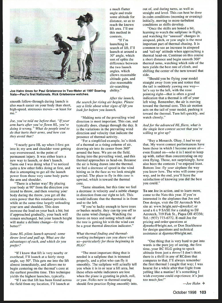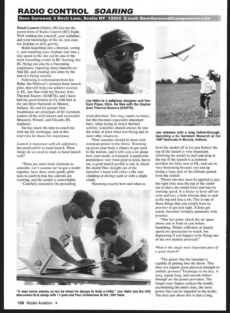 RADIO CONTROL SOARING 11V1 t11~fII7U 1Iu 1iIT{4FU T IY 114 ii -Launch Gliders HLGs purest form Radio Control RC flight nothing yourself sailplane knowledge air coax airplane defy gravity Hand-launching thermal coring watching airplane soar tiny speck sky can rewarding events RC Soaring HL flying can also frustrating experience requiring launches find lift creating sore arms end flying session Following information Joe Hahn Midwests premier hand-launch pilot will help achieve success HL Joe flies Dayton Area Thermal Soarers DARTS have good fortune fly him last three Nationals Muncie Indiana partner Don Stackhouse principals DJ Aerotech makers well-known successful Monarch Wizard Chysalis HL airplanes Joe has taken time coach HL technique interview shares experience Launch important sailpianes particularly hand launch What things need study hand launch well some basic elements consider Lets assume weve got model together have done some gentle glide tests confirm controls working model controllable Carefully determine prevailing wind direction may sound too basic becomes especially important later trying detect thermal activity Launches should always wind least test-flying other situations First launches should done minimum power throw Warming up gives body chance get used motion tells lot about model trimmed Launch trim preferences vary pilot pilot good launch profile model flies straight out launchers hand either flat climbing diving path slight climb Knowing exactly level model off just before top launch very important Allowing model stall drop top launch common problem folks new HL can very frustrating because end up losing large part altitude gained launch Down elevator must applied just right time near top climb out place model level its cruising speed better level off too soon lose little altitude stall top lose lot things simply have practice get just right does get easier becomes virtually automatic practice last point check air space above front before launching Midair collisions launch speed spectacular watch depressing happen flying two models involved What single important part great launch power launcher capable putting throw does require great physical strength athletic prowess Technique key long repeat long smooth followthrough power providers longer fingers contact model accelerating entire time power can imparted model nice part about long 100 Model Aviation Hahn sailplane designer flier Piqua Ohio flies Dayton Area Thermal Soarers DARTS Joe releases long follow-through launching DJ Aerotech Monarch 1997 Nationals Muncie Indiana man never stands tall stoops help child Joe Hahn left discusses HLG setup 11-year-old Paul Griebenow 1997 Nats smooth follow-through during launch also much easier body short high-speed strenuous movesat least Joe youve told before arm hurts after youve flown HL youre doing wrong What people tend hurts arms can avoid nearly gave HL up first got arm shoulder getting way overstressed point permanent injury either learn new way launch dont launch Turns out doing what Ive noticed quite few other folks doing first attempting get launch power very same body parts arm shoulder better way placing body 900 direction intend throw rotating body during throw get extra power rotation provides same time largely unloading arm shoulder does increase load back bit approached gradually back will remain unchanged launch height will make definite changefor better Some HL pilots launch upward some throw level pull up What advantages prefer know lift very nearby overhead Ill launch fairly steep angle say 500 gets lift almost immediately allows begin centering thermals core earliest possible time technique yields highest launches typically see lift has found across field location Ill launch much flatter angle trade some altitude distance reach known lift area Ill use method contests Im launching search lift Ill launch around 300 angle sort splits difference between two launch angles allows reasonable altitude gain also reasonable air-searching ability After launch search rising air begins Please say little about what signs lift look before launch Making note prevailing wind direction important can typically does change through day variations prevailing wind direction velocity indicate presence thermal activity simplified example lets think thermal rising column air drawing air its center 3600 around base field facing prevailing wind thermal approaches us head-on Because air being drawn thermal feel decrease speed wind hitting us face look straight upwind place fly case upwind toward thermal core Same situation time feel decrease velocity subtle change direction right left would indicate thermal front left youre lucky enough have trees bushes nearby can tip off same wind changes Watching leaves trees noting side tree getting hit wind can great thermal direction indicator What thermal finding rmal working techniques can share usparticularly beginning HLG important thing needed sailplane trimmed properly pilot can fly smoothly sailplane will actually tell near lift area often-subtle indicators lost plane gyrating pitch roll yaw Folks new thermal soaring should first practice flying smoothly out during turns well straight level can best done calm conditions morning evening initially moving more-turbulent conditions skills develop Once skills honed bit learning watch sailplane flight watching unusual changes airspeed pitch yaw angle important part thermal chasing common see increase airspeed tail-up attitude approaching thermal head-on Continue course short distance begin smooth 3600 thermal turns watching side turn yields best rate climb shifting center turn toward side Should flying model straight away notice tail suddenly yawing way lets say left nose pointing rightthat often good indication thermal off left wing Remember air moving toward thermal core air motion acts tail model pushing toward thermal Turn left quickly watch closely advanced HLfliers what single best conte