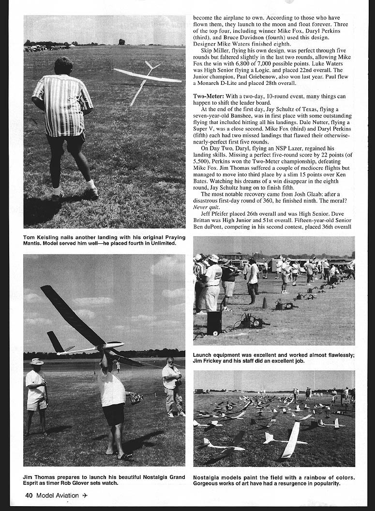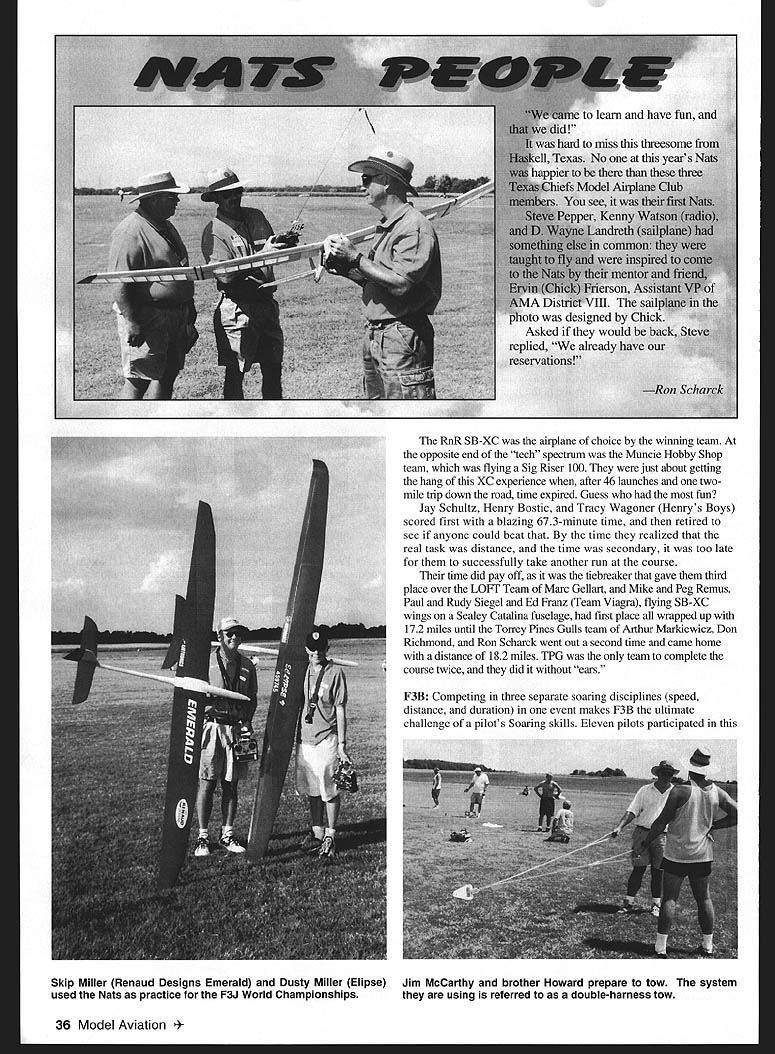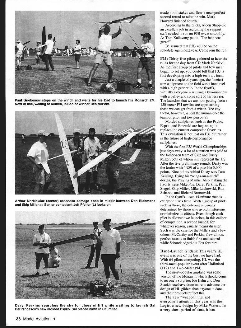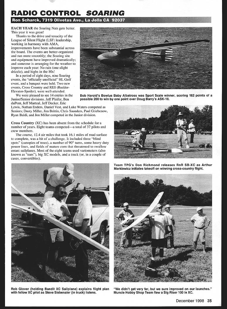 RADIO CONTROL SOARING U EACH YEAR Soaring Nats gets better year great Thanks drive tenacity League Silent Flight LSF leadership working harmony AMA improvements have substantial across board events better-organized run smoothly Soaring site equipment have improved dramatically someone arranging weather improve year No rain slight drizzle highs 80s period eight days nine Soaring events officially unofficial HL Golf event banquet held Two new events Cross Country RES Rudder Elevator-Spoiler well-attended pleased see 14 entries Junior/Senior divisions Jeff Pfeifer Ben duPont Jeff Martzal Jeff Decker Eric Lewis Nathan Enders Daniel Vest Luke Waters competed Seniors Dusty Miller Jim Brittin Chris Saunders Paul Griebenow Ryan Baldi Jon Miller competed Junior division Cross Country XC has absent schedule number years Eight teams competeda total 37 pilots crew members course 124 air miles took 161 miles road surface complete bit challenge included three blind spots canopies trees number 900 turns some heavy duty power lines fields mature corn threatened swallow errant sailplanes Most eight teams used variometers also known ears big XC models truck couple cases convertibles Rob Glover holding Bandit XC Sailplane explains flight plan didnt get very far sure improved launches fellow XC pilot Steve Siebenaler truck listens Muncie Hobby Shop Team flew Sig Riser 100 XC December 1998 35 Bob Harolds Bowlus Baby Albatross Sport Scale winner scoring 162 points possible 200 win point over Doug Barrys ASK-i 8 Team TPGs Don Richmond releases RnR SB-XC Arthur Markiewicz initiates takeoff winning cross-country flight RnR SB-XC airplane choice winning team opposite end tech spectrum Muncie Hobby Shop team flying Sig Riser 100 just about getting hang XC experience after 46 launches twomile trip down road time expired Guess fun Jay Schultz Henry Bostic Tracy Wagoner Henrys Boys scored first blazing 673-minute time retired see anyone could beat time realized real task distance time secondary too late successfully take another run course time did pay off tiebreaker gave third place over LOFT Team Marc Gellart Mike Peg Remus Paul Rudy Siegel Ed Franz Team Viagra flying SB-XC wings Sealey Catalina fuselage first place wrapped up 172 miles until Torrey Pines Gulls team Arthur Markiewicz Don Richmond Ron Scharek went out second time came home distance 182 miles TPG team complete course twice did ears F3B Competing three separate soaring disciplines speed distance duration event makes F3B ultimate challenge pilots Soaring skills Eleven pilots participated 36 Model Aviation Miller Renaud Designs Emerald Dusty Miller Elipse used Nats practice F3J World Championships Jim McCarthy brother Howard prepare tow system using referred double-harness tow year s event including Daryl Perkins two-time current F3B world champion Skip Miller first F3B world champion Two rounds task flown air pretty decent dayno problem making times After first round Mark Howard led four-man cluster Jim McCarthy Daryl Perkins Rich Burnowski hot pursuit Perkins slow first speed run recovered well aided huge thermal Daryl great first distance task burying Skip Miller others flight group second round mistakes lack thereof made difference Perkins McCarthy cut speed runs enough take out running second third places respectively Rich Burnowski flying conservative consistent speed runs Mike Waters designer Logic HLG readies model Joe Hahn launches Paul Griebenows Monarch DLite Ryan next round Mike finished eighth place Baldi times flight Paul Ryan 12 years old December 1998 37 made no mistakes flew near-perfect second round take win Mark Howard finished fourth According pilots Alden Shipp did excellent job recruiting support staff needed run F3B event smoothly As Tom Kallevang put help great assured F3B will schedule again next year Come join fun F3J Thirty-five pilots gathered hear rules day CD Mark Nankivil As first group pilots tow men began set up could tell F3J fast developing high-tech art form Just couple years ago fanciest tow equipment field hand reel high gear ratio flyoffs virtually everyone using two-man tow pulley some sort haruess rig launches now getting 150-meter F3J towline approaching can get winch key factor however still human team pilot tow persons Molded sailplanes such Psyko Esprit Emerald beginning replace current composite favorites evolution lost F3J rather future high-performance sailplanes first F3J World Championships just days away lot attention paid father-son team Skip Dusty Miller both will represent US After five preliminary rounds Dusty leader 4989 possible 5000 points Nine points behind Dusty Tom Keisling flying wings-on-a-stick design Praying Mantis Also making flyoffs Mike Fox Daryl Perkins Paul Siegel Skip Miller Mike Lachowski Ron Scharek Richard Buruowski flyoffstwo 15-minute rounds everyone starts fresh group pilots such outcome usually determined avoid misfortune minimize its effects though pilot allowed two launches caliber competition second launch whatever reason usually means disaster Such case Millers few others McCarthy Perkins flew almost perfect rounds finish first second Scharck edged out Fox third Hand-Launch Gliders years HL event best have 64 pilots competing HL third-most-popular event after Unlimited 112 Two-Meter 94 most-popular airplane some version Monarch should come no ones surprise Joe Hahn Don Stackhouse have done advance design HL gliders anyone date products reflect new weapon got everyones attention year Logic new design Mike Waters very short period time has 38 Model Aviation Griebenow steps winch waits Dad launch Monarch 2M Next line waiting launch Senior winner Ben duPont Arthur Markiewicz center assesses damage done midair between Don Richmond Skip Miller Senior contestant Jeff Pfeifer L looks Daryl Perkins searches sky clues lift waiting launch Sal DeFrancescos new molded Psyko Sal placed ninth Unlimited become airplane own According have flown launch moon float forever Three top four incl