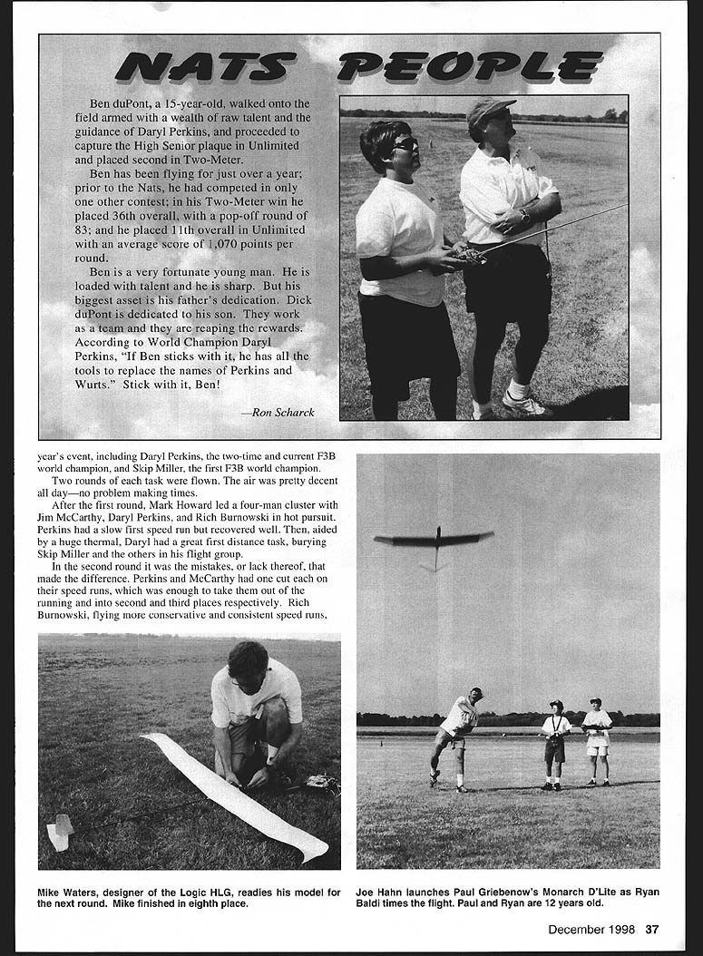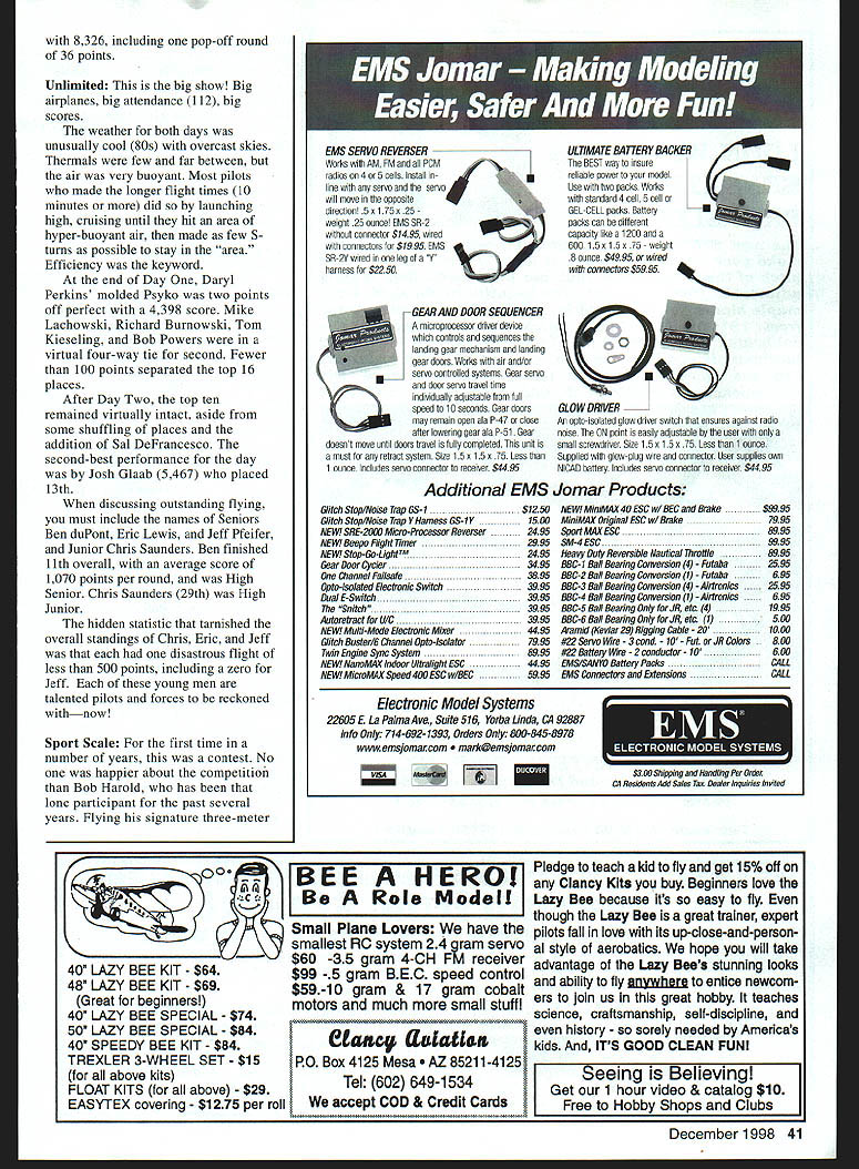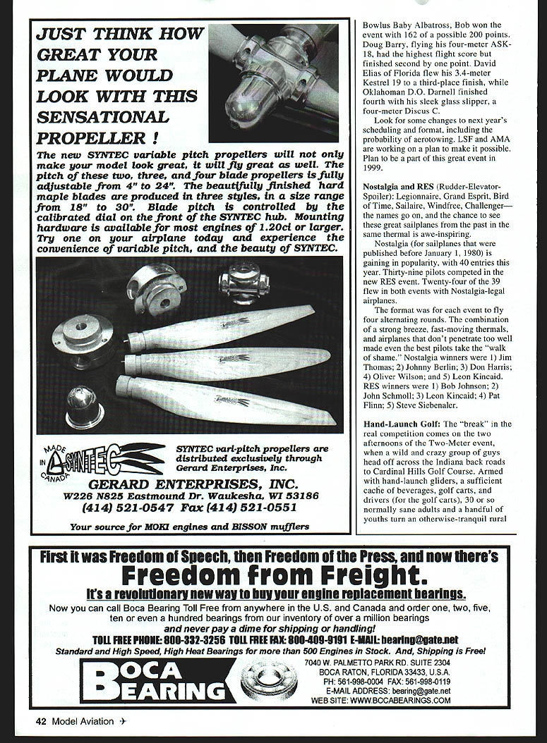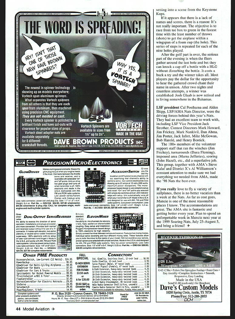 RADIO CONTROL SOARING U EACH YEAR Soaring Nats gets better year great Thanks drive tenacity League Silent Flight LSF leadership working harmony AMA improvements have substantial across board events better-organized run smoothly Soaring site equipment have improved dramatically someone arranging weather improve year No rain slight drizzle highs 80s period eight days nine Soaring events officially unofficial HL Golf event banquet held Two new events Cross Country RES Rudder Elevator-Spoiler well-attended pleased see 14 entries Junior/Senior divisions Jeff Pfeifer Ben duPont Jeff Martzal Jeff Decker Eric Lewis Nathan Enders Daniel Vest Luke Waters competed Seniors Dusty Miller Jim Brittin Chris Saunders Paul Griebenow Ryan Baldi Jon Miller competed Junior division Cross Country XC has absent schedule number years Eight teams competeda total 37 pilots crew members course 124 air miles took 161 miles road surface complete bit challenge included three blind spots canopies trees number 900 turns some heavy duty power lines fields mature corn threatened swallow errant sailplanes Most eight teams used variometers also known ears big XC models truck couple cases convertibles Rob Glover holding Bandit XC Sailplane explains flight plan didnt get very far sure improved launches fellow XC pilot Steve Siebenaler truck listens Muncie Hobby Shop Team flew Sig Riser 100 XC December 1998 35 Bob Harolds Bowlus Baby Albatross Sport Scale winner scoring 162 points possible 200 win point over Doug Barrys ASK-i 8 Team TPGs Don Richmond releases RnR SB-XC Arthur Markiewicz initiates takeoff winning cross-country flight RnR SB-XC airplane choice winning team opposite end tech spectrum Muncie Hobby Shop team flying Sig Riser 100 just about getting hang XC experience after 46 launches twomile trip down road time expired Guess fun Jay Schultz Henry Bostic Tracy Wagoner Henrys Boys scored first blazing 673-minute time retired see anyone could beat time realized real task distance time secondary too late successfully take another run course time did pay off tiebreaker gave third place over LOFT Team Marc Gellart Mike Peg Remus Paul Rudy Siegel Ed Franz Team Viagra flying SB-XC wings Sealey Catalina fuselage first place wrapped up 172 miles until Torrey Pines Gulls team Arthur Markiewicz Don Richmond Ron Scharek went out second time came home distance 182 miles TPG team complete course twice did ears F3B Competing three separate soaring disciplines speed distance duration event makes F3B ultimate challenge pilots Soaring skills Eleven pilots participated 36 Model Aviation Miller Renaud Designs Emerald Dusty Miller Elipse used Nats practice F3J World Championships Jim McCarthy brother Howard prepare tow system using referred double-harness tow year s event including Daryl Perkins two-time current F3B world champion Skip Miller first F3B world champion Two rounds task flown air pretty decent dayno problem making times After first round Mark Howard led four-man cluster Jim McCarthy Daryl Perkins Rich Burnowski hot pursuit Perkins slow first speed run recovered well aided huge thermal Daryl great first distance task burying Skip Miller others flight group second round mistakes lack thereof made difference Perkins McCarthy cut speed runs enough take out running second third places respectively Rich Burnowski flying conservative consistent speed runs Mike Waters designer Logic HLG readies model Joe Hahn launches Paul Griebenows Monarch DLite Ryan next round Mike finished eighth place Baldi times flight Paul Ryan 12 years old December 1998 37 made no mistakes flew near-perfect second round take win Mark Howard finished fourth According pilots Alden Shipp did excellent job recruiting support staff needed run F3B event smoothly As Tom Kallevang put help great assured F3B will schedule again next year Come join fun F3J Thirty-five pilots gathered hear rules day CD Mark Nankivil As first group pilots tow men began set up could tell F3J fast developing high-tech art form Just couple years ago fanciest tow equipment field hand reel high gear ratio flyoffs virtually everyone using two-man tow pulley some sort haruess rig launches now getting 150-meter F3J towline approaching can get winch key factor however still human team pilot tow persons Molded sailplanes such Psyko Esprit Emerald beginning replace current composite favorites evolution lost F3J rather future high-performance sailplanes first F3J World Championships just days away lot attention paid father-son team Skip Dusty Miller both will represent US After five preliminary rounds Dusty leader 4989 possible 5000 points Nine points behind Dusty Tom Keisling flying wings-on-a-stick design Praying Mantis Also making flyoffs Mike Fox Daryl Perkins Paul Siegel Skip Miller Mike Lachowski Ron Scharek Richard Buruowski flyoffstwo 15-minute rounds everyone starts fresh group pilots such outcome usually determined avoid misfortune minimize its effects though pilot allowed two launches caliber competition second launch whatever reason usually means disaster Such case Millers few others McCarthy Perkins flew almost perfect rounds finish first second Scharck edged out Fox third Hand-Launch Gliders years HL event best have 64 pilots competing HL third-most-popular event after Unlimited 112 Two-Meter 94 most-popular airplane some version Monarch should come no ones surprise Joe Hahn Don Stackhouse have done advance design HL gliders anyone date products reflect new weapon got everyones attention year Logic new design Mike Waters very short period time has 38 Model Aviation Griebenow steps winch waits Dad launch Monarch 2M Next line waiting launch Senior winner Ben duPont Arthur Markiewicz center assesses damage done midair between Don Richmond Skip Miller Senior contestant Jeff Pfeifer L looks Daryl Perkins searches sky clues lift waiting launch Sal DeFrancescos new molded Psyko Sal placed ninth Unlimited become airplane own According have flown launch moon float forever Three top four incl