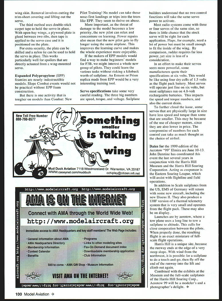 RADIO CONTROL SOARING d- -J F-1Mlq Ii J ii 1 1-U m Pete Carr Columbus Ohio Im Contest Director AMA 536 Ham ticket WW3O am pastpresident National Soaring Society Im working eight-hours distance tasks finish LSF Level V since 1982 also subscribe R/C Soaring Exchange welcome postings Id like commend Dave Garwood fine work did Soaring columnist Dave did wonderful job bringing us cross-section activities around country interviews legends Soaring particularly interesting us working master sevenminute task Late October time year Cumberland Maryland annual Soar-for-Fun Old Knobley Hill westward-facing slope beautiful view located just west town RC pilots gather last flying session before winters arrival site meadow row low trees near edge slope can cause severe turbulence low-flying airplanes wind up hill blowing possible hand-launch biggest models punching out through rough air 1998 gathering case good news/bad news good news tree line didnt produce usual chop because bad news no wind high-pressure area sat over hill producing beautiful cloudless skies still air As result pilots forced winch-launch use two power airplanes reach altitude piggyback Skip Schow has organized affair several years has arranged food winch Saturday night banquet local club built small wooden building large windows top edge meadow previous years wind up temperatures down possible slope-fly hours seated comfortably building year building served food preparation warm calm weather prevailed icons contest circuit 1970s Otto Heithecker visited Hill designed three-meter sailplane called Challenger used flaps spoilers glidepath control radios day quite large cockpit Challenger roughly four inches wide Otto model combination beat contests East Coast chatted about times mentioned gone full-scale soaring still enjoyed presence Old Knobley Hill highlight weekend Ray Hayes SkyBench Aerotech Michigan producing kits Ottos Challenger complete Clark Y airfoil original construction article Saturdays banquet attended Gene Shelkey AMA Soaring Contest Board Chairman Gene flew Sailaire wins East Coast well-known Scale Schweizer sailplane called Great Pumpkin lucky have Gene fellow board members looking after interests AMA Methods mounting servos wings like opinions Everyone has own looking alternatives post question Soaring Exchange prepared E-mail overload Three methods have gained recent favor first way wrap servo tape epoxy wing well against sheeting Removal cutting tape free servo Second fabricate servo box snug enough keep servo twisting under load epoxied wing MonoKote similar trim-sheet covering opening April 1999 99 Olympic II spoilers flown 1998 Cumberland MD Soar Fun Transparent covering 100-inch span made stand out Zuni 15-meter model prepped air-launch Cumberland very little slope lift available winch power models used Otto Heithecker holds sailplane adjustments Ottos three meter Challenger big winner 1970s wing skin Removal involves cutting trim-sheet covering lifting out servo third method uses double-stick carpet tape hold servo place open-bay wings plywood plate glued between two ribs tape applied servo case positioned plate extra security plate can drilled nylon tie can used tu hold servo place works particularly well spoilers directly actuated wing-mounted servo Expanded Polypropylene EPP foamies nearly indestructible models Slope Combat events would practical EPP foam construction activity tougher models Combat New Pilot Training No model can take nose-first landings trips trees like EPP seem thrive abuse important threat damage model becomes low priority new pilot can relax concentrate learning Fewer repairs also mean new pilot gets fly longer using same airplane improves learning curve makes whole experience enjoyable makers EPP models would find way make beginners models F3B might interest whole new group pilots could learn various tasks risking kilobuck worth sailplane An Esteem Prism replica made EPP would very interesting training tool Servo specifications take some very careful reading three big numbers speed torque voltage Sailplane New Toll Free Number 888-790-8577 Aomething smaller taking wing Mud Duck Aviation 7118 Westmoreland Dr Warrenton VA 20187 WWWcaseynetcom/mudduckcchipley@citizen intl net builders understand no two control functions will take same servo power activate Most radio systems come three four servos same size little chance stock servo will right application Flaps example need lot power must small enough fit inside wing comparison rudder requires far less power yet size less consideration effort make servos seem powerful some manufacturers quote specifications six volts would like using four dry cells 15 volts flight pack battery Most servos will operate just fine six volts sailplanes run 48-volt rechargeable batteries impacts speed torque numbers also current drain further cloud issue some servos physically large size have less speed torque some smaller may because use cheaper motors since also lower price compromise numbers control can take much thought choice airfoil Dates 1999 edition Aerotow 99 Elmira June 10-13 John Derstine has coordinated event last several years conjunction Harris Hill Museum Harris Hill Soaring Corporation Acting cosponsor Eastern Soaring League will assist flightline field operations addition Scale sailplanes US EMS Germany will return some new aircraft including new Discus II also produce UHF version thermal telemetry system very small operates flight pack may also display Launches aerotow tow plane uses long line tow sailplane altitude calls close cooperation between pilots properly done resulting flight exact miniature fullscale flight operations Harris Hill unique site because runway ends edge very steep slope wind northwest possible sailplane touch-and-go fly off end runway lift climb out again Combined exhibits Museum full-scale sailplanes Harris Hill Soaring Corp Aerotow 99 will modelers photographers delight Model Aviation