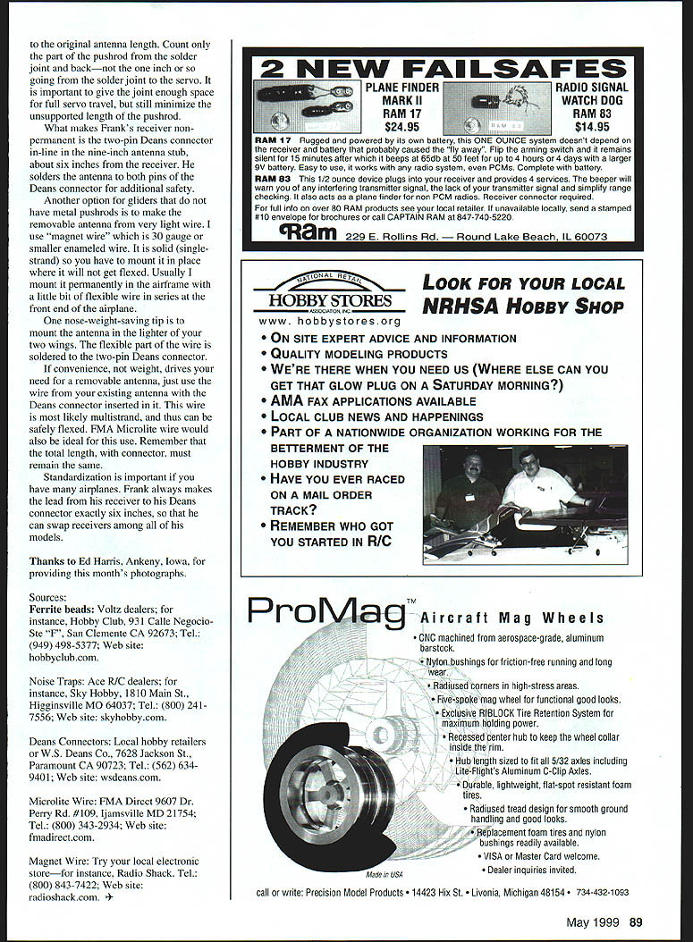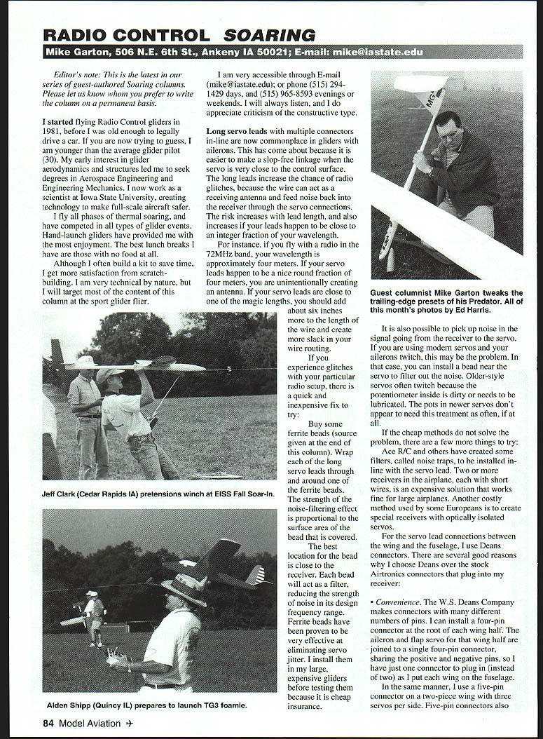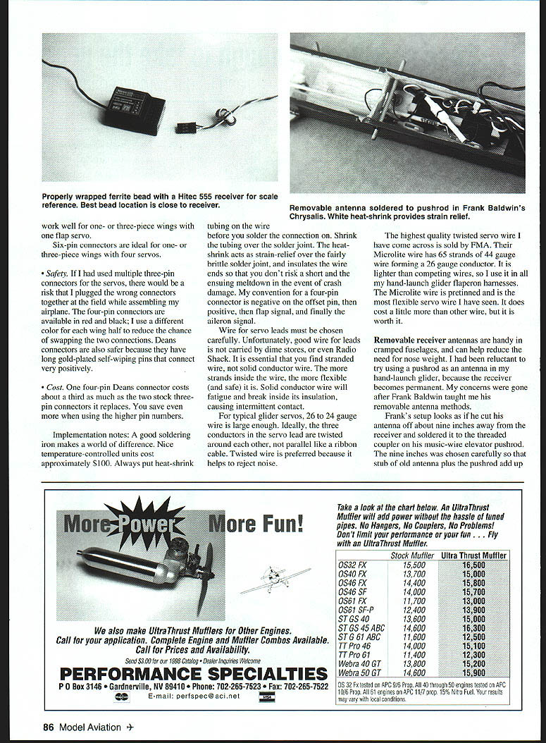 RADIO CONTROL SOARING Editors note latest series guest-authored Soaring columns Please let us know prefer write column permanent basis started flying Radio Control gliders 1981 before old enough legally drive car now trying guess am younger average glider pilot 30 early interest glider aerodynamics structures led seek degrees Aerospace Engineering Engineering Mechanics now work scientist Iowa State University creating technology make full-scale aircraft safer fly phases thermal soaring have competed types glider events Hand-launch gliders have provided enjoyment best lunch breaks have no food Although often build kit save time get satisfaction scratchbuilding am very technical nature will target content column sport glider flier am very accessible through E-mail mike@iastateedu phone 515 2941429 days 515 965-8593 evenings weekends will always listen appreciate criticism constructive type Long servo leads multiple connectors in-line now commonplace gliders ailerons has come about because easier make slop-free linkage servo very close control surface long leads increase chance radio glitches because wire can act receiving antenna feed noise back receiver through servo connections risk increases lead length also increases leads happen close integer fraction wavelength instance fly radio 72MHz band wavelength approximately four meters servo leads happen nice round fraction four meters unintentionally creating antenna servo leads close magic lengths should add about six inches length wire create slack wire routing experience glitches particular radio setup quick inexpensive fix try Buy some ferrite beads source given end column Wrap long servo leads through around ferrite beads strength noise-filtering effect proportional surface area bead covered best location bead close receiver bead will act filter reducing strength noise its design frequency range Ferrite beads have proven very effective eliminating servo jitter install large expensive gliders before testing because cheap insurance also possible pick up noise signal going receiver servo using moderu servos ailerons twitch may problem case can install bead near servo filter out noise Older-style servos often twitch because potentiometer inside dirty needs lubricated pots newer servos dont appear need treatment often cheap methods solve problem few things try Ace R/C others have created some filters called noise traps installed line servo lead Two receivers airplane short wires expensive solution works fine large airplanes Another costly method used some Europeans create special receivers optically isolated servos servo lead connections between wing fuselage use Deans connectors several good reasons choose Deans over stock Airtronics connectors plug receiver Convenience WS Deans Company makes connectors different numbers pins can install four-pin connector root wing half aileron flap servo wing half joined single four-pin connector sharing positive negative pins have just connector plug instead two put wing fuselage same manner use five-pin connector two-piece wing three servos per side Five-pin connectors also 84 Model Aviation t columnist Mike Garton tweaks trailing-edge presets Predator months photos Ed Harris Jeff Clark Cedar Rapids IA pretensions winch EISS Fall Soar-In Alden Shipp Quincy IL prepares launch TG3 foamie work well one- three-piece wings flap servo Six-pin connectors ideal one- three-piece wings four servos Safety used multiple three-pin connectors servos would risk plugged wrong connectors together field assembling airplane four-pin connectors available red black use different color wing half reduce chance swapping two connections Deans connectors also safer because have long gold-plated self-wiping pins connect very positively Cost four-pin Deans connector costs about third much two stock threepin connectors replaces save using higher pin numbers Implementation notes good soldering iron makes world difference Nice temperature-controlled units cost approximately $100 Always put heat-shrink tubing wire before solder connection Shrink tubing over solder joint heatshrink acts strain-relief over fairly brittle solder joint insulates wire ends dont risk short ensuing meltdown event crash damage convention four-pin connector negative offset pin positive flap signal finally aileron signal Wire servo leads must chosen carefully Unfortunately good wire leads carried dime stores Radio Shack essential find stranded wire solid conductor wire strands inside wire flexible safe Solid conductor wire will fatigue break inside its insulation causing intermittent contact typical glider servos 26 24 gauge wire large enough Ideally three conductors servo lead twisted around other parallel like ribbon cable Twisted wire preferred because helps reject noise highest quality twisted servo wire have come across sold FMA Microlite wire has 65 strands 44 gauge wire forming 26 gauge conductor lighter competing wires use hand-launch glider flaperon harnesses Microlite wire pretinned flexible servo wire have seen does cost little other wire worth Removable receiver antennas handy cramped fuselages can help reduce need nose weight reluctant try using pushrod antenna hand-launch glider because receiver becomes permanent concerns gone after Frank Baldwin taught removable antenna methods Franks setup looks cut antenna off about nine inches away receiver soldered threaded coupler music-wire elevator pushrod nine inches chosen carefully stub old antenna plus pushrod add up e Fun Take look chart below An Ultra Thrust Muffler will add power hassle tuned pipes No Hangers No Couplers No Problems Dont limit performance fun Ultra Thrust Muffler Stock Muffler 0S32 FX15500 OS4OFX13700 0546FX14400 0S465F14000 0S61 FX11700 0S61 SF-P12400 STGS4O13600 STGS45ABC14600 STG61 ABC11600 TT Pro 4614000 TT Pro 6111400 bra 4OGT13800 Webra5OGT14600 OS 32 Fx lesled APC 9/6 Prop 40 through 50 engines tesled APC 10/6 Prop 61 engines APC 11/7 prop 15% Nitro Fool Yoor resolts may vary