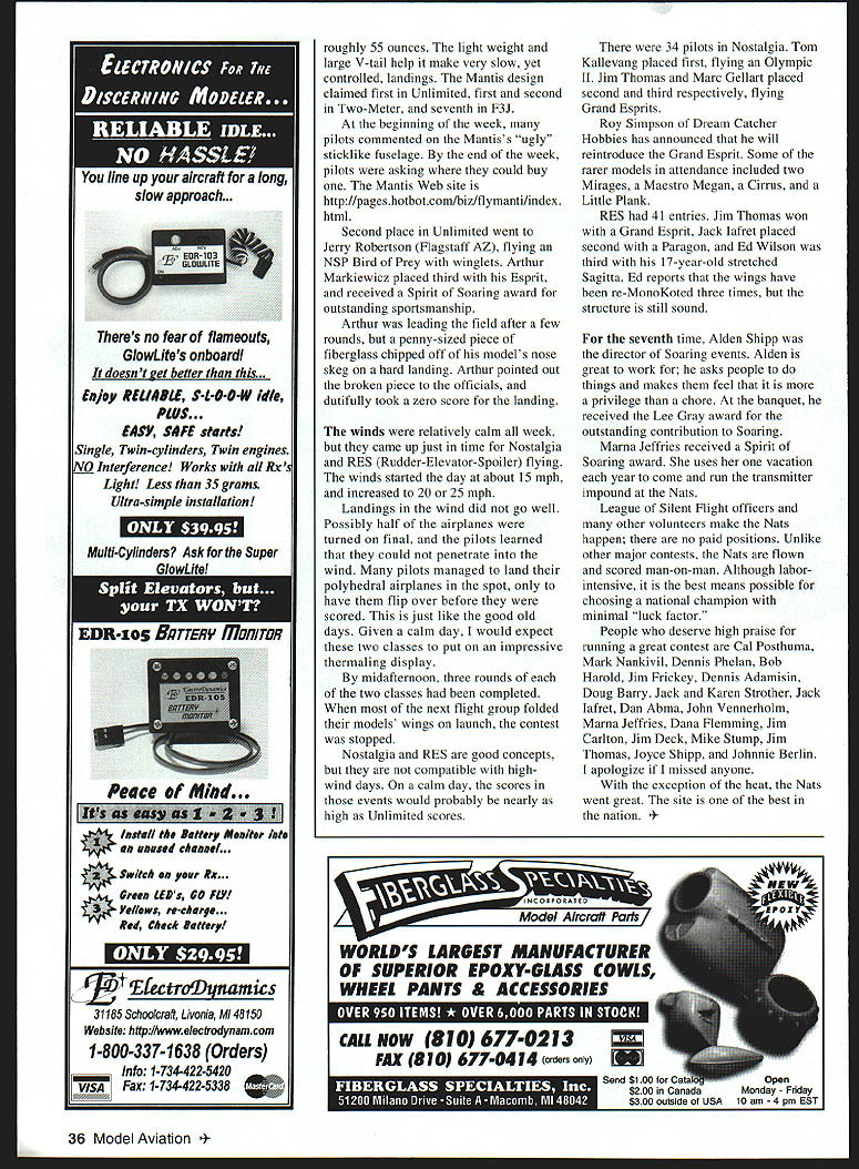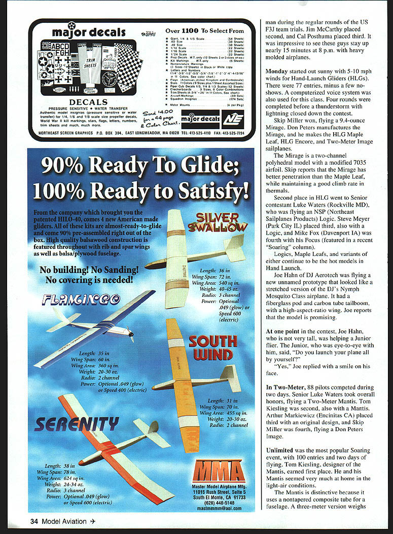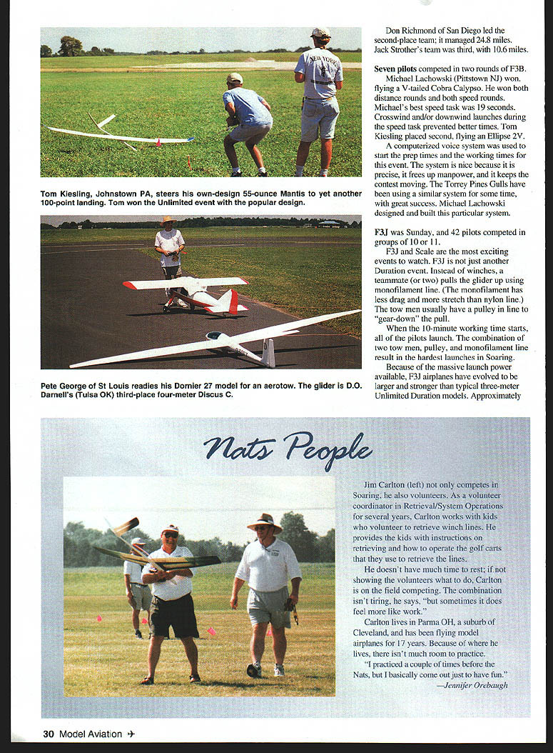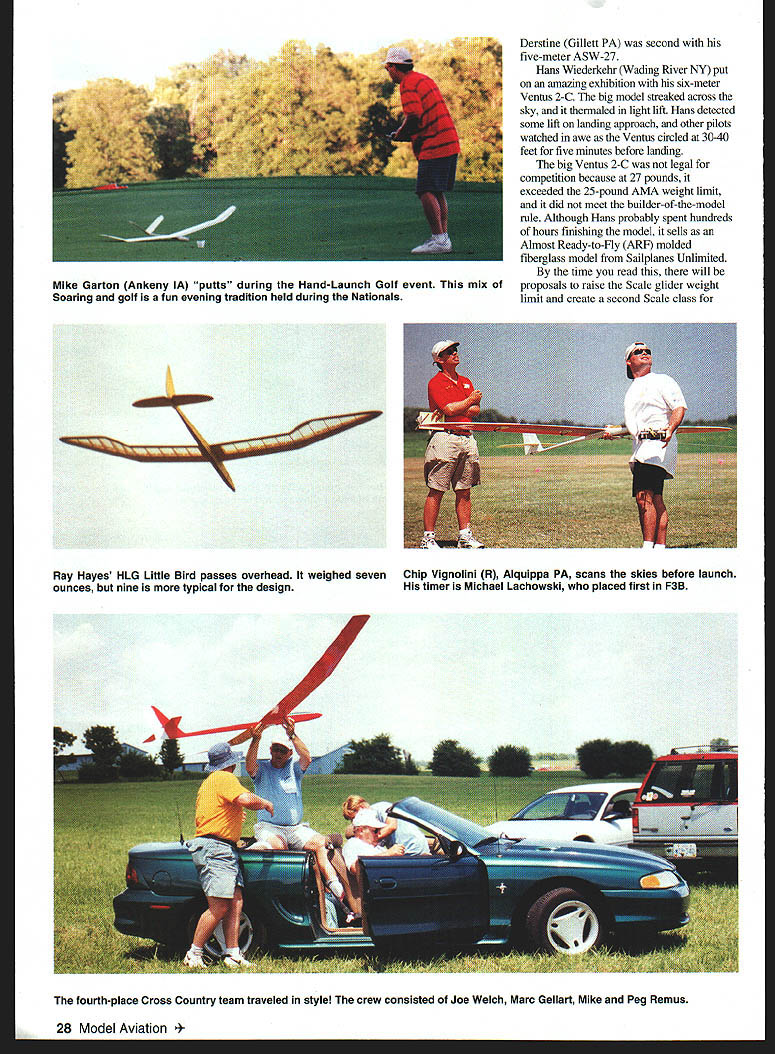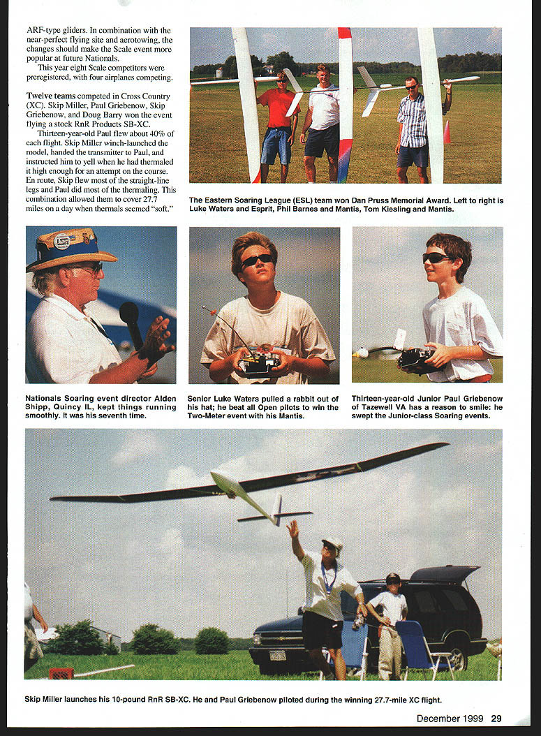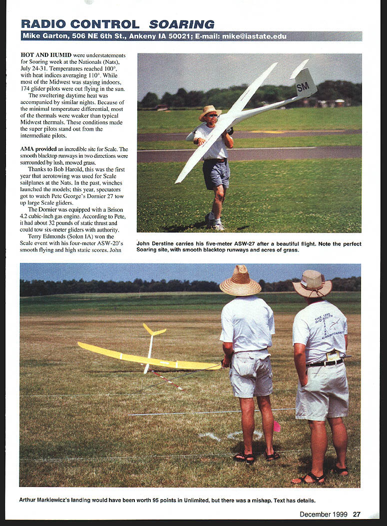 RADIO CONTROL SOARING t-Trvig I1i-Y HOT AND HUMID understatements Soaring week Nationals Nats July 24-31 Temperatures reached 1000 heat indices averaging 1100 Midwest staying indoors 174 glider pilots out flying sun sweltering daytime heat accompanied similar nights Because minimal temperature differential thermals weaker typical Midwest thermals conditions made super pilots stand out intermediate pilots AMA provided incredible site Scale smooth blacktop mnways two directions surrounded lush mowed grass Thanks Bob Harold first year aerotowing used Scale sailplanes Nats past winches launched models year spectators got watch Pete Georges Dornier 27 tow up large Scale gliders Dornier equipped Brison 42 cubic-inch gas engine According Pete about 32 pounds static thrust could tow six-meter gliders authority Terry Edmonds Solon IA won Scale event four-meter ASW-20s smooth flying high static scores John December 1999 27 John Derstine carries five-meter ASW-27 after beautiful flight Note perfect Soaring site smooth blacktop runways acres grass Arthur Markiewiczs landing would have worth 95 points Unlimited mishap Text has details Derstine Gillett PA second five-meter ASW-27 Hans Wiederkelir Wading River NY put amazing exhibition six-meter Ventus 2-C big model streaked across sky thermaled light lift Hans detected some lift landing approach other pilots watched awe Ventus circled 30-40 feet five minutes before landing big Ventus 2-C legal competition because 27 pounds exceeded 25-pound AMA weight limit did meet builder-of-the-model rule Although Hans probably spent hundreds hours finishing model sells Almost Ready-to-Fly ARF molded fiberglass model Sailplanes Unlimited time read will proposals raise Scale glider weight limit create second Scale class 28 Model Aviation Garton Ankeny IA putts during Hand-Launch Golf event mix Soaring golf fun evening tradition held during Nationals Ray Hayes HLG Little Bird passes overhead weighed seven Chip Vignolini R Aiquippa PA scans skies before launch ounces nine typical design timer Michael Lachowski placed first F3B fourth-place Cross Country team traveled style crew consisted Joe Welch Marc Gellart Mike Peg Remus ARF-type gliders combination near-perfect flying site aerotowing changes should make Scale event popular future Nationals year eight Scale competitors preregistered four airplanes competing Twelve teams competed Cross Country XC Skip Miller Paul Griebenow Skip Griebenow Doug Barry won event flying stock RnR Products SB-XC Thirteen-year-old Paul flew about 40% flight Skip Miller winch-launched model handed transmitter Paul instructed him yell thermaled high enough attempt course En route Skip flew straight-line legs Paul did thermaling combination allowed cover 277 miles day thermals seemed soft December1999 29 Eastern Soaring League ESL team won Dan Pruss Memorial Award Left right Luke Waters Esprit Phil Barnes Mantis Tom Kiesling Mantis Nationals Soaring event director Alden Senior Luke Waters pulled rabbit out Thirteen-year-old Junior Paul Griebenow Shipp Quincy IL kept things running hat beat Open pilots win Tazewell VA has reason smile smoothly seventh time Two-Meter event Mantis swept Junior-class Soaring events Skip Miller launches 10-pound RnR SB-XC Paul Griebenow piloted during winning 277-mile XC flight Don Richmond San Diego led second-place team managed 248 miles Jack Strothers team third 106 miles Seven pilots competed two rounds F3B Michael Lachowski Pittstown NJ won flying V-tailed Cobra Calypso won both distance rounds both speed rounds Michaels best speed task 19 seconds Crosswind and/or downwind launches during speed task prevented better times Tom Kiesling placed second flying Ellipse 2V computerized voice system used start prep times working times event system nice because precise frees up manpower keeps contest moving Torrey Pines Gulls have using similar system some time great success Michael Lachowski designed built particular system F3J Sunday 42 pilots competed groups 10 11 F3J Scale exciting events watch F3J just another Duration event Instead winches teammate two pulls glider up using monofilament line monofilament has less drag stretch nylon line tow men usually have pulley line gear-down pull 10-minute working time starts pilots launch combination two tow men pulley monofilament line result hardest launches Soaring Because massive launch power available F3J airplanes have evolved larger stronger typical three-meter Unlimited Duration models Approximately Jim Carlton left Soaring also volunteers coordinator RetrievalIS several years Carlton w volunteer retrieve w provides kids instri retrieving opera use retrieve Ii doesnt have much tin showing volunteers what field competing c isnt tiring says Thut sometin feel like work Carlton lives Parma OH si Cleveland has flying model airplanes 17 years Because lives isnt much rooni practice practiced couple times before Nats basically come out just have fun Jennifer Orebaugh 30 Model Aviation Kiesling Johnstown PA steers own-design 55-ounce Mantis yet another 100-point landing Tom won Unlimited event popular design Pete George St Louis readies Dornier 27 model aerotow glider DO Darnells Tulsa OK third-place four-meter Discus C 95% F3J airplanes Nats hollow molded composite models approximately 3 meters span mostcommon airplane Muller Esprit As spectator see simultaneous massive zoom launches airplanes fly far away search lift flight groups airplanes penetrate out near horizon looking lift amazing see pilots working lift models just specks Approximately aine minutes working time sky starts howling big molded models dive out thennals high speeds airplanes simultaneously set up landings 11 parallel landing zones Pilots try time landing within last two seconds working time Around 958 working time models plop landing spots buzzer goes off severe penalty being air buzzer sounds Near end day top 10 pilots compete two flyoffs flyoffs similar previous rounds except perfect flights just les