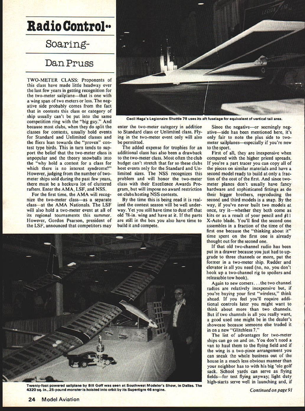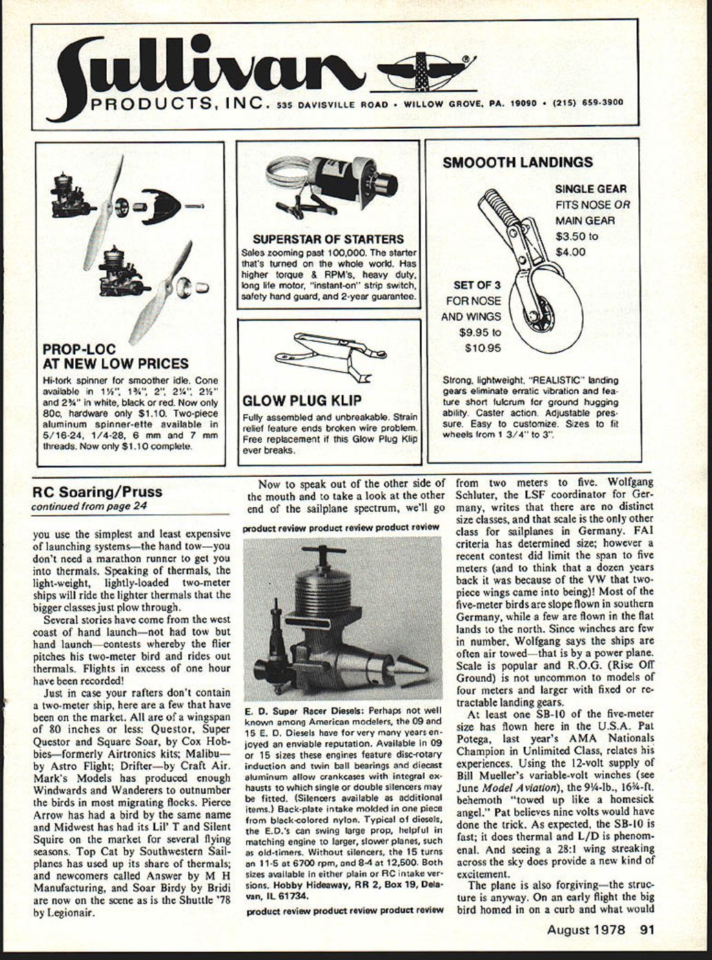 Radio Control Soaring Dan Pruss TWO-METER CLASS Proponents class have made little headway over last few years getting recognition two-meter sailplanethat wing span two meters less neg ative side probably comes fact contests class category ship usually cant put same competition ring big guy because clubs split classes contests usually hold events Standard Unlimited classes fliers lean towards proven con test type birds turn tends sup port belief two-meter class unpopular theory snowballs hold contest class no interest syndrome However judging number twometer ships sold during past few years must heckuva lot cluttered rafters Enter AMA LSF NSS first time AMA will recog nize two-meter classas separate classat AMA Nationals LSF will also hold two-meter event its regional tournaments summer However Gordon Pearson president LSF announced competitors may enter two-meter category addition Standard class Unlimited class Fly ing two-meter event will also permitted added expense trophies additional class has also drawback two-meter class Most often club budget cant stretch far clubs host events Standard Un limited sizes NSS recognizes problem will honor two-meter class Excellence Awards Pro gram will impose no award restriction clubs hosting NSS contests time being read real ized contest season will well under way Yet still have time dust ofT old 78-in wing have parts still box also have time build compete Since negativeor seemingly neg ativeside has mentioned its fair note plus side twometer sailplanesespecially youre new sport First inexpensive compared higher priced spreads youre part tracer can copy pieces similar materials have second model ready build frac tion cost first since twometer planes dont usually have fancy hardware sophisticated fittings bigger brothers reproducing second third models snap way youve never built two models once try itwhether both come kits result pencil #11 X-Acto blade Youll find second assembles fraction time first because thinking about time spent first already thought out second old two-channel radio has put drawer because just up grade three channels put former two-meter ship Rudder elevator need no no dont hook up two-channel rig spoilers releasable tow hook Again new comers. two channel radios relatively inexpensive youre buying first wireless think ahead feel youll require addi tional controls later might want think about two channels two channels really want good used might dealers showcase because someone else traded new Glitchless 7 list advantages two-meter ships can go on dont need van haul flying field wing two-piece arrangement can sneak whole business out house much less obvious manner neighbor has big ole golf sack School yards can serve flying fields-for test flying anyway light duty high-starts serve well launching Continued page 91 24 Model Aviation Cecil Hagas Legionaire Shuttle 78 uses its aft fuselage equivalent vertical tail area Twenty-foot powered sailplane Bill Goff seen Southwest Modelers Show Dallas 4320 sq in. 25-pound monster hoisted orbit its Supertigre 46 engine P R 0 D U CT S N C SVILLE ROAD OW GROVE PA 19090 659-3900 L PROP-LOC AT NEW LOW PRICES Hi-fork spinner smoother idle Cone available 1/2 1 2 2A 2A 2 white black red Now 80c hardware $110 Two-piece aluminum spinner-ette available 5/16-24 1/4-28 6 mm 7 mm threads Now $110 complete SUPERSTAR OF STARTERS Sales zooming past 100000 starter thats turned whole world Has higher torque & RPMs heavy duty long life motor instant-on strip switch safety hand guard 2-year guarantee RC Soaring/Pruss continued page 24 use simplest least expensive launching systemsthe hand towyou dont need marathon runner get thermals Speaking thermals light-weight lightly-loaded two-meter ships will ride lighter thermals bigger classes just plow through Several stories have come west coast hand launchnot tow hand launchcontests whereby flier pitches two-meter bird rides out thermals Flights excess hour have recorded Just case rafters dont contain two-meter ship few have market wingspan 80 inches less Questor Super Questor Square Soar Cox Hob biesformerly Airtronics kits Malibu Astro Flight Drifterby Craft Air Marks Models has produced enough Windwards Wanderers outnumber birds migrating flocks Pierce Arrow has bird same name Midwest has its Lil T Silent Squire market several flying seasons Top Cat Southwestern Sailplanes has used up its share thermals newcomers called Answer M H Manufacturing Soar Birdy Bridi now scene Shuttle 78 Legion air Now speak out other side mouth take look other end sailplane spectrum well go E 0 Super Racer Diesels Perhaps well known among American modelers 09 15 E D Diesels have very years en joved enviable reputation Available 09 15 sizes engines feature disc-rotary induction twin ball bearings diecast aluminum allow crankcases integral ex hausts single double silencers may fitted Silencers available additional items Back-plate intake molded piece black-colored nylon Typical diesels EDs can swing large prop helpful matching engine larger slower planes such old-timers Without silencers 15 turns 11-5 6700 rpm 8-4 12500 Both sizes available either plain RC intake ver sions Hobby Hideaway RR 2 Box 19 Dela van IL 61734 product review product review product review two meters five Wolfgang Schluter LSF coordinator Ger writes no distinct size classes scale other class sailplanes Germany FAI criteria has determined size however recent contest did limit span five meters think dozen years back because VW twopiece wings came being Most five-meter birds slope flown southern Germany few flown flat lands north Since winches few number Wolfgang says ships often air towedthat power plane Scale popular ROG Rise Off Ground uncommon models four meters larger fixed re tractable landing gears least SB-b five-meter size has flown USA Pat Potega last years AMA Nationals Champion Unlimited Class relates experiences Using 12-volt supply Bill Muellers variable-volt winches see June Model Aviation 9-lb 16-ft b
