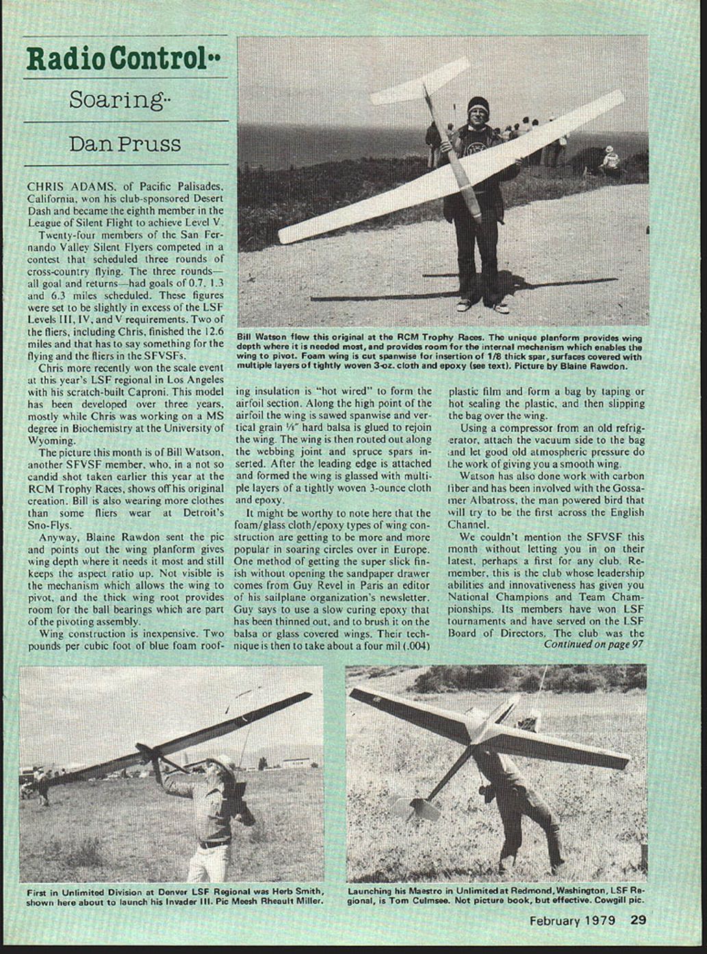 NO OCR TEXT substantial number beginner class en tries contest publicity indicated class would available Unfortu nately limited solution since flier must jump fire next contest face hotshots super airplanes Another event has tried few contests met success Nov ice class airplane combination limited have Schnuerle-ported Perry ported en gines tuned pipes functioning retract able landing gear good feature about event provides event beginners some fliers will never great like compete pattern competition Another idea continues gain support handicap Novice event flight scores modified adding points fixed gear conventional engines/mufflers subtracting points functioning retractable landing gear spe cial engine porting tuned pipes An ob vious problem idea assess ment appropriate handicap points different features handicap system can fouled up judges either tougher generous anticipated Yet another idea would ban retractable landing gear special engine porting tuned pipes Novice pattern event entirely might drive down airplane size Novice event somewhat take advantage better power weight ratio using conven tional engine would also place Novice event graduate position need ing new airplane compete Advanced must ideas around country bear consideration have write NSRCA district vice president about can publicized several years have preaching newcomers fuel problems caused glow plug engine has running well starts having problems glow plug should sus pected bad plug can make engine seem lean rich adjusting needle valve may alleviate condi tion way detect plug problem remove battery clip engine idling listen speed change engine speed drops slight amount glow plug should replaced previous test usually suf ficient detect bad plug isnt fool proof CCRCC Fall Carnival near New Orleans Louisiana struggled through four rounds flying alter nately rich lean engine runs discover glow plug element mangled pushed against side chamber new glow plug made fuel problems go away Contest fliers vocal comes problems glow plugs cause bad engine run can spoil compe p CLUCK WORE TIMERSALL SIZE ENGINE MOUNTSPEACE PIPE MUFFLERSSYRINGE FUELERS SURGICAL TURINGSPECIAL ENGINE MGIJNTSCALUMET MUFFLERSPEN BLADDERS NEOPRENE TUNINGTAME MOIORTSMUFFIIT MUFFLERSFUEL TUNE FILLER SCALE INSTRUMENT KITSSPEED PUNSENUINE MANIFOLDSSTICKATARE AMA SUFETY PROP gRITSR/C STEEMANLE ROSE GEARMUFFLER EXTENSIURSENGINE CUVUS ENGINE TEST STUNSR/C MIME MOLO DOARSMACE CAM MUFFLERSFUEL SMUT OFF OULUE GLOW PLUG STARTERNYLON SCREUSCMICKEN STICASPROPELLERS BUTTERY CRURGERNYLON SPINNERSRAZOR OLMOESENGINE NT DRILL JIG tition flight During 1978 contest season heard complaints about de fective glow plugs other years put together Statements like Ive used Brand X plugs years now cant trust anymore very common Perhaps us save defective new plugs discover until have half dozen mail plug manu facturers demand refund replacement manufacturers will get message NSRCA District 6 vice president Earl Haury published caution Novem ber issue K Factor bears re peating articles discussing relative safety points current air craft large aircraft hazard ous aspect mentioned GASOLINE Spark ignition etigines fueled gas oline instead usual alcohol-based fuel gasoline everyday com modity common often overlook just dangerous can flash point minimum temperature flammable vapors will present -45 degrees F gasoline 52 de grees F methanol higher nitromethane Vapor pressure pres sure exerted upon closed container 20 degrees C gasoline four times methanol nearly 12 times nitromethane auto ignition tempera ture temperature material will ignite spontaneously gasoline about half alcohol What means very real probability fire exists crash definite possibility delayed explosion also present quart gasoline exploding pick up damaged model will definitely shorten modeling career life Merely transporting handling storing gasoline infinitely hazardois glow fuel Dont think white gas unleaded high low octane different gasoline demands extreme care handling Thanks Earl Next month plan get back de scriptions perform pattern maneuvers next maneuver description will Stall Turn also plan report couple new products Ron Van Putte 12 Connie Drive Shal imar FL 32579 RC Soaring/Pruss continued page 29 originator one-on-one competition cross-country racing club boasts R&D department off shoots have brought about new con struction techniques designs scribe has always felt Rubber Ducky name sailplane didnt justice engineering went re member club also lays claim Ed SbFebruary 1979 97 Shown below just sampling accessories make 4 8180 PIUN OUUsSU ENGINE MOUNTS WMUM FOLDS STEENUILE NOSE NOUNS SEND SIOO 25 paqe illustrated catalog refundable first order TATONE PRODUCTS CORP 1209 GENEVAAVENUE SAN FRANCISCO CA94 112 hod Tom Williams California Tom Williams formers Paragon has allowed Ed take few bows Tom has done likewise Windrifter other designs club has Terry Koplanone-third USA FAI team will compete Belgium summer course Blame Rawdon Bill Watson design wizardry back latest titanium wing spars swing wings new space-age material allows shoot spot landings 400 feet high latesta bake sale Wait Dont go away different bake sale same hands mixed 5-minute epoxy sifted flour same hands crafted exotic designs world beaters now made layer cakes pies tarts made old club house look like Vien nese pastry shop goal raise buck two club coffer Rules items auc tion made members Re sults Eighty bucks plus club till another first San Fernando Valley Silent Flyers no truth rumor Ed Slobods lemon chiffon cake solid center removeable tips Barbara l-lenons applesauce cake did however go ten buckshigh contest er auction Meanwhile Dick Shilling wowed Tarte des Demoiselles Tatin clubs no class thats up side down apple pie does come up name like Rubber Ducky sailplane Tarte des Demoiselles Tatin pie Anyway bake sale sounds like good idea steal future club project knows next LSF Tourn ment could possibly have club bake-off Elsewhere annual Cumberland p