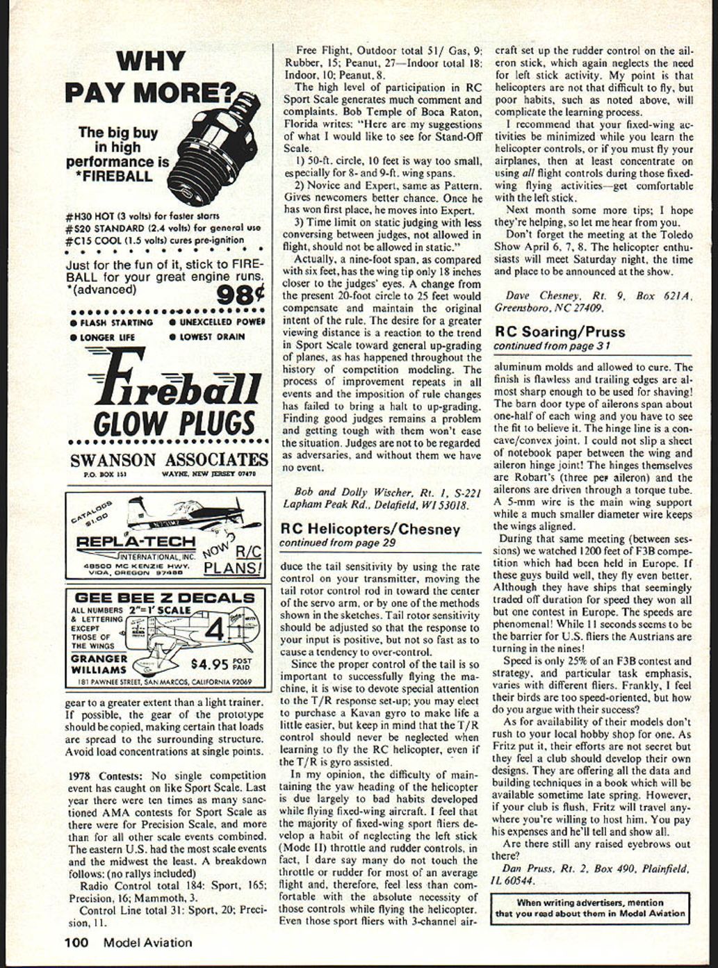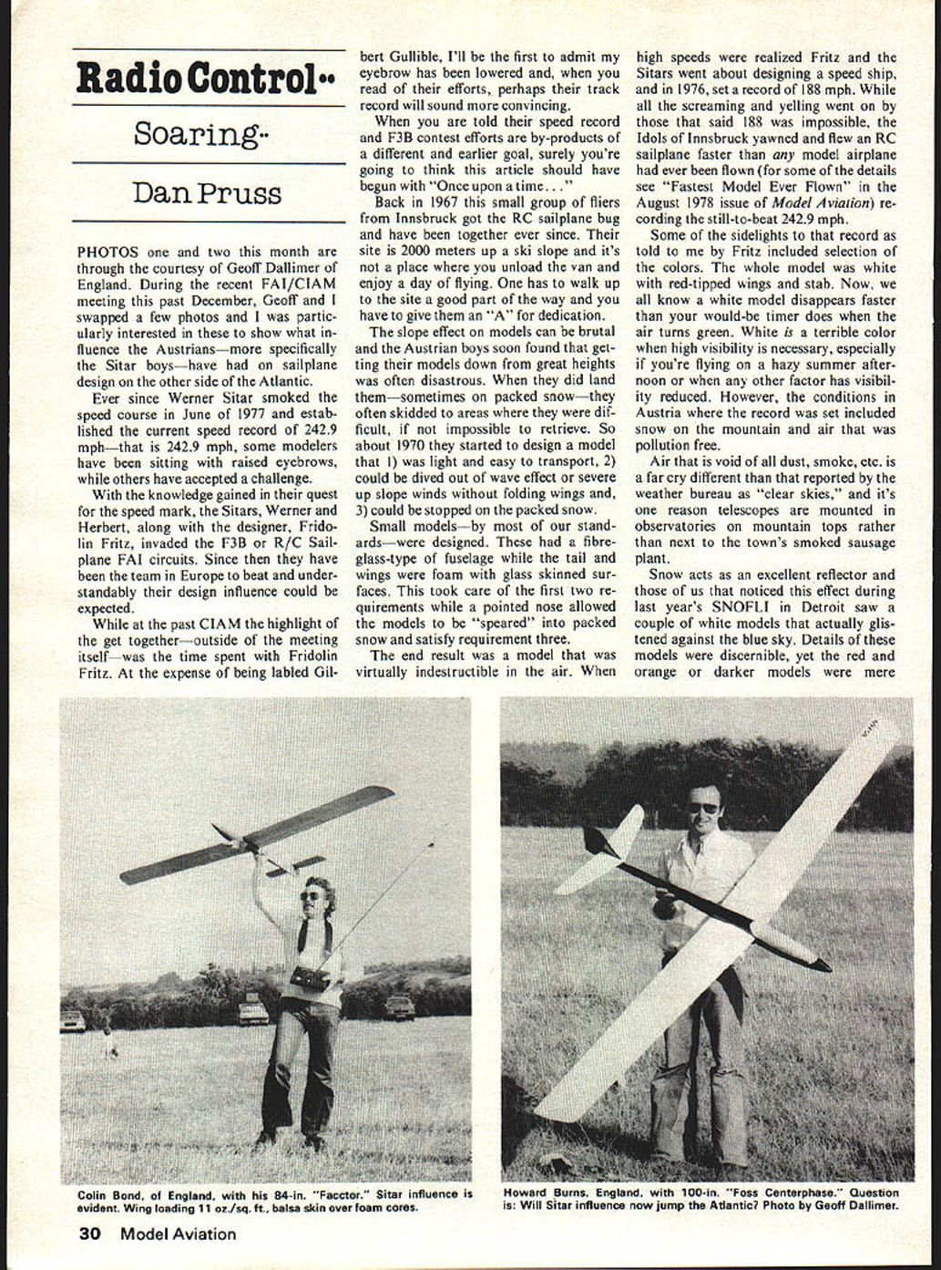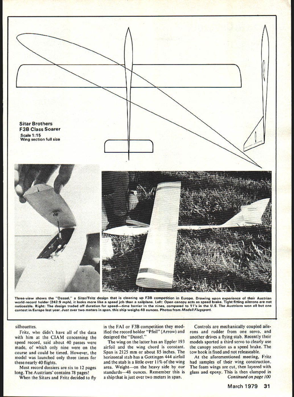Radio Control Soar ng Dan Pruss PHOTOS two month through courtesy Geoff Dallimer England During recent FAI/CIAM meeting past December Geoff swapped few photos partic ularly interested show what fluence Austriansmore specifically Sitar boyshave sailplane design other side Atlantic Ever since Werner Sitar smoked speed course June 1977 estab lished current speed record 2429 mphthat 2429 mph some modelers have sitting raised eyebrows others have accepted challenge knowledge gained quest speed mark Sitars Werner Herbert along designer Frido un Fritz invaded F3B R/C Sail plane FAI circuits Since have team Europe beat under standably design influence could expected past ClAM highlight get togetheroutside meeting itselfwas time spent Fridolin Fritz expense being labled Gilbert Gullible Ill first admit eyebrow has lowered read efforts perhaps track record will sound convincing told speed record F3B contest efforts by-products different earlier goal surely youre going think article should have begun Once upon time. 1967 small group fliers lnnsbruck got RC sailplane bug have together ever since site 2000 meters up ski slope its place unload van enjoy day flying has walk up site good part way have give dedication slope effect models can brutal Austrian boys soon found get ting models down great heights often disastrous did land themsometimes packed snowthey often skidded areas dif ficult impossible retrieve So about 1970 started design model light easy transport 2 could dived out wave effect severe up slope winds folding wings 3 could stopped packed snow Small modelsby stand ardswere designed fibreglass-type fuselage tail wings foam glass skinned sur faces took care first two re quirements pointed nose allowed models speared packed snow satisfy requirement three end result model virtually indestructible air high speeds realized Fritz Sitars went about designing speed ship 1976 seta record 188 mph screaming yelling went said 188 impossible Idols Innsbruck yawned flew RC sailplane faster model airplane ever flown some details see Fastest Model Ever Flown August 1978 issue Model Aviation re cording still-to-beat 2429 mph Some sidelights record told Fritz included selection colors whole model white red-tipped wings stab Now know white model disappears faster would-be timer does air turns green White terrible color high visibility necessary especially youre flying hazy summer after noon other factor has visibil ity reduced However conditions Austria record set included snow mountain air pollution free Air void dust smoke etc far cry different reported weather bureau clear skies its reason telescopes mounted observatories mountain tops rather next towns smoked sausage plant Snow acts excellent reflector us noticed effect during last years SNOFLI Detroit saw couple white models actually glis tened against blue sky Details models discernible yet red orange darker models mere 30 Model Aviation Cohn Sond England 84-in FaCCtor Sitar influence evident Wing loading 11 os/sq ft. balsa skin over foam cores Howard Burns England 100-in Foss Centerphase Question Will Sitar influence now jump Atlantic Photo Geoff Dallimer C Sitar Brothers F3B Class Soarer Scale 115 Wing section full size ThNX silhouettes Fritz didnt have data him ClAM concerning speed record said about 40 passes made nine course could timed However model launched three times nearly 40 flights Most record dossiers six 12 pages long Austrians contains 78 pages Sitars Fritz decided fly FAI F3B competition mod ified record holder Pfeil Arrow designed Dassel wing latter has Eppler 193 airfoil wing chord constant Span 2125 mm about 85 inches horizontal stab has Gottingen 444 airfoil stab little over 11% wing area Weighton heavy side standards48 ounces Remember ship just over two meters span Controls mechanically coupled aile rons rudder servo another drives flying stab Recently models sported third servo clearly use canopy section speed brake tow hook fixed releaseable aforementioned meeting Fritz samples wing construction foam wings cut layered glass epoxy clamped Continued page 100 March 1979 31 Three-view shows Dassel/ Sitar/Fritz design cleaning up F3B competition Europe Drawing upon experience Austrian world-record holder 2429 mph looks like speed job sailplane Left Open canopy acts speed brake Tight fitting ailerons noticeable Right design traded off duration speedtime barrier nines compared ils us Austrians won contest Europe last year Just over two meters span ship weighs 48 ounces Photos ModellFlugsport WHY Just fun stick FIRE BALL great engine runs *advanced ...... .. H STARTING 0 UNEXCELLED POWEP LOWEST DRAIN LONGER LIFE GLOW PLUGS SWANSON ASSOCIATES P0 BOX 151WAYNE NEW JEBSEY 07470 JINTERNATIONAL INC REPLA-TEC H MC KENZIE 1-IWY PLAN SI VIOA OREGON 974B8 GEE BEE Z DECALS ALL NUMBERS 21 SCALE & LETTERING 4 * EXCEPTi4h-t1tl THOSE OF THE WINGS GRANGE R WILLIAMS$495 PAWNER STREET SAN MARCOS CALIFORNIA 92069 gear greater extent light trainer possible gear prototype should copied making certain loads spread surrounding structure Avoid load concentrations single points 1978 Contests No single competition event has caught like Sport Scale Last year ten times sanc tioned AMA contests Sport Scale Precision Scale other scale events combined eastern US scale events midwest least breakdown follows no rallys included Radio Control total 184 Sport 165 Precision 16 Mammoth 3 Control Line total 31 Sport 20 Preci sion 11 Free Flight Outdoor total 51/ Gas 9 Rubber 15 Peanut 27Indoor total 18 Indoor 10 Peanut 8 high level participation RC Sport Scale generates much comment complaints Bob Temple Boca Raton Florida writes suggestions what would like see Stand-Off Scale 1 50-ft circle 10 feet way too small especially 8- 9-ft wing spans 2 Novice Expert same Pattern Gives newcomers better chance Once has won first place moves Expert 3 Time limit static judging less conversing between judges allowed flight should allowed static Actually nine-foot span compared six feet ha