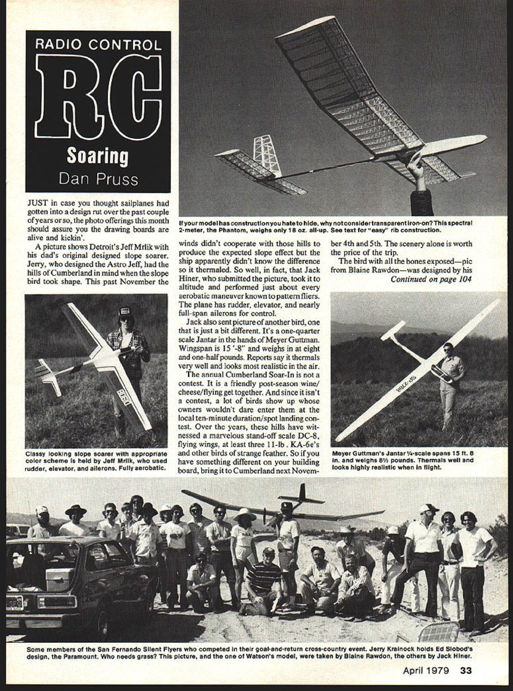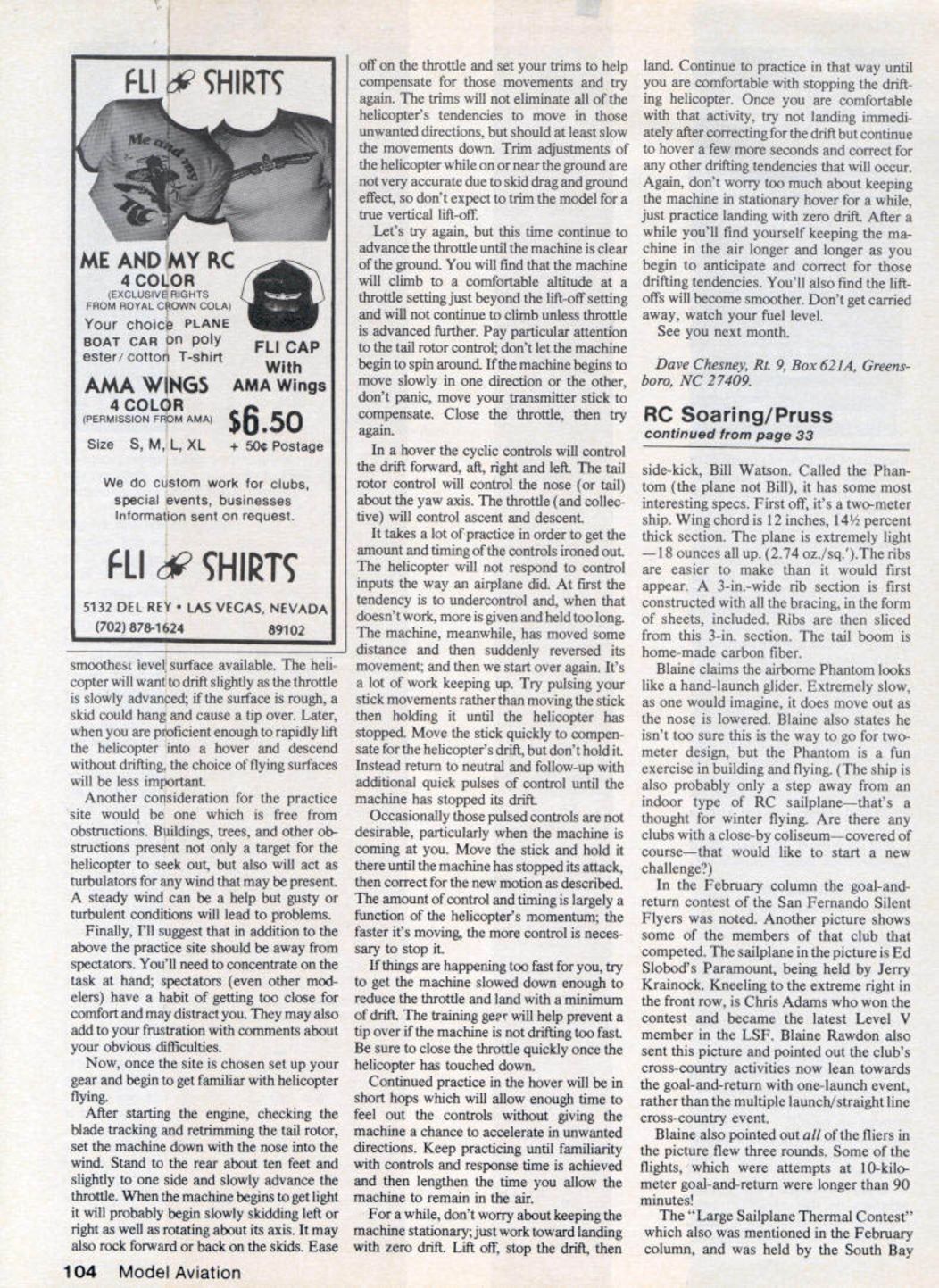 JUST case thought sailpianes gotten design rut over past couple years photo offerings month should assure drawing boards alive kickin picture shows Detroits Jeff Mrlik dads original designed slope soarer Jerry designed Astro Jeff hills Cumberland mind slope bird took shape past November winds didnt cooperate hills produce expected slope effect ship apparently didnt know difference thermaled So well fact Jack Hiner submitted picture took altitude performed just about aerobatic maneuver known pattern fliers plane has rudder elevator nearly full-span ailerons control Jack also sent picture another bird just bit different Its one-quarter scale Jantar hands Meyer Guttman Wingspan 15 -8 weighs eight one-half pounds Reports say thermals very well looks realistic air annual Cumberland Soar-In contest friendly post-season wine cheese/flying get together since isnt contest lot birds show up owners wouldnt dare enter local ten-minute duration/spot landing con test Over years hills have wit nessed marvelous stand-off scale DC-8 flying wings least three 11-lb KA-6es other birds strange feather So have something different building board bring Cumberland next Novem ber 4th 5th scenery alone worth price trip bird bones exposedpic Blame Rawdonwas designed Continued page 104 Some members San Fernando Silent Flyers competed goal-and-return cross-country event Jerry Krainock holds Ed Slobods design Paramount needs grass picture Watsons model taken Blame Rawdon others Jack i-liner April 1979 33 model has constructlonyou hateto hide notconsidertransparent Iron-on spectral 2-meter Phantom weighs 18 oz all-up See text easy rib construction Classy looking siope soarer appropriate color scheme held Jeff Mrlik used rudder eievator alierons Fuiiy acrobatic Meyer Guttmans Jantar /4-scale spans 15 TI hs 8/2 pounds Thermals weli iooks highly realistic flight 1 n poly T-shirt NGS M AMA $650 50$ Postage stom work clubs vents businesses sent request Size 5 M L XL CI special Inforrna FLI 5132 DEL RE 702 878-1 LAS VEGAS NEVADA i24 89102 smoothesc level surface available hellcopter will wani drift slightly throttle slowly advan ed surface rough skid could hanj cause tip over Later YOU pi oficient enough rapidly lift helicopter hover descend drifting choice flying surfaces will less important Another coijsideration practice site would free obstructions s other ob structions presnt target helicopter seek out also will act turbulators wind may present steady wind can help gusty turbulent conditions will lead problems Finally Ill suggest addition above practice site should away spectators Yoill need concentrate task hand spectators other mod elers have habit getting too close comfort may distract may also add frustration comments about obvious difficulties Now once site chosen set up gear begin get familiar helicopter flying After starting engine checking blade tracking retrimming tail rotor set machine down nose wind Stand rear about ten feet slightly side slowiy advance throttle machine begins get light will probably begin slowly skidding left right well rotating about its axis may also rock forward back skids Ease off throttle set trims help compensate movements try again trims will eliminate helicopters tendencies move unwanted directions should least slow movements down Trim adjustments helicopter near ground very accurate due skid drag ground effect dont expect trim model true vertical lift-off Lets try again time continue advance throttle until machine clear ground will find machine will climb comfortable altitude throttle setting just beyond lift-off setting will continue climb unless throttle advanced further Pay particular attention tail rotor control dont let machine begin spin around machine begins move slowly direction other dont panic move transmitter stick compensate Close throttle try again hover cyclic controls will control drift forward aft right leR tail rotor control will control nose tail about yaw axis throttle collec tive will control ascent descent takes lot practice order get amount timing controls ironed out helicopter will respond control inputs way airplane did first tendency undercontrol doesnt work given held too long machine meanwhile has moved some distance suddenly reversed its movement start over again Its lot work keeping up Try pulsing stick movements rather moving stick holding until helicopter has stopped Move stick quickly compen sate helicopters drift dont hold Instead return neutral follow-up additional quick pulses control until machine has stopped its drift Occasionally pulsed controls desirable particularly machine coming Move stick hold until machine has stopped its attack correct new motion described amount control timing largely function helicopters momentum faster its moving control neces sary stop things happening too fast try get machine slowed down enough reduce throttle land minimum drift training geer will help prevent tip over machine drifting too fast sure close throttle quickly once helicopter has touched down Continued practice hover will short hops will allow enough time feel out controls giving machine chance accelerate unwanted directions Keep practicing until familiarity controls response time achieved lengthen time allow machine remain air awhile dont worry about keeping machine stationary just work toward landing zero drill Lift off stop drift land Continue practice way until comfortable stopping drift ing helicopter Once comfortable activity try landing immedi ately after correcting drift continue hover few seconds correct other drifting tendencies will occur Again dont worry too much about keeping machine stationary hover just practice landing zero drift After youll find yourself keeping ma chine air longer longer begin anticipate correct drifting tendencies Youll also rind lift offs will become smcother Dont get carried away watch fuel level See next month Dave Chesney RL 9 Box 621A Greens boro NC 27409 RC Soaring/Pruss continued page 33 side-kick Bill Watson Cal
