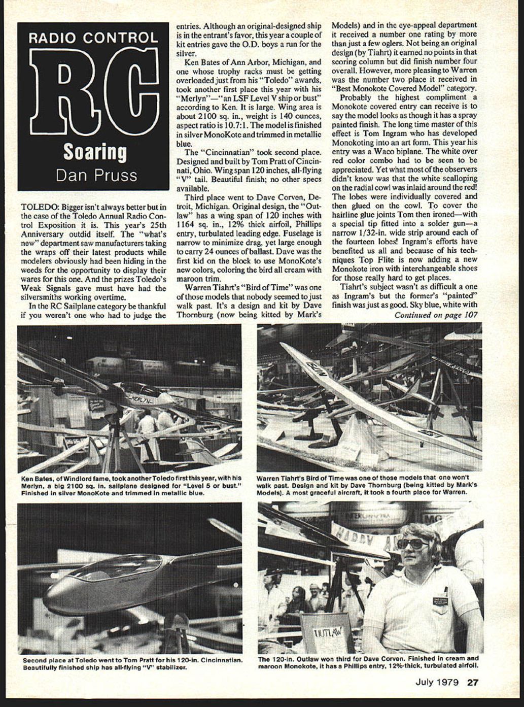 TOLEDO Bigger isnt always better case Toledo Annual Radio Con trol Exposition years 25th Anniversary outdid itself whats new department saw manufacturers taking wraps off latest products modelers obviously hiding weeds opportunity display wares prizes Toledos Weak Signals gave must have silversmiths working overtime RC Sailplane category thankful werent judge entries Although original-designed ship entrants favor year couple kit entries gave OD boys run silver Ken Bates Ann Arbor Michigan trophy racks must getting overloaded just Toledo awards took another first place year Merlyn"an LSF Level V ship bust according Ken large Wing area about 2100 sq weight 140 ounces aspect ratio 1071 model finished silver MonoKote trimmed metallic blue Cincinnatian took second place Designed built Tom Pratt Cincin nati Ohio Wing span 120 inches all-flying V tail Beautiful finish no other specs available Third place went Dave Corven De troit Michigan Original design Out law has wing span 120 inches 1164 sq 12% thick airfoil Phillips entry turbulated leading edge Fuselage narrow minimize drag yet large enough carry 24 ounces ballast Dave first kid block use MonoKotes new colors coloring bird cream maroon trim Warren Tiahrts Bird Time models nobody seemed just walk past Its design kit Dave Thomburg now being kitted Marks Models eye-appeal department received number rating just few oglers being original design Tiahrt earned no points scoring column did finish number four overall However pleasing Warren number two place received Best Monokote Covered Model category Probably highest compliment Monokote covered entry can receive say model looks though has spray painted finish long time master effect Tom Ingram has developed Monokoting art form year entry Waco biplane white over red color combo seen appreciated Yet what observers didnt know white scalloping radial cowl inlaid around red lobes individually covered glued cowl cover hairline glue joints Tom ironedwith special tip fitted solder guna narrow 1/32-in wide strip around fourteen lobes Ingrams efforts have benefited us because tech niques Top Flite now adding new Monokote iron interchangeable shoes really hard get places Tiahrts subject wasnt difficult Ingrams formers painted finish just good Sky blue white Continued nate 107 July1979 27 en uales gj winujoro Temu 1ouiuu.vr edo flrstthis year Merlyn big 2100 sq sailplane designed Level 5 bust Finished silver MonoKote trimmed metallic blue Warren Tlahrts Bird Time models wont walk past Design kit Dave Thornburg being kitted Marks Models graceful aircraft took fourth place Warren econa place Toledo went Tom Pratt 1 20-in Cincinnatian Beautifully finished ship has all-flying V stabilizer 120-in Outlaw won third Dave Corven Finisneci cream ano maroon Monokote has Phillips entry 1 2%-thick turbulated airfoil THE ONLY THREADED COUPLER WITH THE SLOT THAT HITS THE SPOT 0esOu~s roei,v Just simple slot takes guesswork out soldering wire coupler slot lets see sure solder has flowed around wire Sullivan 2/56 Threaded Brass Coupler Leave Marty Sullivan little things mean much s Sullivan touch Insist slot chamfer shoulder too BC 6/7 00 SMOOOTH LANDINGS 74 K Strong lightweight REALISTIC landing gears eliminate erratic vibra tion feature short fulcrum ground hugging ability Caster ac tion Adjustable pressure Easy customize Sizes fit wheels 1 3 AND NOW THERES FUELER WITh TRUE FILTER SYSTEM TOO Get double filtration perform ance Sullivan Crap Trap fuel up too Two different sized filters keep particles out tank Fueler comes complete 4 feet Sulli-Cone tubing 3 feet lesser quality tubing tubing WONT COLLAPSE defueling Only $250 P R 0 D U C T S N C 585 DAVISVILLE ROAD OW GROVE PA 19090 215 650-3900 sizes ideal operating features Pinions pinion wire helical gears worms worm gears molded miter gears various mate rials bevel gears spur gears ball bearings bores small milli meter 0469 just few ofthe items Handbook Stock Gears catalog SDP 75 $295 postpaid second catalog interest scale modelers lists belt chain drives list includes toothed timing belts polyure thane elastomer reinforced polyester cord sizes small 047 thick 125 wide range toothed pulleys aluminum fiberglass reinforced Lexan steel molded fiberglass Delrin match Also listed polyester cord flat belts pulleys V-belts round belts chain drives 218 page Handbook Small Belt Chain Drive catalog SDP 651 $195 postpaid address Stock Drive Products 55 South Denton Ave New Hyde Park NY 11040 Bob Dolly Wischer Rt 1 S-221 Lapham Peak Road Delafleld WI 5301& RC Soaring/Pruss continued page 27 dark blue trim color combo really set off rest Its always peeve scribe display type Toledo past sailplanes werent class selves regards finish detailing no pollution generator up front fact models well outlast couple flying seasons Im speaking others theres little reason sailplanes being show stoppers Hopefully Bates Pratt Corven Tiahrt have set pace Seen heard about Toledo Besides maroon-and-cream Monokote men tioned two new colors available gold burnt red Top Flite Models Inc 1901 N Narragansett Ave Chicago IL 60639 free Monokote sample 12-page catalog send 50 cents above address Cox Hobbies showed new Aquila Grande fiber glass fuselage Kit quality best tradition Lee Renaud wide range radios also displayed Call Cox action hotline 800 8543544 California 18004327277 write Cox Hobbies Inc 1505 E Warner Ave Santa Ana Ca 92702 Craft-Air Tom Williams showed Viking Tom pointed out comes choice rib sections modeler can purchase second other wing direct Craft-Air discount wing uses 11-percent flat-bottom airfoil other 12-percent semi-symmetrical wing Write Craft-Air Inc 20115 Nord hoff St Chatsworth CA 91311 Fab-Tek Inc showed new sport winch light-weight package thought body-building program pre requisite toting launching devices will allow use PLANS7 MAP range plans England largest compre hensive world Buy plans handbook find out yourself handbook contains full details of thousands plans prices plans av