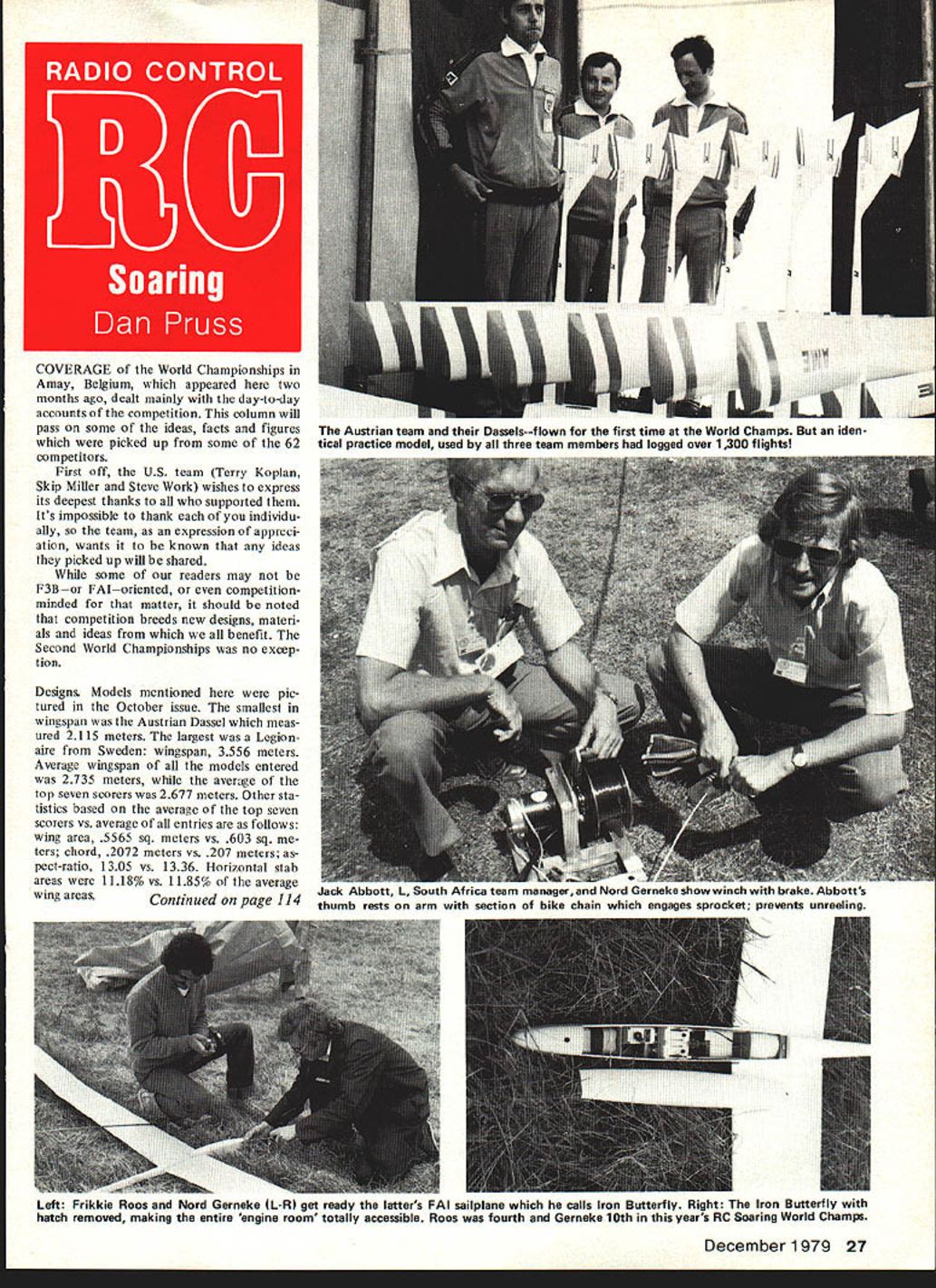 COVERAGE World Championships Amay Belgium appeared two months ago dealt mainly day-to-day accounts competition column will pass some ideas facts figures picked up some 62 competitors First off US team Terry Koplan Skip Miller Steve Work wishes express its deepest thanks supported Its impossible thank individu ally team expression appreci ation wants known ideas picked up wlll shared some readers may F3Bor FAI--oriented competitionminded matter should noted competition breeds new designs maten als ideas benefit Second World Championships no excep tion Designs Models mentioned pic tured October issue smallest wingspan Austrian Dassel meas ured 2115 meters largest Legion aire Sweden wingspan 3556 meters Average wingspan models entered 2735 meters average top seven scorers 2677 meters Other sta tistics based average top seven scorers vs average entries follows wing area 5565 sq meters vs 603 sq ters chord 2072 meters vs 207 meters pect-ratio 1305 vs 1336 Horizontal stab areas 1118% vs 1185% average wing areasContinued page 114 December 1979 27 Austrian team Dasselsflown first time World Champs iden tical practice model used three team members logged over 1300 flights ac PDDUII L OUtfl Mince seeni rnenaguraIIu ,Jord Gurimee.uw vvr,, i uee IuU~L b rests arm section bike chain enaaaes sorocket orevents unreelina Lets 1-rIRKIe KOOS ano Nord Gerneke L-R get reaay iauers I-Al sailplane calls Iron Butterfly Right Iron Butterfly hatch removed making entire engine room totally accessible Roos fourth Gerneke 10th years RC Soaring World Champs Maybe could have new muffler rule specify type mufflerthat Art uses very effective No muffler would able fly field Without dissenting vote might able Maybe can halt helicopter flying field 9 11 am Sunday can done What have trying say order let feelings known have speak out what better place meeting says club clubs matter Ron Van Putte 12 Connie Drive Shalimar FL 32579 Safety First/Preston continued tram page 24 bleachers surrounding ball field fellow holding model fell over edge bleachers after struck stomach chuck drill being used winder inadvertently became de tached Fortunately no serious injury sustained Some incidents no injury resulted can quite amusing However cause serious injury death can shocking gruesome have no doubt some derogatory comments will result col umn hope readers will appreci ate efforts make think twice before repeating hazardous practice have described thereby avoid sometimes dire consequences column full-scale aircraft magazine Flying titled Learned About Flying Can learn something about model flying column hope John Preston 7012 Elvira Court Falls Church VA 22042 RC Soaring/Pruss continued page 27 Average weights models three tasks follows based statisti cal data supplied contestants before contest some weights may have varied during actual competition Average weight top seven scorers vs average fliers Duration 1629 kg vs 1606 kg Distance 1837 kg vs 1612 kg Speed 2203 kg vs 2343 kg Average wing loadings Duration 3115 kg/sq m vs 2664 kg/sq m Distance 375 kg/sq m vs 267 kg sq m Speed 43 kg/sq m vs 3885 kg/sq m Austrians Dassels within grams other six models two per flier Probably im pressive things after week practice watching Austrian team use plane three fllers see team process six brand new birdsnever flown contest opposite end design spectrum South Africans built-up wings least two plywoodbalsa fuselages Both teams fought out first place South Africans winning team honors fraction percentage point Austrian Wackerle won individual honors similar slim margin Another contrast involving two top teams Austria hand-towed exclusively South Africans used winch Inci dentally latter group effective drum brake consisting bicycle rear wheel sprocket attached side drum An arm small section bi cycle chain flipped up allow line re trieval engaged sprocket launching progress Line could taken inch could let out Pagliano Italy Allure head-turner whenever appeared fly party interesting side note South Africa two years ago Pagliano tore up hori zontal stab looked like something bor rowed Wakefield model least seemed because fragile-like stab contrasted foam glass wing fiberglass fuselage time Any way Skip Miller repaired stab Pagli ano using MonoKote two became fast friends first person Pagliano visited Belginm Skip show him Mono Koted Allure What interesting Allure its built-up wing stab such de parture other European designs first time speed course turned 106-second run Lack flying experience Paglianos own admissionprevented Allure placing better model selected carrying current state-of-the-art nth degree still maintaining overall appearance full-scale sailplane would Deckers Germany Spending nearly 1700 man-hours wing mold alone indicates degree precision perfection Decker teammates put model construction time necessary world class competition Look 114 Model Aviation Scale Plans GEE BEE Z1932 GEE BEE- Ri 00 2 00 Both used GRANGER WILLIAMS 1932 HALL RACER /2 3 span t Scale MONOCOUPE 110 1940 Culver Cadet Clip-wing 21$10 1 00 Const parts plotted plans established scale accuracy de tailAdd own system form flight desired POST PAID Vein Clements Box 608 CaIdwell Idaho 83605 lilt WSIUN UAIAFiLL C ALL UIHtCIIUNS Heres equipmant need give props Toe very nest balance--balance e directions Carefully crafted top grade materials BUBBLE BALANCEII accomodates 3/161/49/32 prop holes lkher Szes avallaltle special order Dealers invited $1495 Add $150 HOWARD B HUEBL SEPT ODS stage handling hi Mien add 4% sales ba ie COOs Box 1 Route 4 Manlcato Mn 561 writing advertisers mention read about Model Aviation rORLINE RICS NEWEST CREATION DEWEYVILLE SPECIAL Trainer FOKKER DV1 1 Kit 0L781 $9750 Retail SEE YOUR DEALER OR DER DIRECT POST-PAID Dealer & Distributor Inquiries Invited Totally New Design Wing Aileron Permits OneNight Assembly 74 Wing Span 12 Consistance Chord Clark Y Wing Total Wing Area 864 Sq Plus Lifting Stab Quick Construction Box Fuselage Die-Cut Formers o Fool 