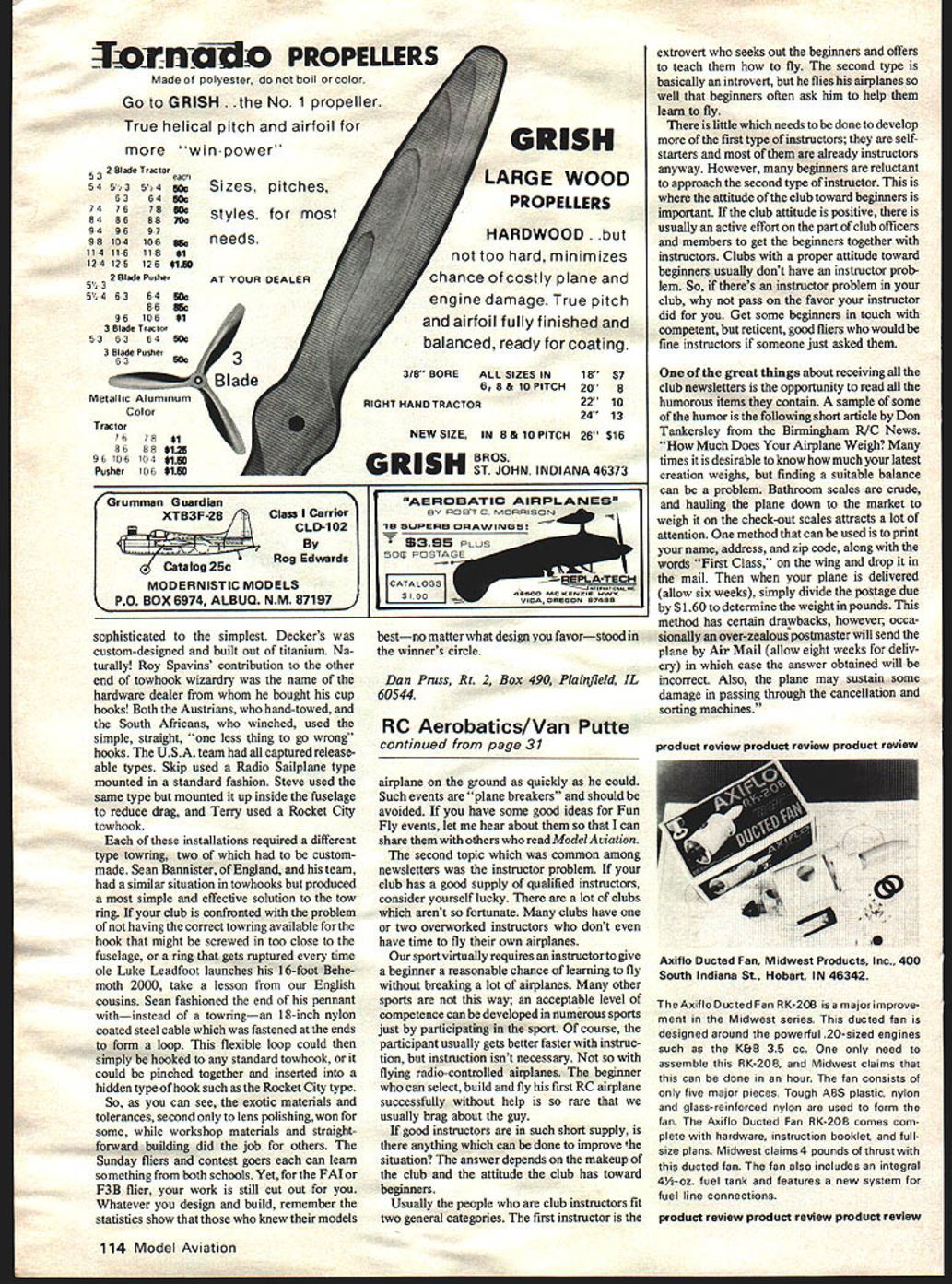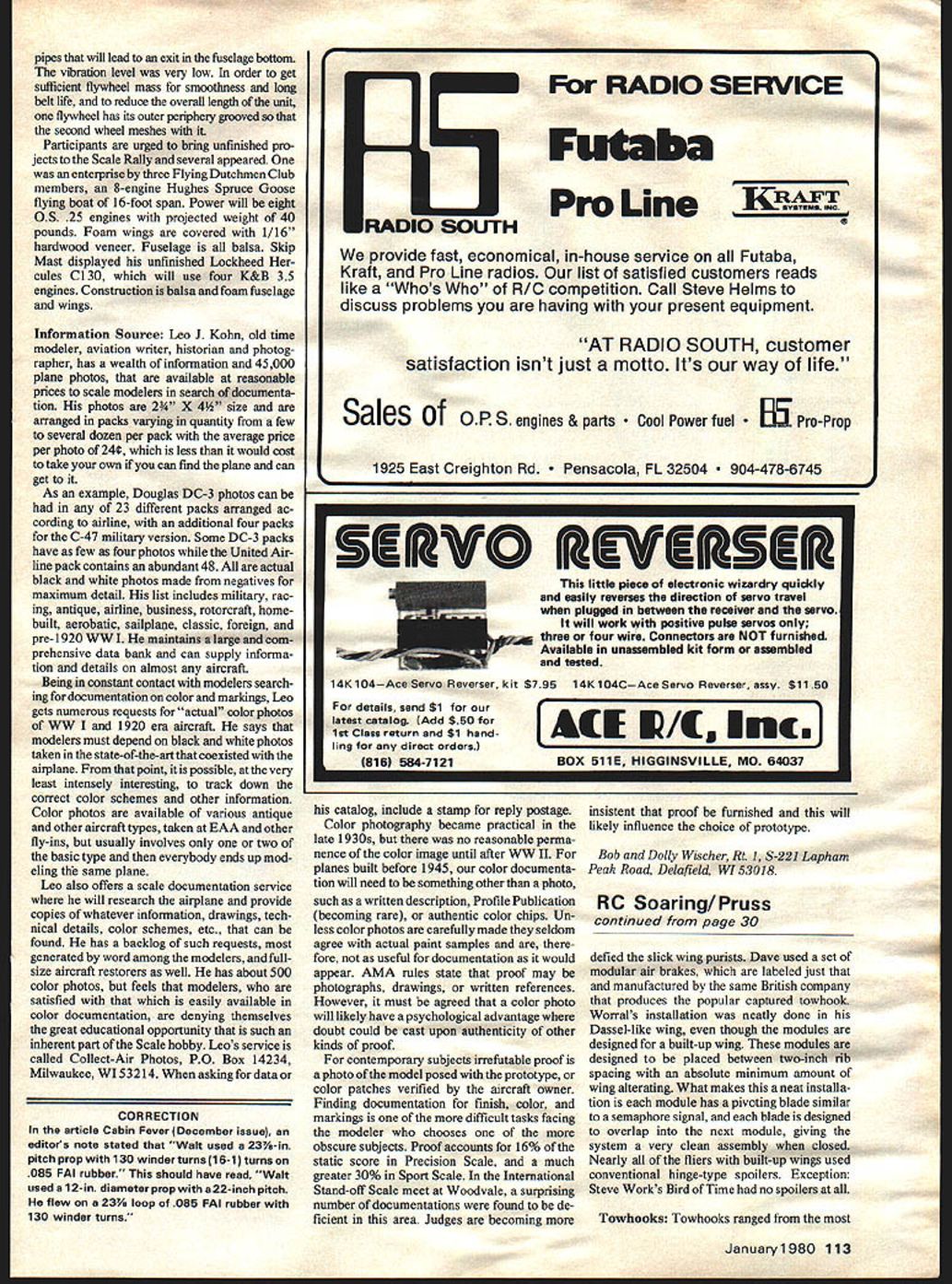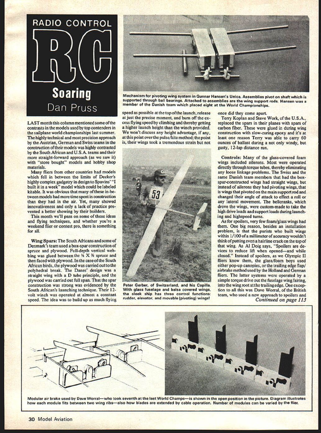 LAST month column mentioned some contrasts models used top contenders sailplane world championships last summer highly technical precision approach Austrian German Swiss teams construction models highly contrasted South African U SA teams andtheir straight-forward approach saw store bought models hobby shop materials fliers other countries models fell between limits Deckers highly complex gadgetry design Spavins built week model could labeled kitable obvious in-be tween models time spent construction air Yet showed innovativeness lack practice pre vented better showing builders month well pass some ideas flying techniques whether youre weekend flier contest pro something Wing Spars South Africans some Denmarks team used box-spar construction spruce plywood Full-depth vertical web bing glued between spruce faced plywood case South African birds plywood carried out polyhedral break Danes design straight wing D tube principle plywood carried out full span spar construction strong evidenced South Africans launching technique 12volt winch operated almost constant speed idea build up much flying speed possible top launch release just precise moment burn off ex cess flying speed climbing thereby getting higher launch height winch provided wont discuss height advantage point over pulse/kite method point wings took tremendous strain once did come apart Terry Koplan Steve Work USA replaced spars planes spars carbon fiber glued during wing construction slow-curing epoxy its least reason Terry able carry 60 ounces ballast during windy gusty 12-lap distance run Controls Many glass-covered foam wings included ailerons Most operated directly through torque tubes thereby eliminating loose linkage problems Swiss same Danish team members boxspar-constructed wings straight wings instead ailerons pivoting wings wings pivoted main support rod changed angle attack effect roll lateral movement bellcranks drove wings custom-made take high drive loads support loads during launch ing highspeed turns As spoilers very few foam/glass wings big reason besides installation problem purists built wings within 1/100 millimeter accuracy wouldnt think putting hairline crack top wing As Al Doig says Spoilers de vices reduce lift openedand closed Instead spoilers Olympic II fliers know glass/foam boys used either pop-up canopies trailing edge flap/ airbrake method used Holland German fliers latter systems operated simple torque drive out fuselage wing fairing wing root trailing edge excep tion Dave Worral British team used new approach spoilers Continued page 113 30 Model Aviation Mechanism pivoting wing system Gunnar Hansens Unica Assemblies pivot shaft supported through ball bearings Attached assemblies wing support rods Hansen member Danish team placed eight World Championships Peter Gerber Switzerland Capilla glass fuselage balsa covered wings sleek ship has three control functions rudder elevator movable pivoting wings Modular air brake used Dave Worralwho took seventh last World Champsis shown open position picture Diagram illustrates module fits between two wing ribsalso blades extended cable operation Number modules can varied flier pipes will lead exit fuselage bottom vibration level very low order get sufficient flywheel mass smootlmess long belt life reduce overall length unit flywheel has its outer periphery grooved second wheel meshes Participants urged bring unfinished pro jects Scale Rally several appeared enterprise three Flying Dutchmen Club members 8-engine Hughes Spruce Goose flying boat 16-foot span Power will eight 0S 25 engines projected weight 40 pounds Foam wings covered 1/16 hardwood veneer Fuselage balsa Skip Mast displayed unfinished Lockheed cules Cl 30 will use four K&B 35 engines Construction balsa foam fuselage wings Information Source Leo J Kohn old time modeler aviation writer historian photog rapher has wealth information 45000 plane photos available reasonable prices scale modelers search documenta tion photos 2 X 4W size arranged packs varying quantity few several dozen per pack average price per photo 24 less would cost take own can find plane can get As example Douglas DC-3 photos can 23 different packs arranged ac cording airline additional four packs C-47 military version Some DC-3 packs have few four photos United Air line pack contains abundant 48 actual black white photos made negatives maximum detail list includes military rac ing antique airline business rotorcraft home built aerobatic sailplane classic foreign pre-1920 WW maintains large com prehensive data bank can supply informa tion details almost aircraft Being constant contact modelers search ing documentation color markings Leo gets numerous requests actual color photos WW 1920 era aircraft says modelers must depend black white photos taken state-of-the-art coexisted airplane point possible very least intensely interesting track down correct color schemes other information Color photos available various antique other aircraft types taken EAA other fly-ins usually involves two basic type everybody ends up mod eling same plane Leo also offers scale documentation service will research airplane provide copies whatever information drawings tech nical details color schemes etc can found has backlog such requests generated word among modelers fullsize aircraft restorers well has about 500 color photos feels modelers satisfied easily available color documentation denying themselves great educational opportunity such inherent part Scale hobby Leos service called Collect-Air Photos PO Box 14234 Milwaukee WI 53214 asking data CORRECTION article Cabin Fever December issue editors note stated Walt used 23%- pitch prop 130 winder turns 16-1 turns 085 FAI rubber should have read Walt used 12-in diameter prop 22-inch pitch flew 23% loop 085 FAI rubber 130 winder turns r RADIO SERVICE Futaba IRADIO SOUTH Pro Line provide fast economical in-house service Futaba Kraft Pro Line radios list satisfied Customers reads like Whos R/C competition Ca