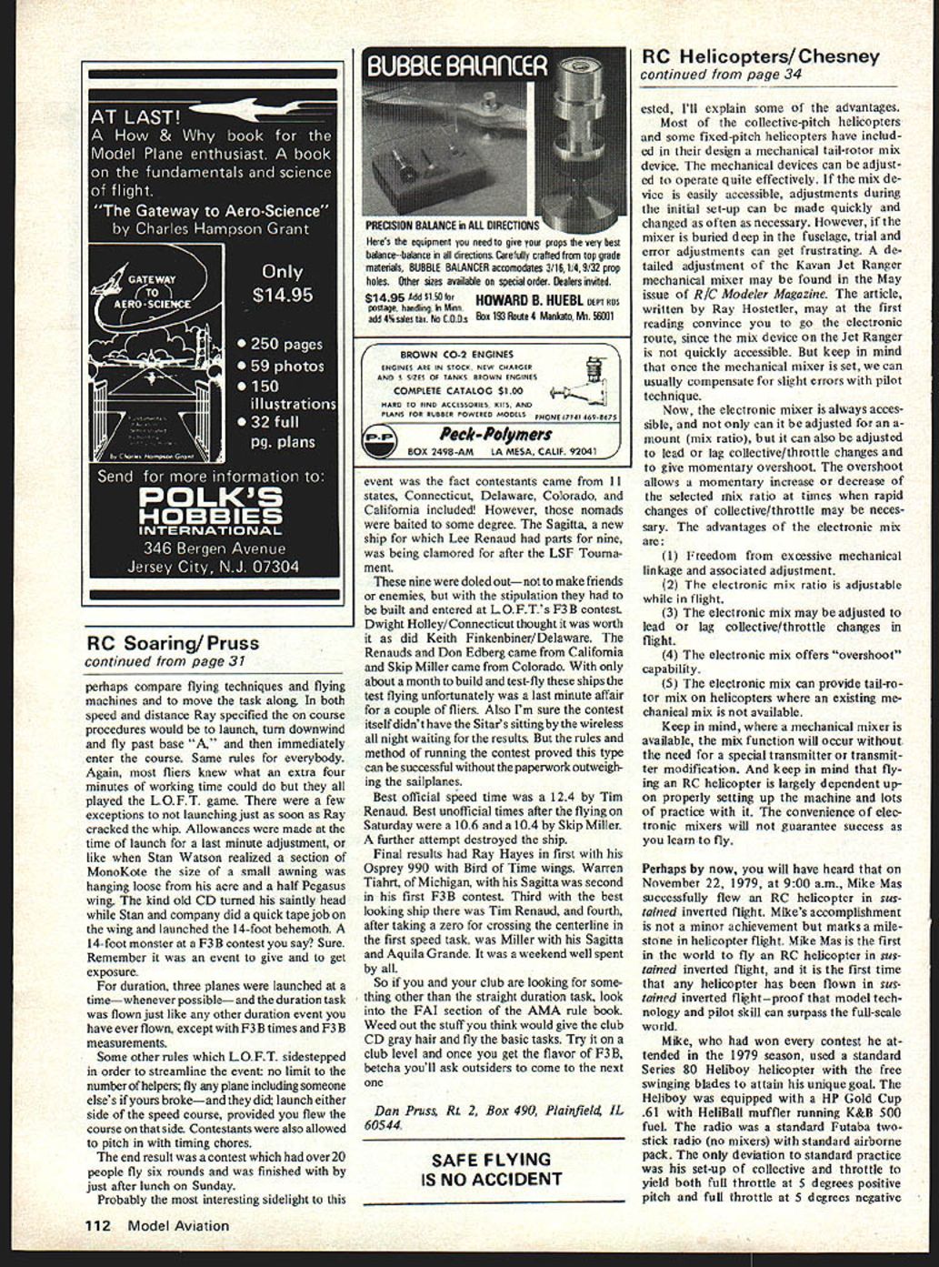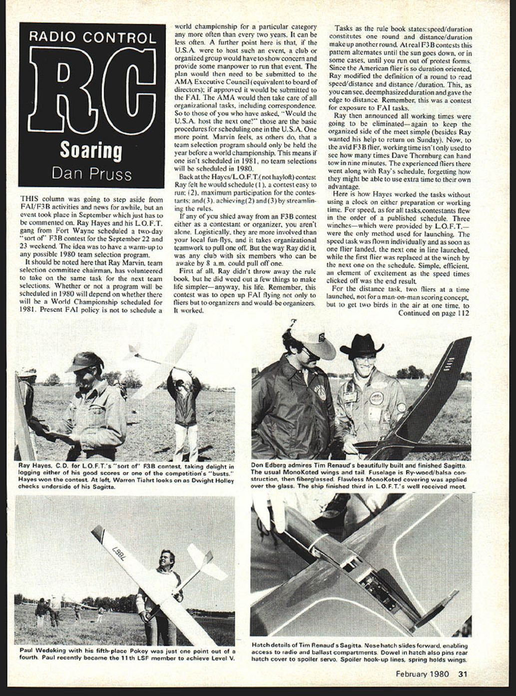 THIS column going step aside FAI/F3B activities news awhile event took place September just has commented Ray Hayes LOFT gang Fort Wayne scheduled two-day sort F3 B contest September22 23 weekend idea have warm-up possible 1980 team selection program should noted Ray Marvin team selection committee chairman has volunteered take same task next team selections Whether program will scheduled 1980 will depend whether will World Championship scheduled 1981 Present FAI policy schedule world championship particular category often two years can less often further point USA host such event club organized group would have show concern provide some manpower run event plan would need submitted AMA Executive Council equivalent board directors approved would submitted FAI AMA would take care organizational tasks including correspondence So have asked Would USA host next basic procedures scheduling USA point Marvin feels others team selection program should held year before world championship means isnt scheduled 1981 no team selections will scheduled 1980 Back atthe Hayes/LOFTnothayloft contest Ray felt would schedule contest easy run 2 maximum participation contes tants and3 achieving2 and3 streamlin ing rules shied away F3 B contest either contestant organizer arent alone Logistically involved local fun-flys takes organizational teamwork pull off way Ray did club six members can awake 8 am could pull off First af Ray didnt throw away rule book did weed Out few things make life simpleranyway life Remember contest open up FAI flying fliers organizers would-be organizers worked Tasks rule book statesspeed/duration constitutes round distance/duration make up another round real F3 B contests pattern alternates until sun goes down some cases until run out protest forms Since American flier duration oriented Ray modified definition round read speed/distance distance /duration can see deemphasized duration gave edge distance Remember contest exposure FAI tasks Ray announced working times going eliminatedagain keep organized side meet simple besides Ray wanted help return Sunday Now avid F3 B flier working time isnt used see times Dave Thornburg can hand tow nine minutes experienced fliers went along Rays schedule forgetting might able use extra time own advantage Hayes worked tasks using clock either preparation working time speed taskscontestants flew order published schedule Three wincheswhich provided LOFT method used launching speed task flown individually soon flier landed next line launched first flier replaced winch next schedule Simple efficient element excitement speed times clicked off end result distance task two fliers time launched man-on-man scoring concept get two birds air time Continued page 112 February 1980 31 4K nay nayes uu Tor LUl 5 sort i contest taking delight logging either good scores competitions busts Hayes won contest left Warren Tiahrt looks Dwight Holley checks underside Sagitta Don cuuuy aumnires Tim nunauu uuautiuiiy uuiit ariu iiiiisneu Oagiltd usual MonoKoted wings tail Fuselage Ry-wood/balsa con struction fiberglassed Flawless MonoKoted covering applied over glass ship finished third LOFTs well received meet Paul Wedeking Iinnpiace roey juss point out fourth Paul recently became 11th LSF member achieve Level V Hatch details Tim Renauds Sagitta Nose hatch slides forward enabling access radio ballast compartments Dowel hatch also pins rear hatch cover spoiler servo Spoiler hook-up lines spring holds wings perhaps compare flying techniques flying machines move task along both speed distance Ray specified course procedures would launch turn downwind fly past base immediately enter course Same rules everybody Again fliers knew what extra four minutes working time could played LOFT game few exceptions launching just soon Ray cracked whip Allowances made time launch last minute adjustment like Stan Watson realized section MonoKote size small awning hanging loose acre half Pegasus wing kind old CD turned saintly head Stan company did quick tape job wing launched 14-foot behemoth 14-foot monster F3 B contest say Sure Remember event give get exposure duration three planes launched timewhenever possible duration task flown just like other duration event have ever flown except F3 B times F3 B measurements Some other rules LOFT sidestepped order streamline event no limit number helpers fly plane including someone elses yours brokeand di4 launch either side speed course provided flew course side Contestants also allowed pitch timing chores end result contest over 20 people fly six rounds finished just after lunch Sunday Probably interesting sidelight BROWN CO-2 ENGINES ENGINES ARE N STOCK NEW CHARGER COMPLETE CATALOG $100 AND S SIZES OF TANKS BROWN ENGINES HARD TO FIND ACCDSSOBIER KITS AND PLANS FOR RUBBER POWDRED MODELS PHONE 714 469-8675 Peck-Polymers W BOX 2498-AMLA MESA CALIF 92041 event fact contestants came 11 states Connecticut Delaware Colorado California included However nomads baited some degree Sagitta new ship Lee Renaud parts nine being clamored after LSF Tourna ment nine doled outnot make friends enemies stipulation built entered L 0 F T s F3 B contest Dwight Holley Connecticut thought worth did Keith Finkenbiner/Delaware Renauds Don Edberg came California Skip Miller came Colorado about month build test-fly ships test flying unfortunately last minute affair couple fliers Also Im sure contest itself didnt have Sitars sitting wireless night waiting results rules method running contest proved type can successful paperwork outweigh ing sailplanes Best official speed time 124 Tim Renaud Best unofficial times after flying Saturday 106 104 Skip Miller further attempt destroyed ship Final results Ray Hayes first Osprey 990 Bird Time wings Warren Tiahrt Michigan Sagitta second first F3 B contest Third best looking ship Tim Renaud fourth after taking zero crossing centerline first speed task Miller Sagitta Aquila Grande weekend well spent alL So club looking some thing other strai