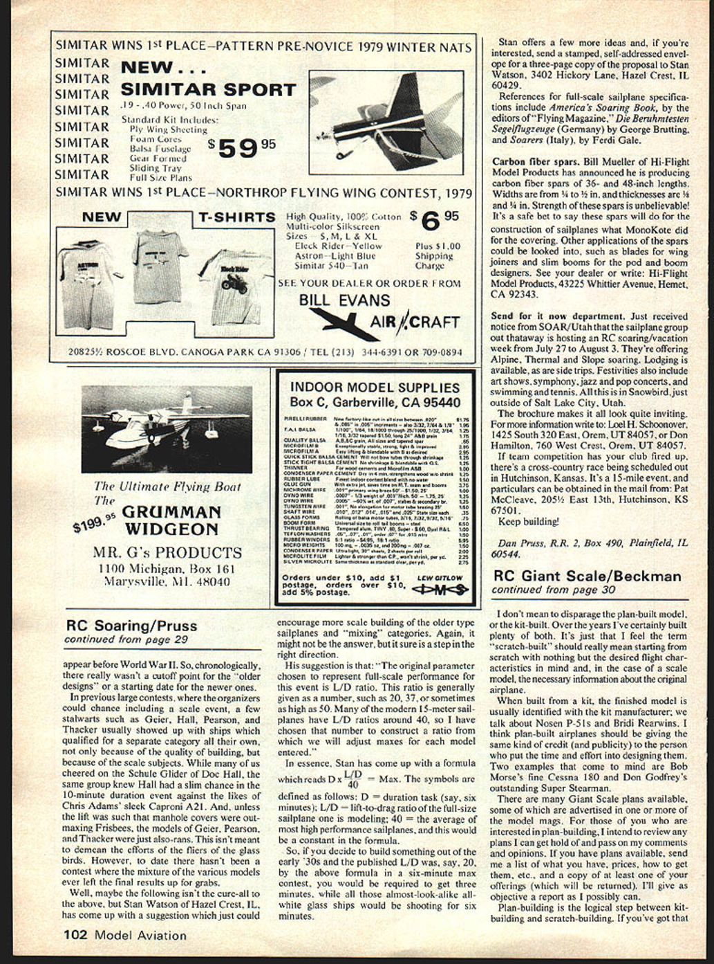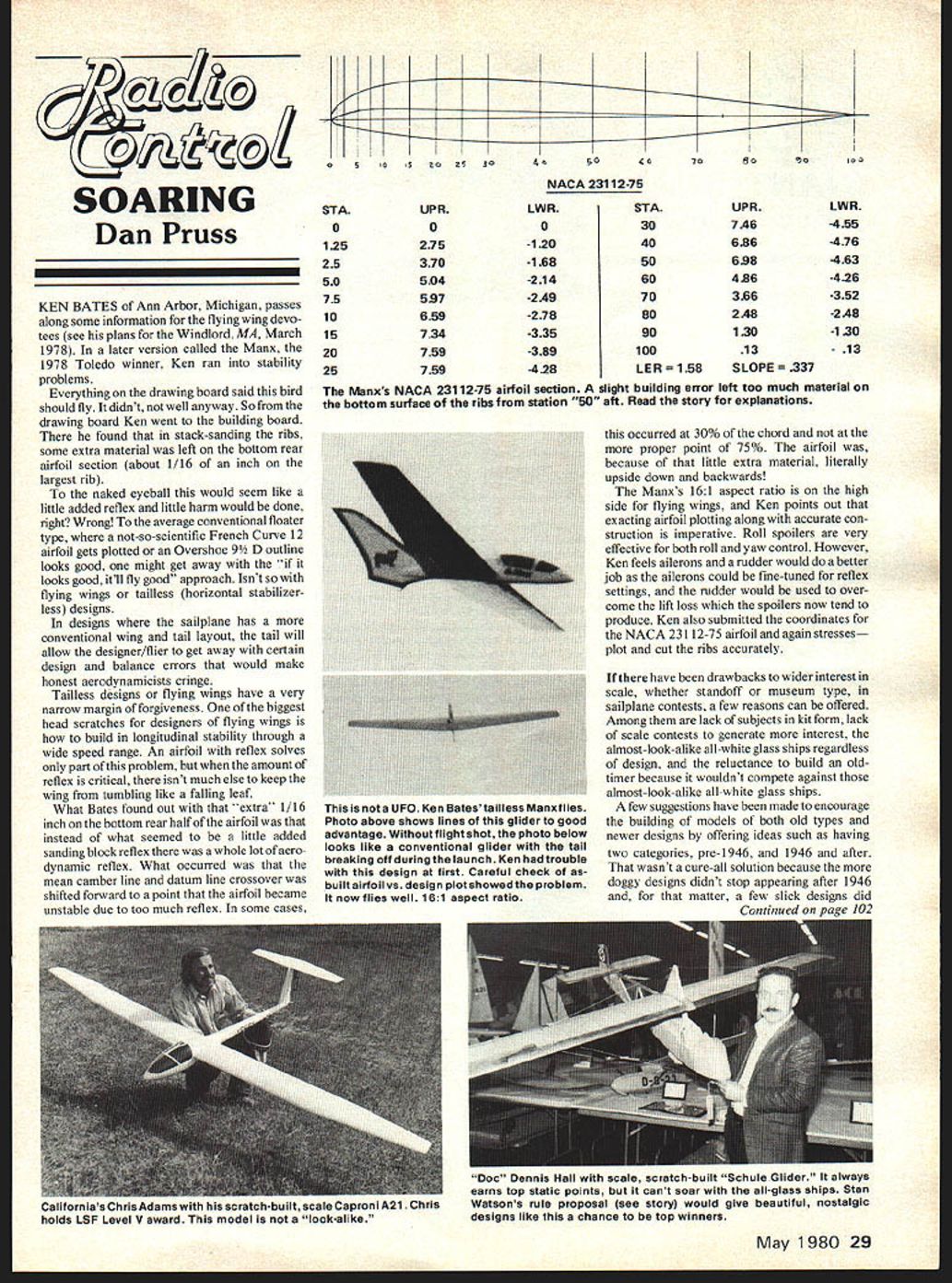 SOARING Dan Pruss KEN BATES Ann Arbor Michigan passes along some information flying wing devo tees see plans Windlord MA March 1978 later version called Manx 1978 Toledo winner Ken ran stability problems Everything drawing board said bird should fly didnt well anyway So drawing board Ken went building board found stack-sanding ribs some extra material left bottom rear airfoil section about 1/16 inch largest rib naked eyeball would seem like little added reflex little harm would done right Wrong average conventional floater type not-so-scientific French Curve 12 airfoil gets plotted Overshoe 9 D outline looks good might get away looks good itll fly good approach Isnt flying wings tailless horizontal stabilizerless designs designs sailplane has conventional wing tail layout tail will allow designer/flier get away certain design balance errors would make honest aerodynamicists cringe Tailless designs flying wings have very narrow margin forgiveness biggest head scratches designers flying wings build longitudinal stability through wide speed range An airfoil reflex solves part problem amount reflex critical isnt much else keep wing tumbling like falling leaf What Bates found out extra 1/16 inch bottom rear half airfoil instead what seemed little added sanding block reflex whole lot aero dynamic reflex What occurred mean camber line datum line crossover shifted forward point airfoil became unstable due too much reflex some cases STA 0 125 25 50 75 10 15 20 25 5S202510 UPR 0 275 370 504 5-97 659 734 759 759 450070do0oO NACA 23112-75 LWR 0 -120 -168 -214 -249 -278 -335 -389 -428 STA 30 40 50 60 70 80 90 100 LER UPR 7 A6 686 698 496 366 2 A8 120 13 SLOPE 337 LWR -455 -476 -463 -426 -352 -2 A8 -130 - 13 Manxs NACA 23112-75 airfoil section slight building error left too much material bottom surface ribs station 50 aft Read story explanations occurred 30% chord proper point 75% airfoil because little extra material literally upside down backwards Manxs 161 aspect ratio high side flying wings Ken points out exacting airfoil plotting along accurate con struction imperative Roll spoilers very effective both roll yaw control However Ken feels ailerons rudder would better job ailerons could fine-tuned reflex settings rudder would used over come lift loss spoilers now tend produce Ken also submitted coordinates NACA 23112-75 airfoil again stresses plot cut ribs accurately have drawbacks wider interest scale whether standoff museum type sailplane contests few reasons can offered Among lack subjects kit form lack scale contests generate interest almost-look-alike all-white glass ships regardless design reluctance build oldtimer because wouldnt compete against almost-look-alike all-white glass ships few suggestions have made encourage building models both old types newer designs offering ideas such having two categories pre-1946 1946 after wasnt cure-all solution because doggy designs didnt stop appearing after 1946 matter few slick designs did Continued May 1980 29 UFO Ken Batestailless Manxflies Photo above shows lines glider good advantage Without flight shot photo below looks like conventional glider tail breaking off duringthe launch Ken hadtrouble design first Careful check builtairfoilvs design plotshowedtheproblem now flies well 161 aspect ratio Californias Chris Adamswith scratch-built scale Caproni A21 Lnrls holds LSF Level V award model look-alike Doc Dennis Hall scale scratch-built Schule Glider always earns top static points cant soar all-glass ships Stan Watsons rule proposal see story would give beautiful nostalgic designs like chance top winners SIMITAR WINS 1St PLACEPATTERN PRE-NOVICE 1979 WINTER NATS SIMITAR NEW. SI MI TAR SIMITAR SIMITAR SPORT SIMITAR 19 40 Power 50 Inch Span SIMITAR Standard Kit includes Ply Wing Sheeting SIMITARBdlsdFuseiage$5995 SIMITARGear Formed Sliding Tray SIMIlARFull Site Plans SIMITAR WINS 1St PLACENORTHROP FLYING WING CONTEST 1979 NEWT-SHIRTS High Quality 1000 n $ ulti-color Silkscreen U Sites SML&XL Eleck Rider Yellow Plus $100 Asiron Light Blue Shipping Simitar 540--Tan Charge SEE YOUR DEALER OR ORDER FROM BILL EVANS ~AIR/CRAFT 20825 ROSCOF BLVD CANOGA PARK CA 91306 TEL 213 344-6391 OR 709-0894 GRUMMAN WIDGEON MR Gs PRODUCTS 1100 Michigan Box 161 Mai-ysville Nil 4804 RC Soaring/Pruss continued page 29 appear before World War II So chronologically really wasnt cutoff point older designs starting date newer ones previous large Contests organizers could chance including scale event few stalwarts such Geier Hall Pearson Thacker usually showed up ships qualified separate category own because quality building because scale subjects us cheered Schule Glider Doc Hall same group knew Hall slim chance 10-minute duration event against likes Chris Adams sleek Caproni A21 unless lift such manhole covers out maxing Frisbees models Geier Pearson Thacker just also-rans isnt meant demean efforts fliers glass birds However date hasnt contest mixture various models ever left final results up grabs Well maybe following isnt cure-all above Stan Watson Hazel Crest IL has come up suggestion just could INDOOR MODEL SUPPLIES Box C Garberville CA 95440 PIRELLI RUBBER9e leteyIIhscI siase between 0206176 & ORb OUS in,insnne 3/32 7/64 & 116196 FAI BALSA1/lOK 1/64 10/IUU0thoagh25/1600 1/32 3/64126 1/163/32 esReed 9150 long 24 A&B gsi175 QUALITY BALSAAB&C gein sizes tepssd soar65 MICROFILM BEeoepIoeIly seehie etong light & itpoed296 MICROFILM AEsen Iiltng& blendable will Bee dse,ad295 QUICK STICK BALSA CEMENT Will flotbowl,beslhroughehinkege125 STICK TIUKT BALSA CEMENT N, eSinkage & blanagAle will US125 THINNERFe wend tenlenle MiteIiln A&R100 CONSENSKR PAPER CEMENT Sly 4 nin-eIetgIhens wond w/t ehinl125 RUBRER LUBEFleeS inAne tonIcs blend wins no weUr1SU ULUE SUNWilbeelee lee saeeenine en MT sear end booms375 NICOROME WIRE001 Riwgn wing haee 50 015025150 SYNS WIRE0007 1/3 weight OUONitlr US 175 25125 SONS WIRE0005 00%wnet557elabgs&eetwtda0h125 TUNGSTEN WIRE501 Ne elenaednn met, e,hs heing 2